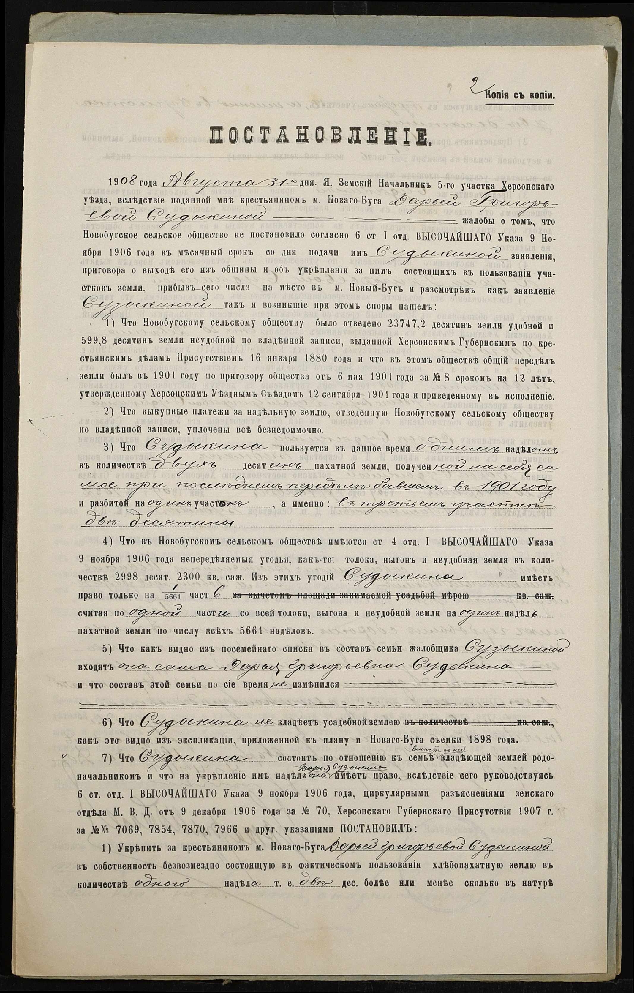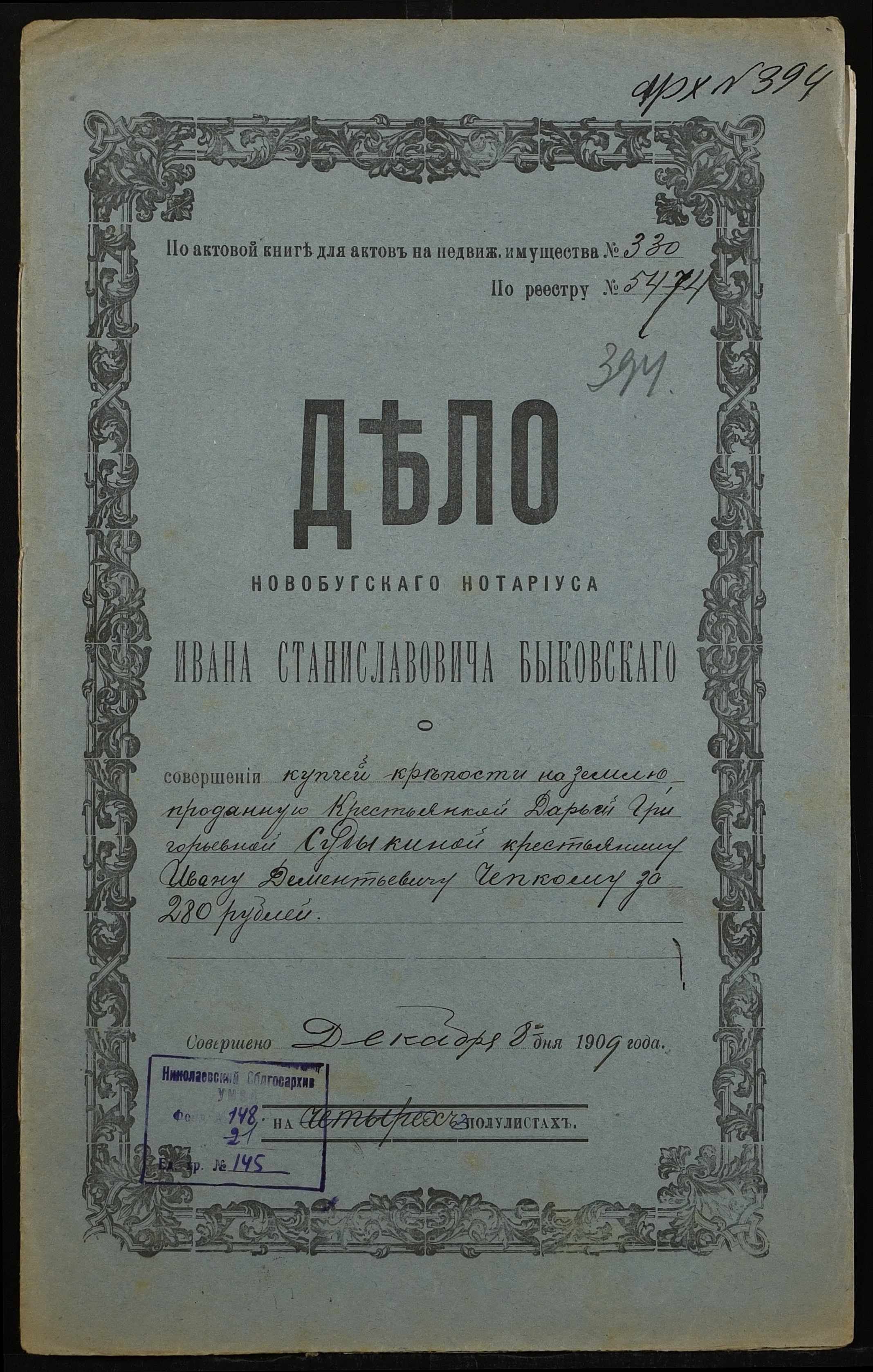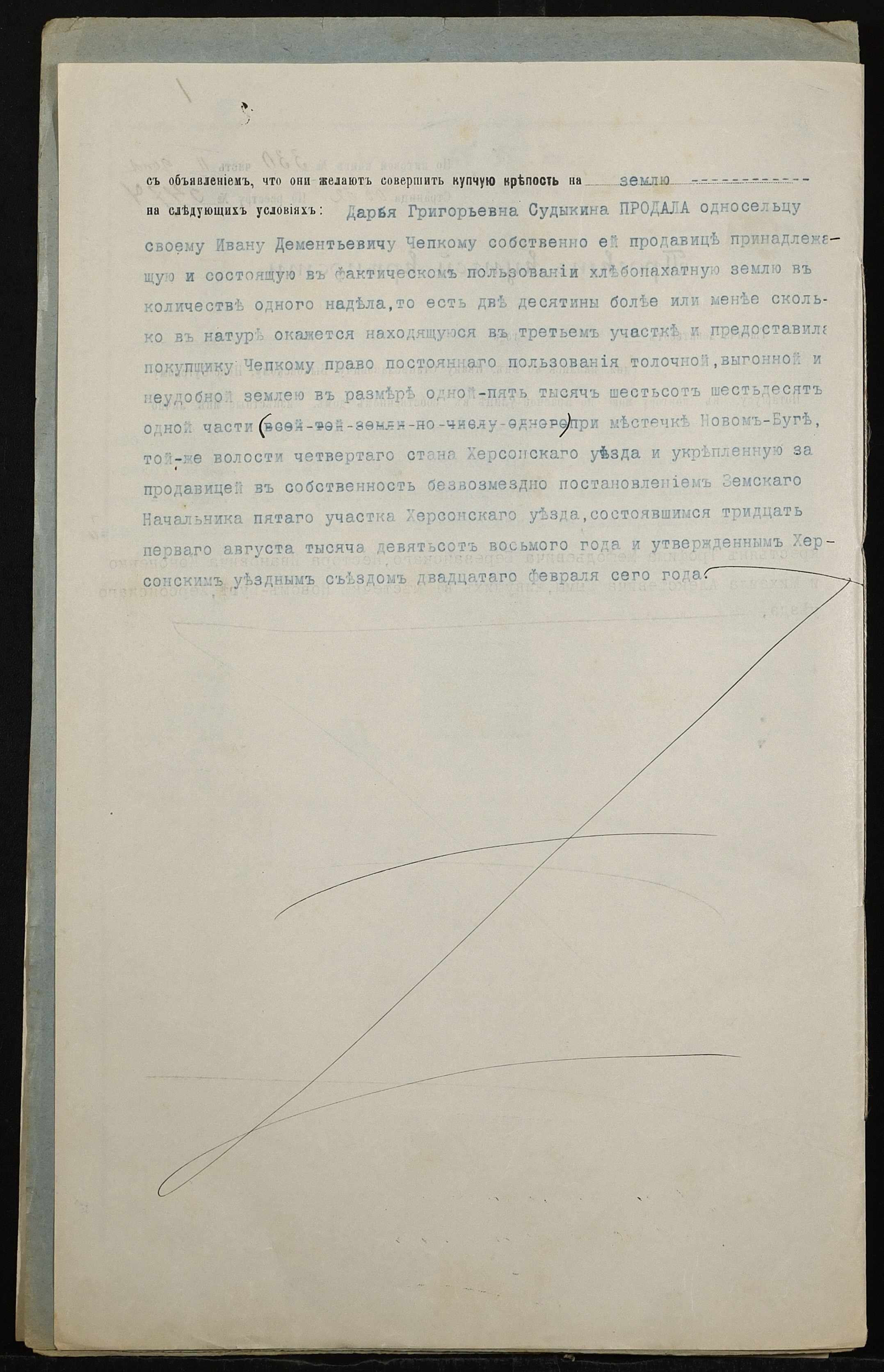 • • • • Справа № 145 “Справа про вчинення купчої про продаж землі селянкою Судикіною Дарією Григорівною (Судыкиной Дарией Григорьевной) на користь селянина Чепкого Івана Дементійовича (Ивана Дементьевича)”