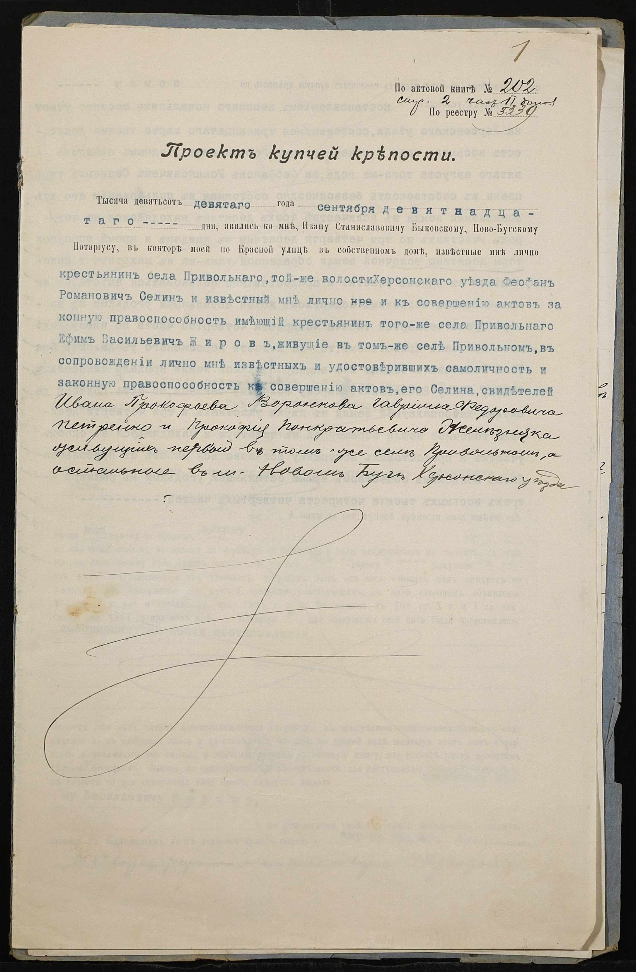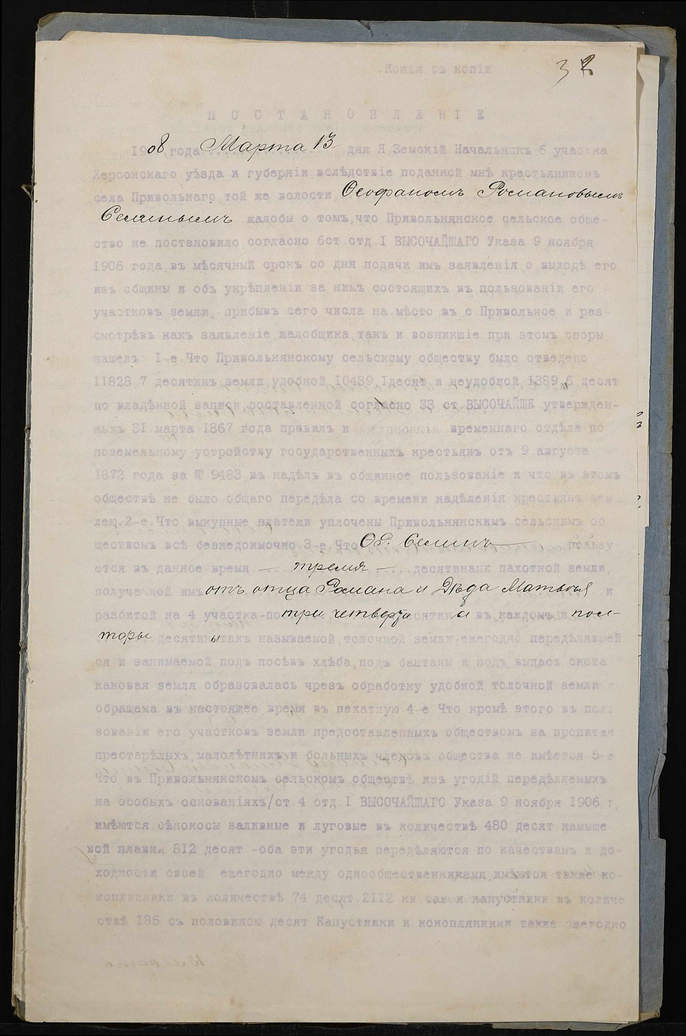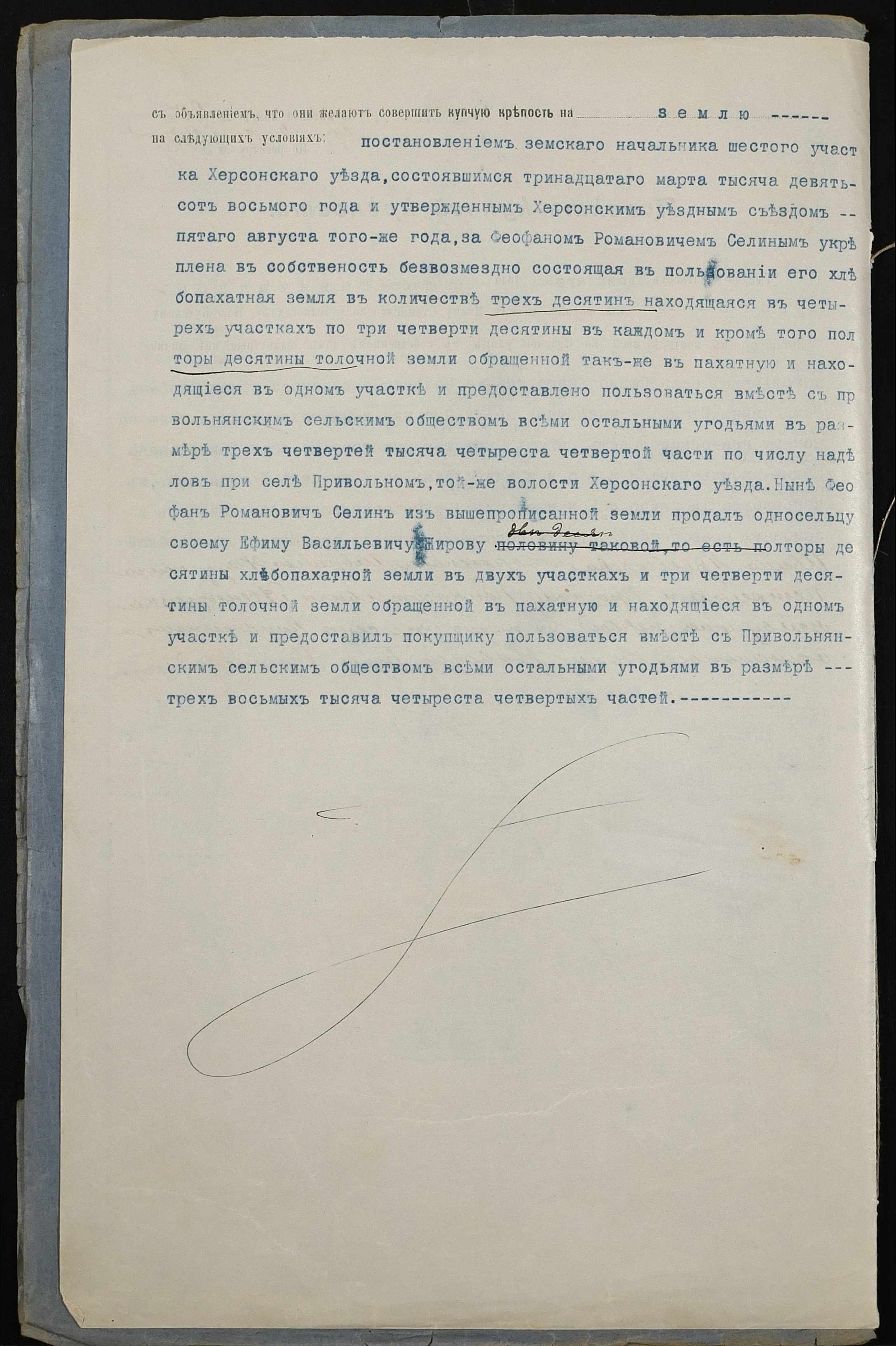 • • • • Справа № 173 “Справа про вчинення купчої про продаж землі селянином Селіним (Селиным) Федором Романовичем на користь селянина Жирова Юхима Васильовича (Ефима Васильевича)”