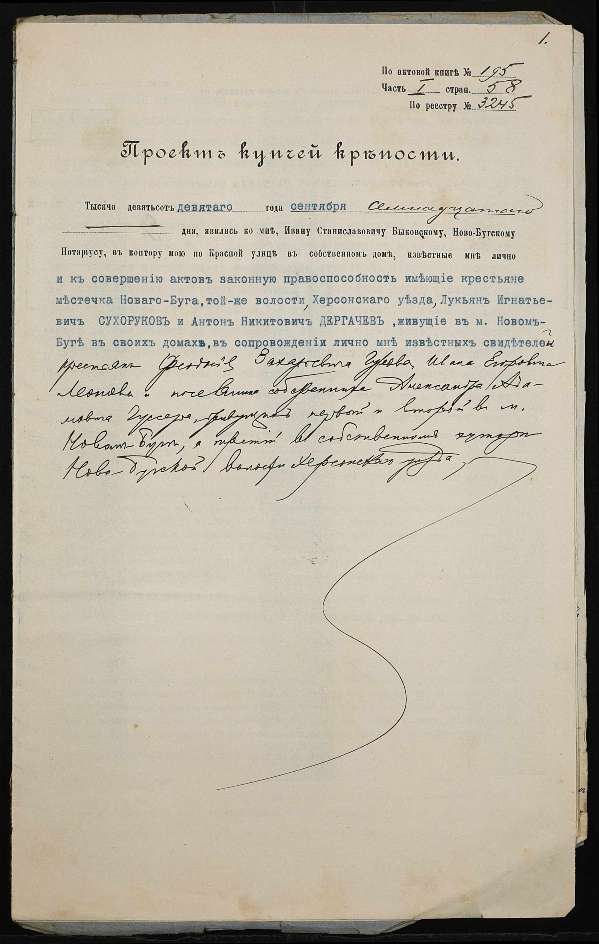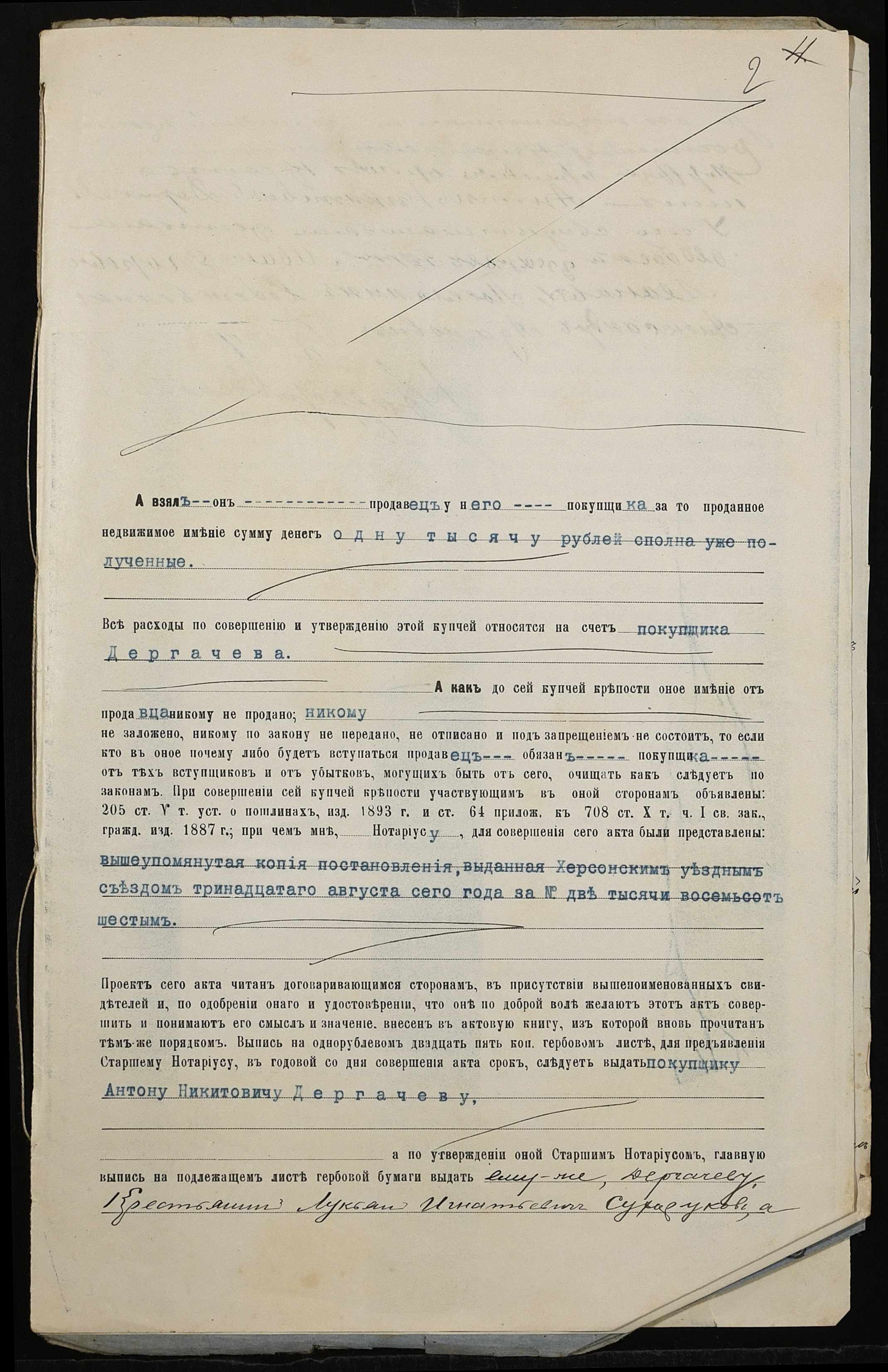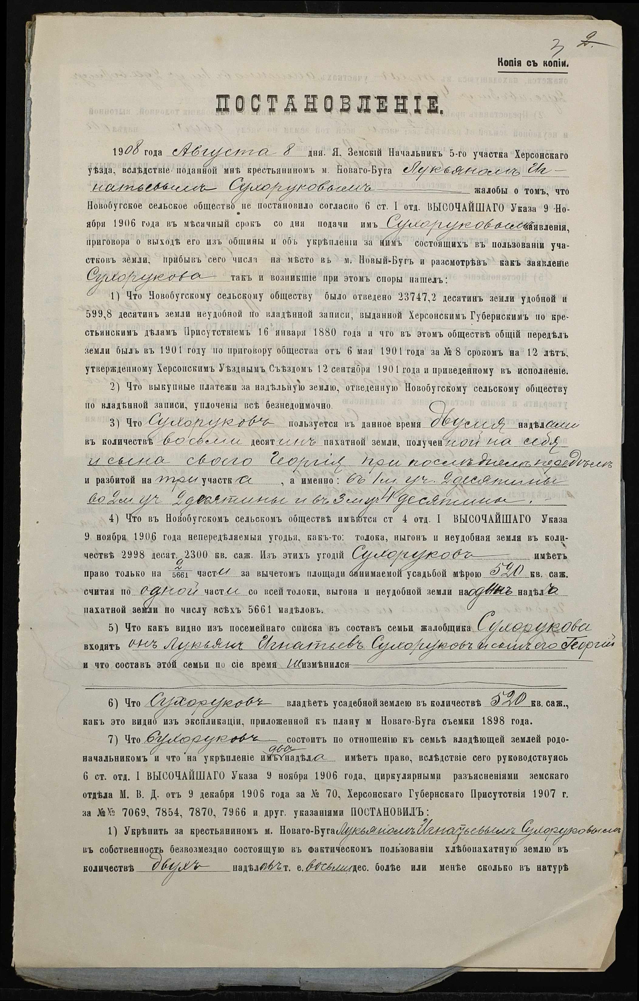 • • • • Справа № 180 “Справа про вчинення купчої про продаж землі селянином Сухоруковим Лук’яном Гнатовичем (Сухоруковым Лукьяном Игнатовичем) на користь селянина Дергачова (Дергачева) Антона Микитовича (Никитовича)”