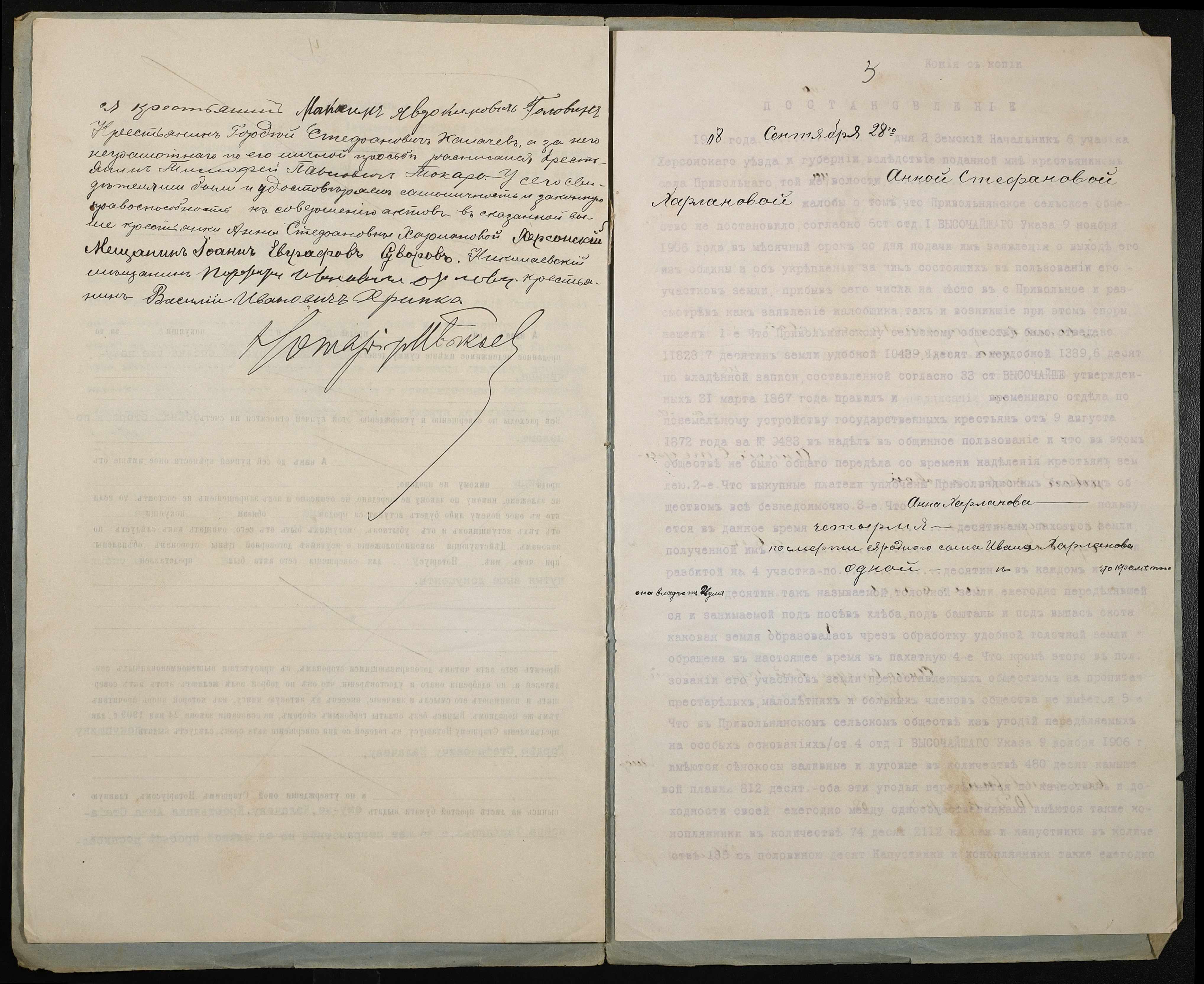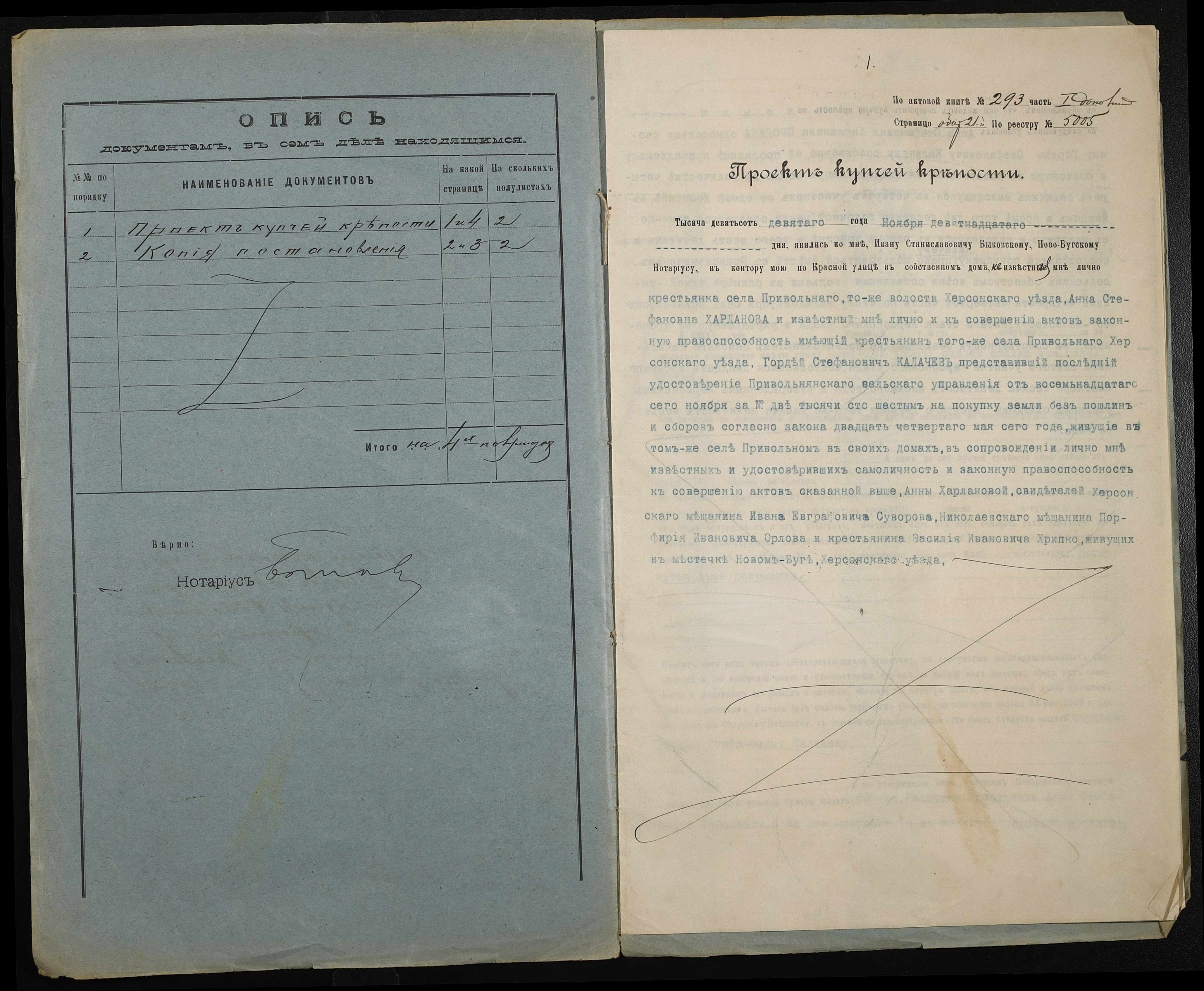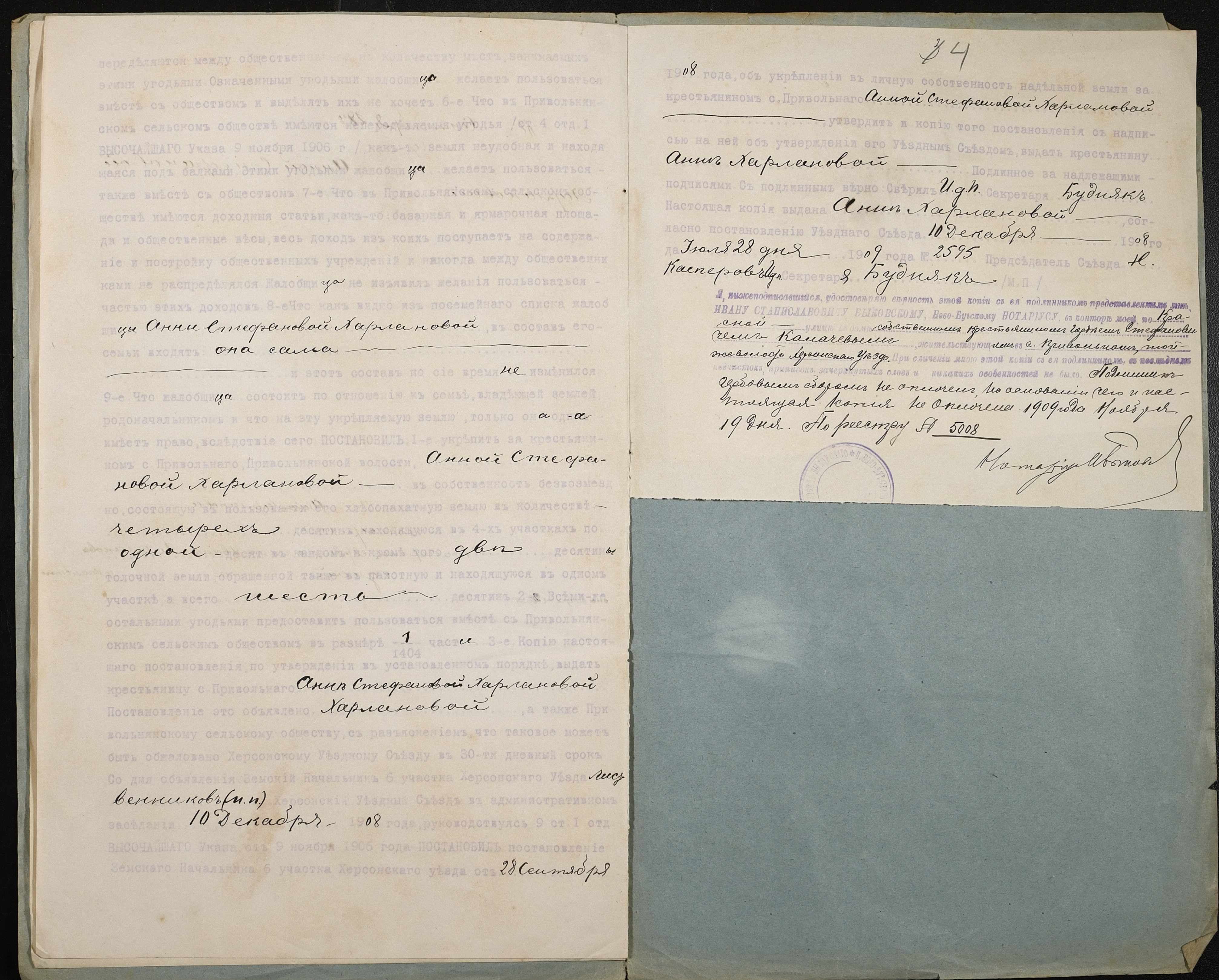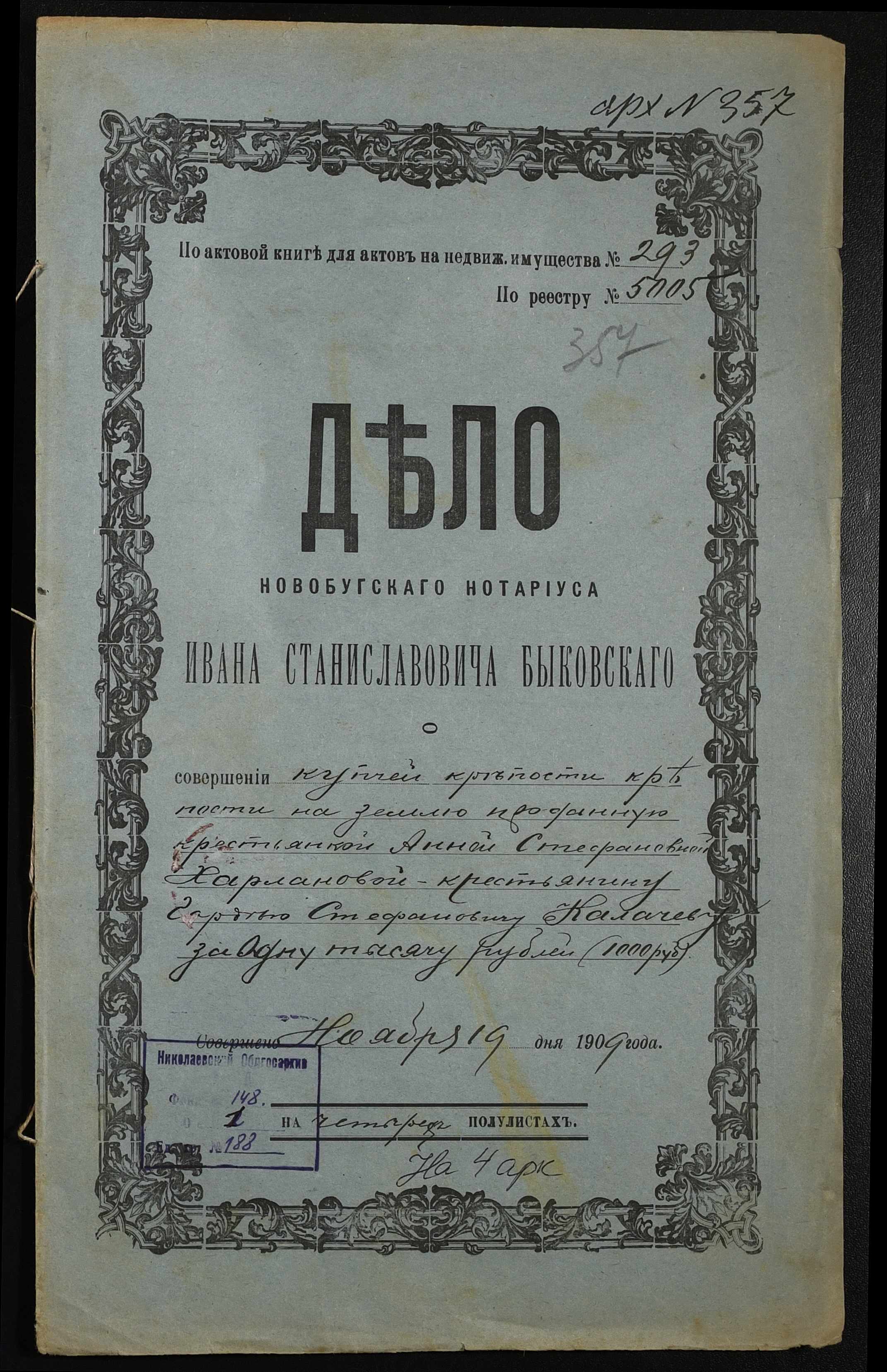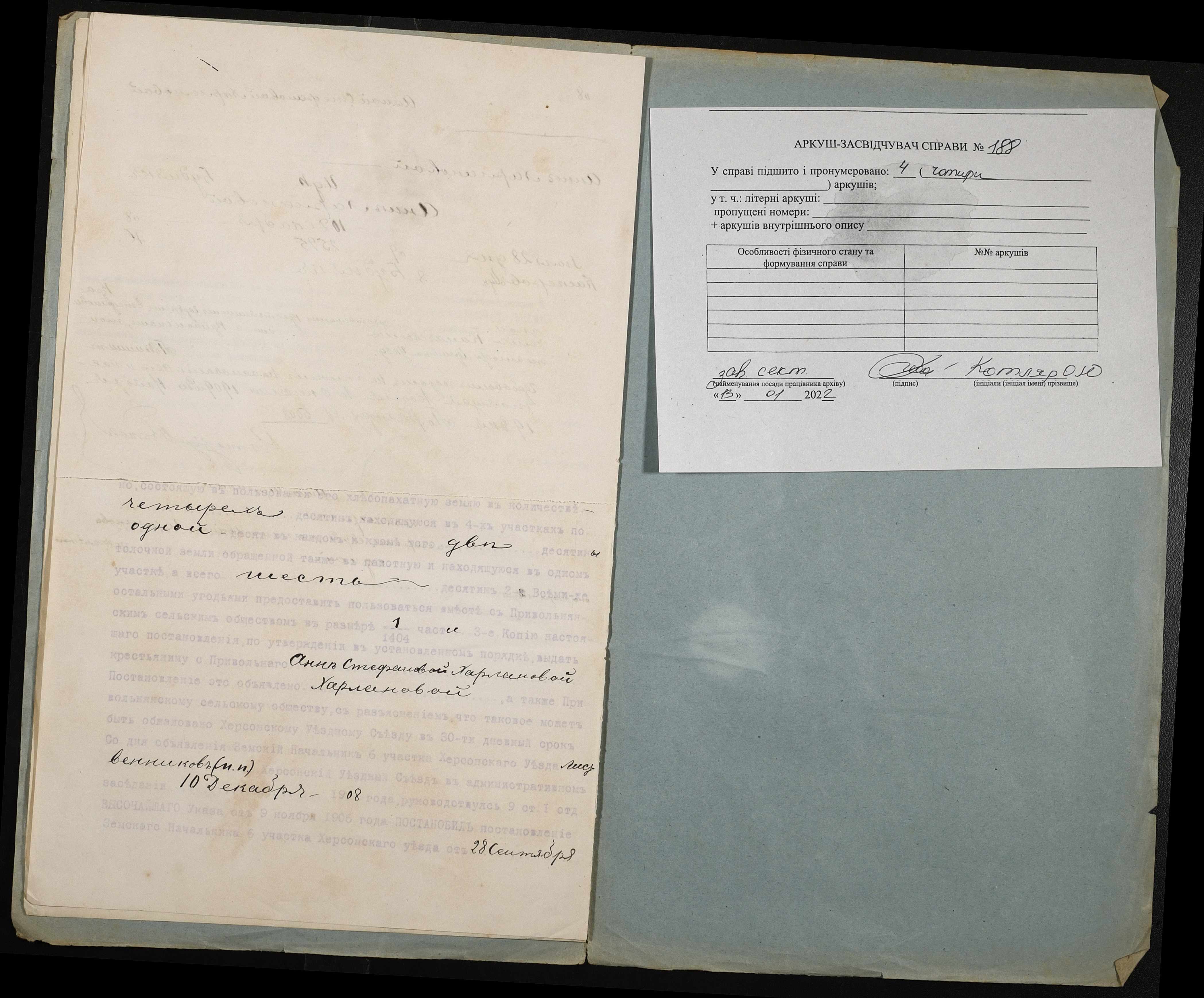 • • • • Справа № 188 “Справа про вчинення купчої про продаж землі селянкою Харлановою Ганною Стефанівною (Харлановой Анной Стефановной) на користь селянина Калачова Гордія (Калачева Гордея) Стефановича”