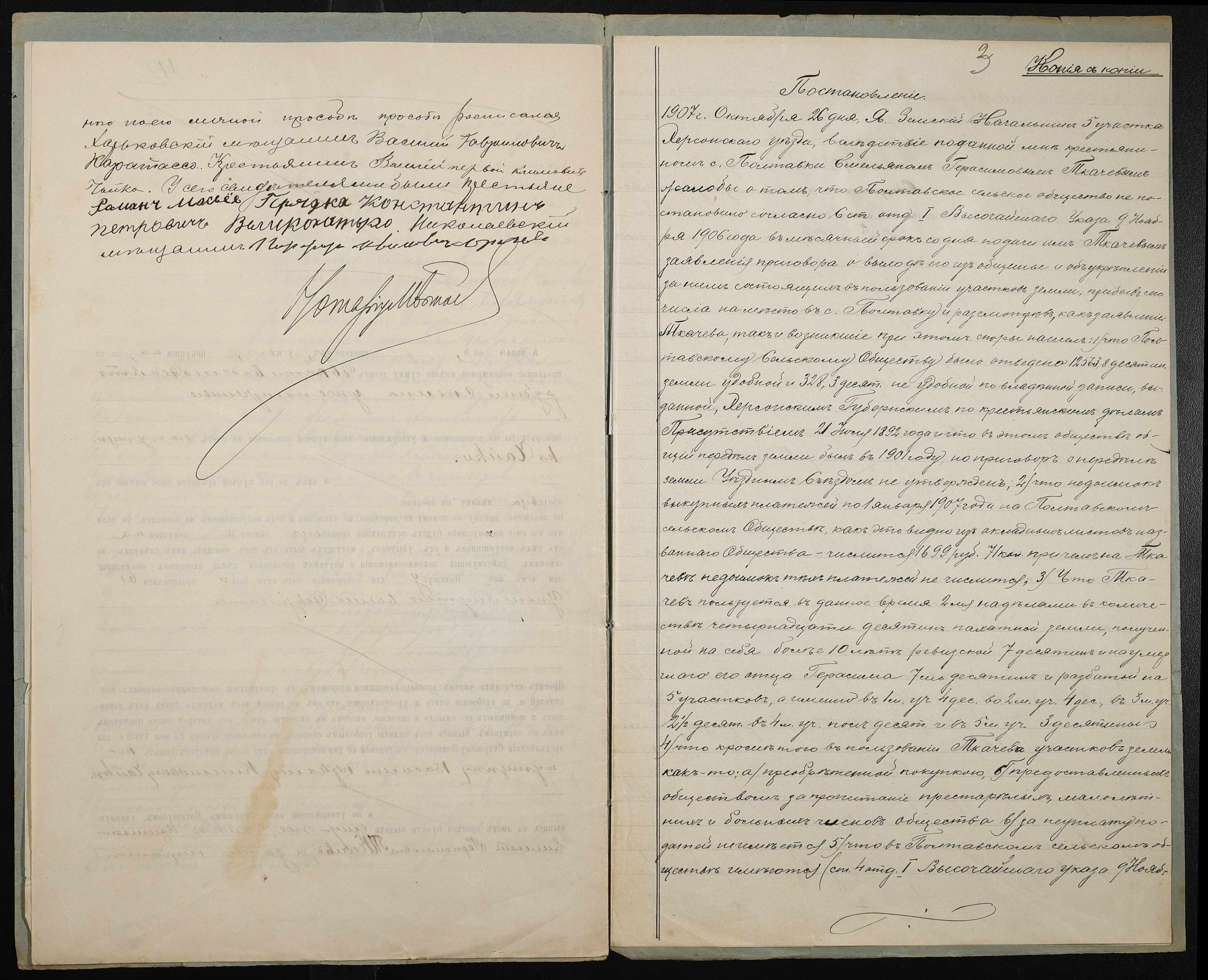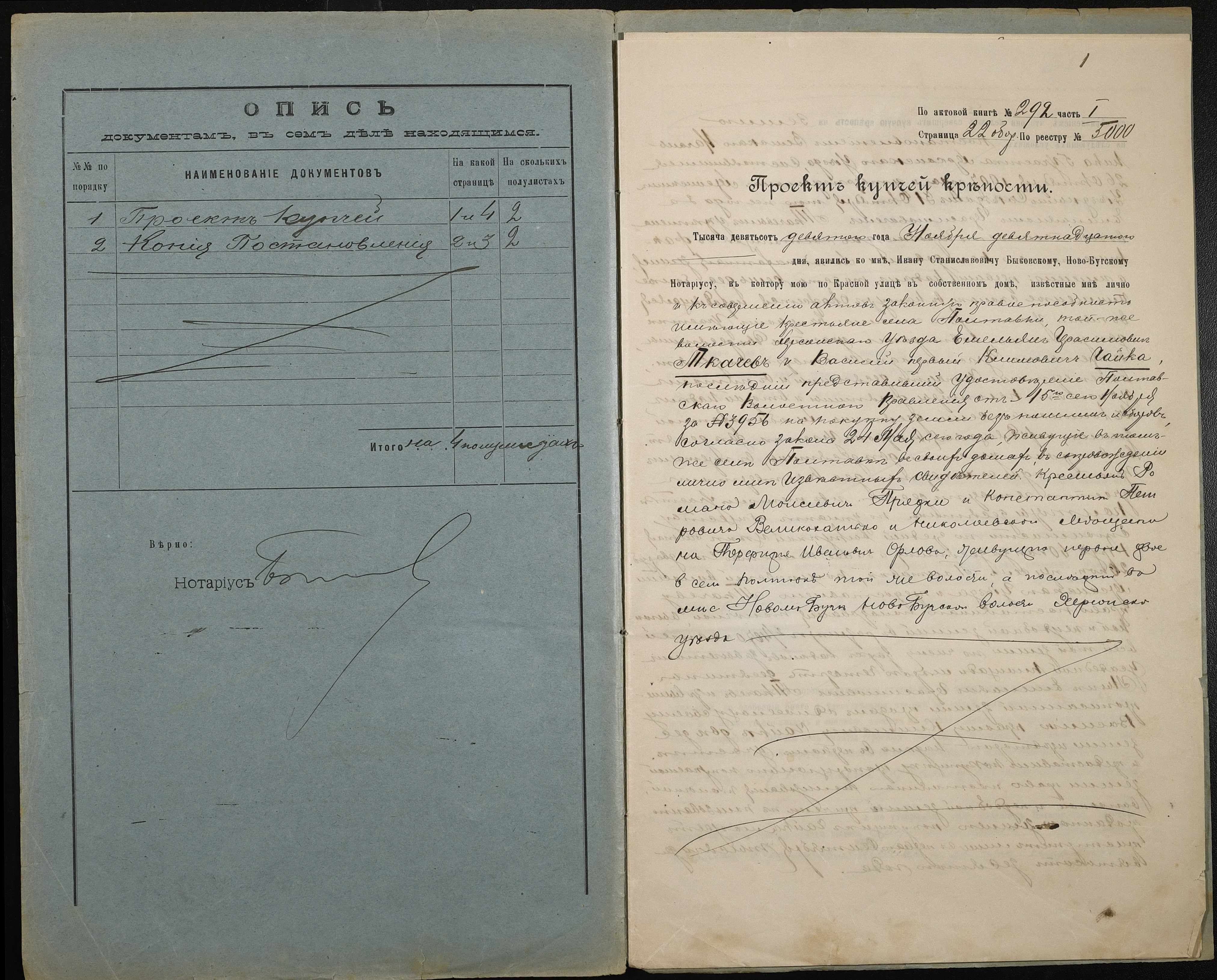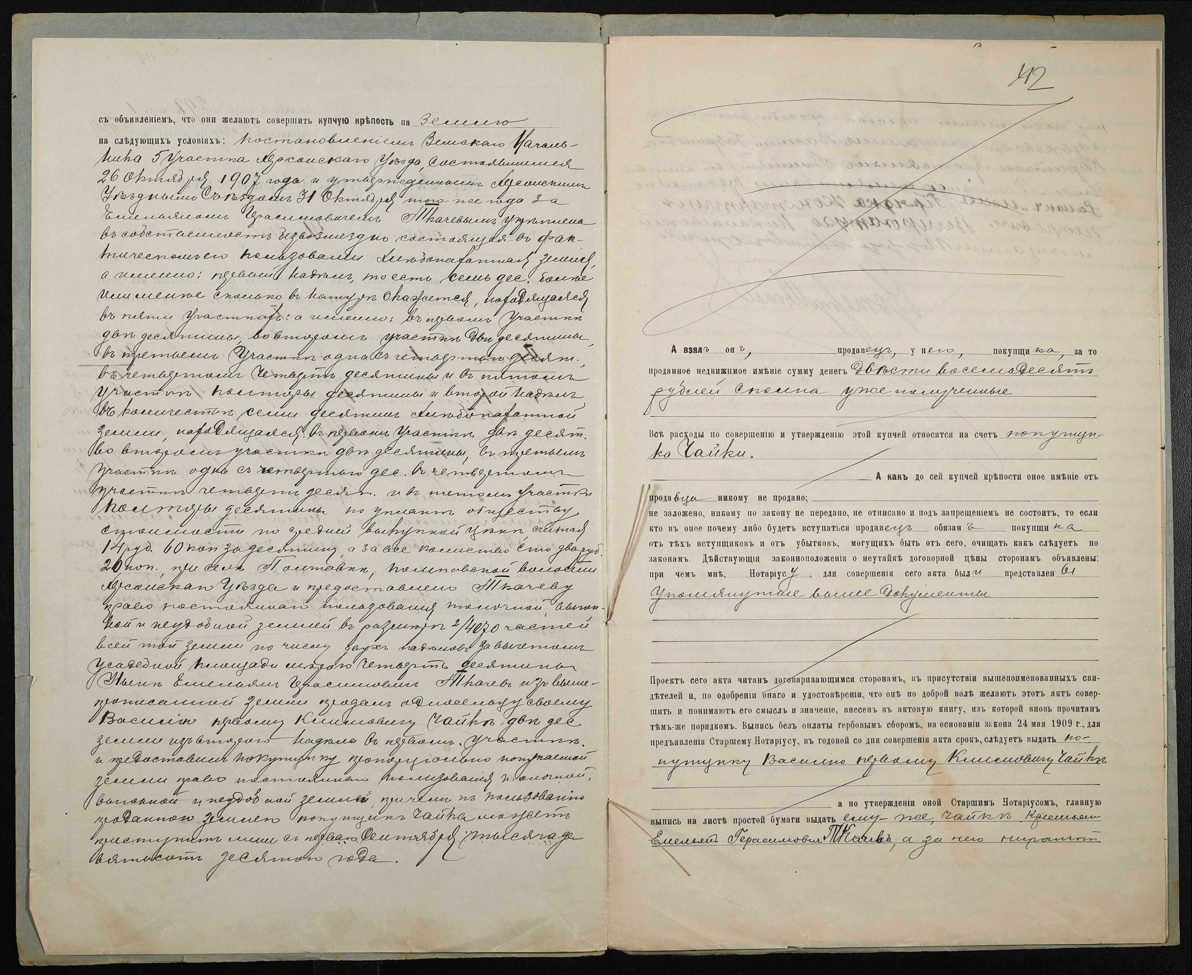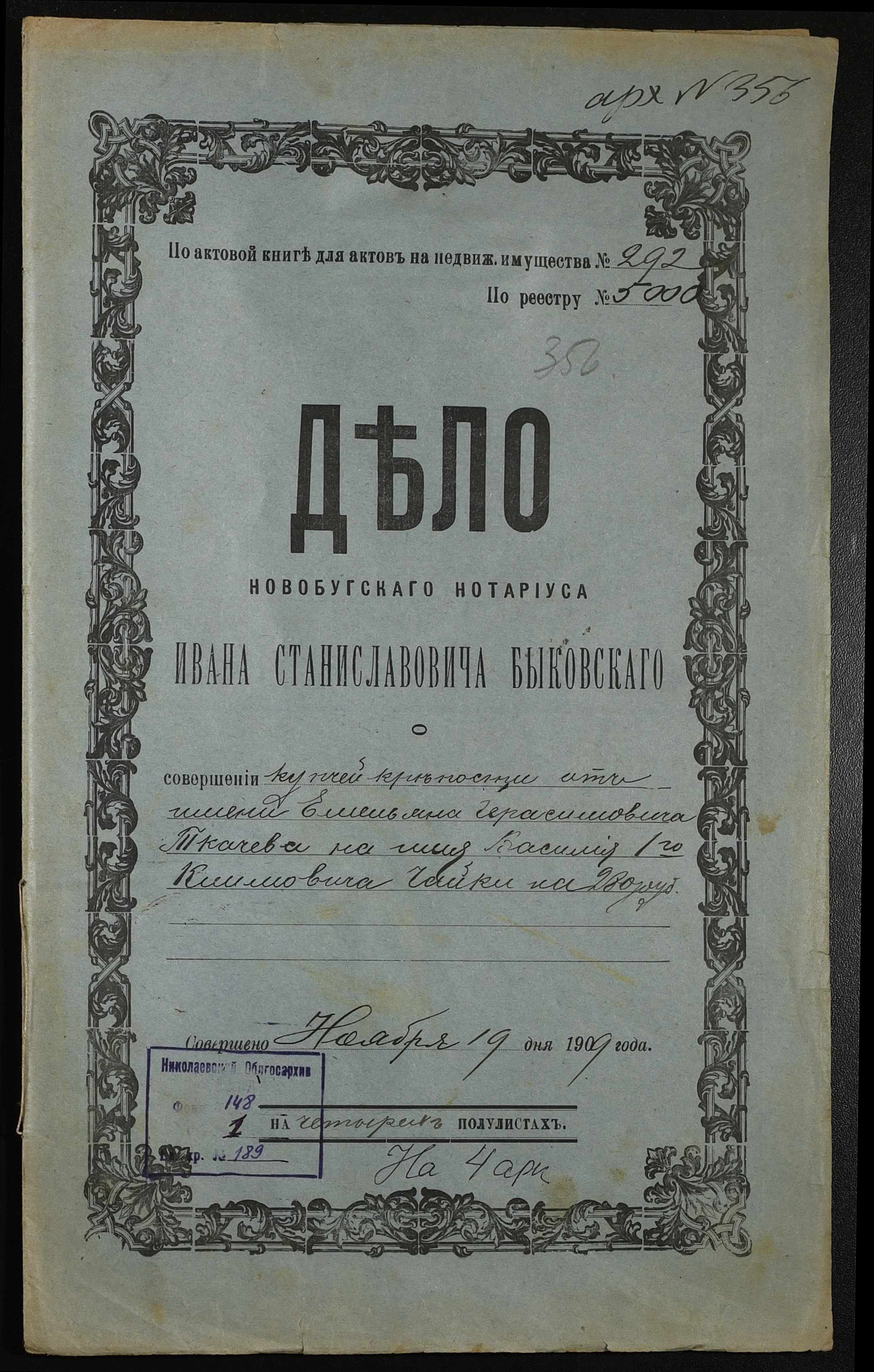 • • • • Справа № 189 “Справа про вчинення купчої про продаж землі селянином Ткачовим Омеляном (Ткачевым Емельяном) Герасимовичем на користь селянина Чайки Василя (Василия) Климовича”
