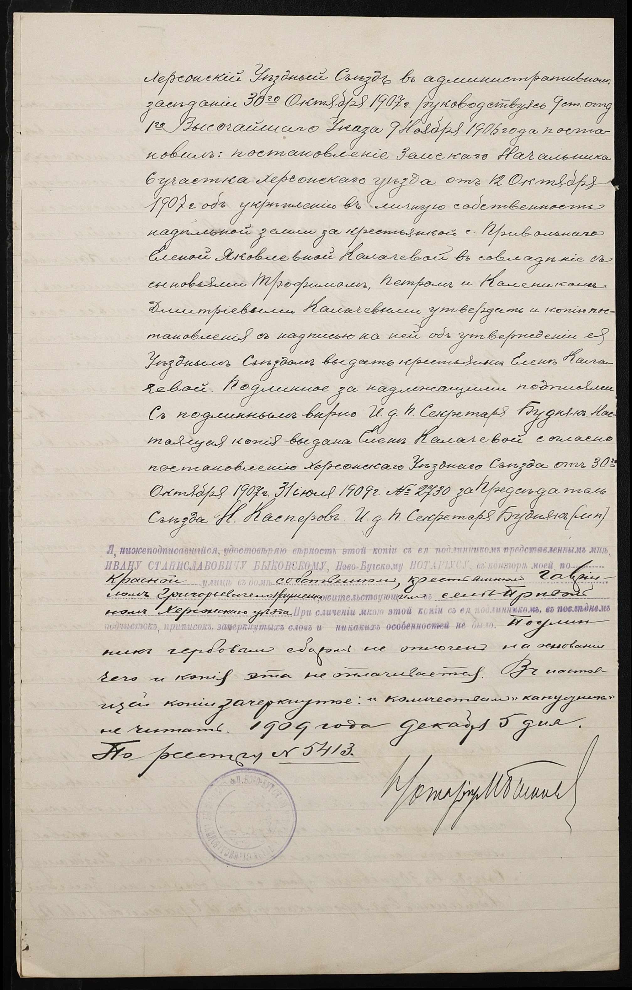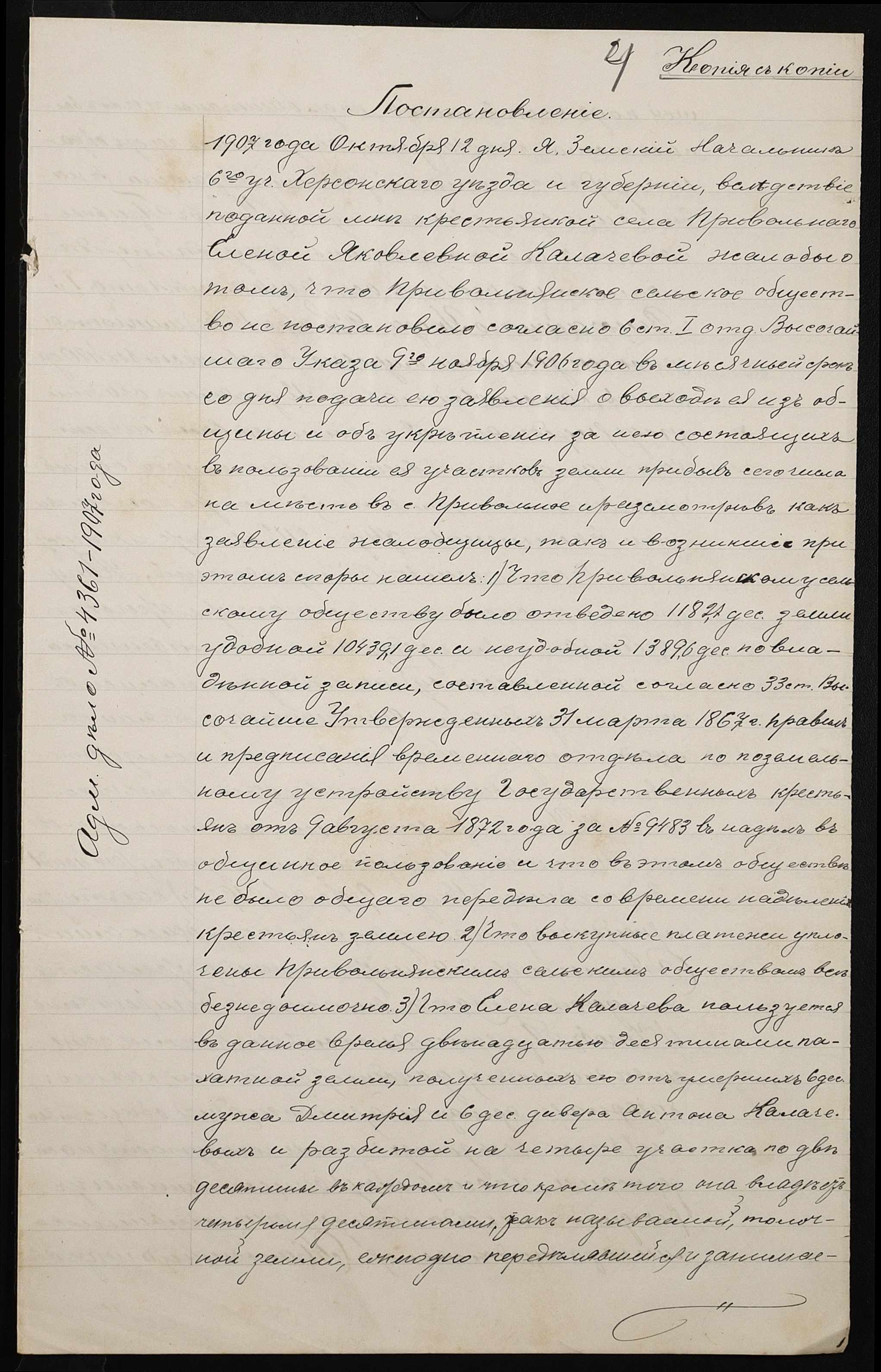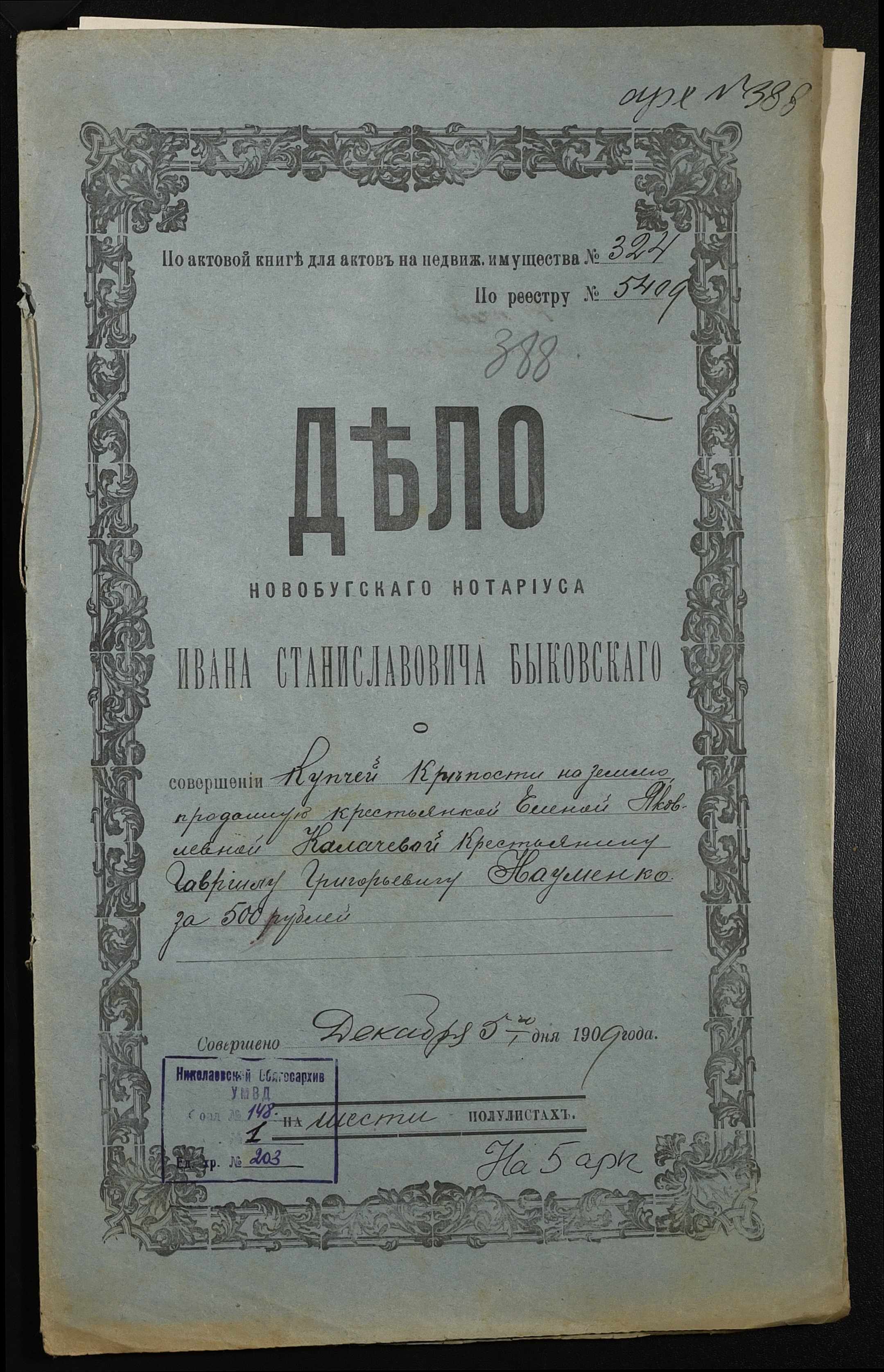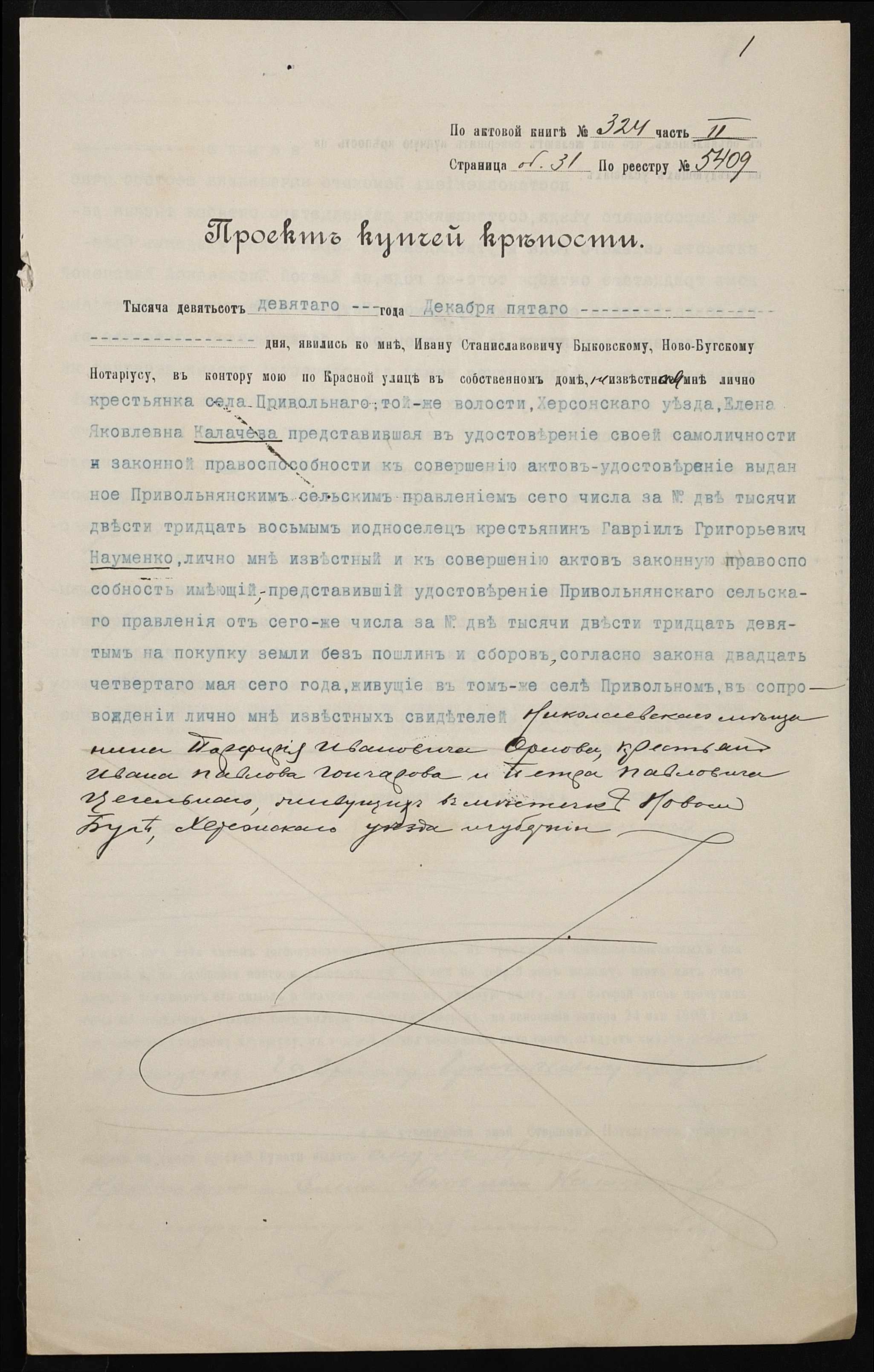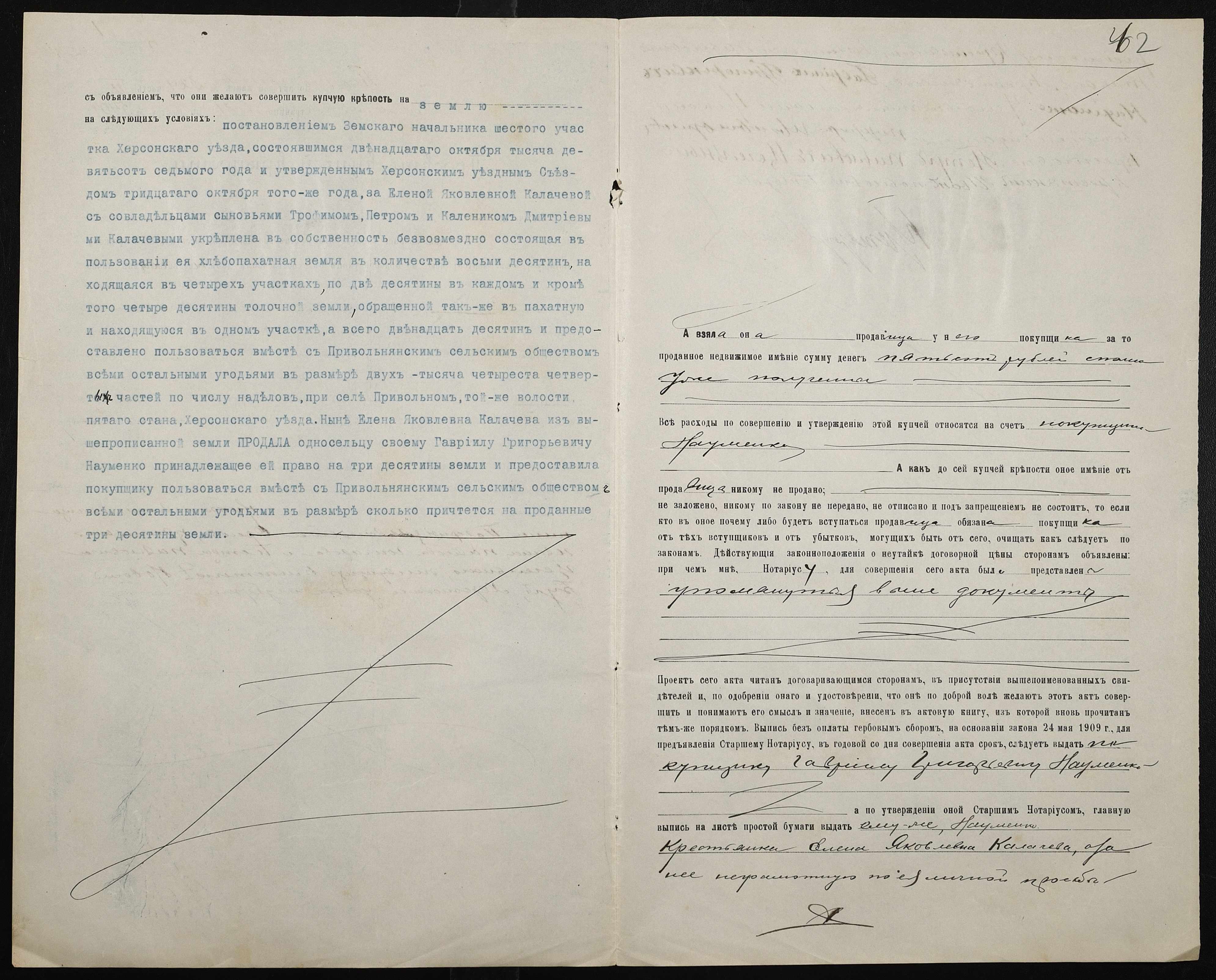 • • • • Справа № 203 “Справа про вчинення купчої про продаж землі селянкою Калачовою Оленою Яківною (Калачевой Еленой Яковлевной) на користь селянина Науменка Гаврила Григоровича (Науменко Гавриила Григорьевича)”