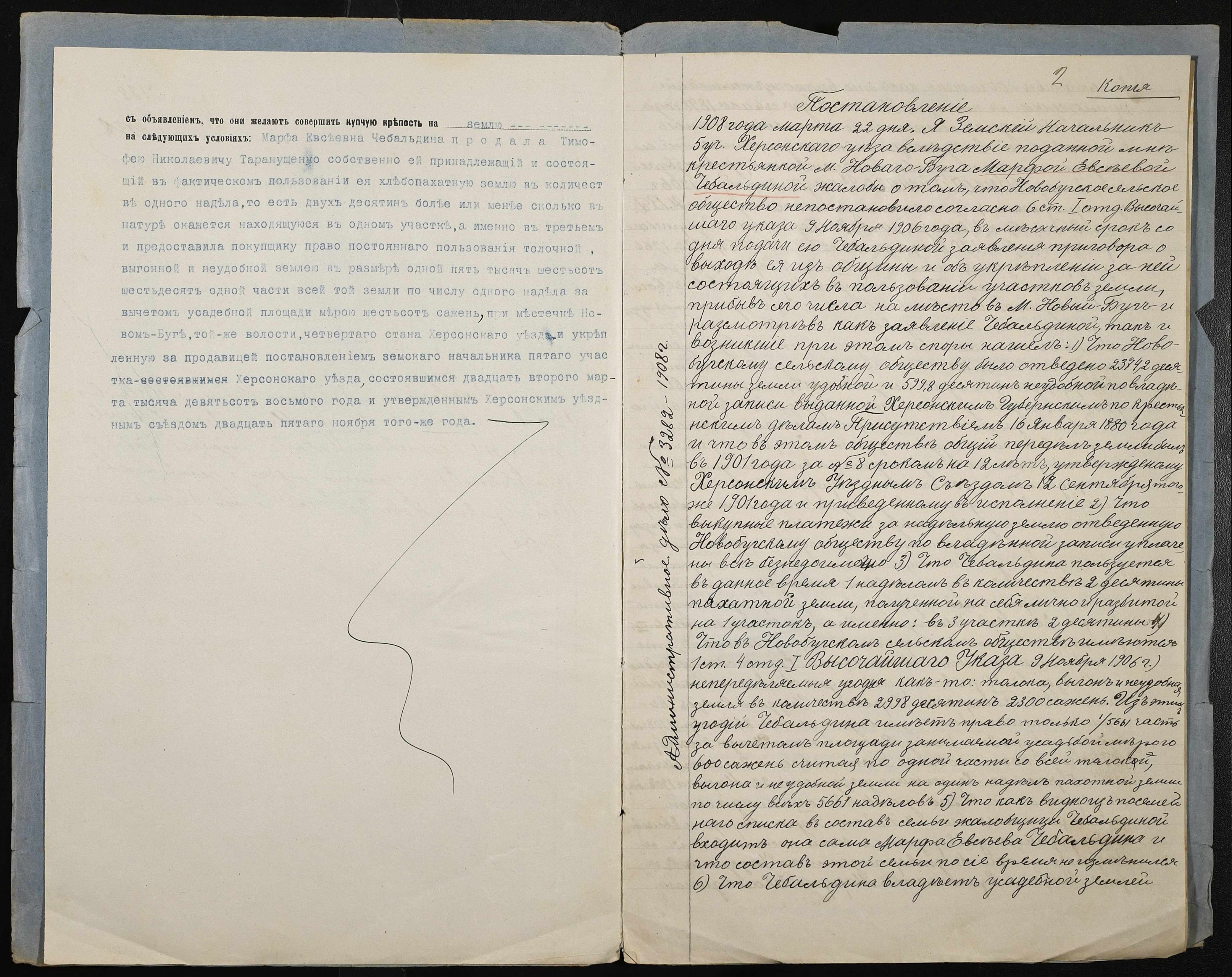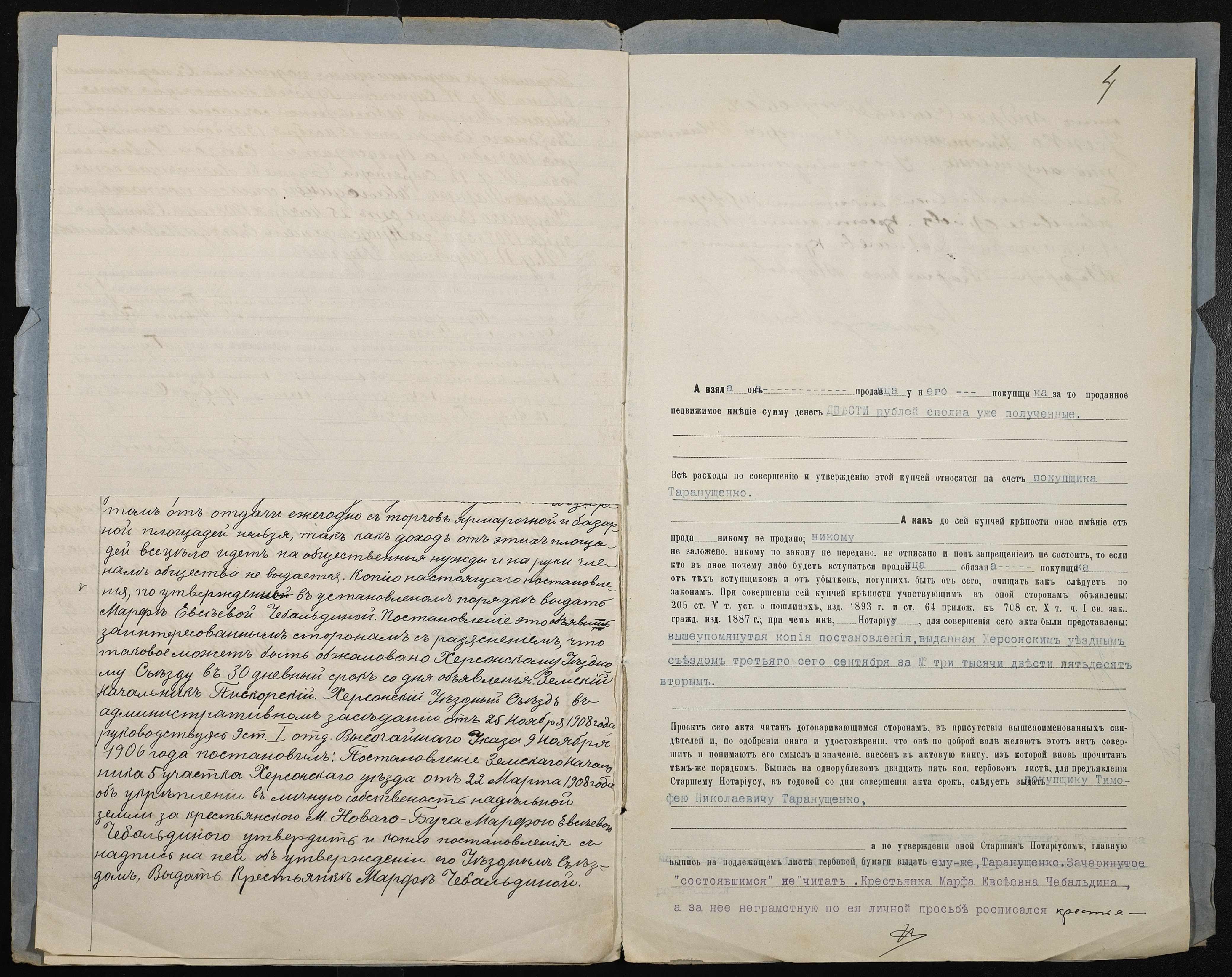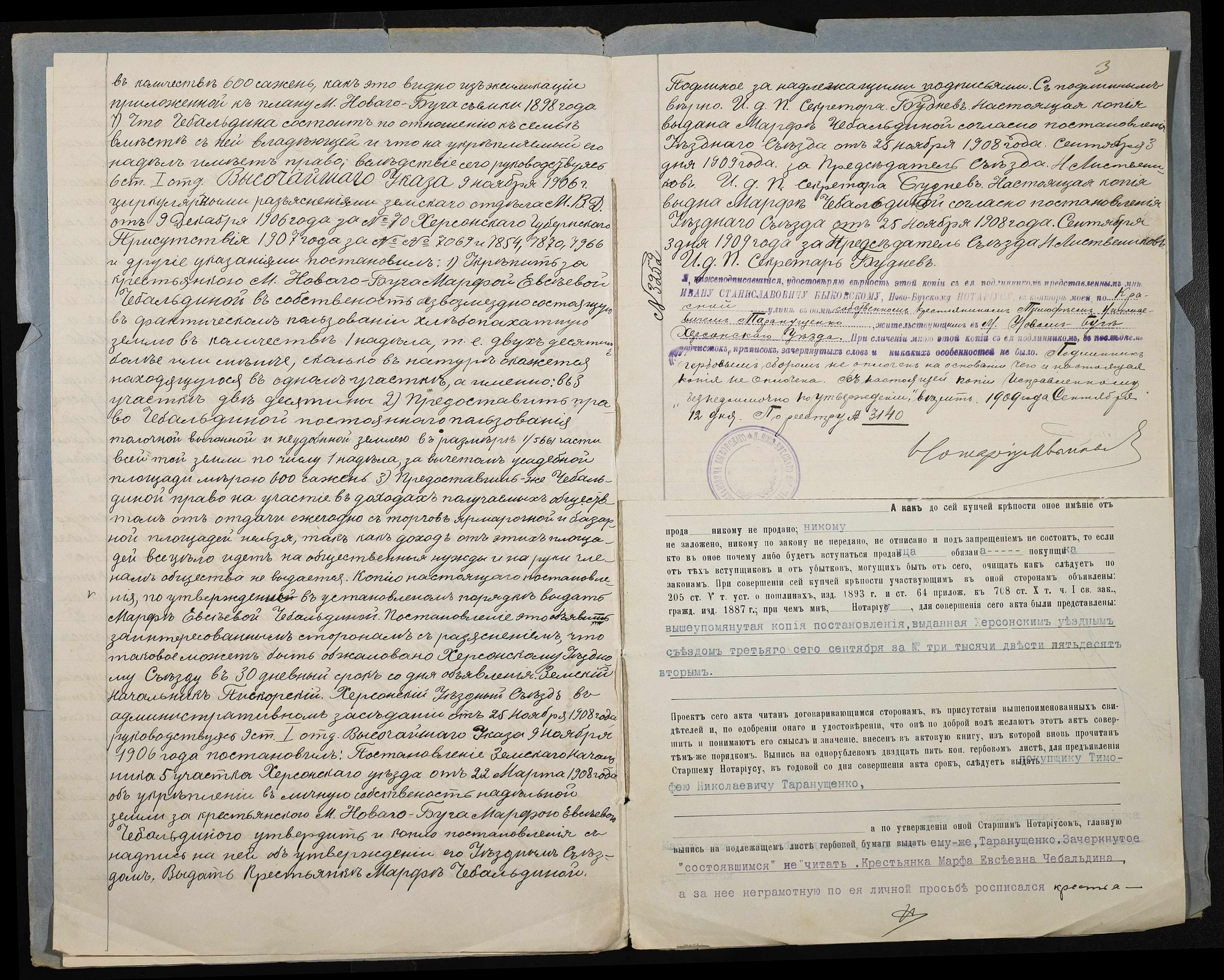 • • • • Справа № 216 “Справа про вчинення купчої про продаж землі селянкою Чебальдіною (Чебальдиной) Марфою Овсіївною (Евсеевной) на користь селянина Таранущенка Тимофія Миколайовича (Таранущенко Тимофея Николаевича)”