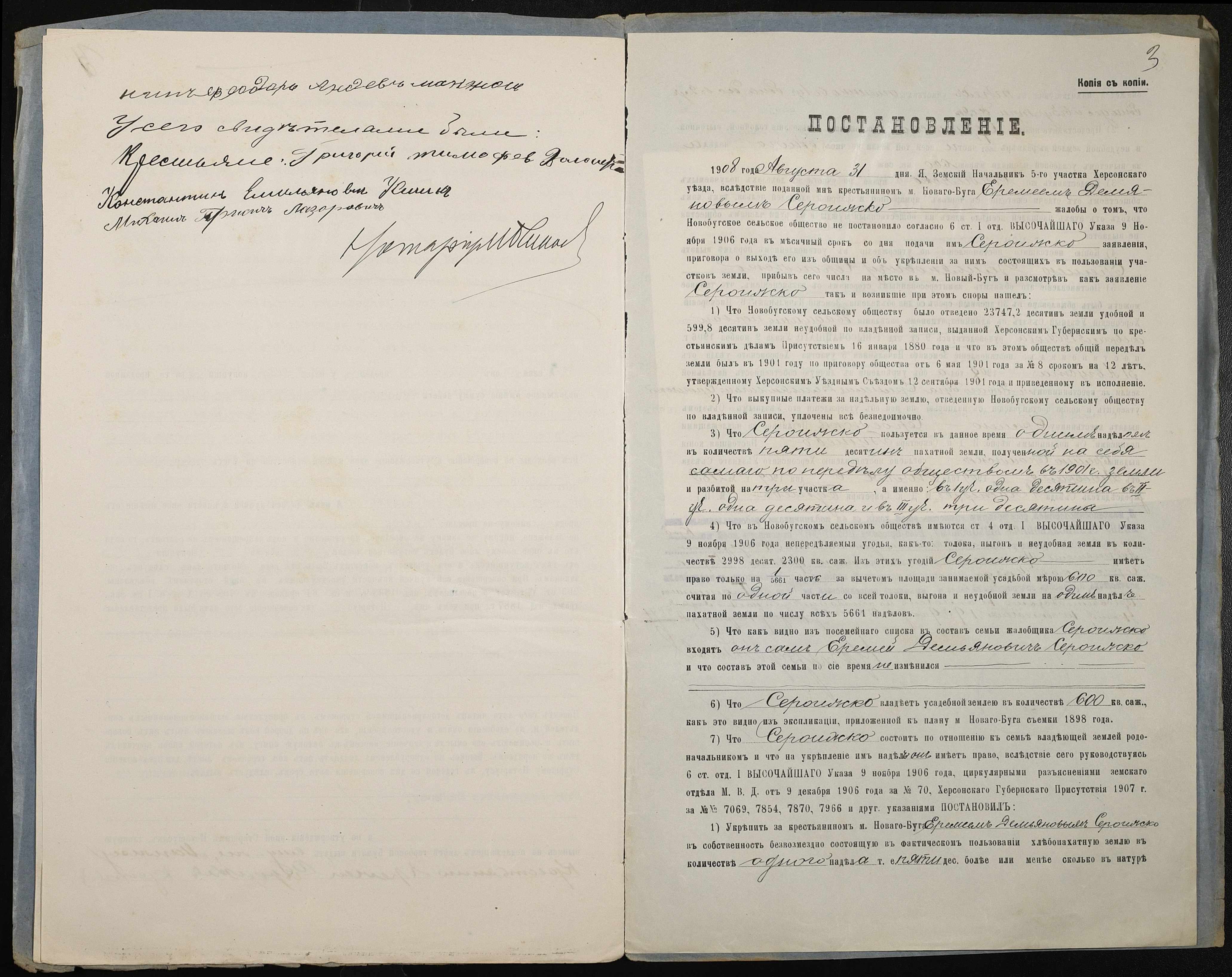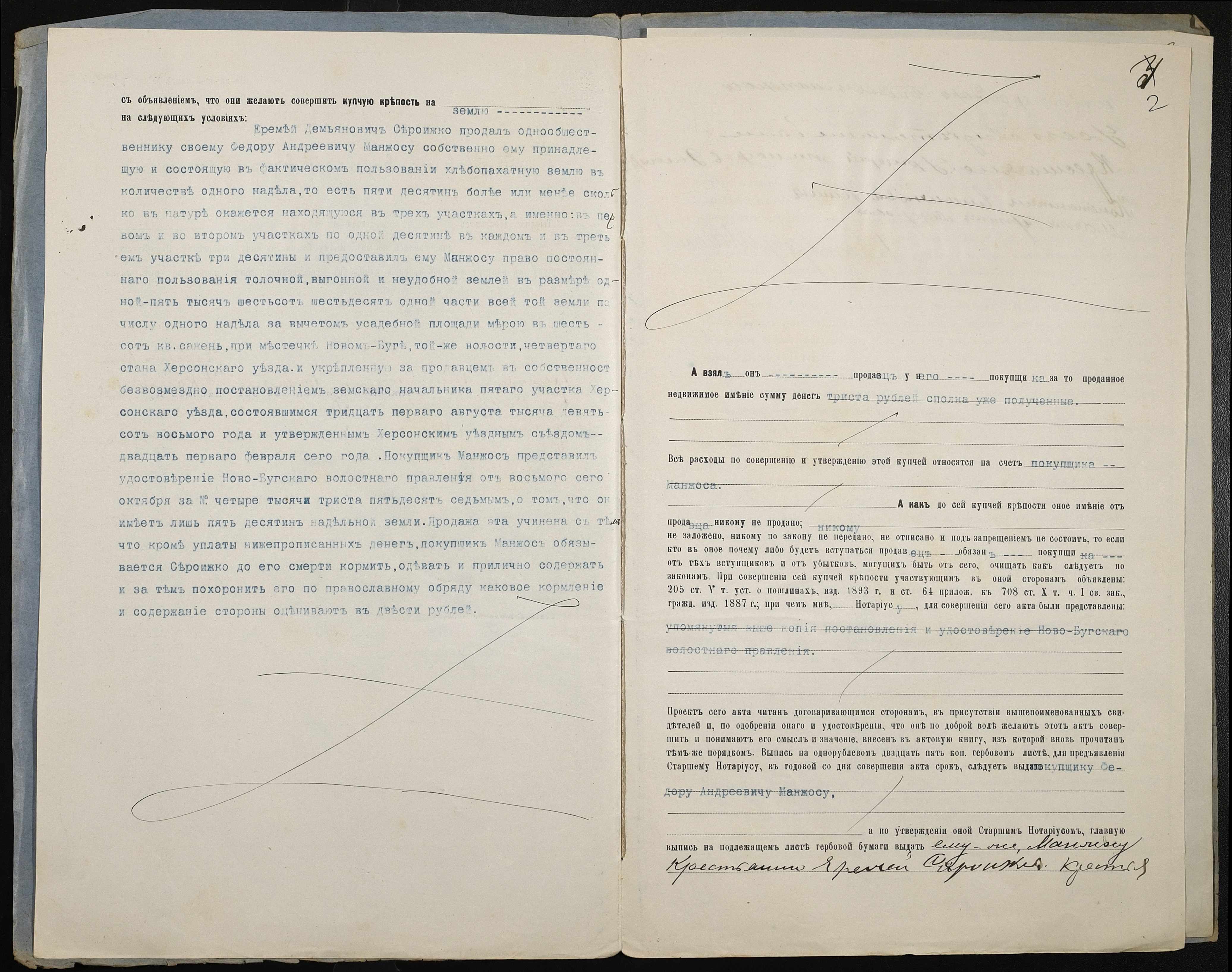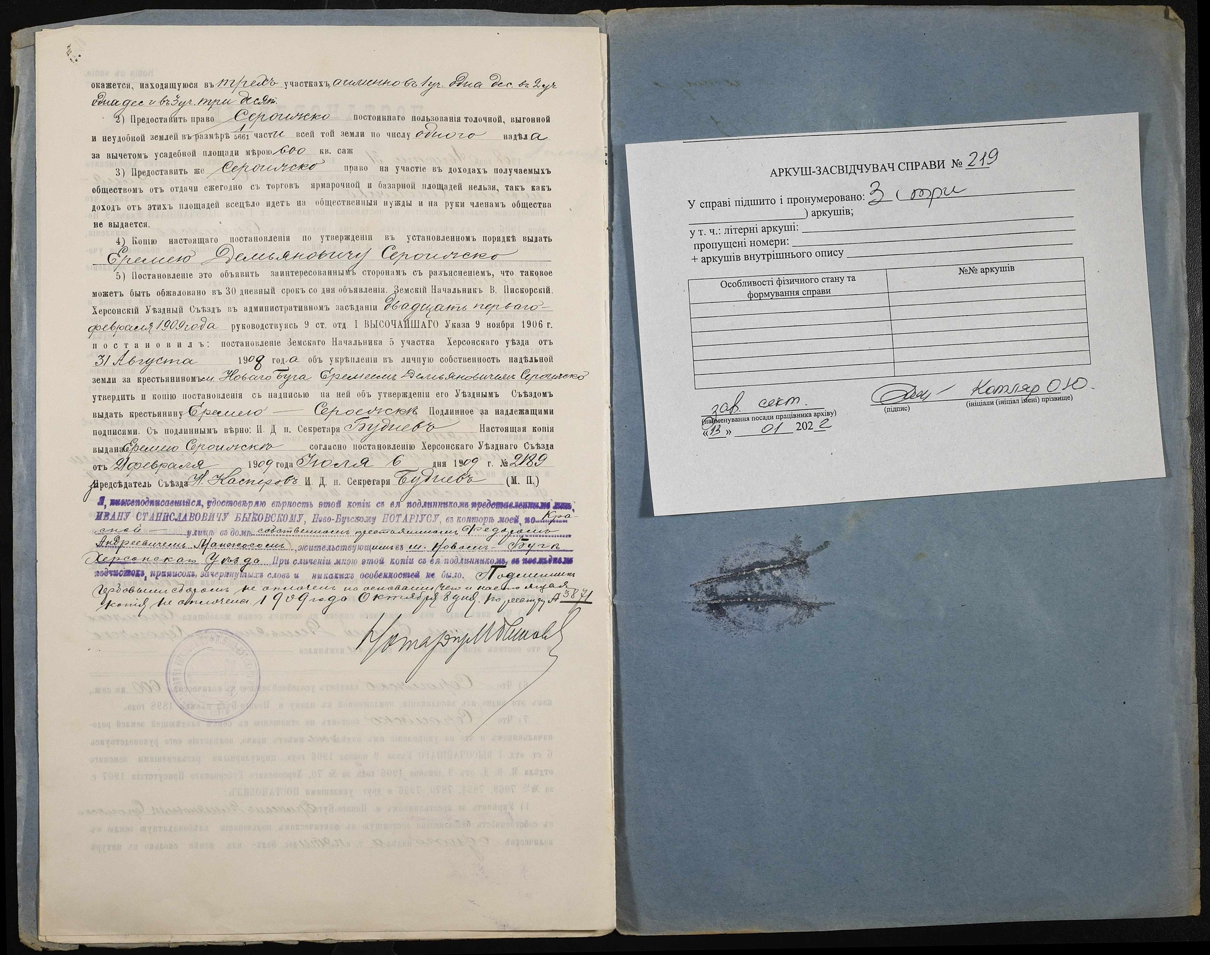 • • • • Справа № 219 “Справа про вчинення купчої про продаж землі селянином Сероїжкою Яремою Дем’яновичем (Сероижкой Еремеем Демьяновичем) на користь селянина Манжоса Федора Андрійовича (Андреевича)”