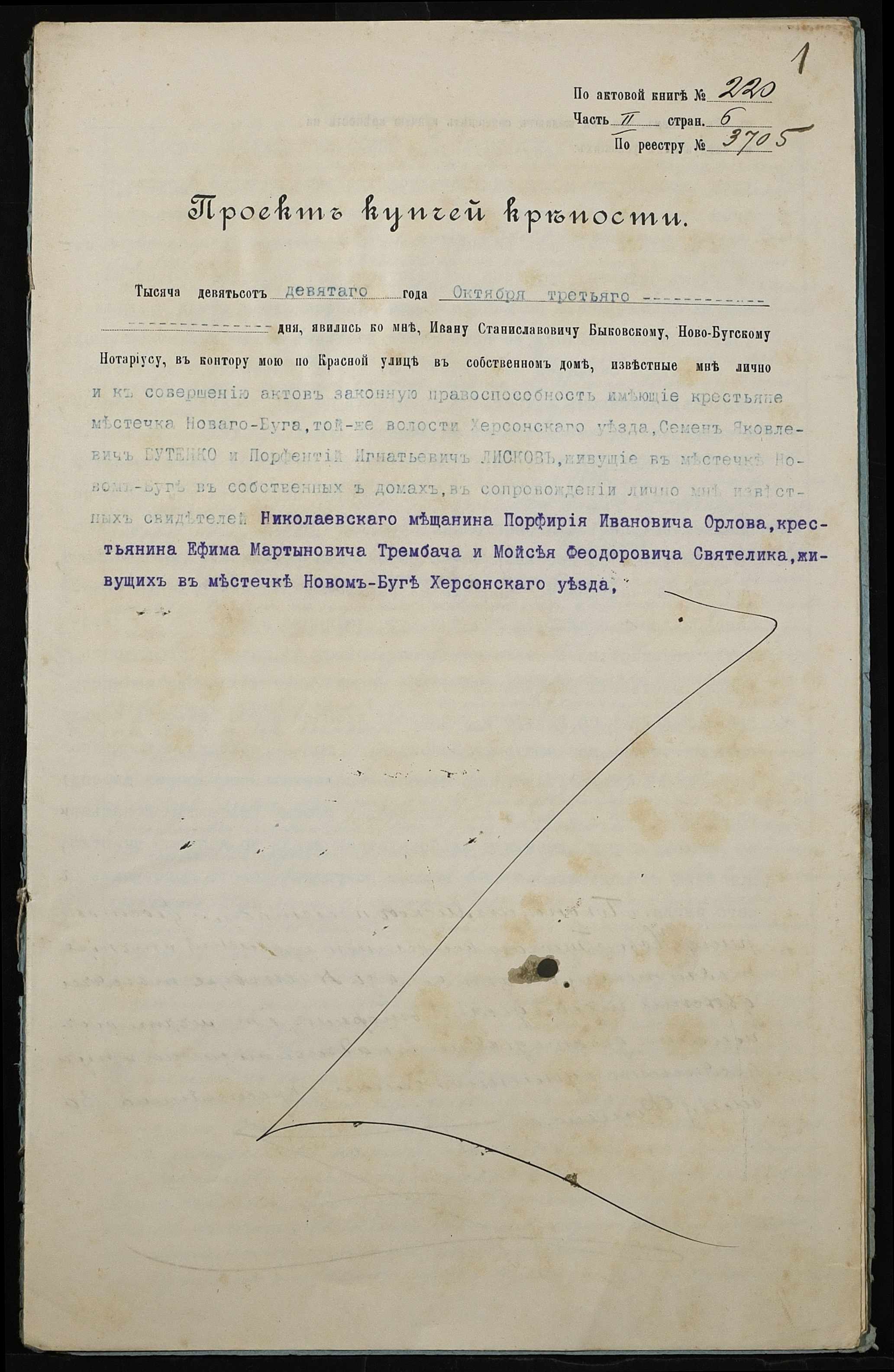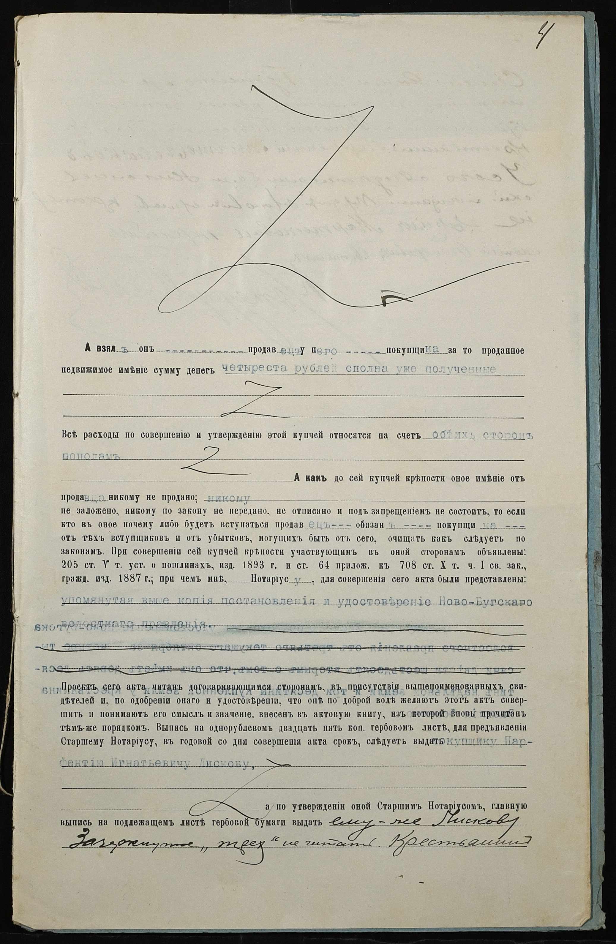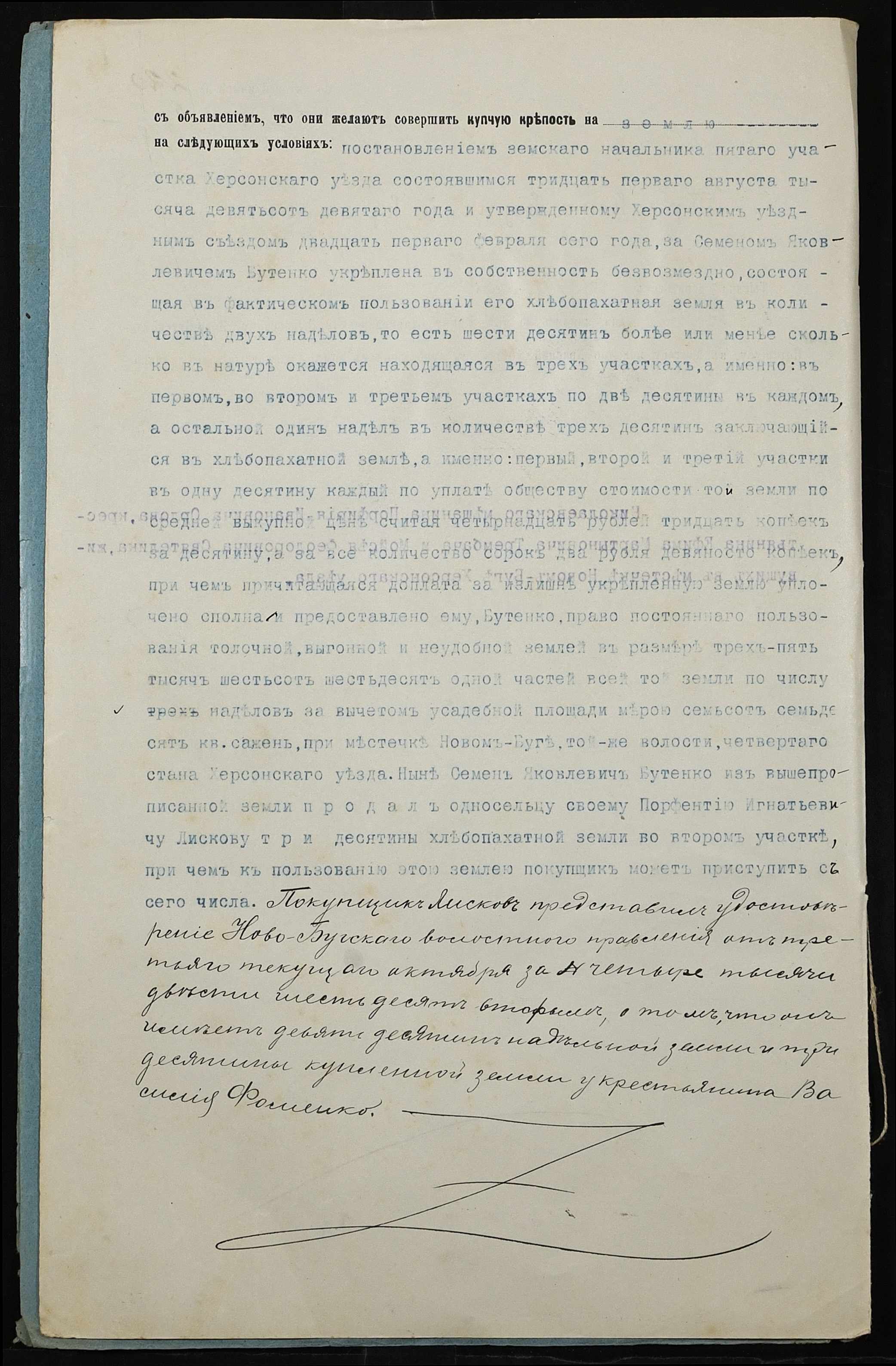• • • • Справа № 236 “Справа про вчинення купчої про продаж землі селянином Бутенком (Бутенко) Семеном Яковичем (Яковлевичем) на користь селянина Ліскова Парфентія Гнатовича (Лискова Парфентия Игнатовича)”