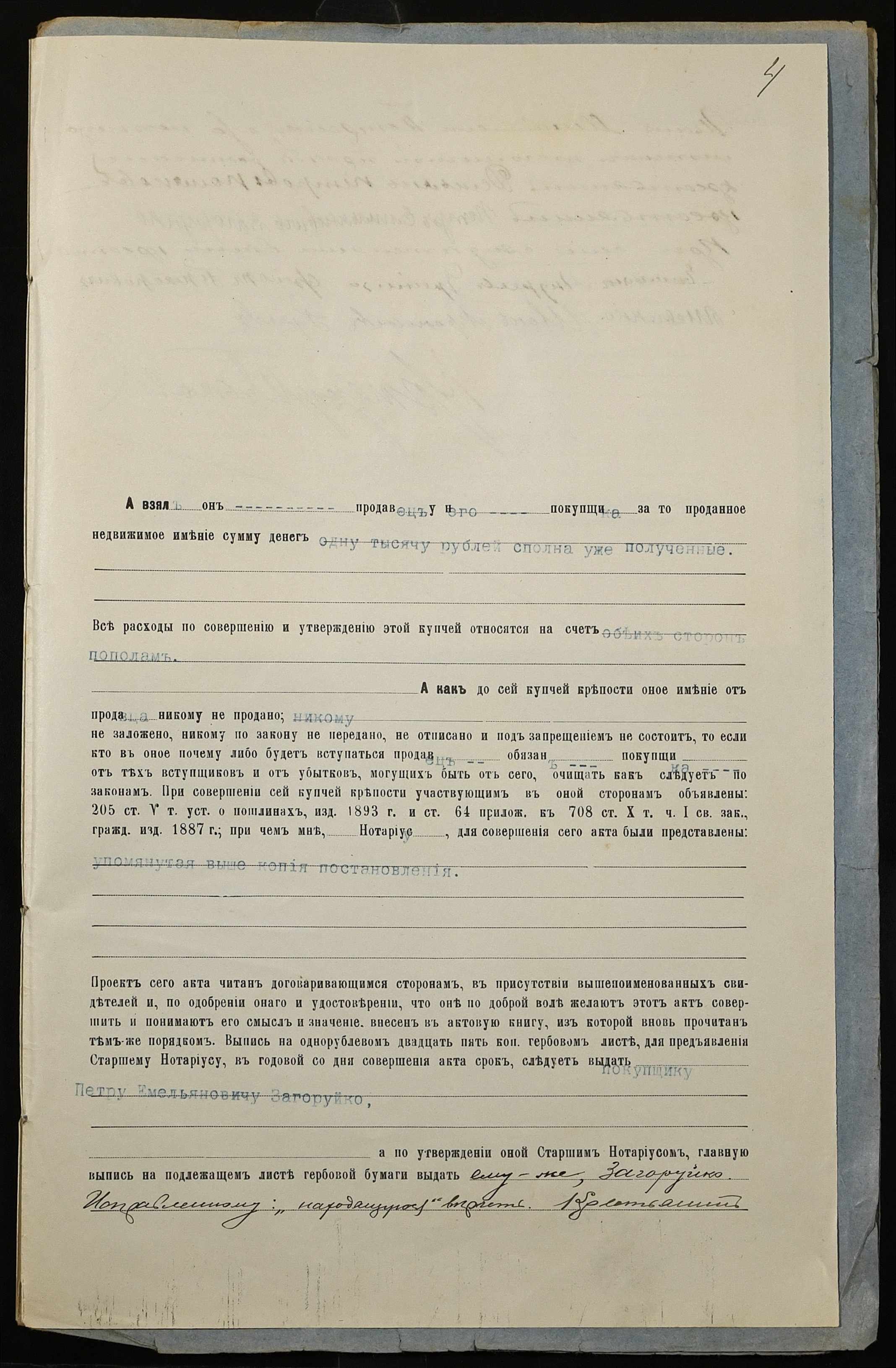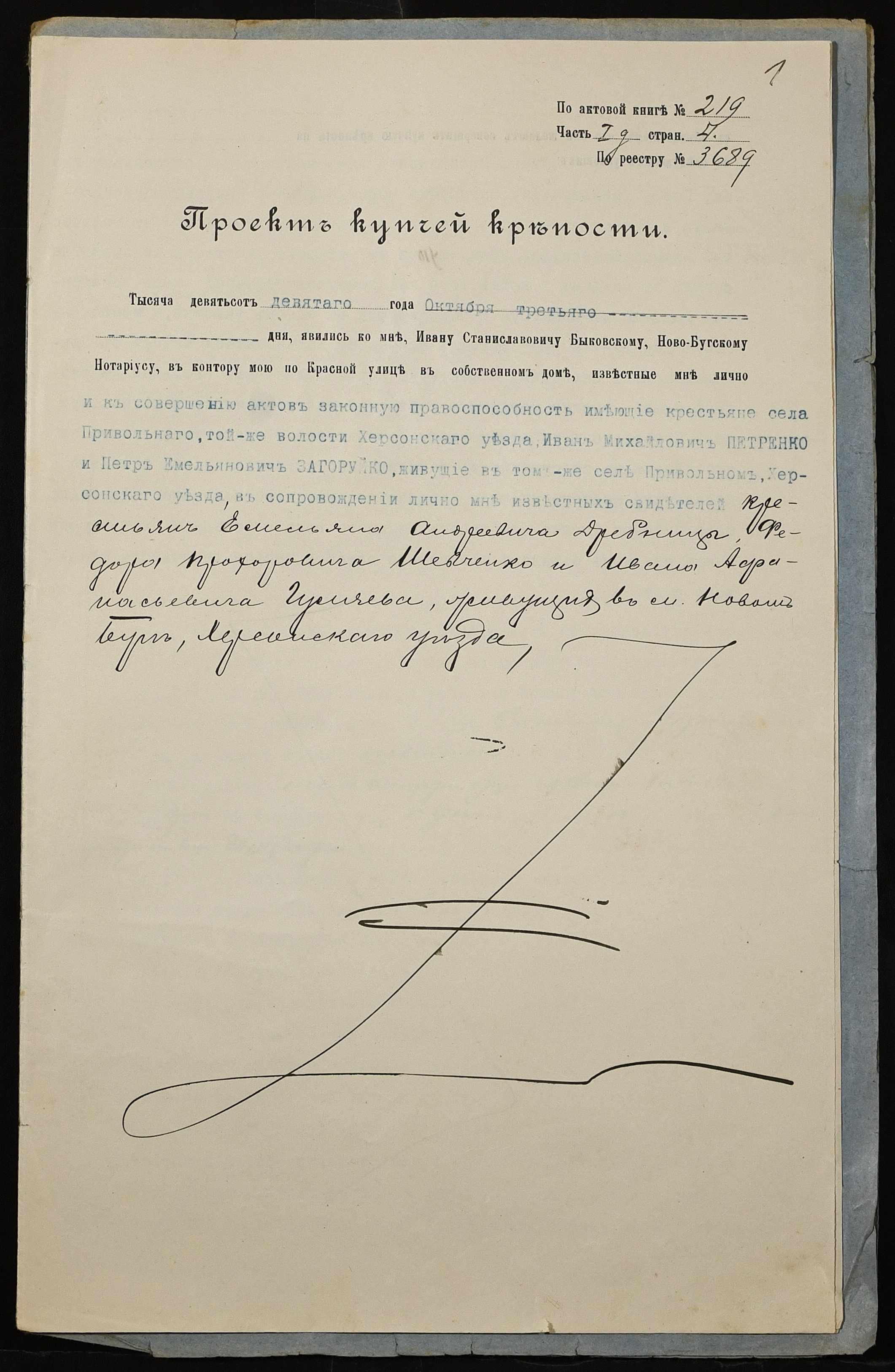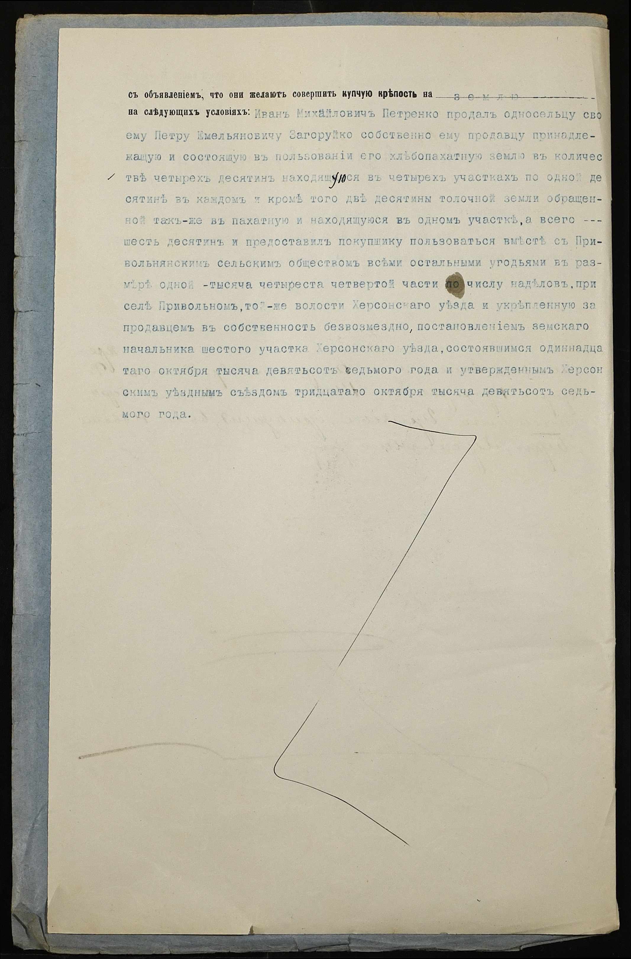 • • • • Справа № 237 “Справа про вчинення купчої про продаж землі селянином Петренком Іваном (Петренко Иваном) Михайловичем на користь селянина Загоруйка (Загоруйко) Петра Омеляновича (Емельяновича)”