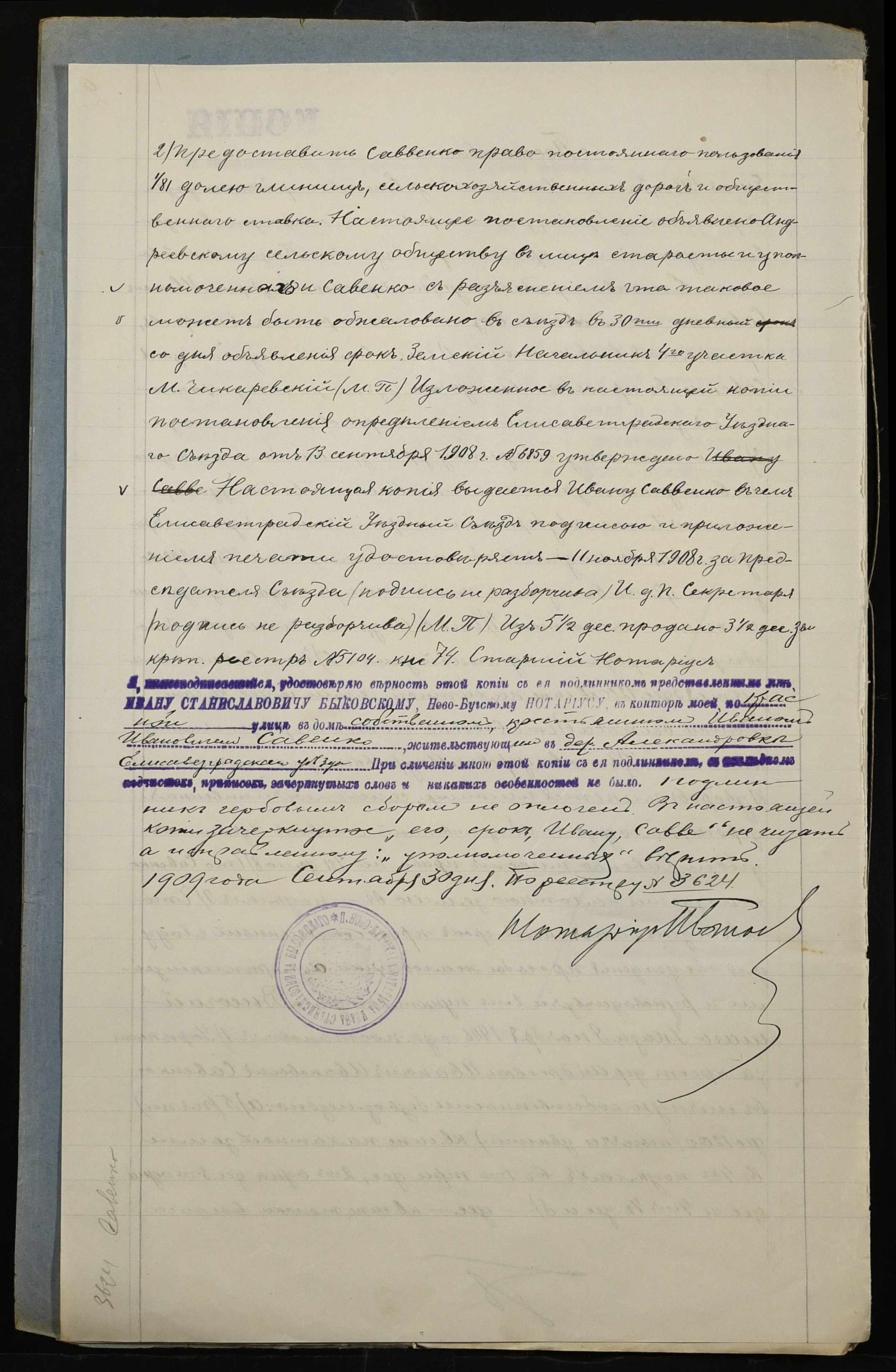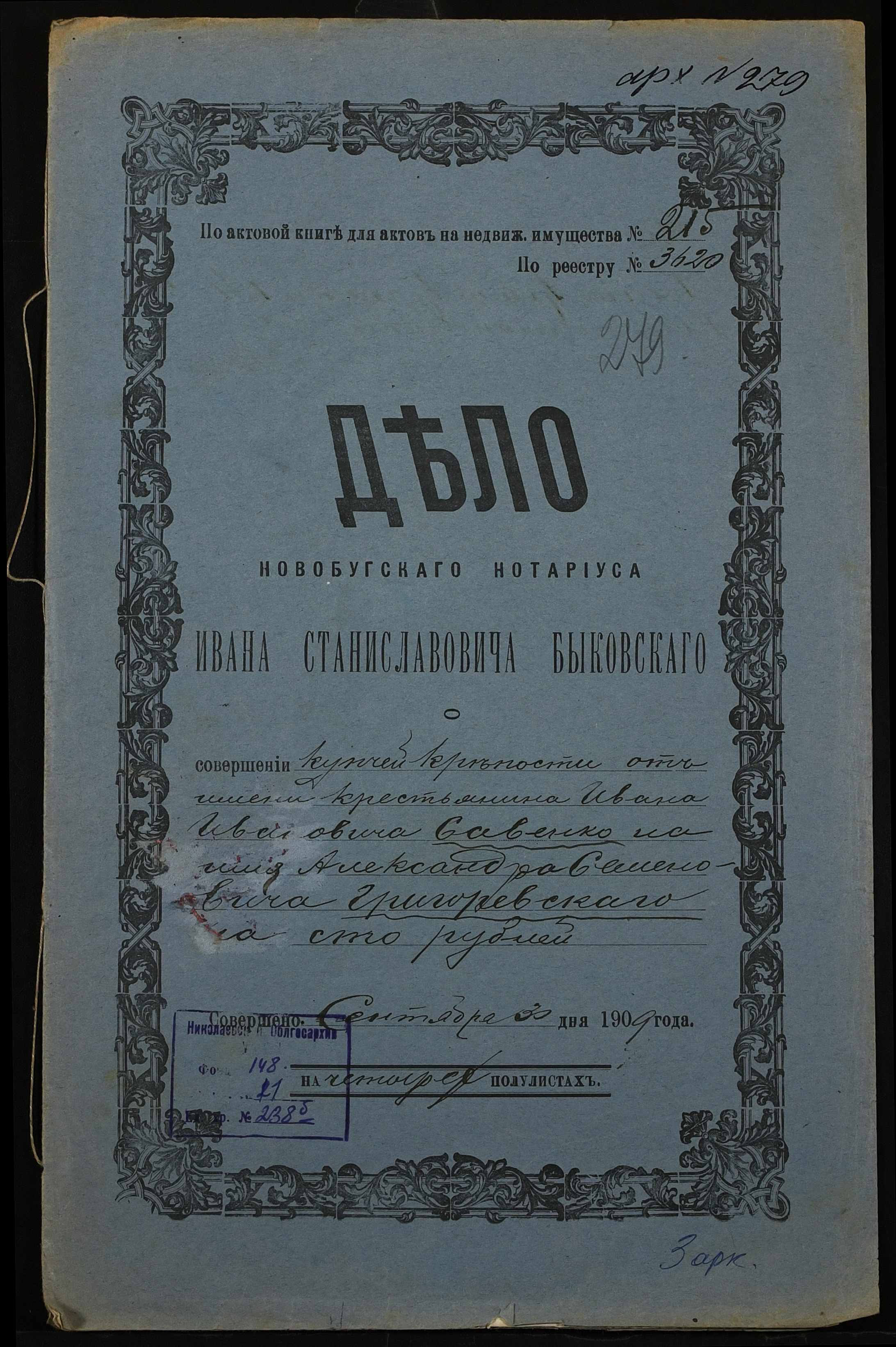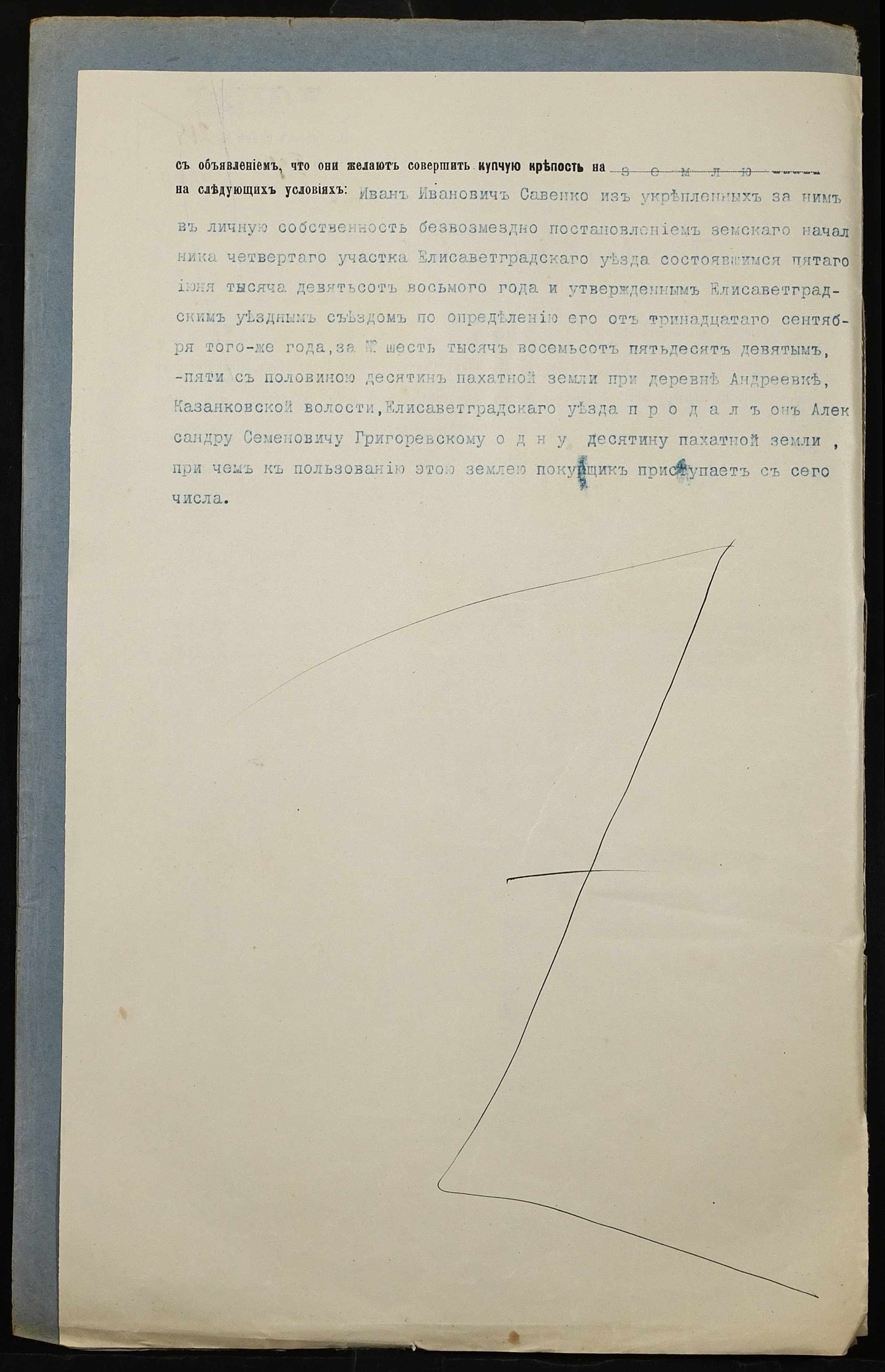 • • • • Справа № 238б “Справа про вчинення купчої про продаж землі селянином Савенком Іваном Івановичем (Савенко Иваном Ивановичем) на користь селянина Григоревського Олександра (Григоревского Александра) Семеновича”