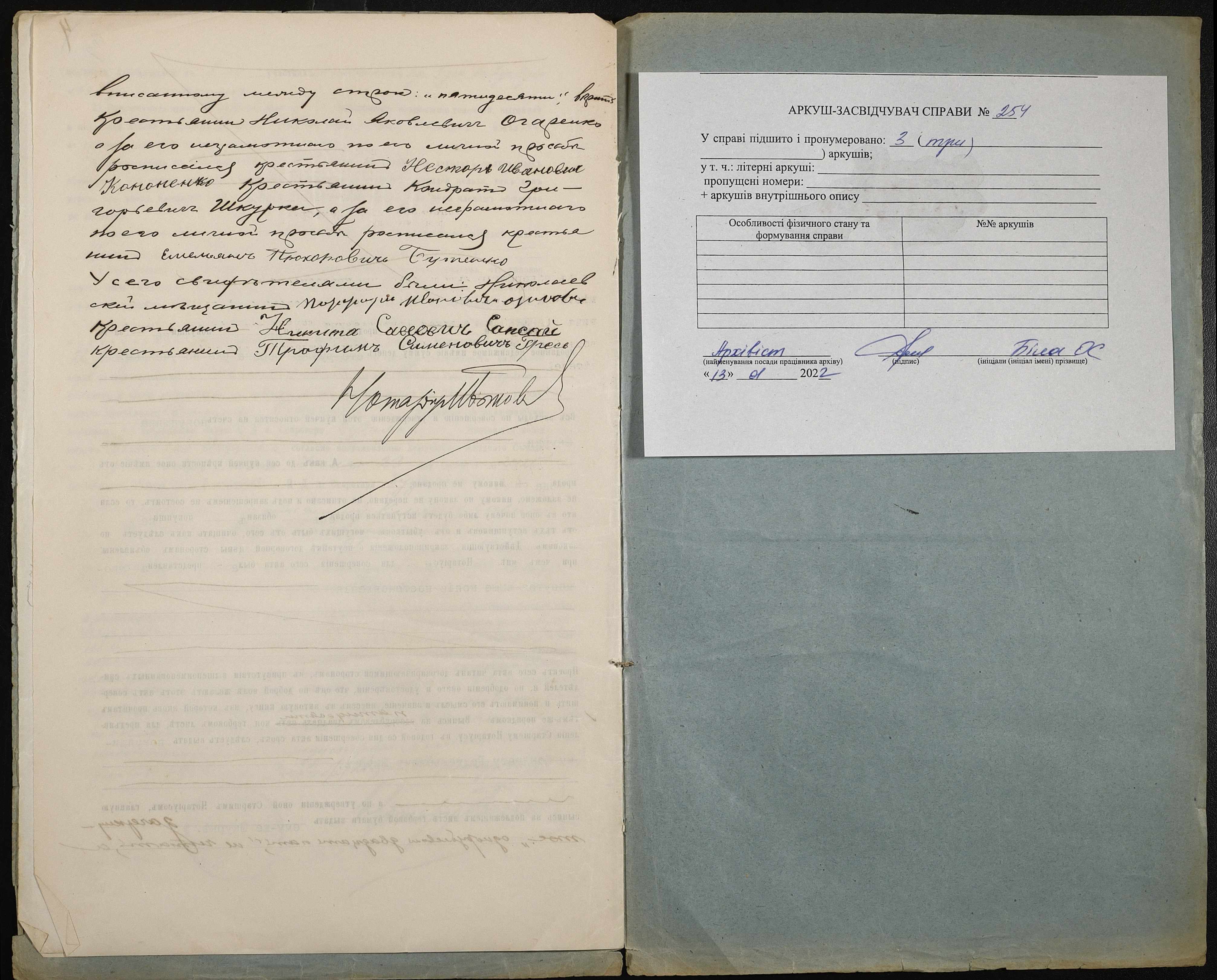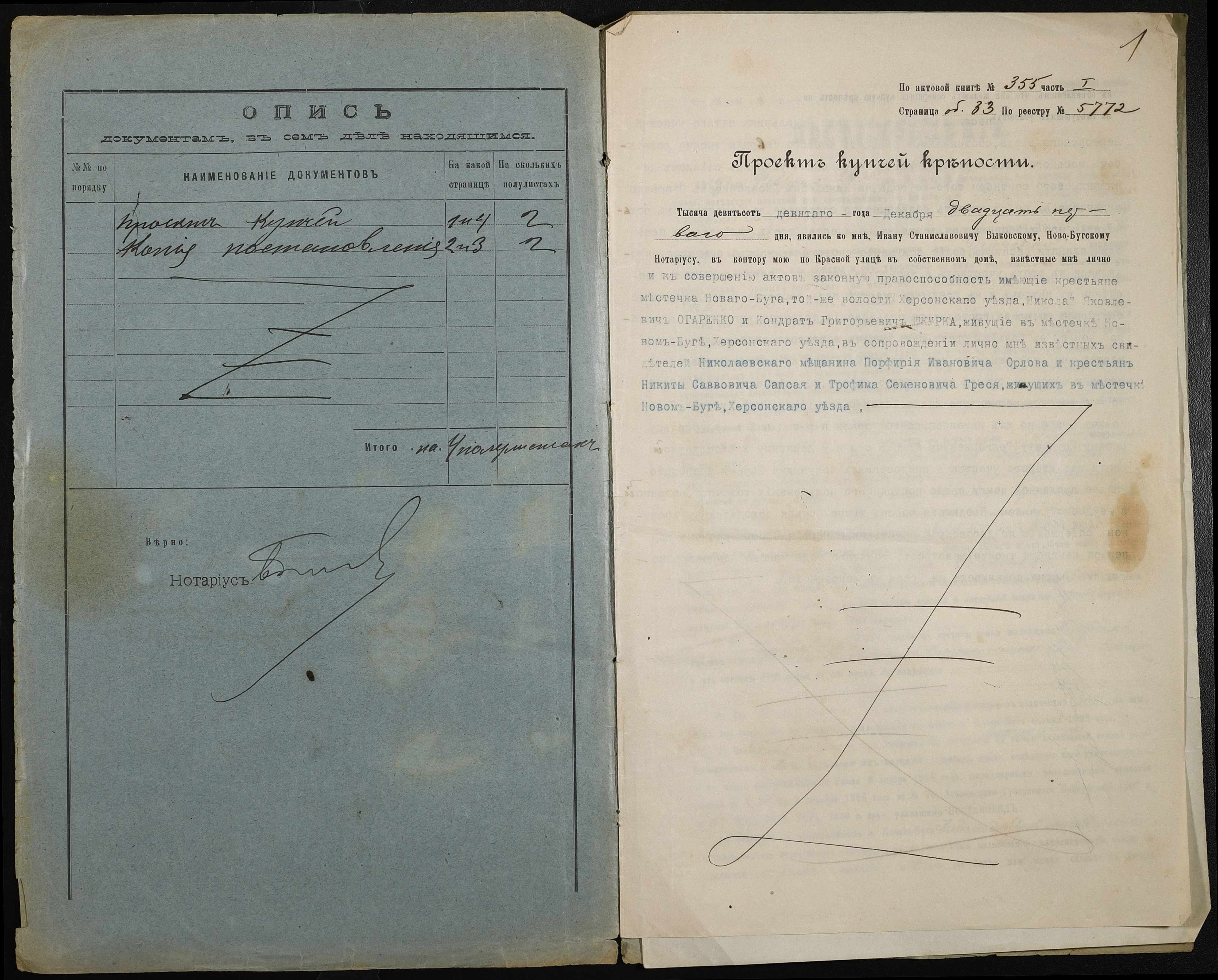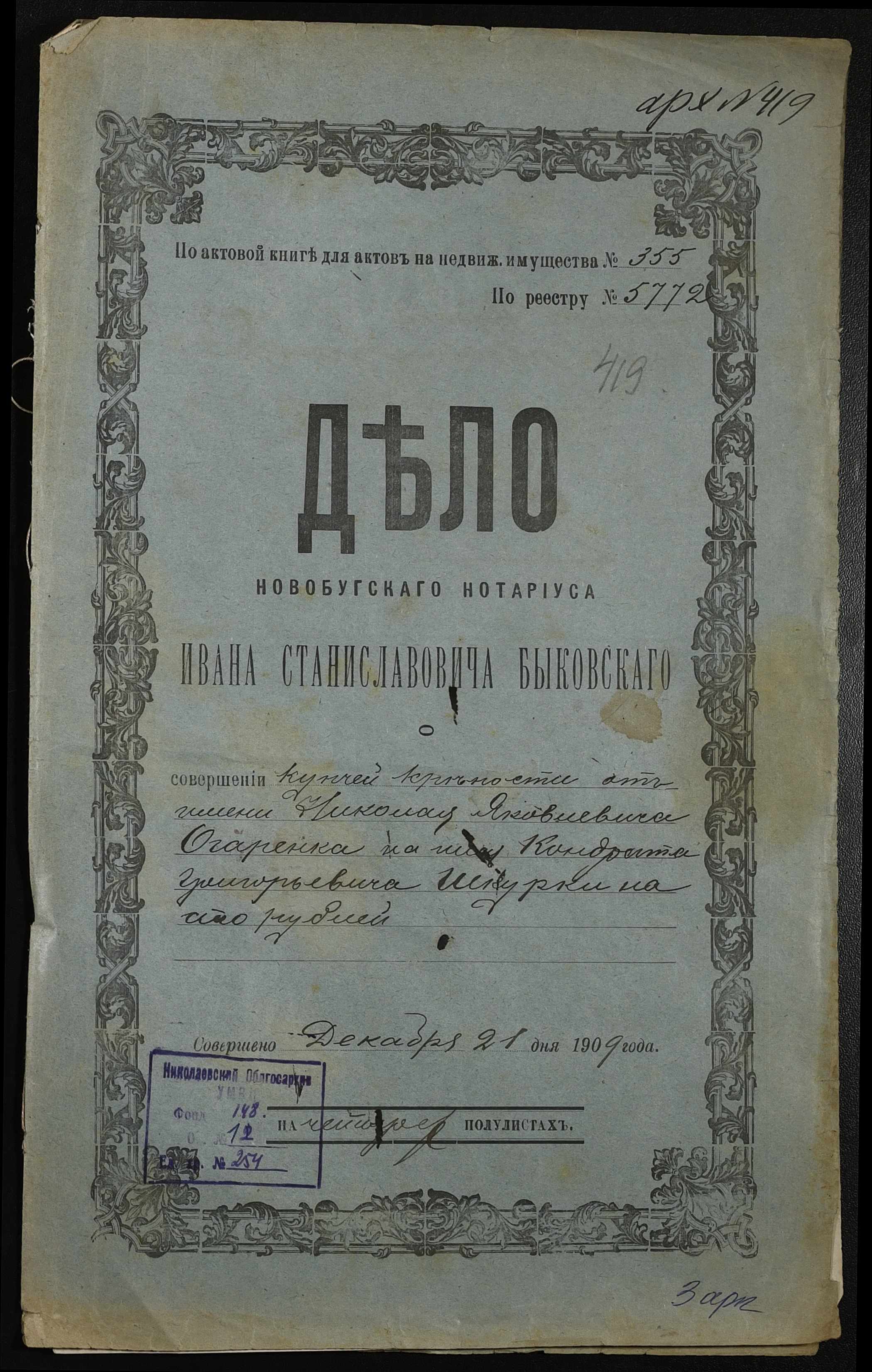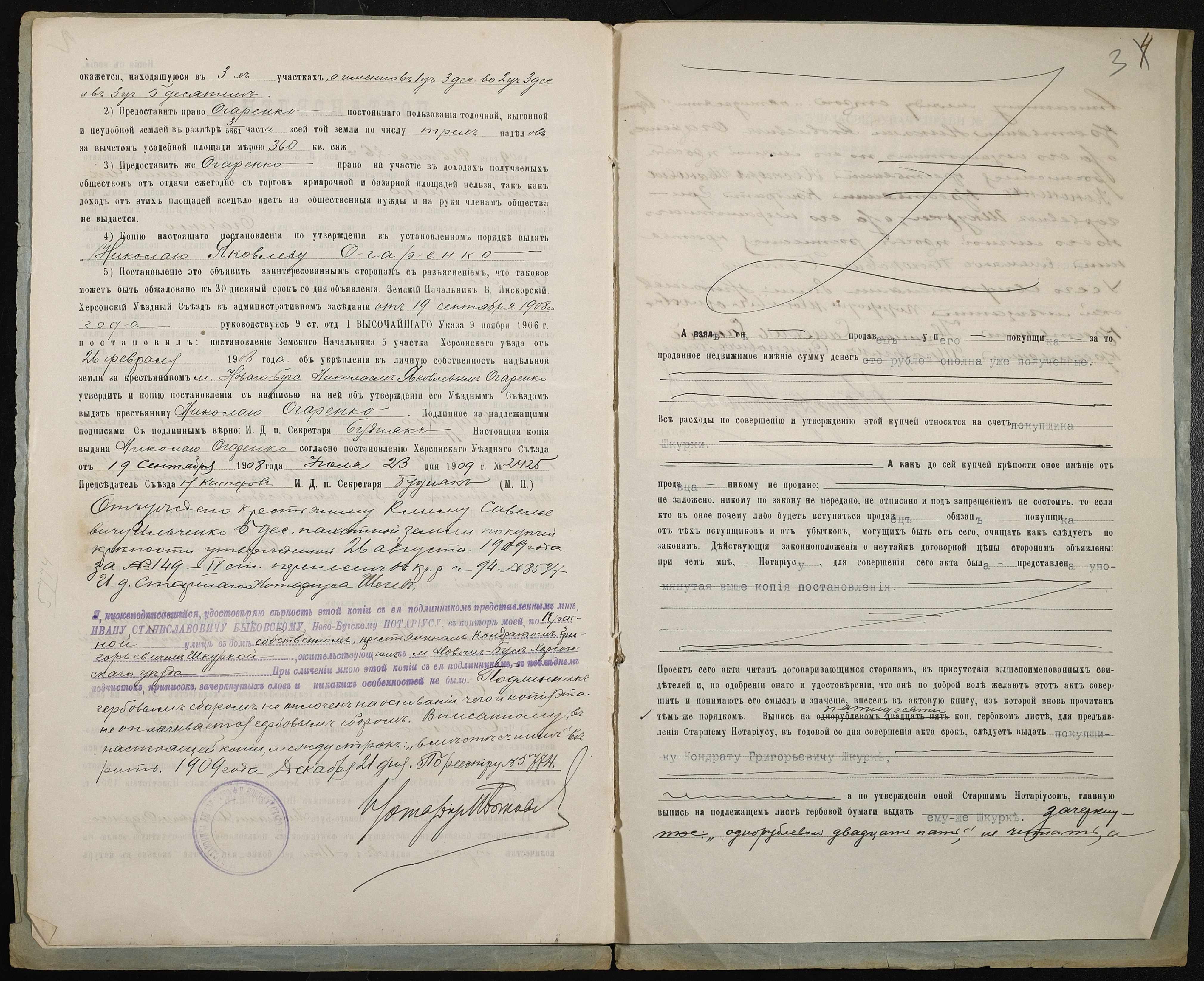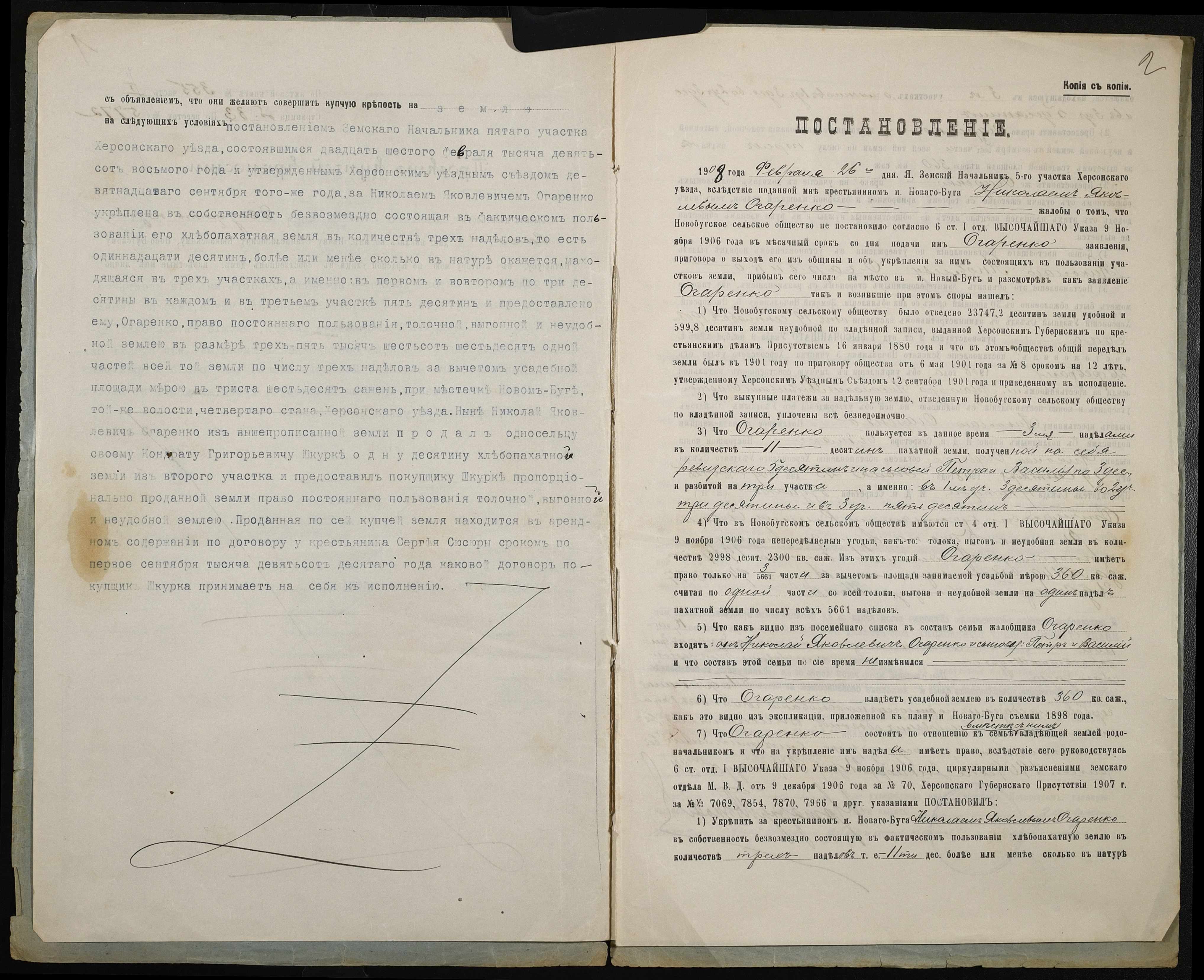 • • • • Справа № 254 “Справа про вчинення купчої про продаж землі селянином Огаренком Миколою Яковичем (Огаренко Николаем Яковлевичем) на користь селянина Шкурки Кіндрата Григоровича (Кондрата Григорьевича)”