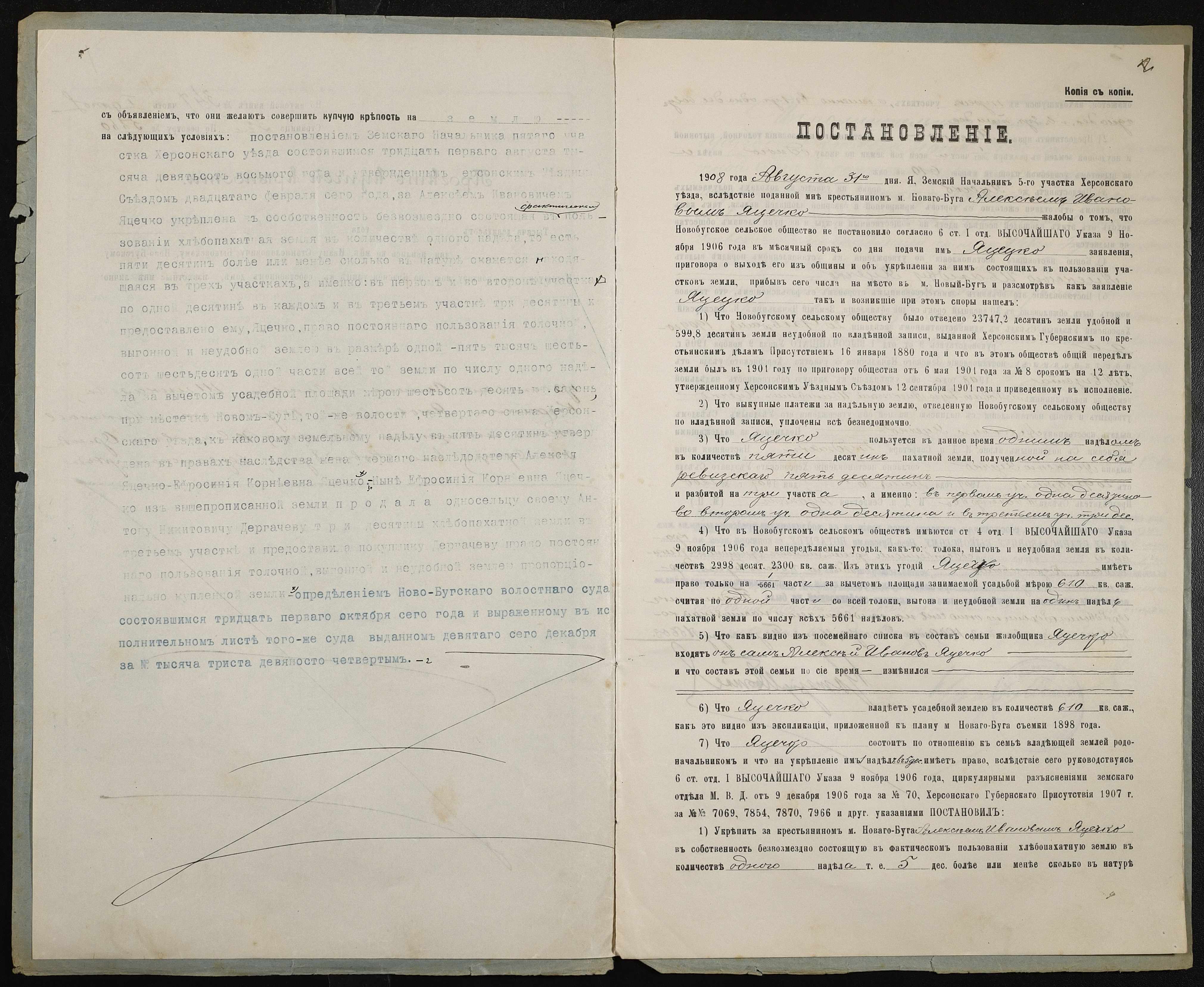 • • • • Справа № 262 “Справа про вчинення купчої про продаж землі селянкою Яцечко Єфросинією Корніївною (Ефросинией Корнеевной) на користь селянина Дергачова (Дергачева) Антона Микитовича (Никитовича)”