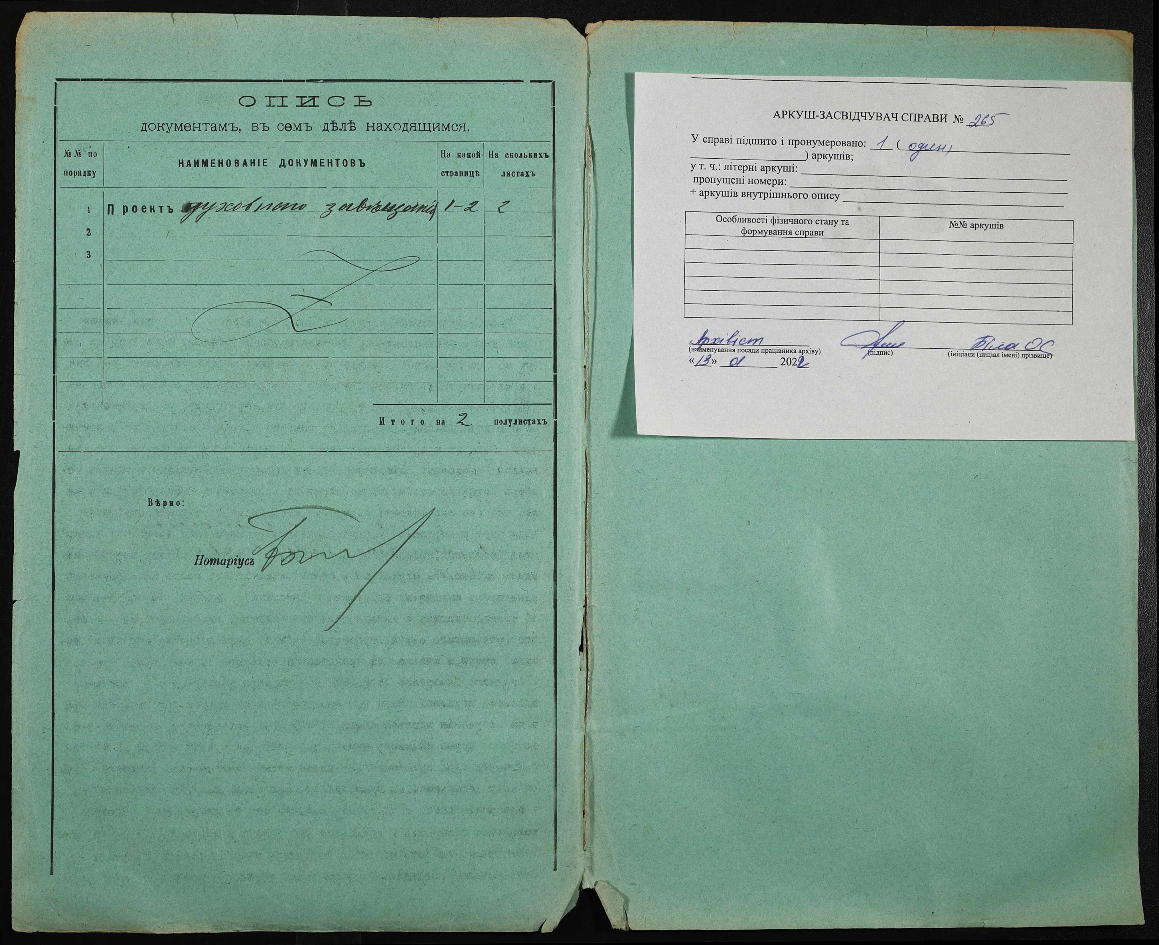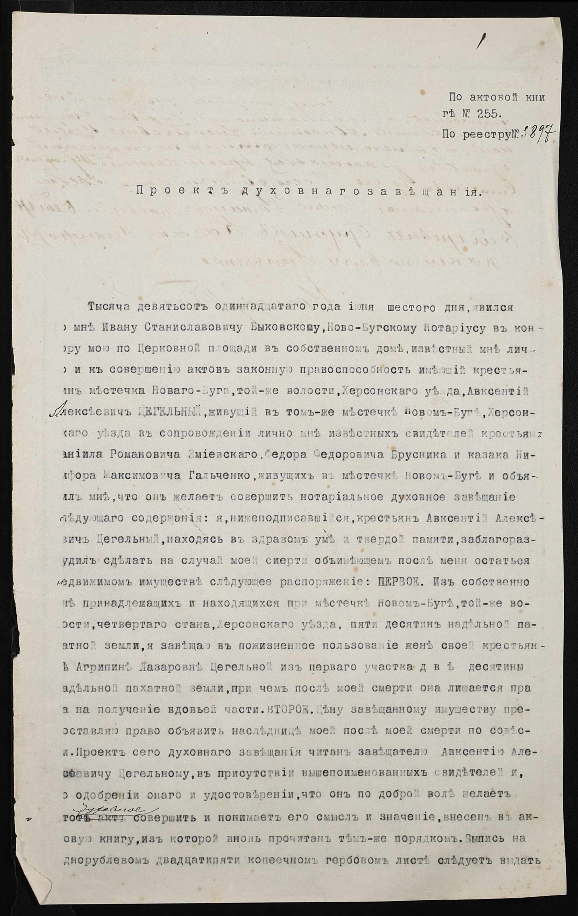 • • • • Справа № 265 “Проєкт духівниці Цегельного Овксентія Олексійовича (Авксентия Алексеевича)”