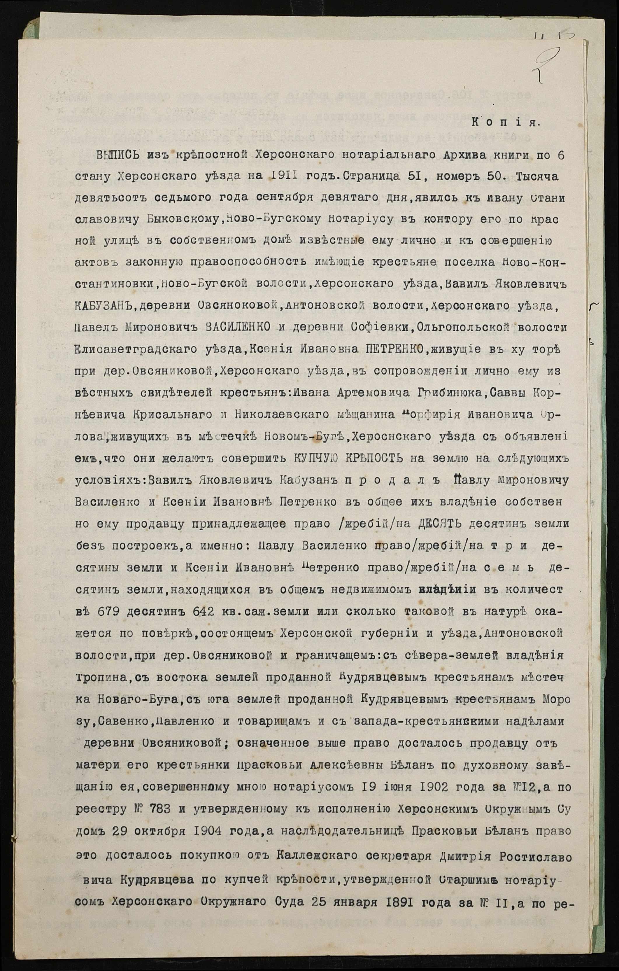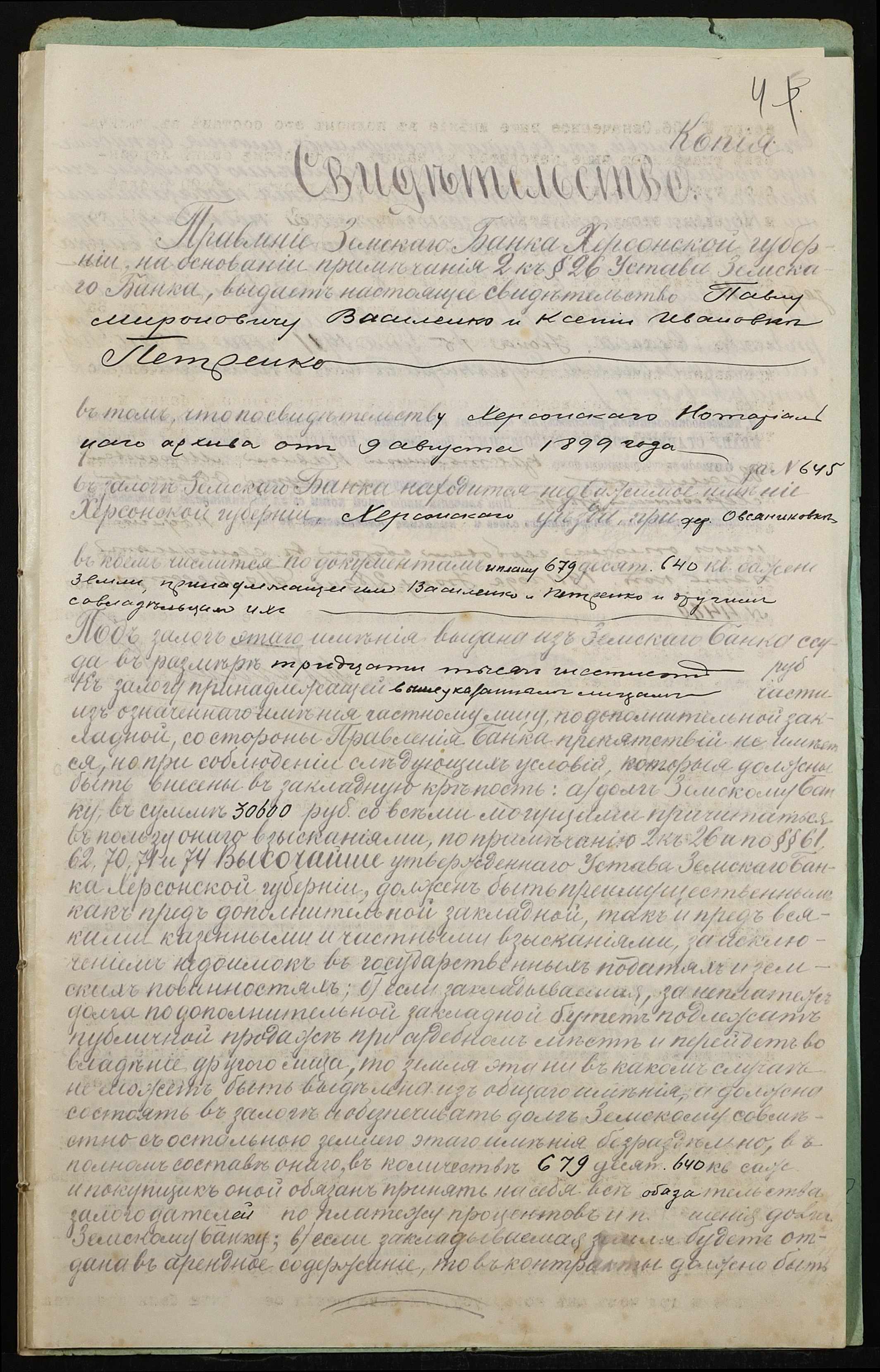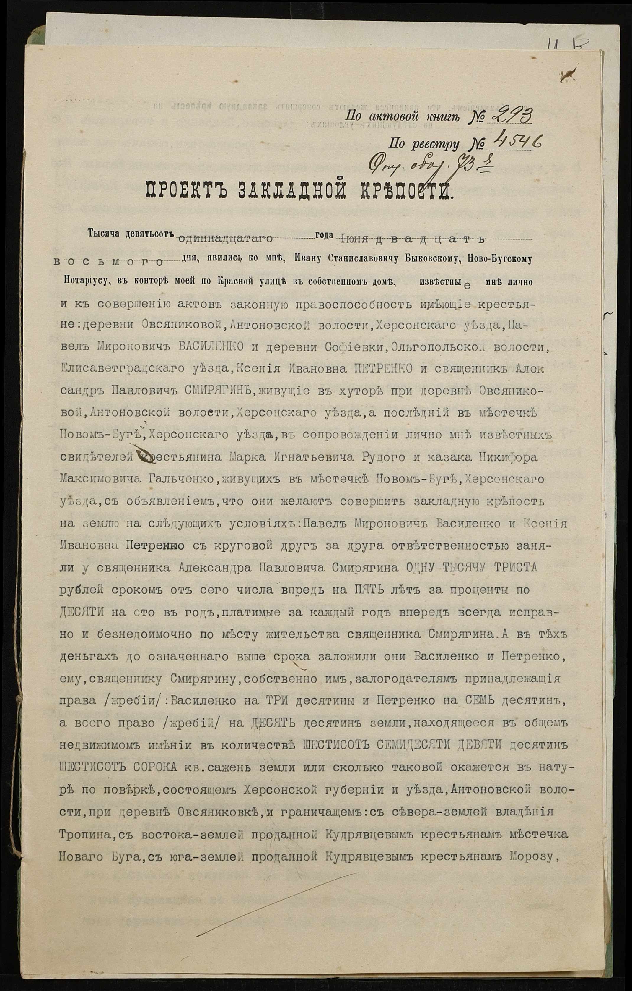 • • • • Справа № 272 “Справа про вчинення закладної на землю, заставлену селянами Василенком (Василенко) Павлом Мироновичем і Петренко Ксенією Іванівною (Ксенией Ивановной) священнику Смирягіну Олександру (Смирягину Александру) Павловичу”