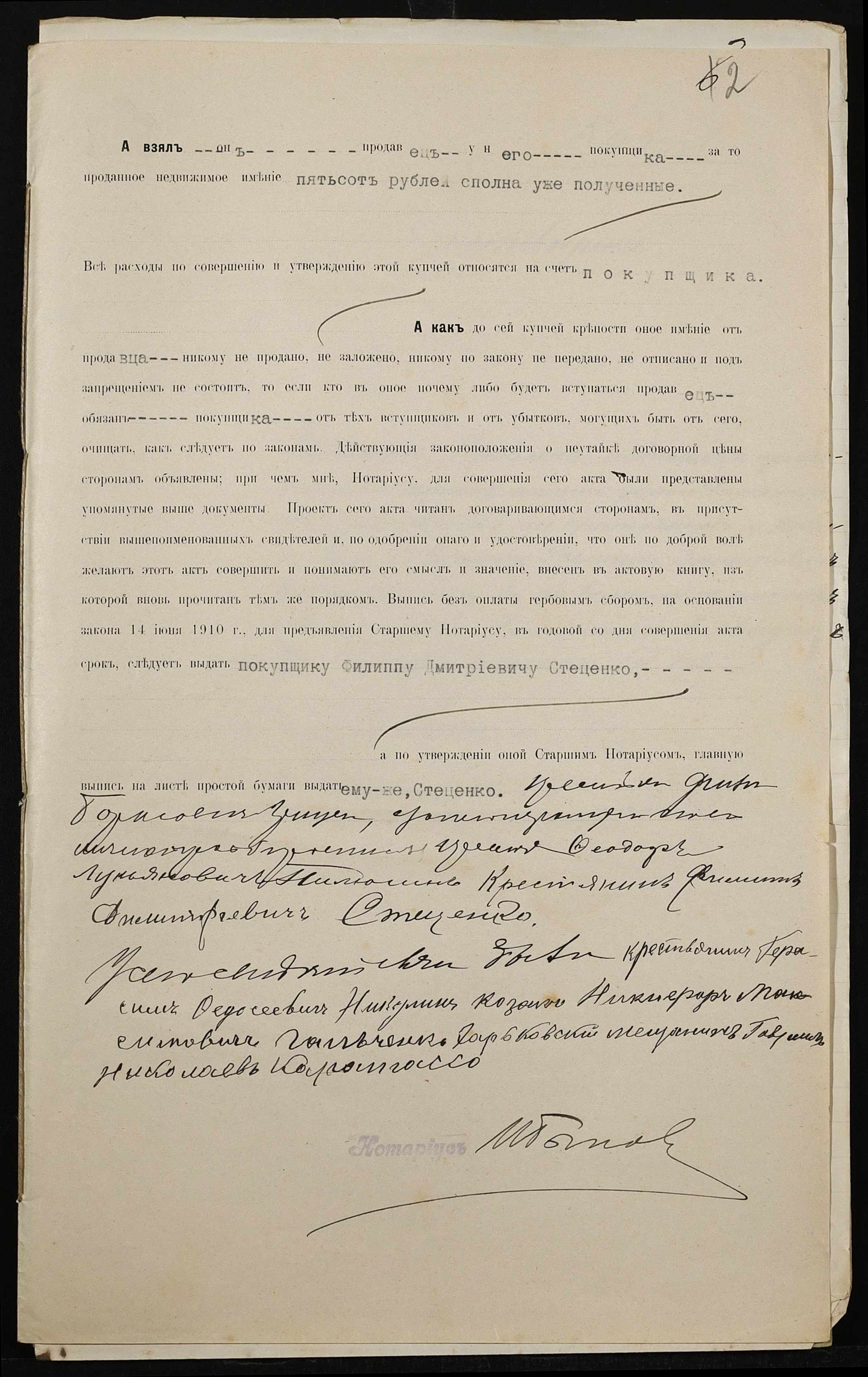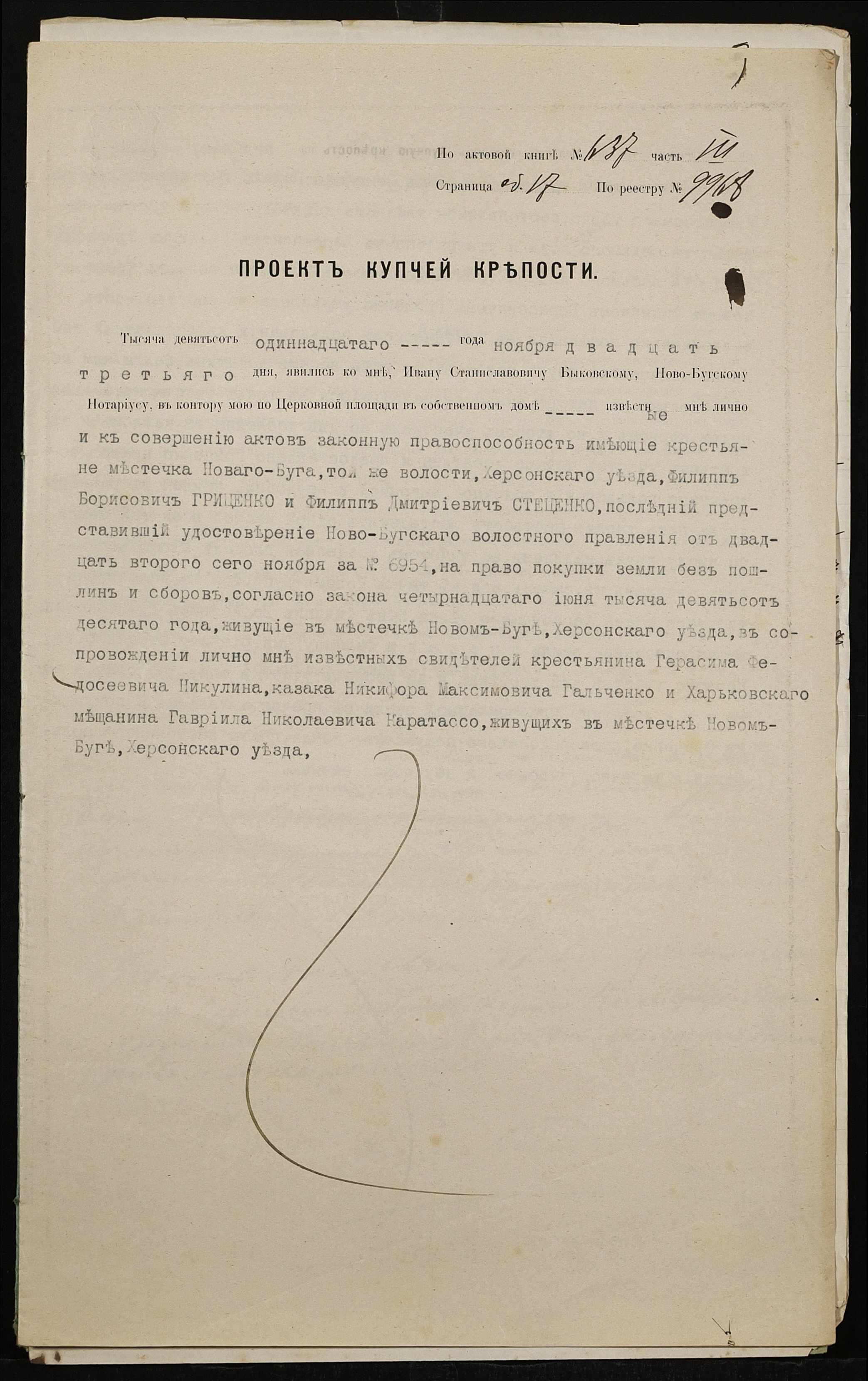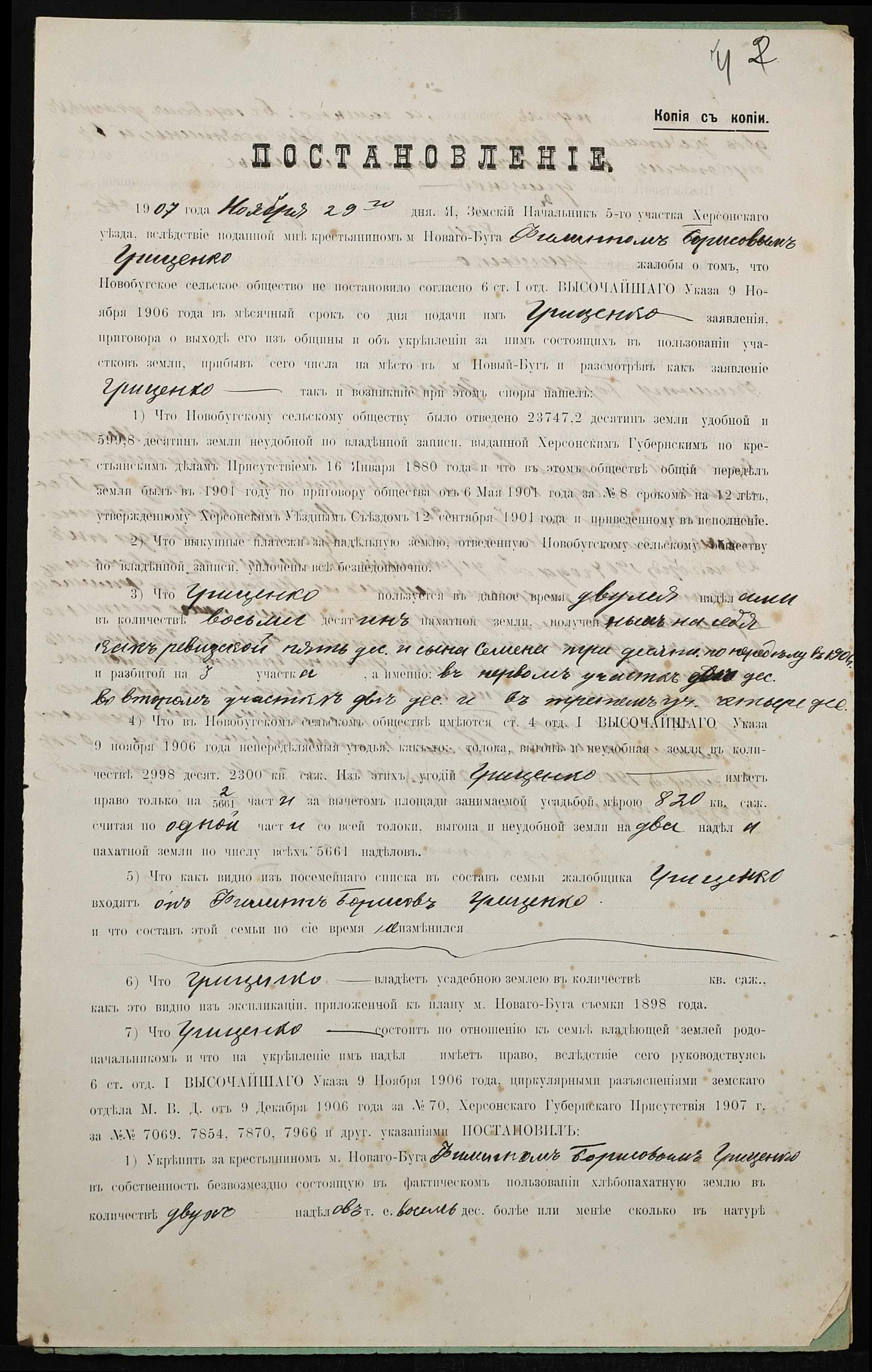 • • • • Справа № 278 “Справа про вчинення купчої про продаж землі селянином Гриценком Пилипом (Гриценко Филиппом) Борисовичем на користь селянина Стеценка Пилипа Дмитровича (Стеценко Филиппа Дмитриевича)”