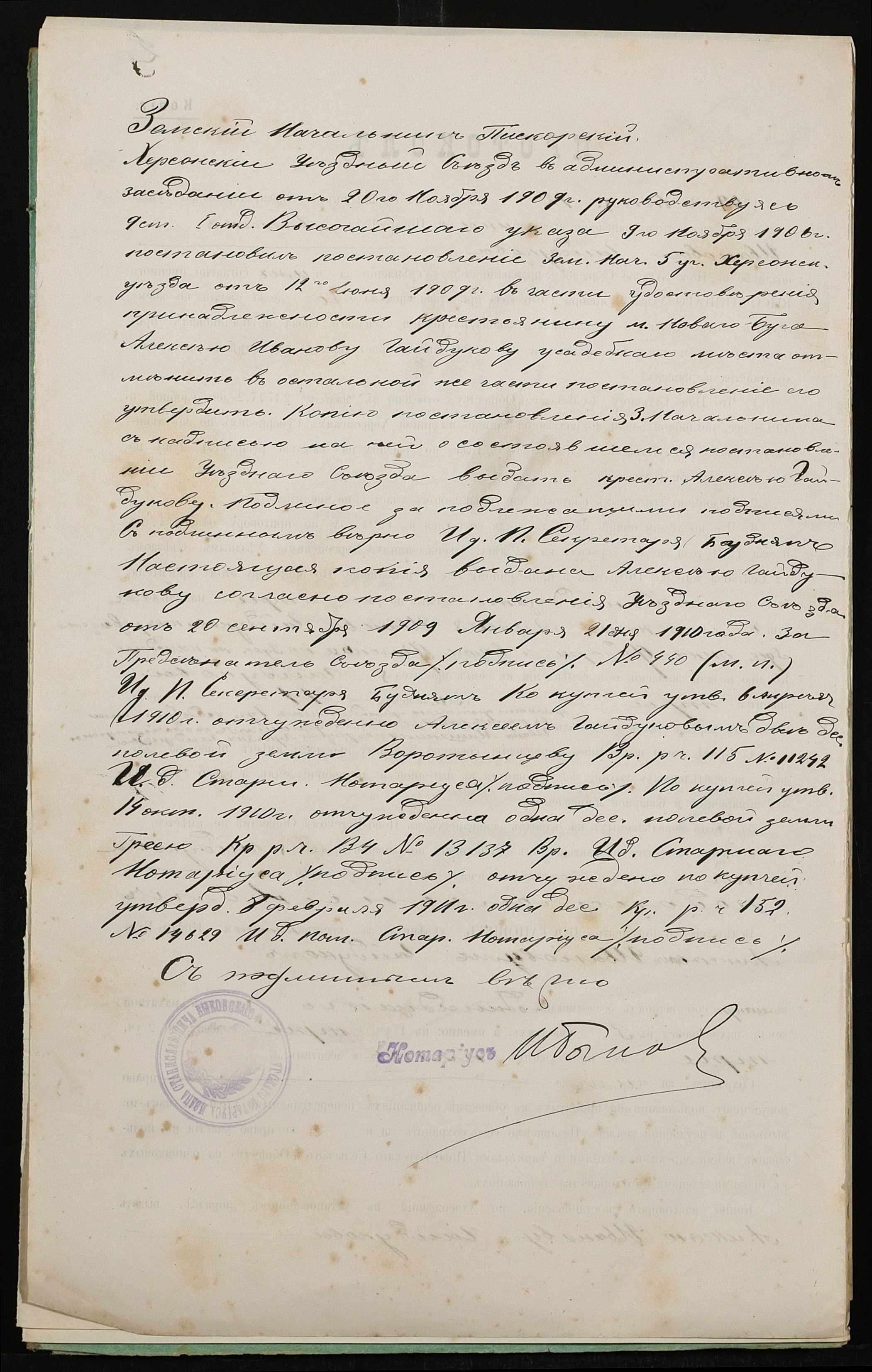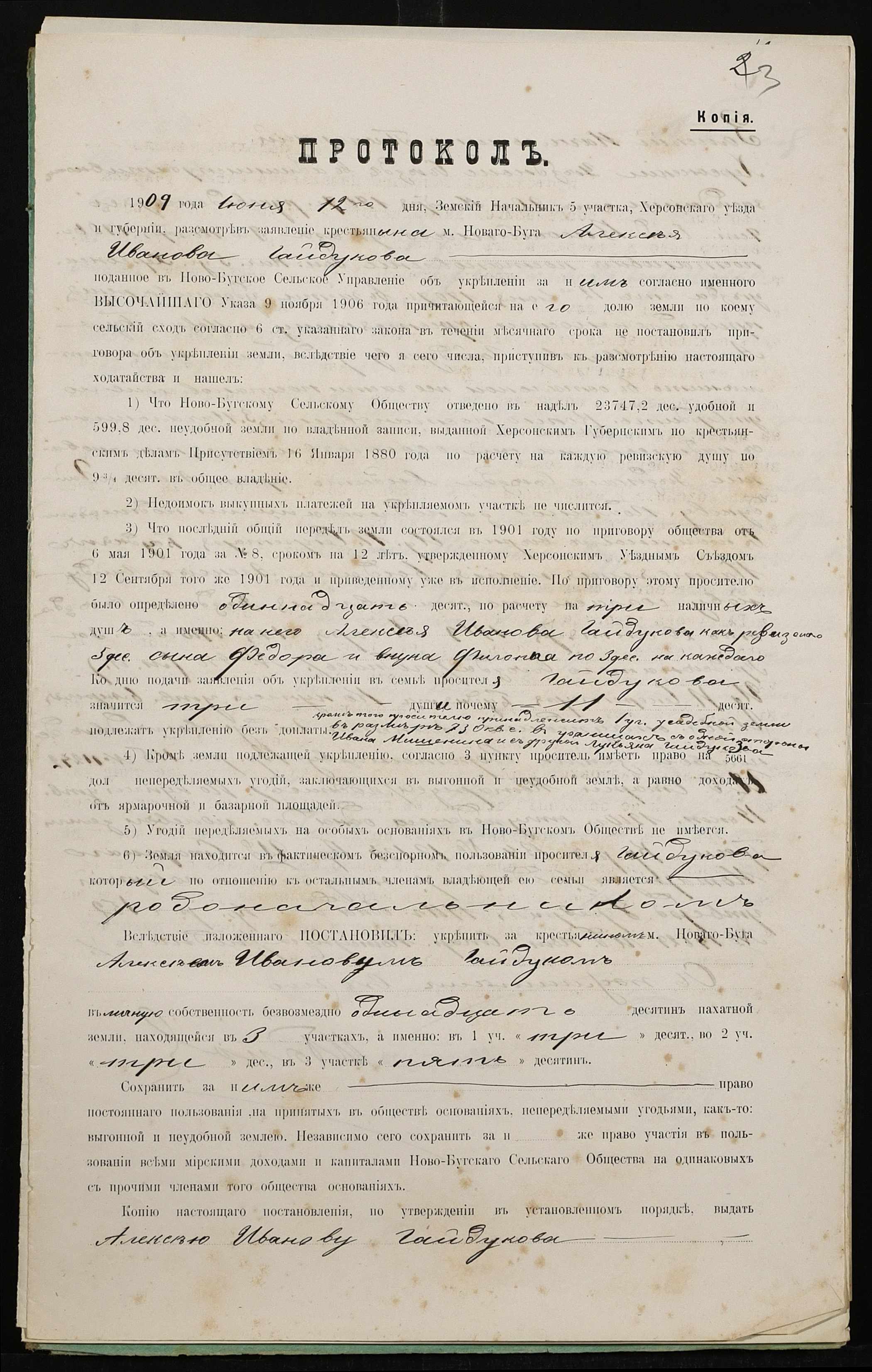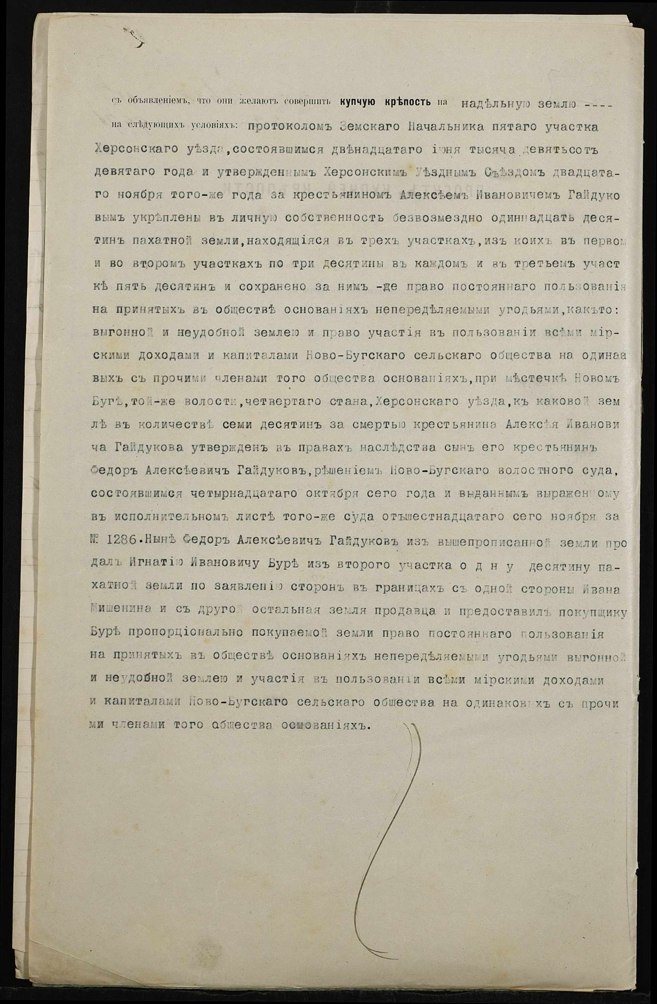 • • • • Справа № 279 “Справа про вчинення купчої про продаж землі селянином Гайдуковим (Гайдуковым) Федором Олексійовичем (Алексеевичем) на користь селянина Бури Гната Івановича (Буры Игната Ивановича)”