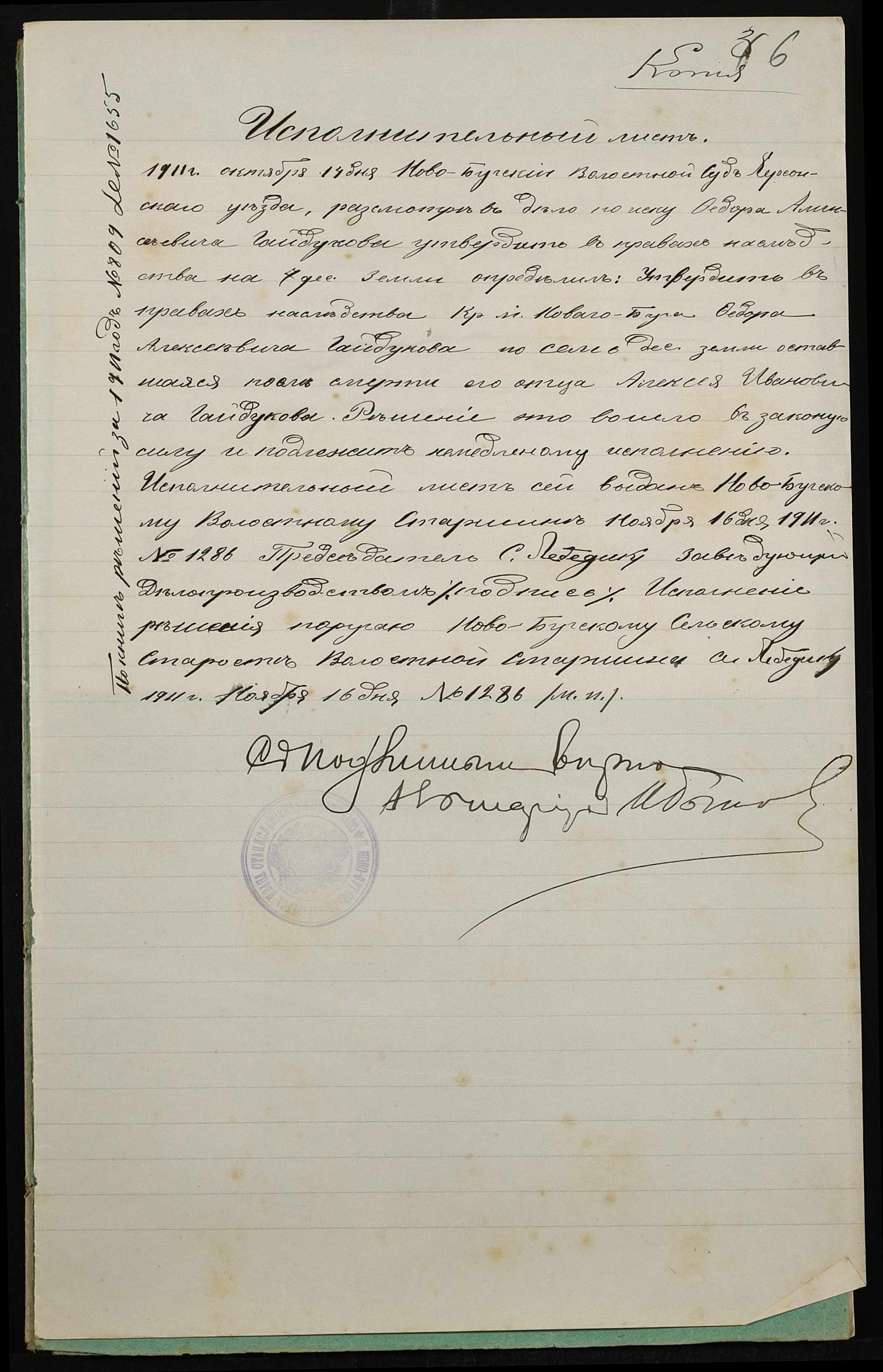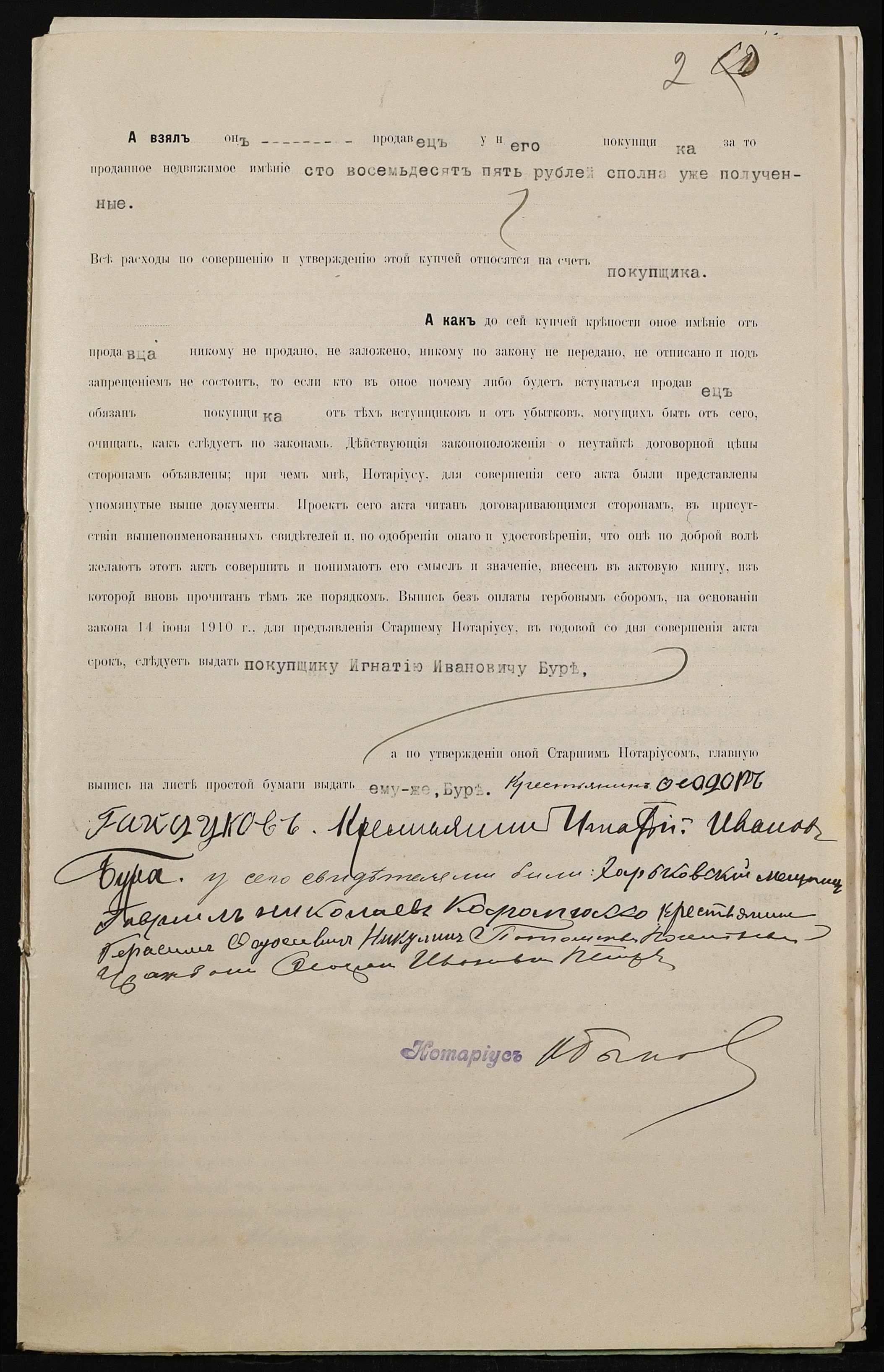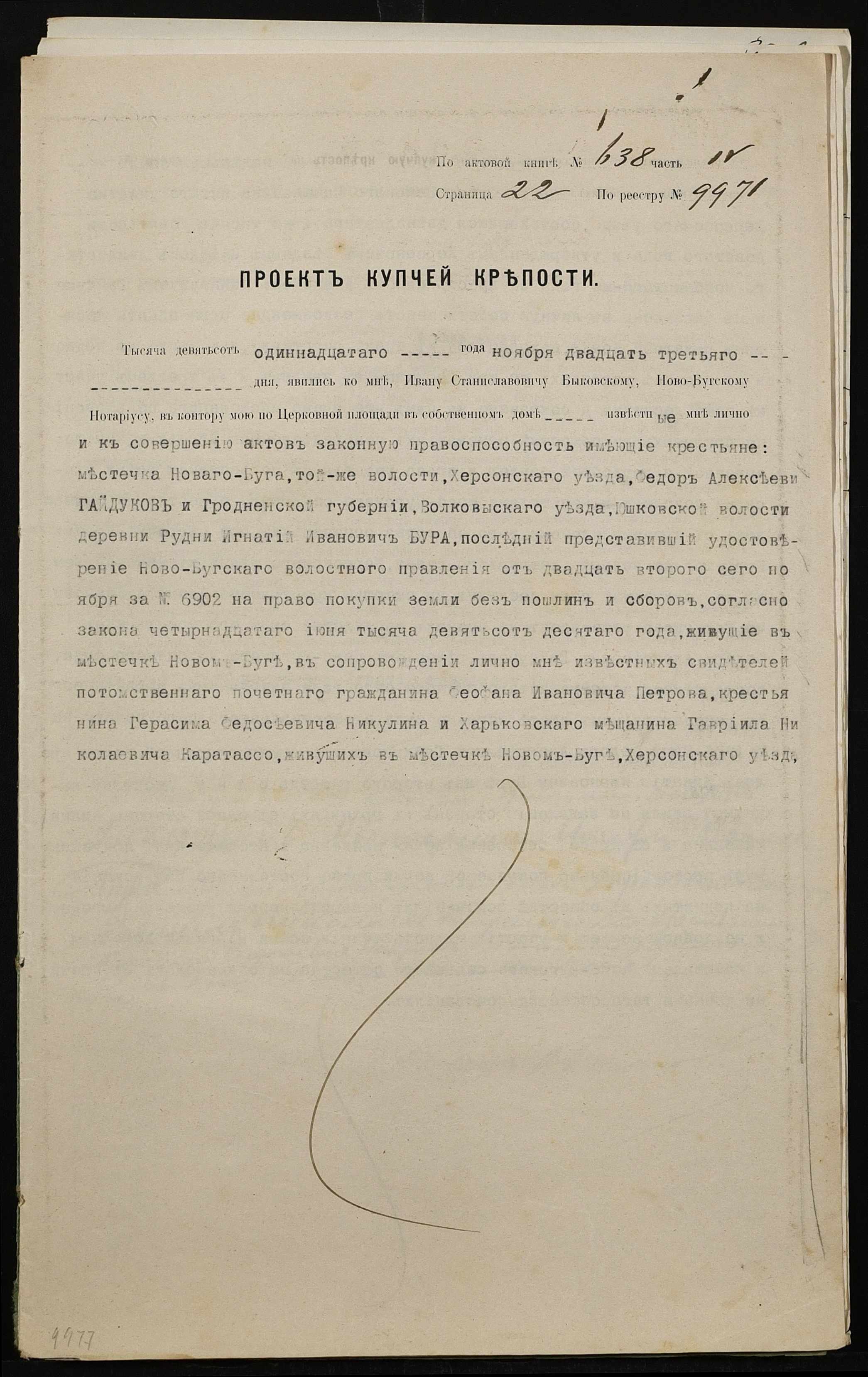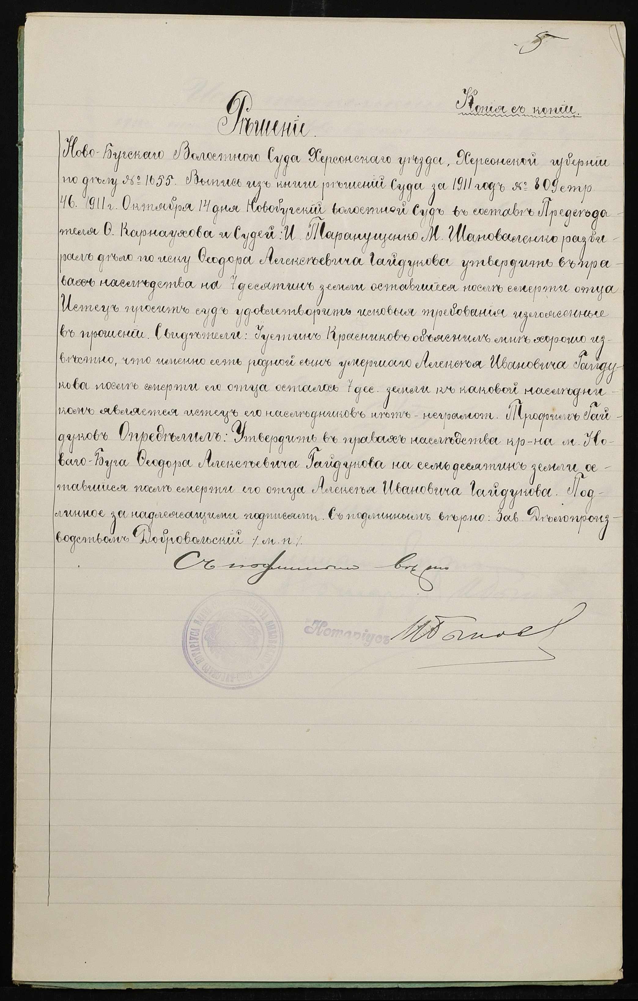 • • • • Справа № 279 “Справа про вчинення купчої про продаж землі селянином Гайдуковим (Гайдуковым) Федором Олексійовичем (Алексеевичем) на користь селянина Бури Гната Івановича (Буры Игната Ивановича)”
