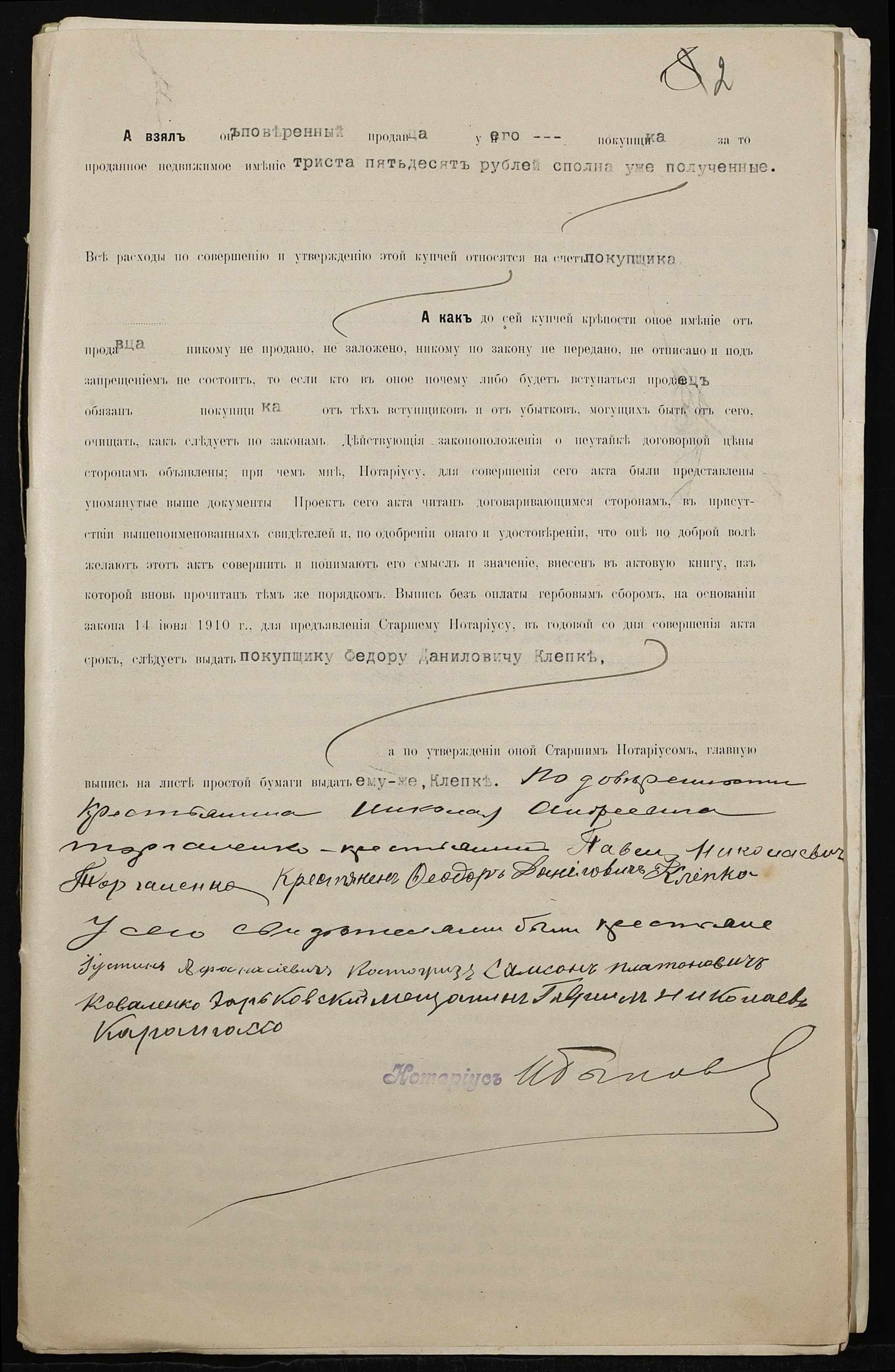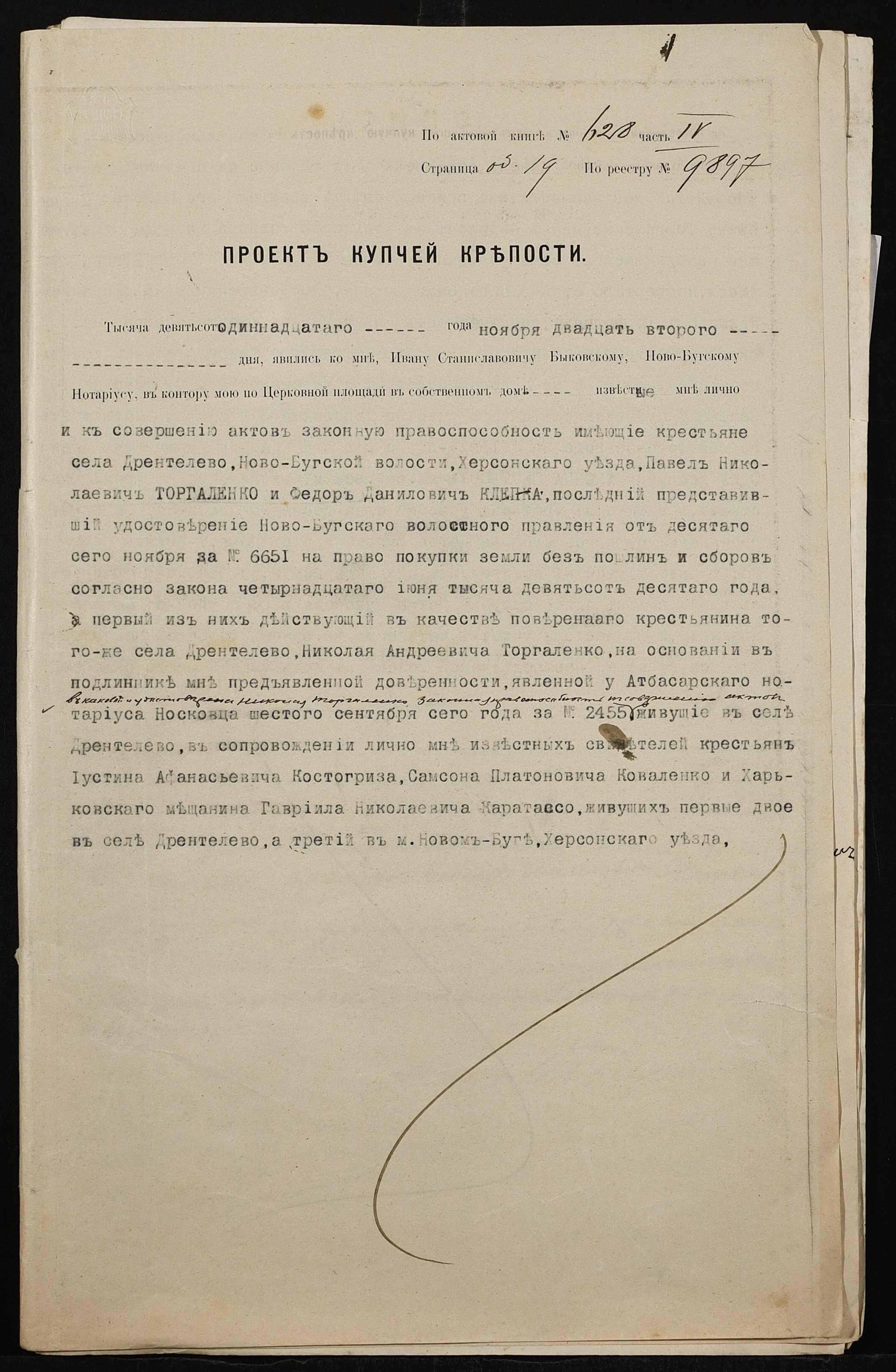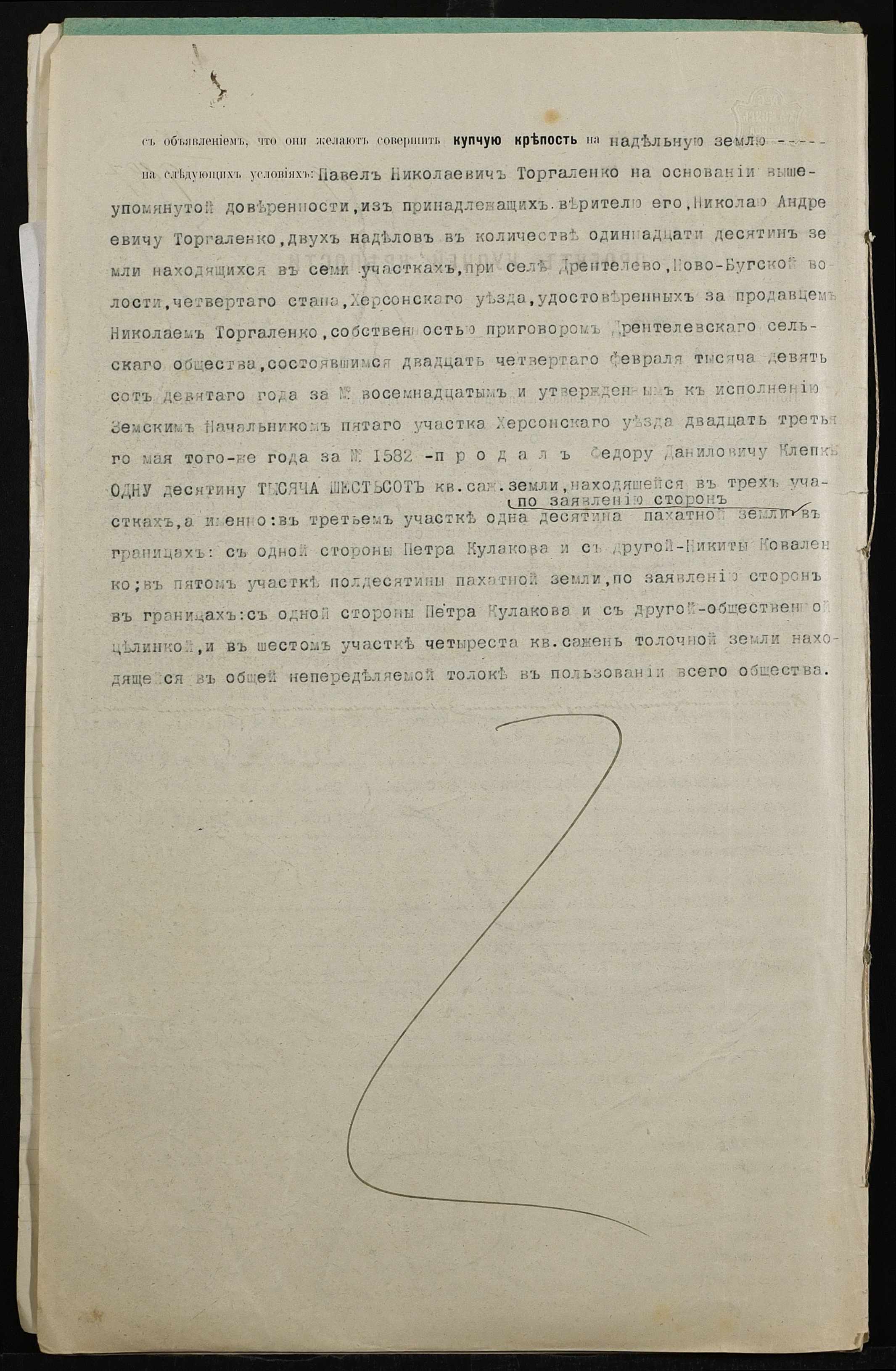 • • • • Справа № 286 “Справа про вчинення купчої про продаж землі селянином Торгаленком Миколою Андрійовичем (Торгаленко Николаем Андреевичем) на користь селянина Клепки Федора Даниловича”