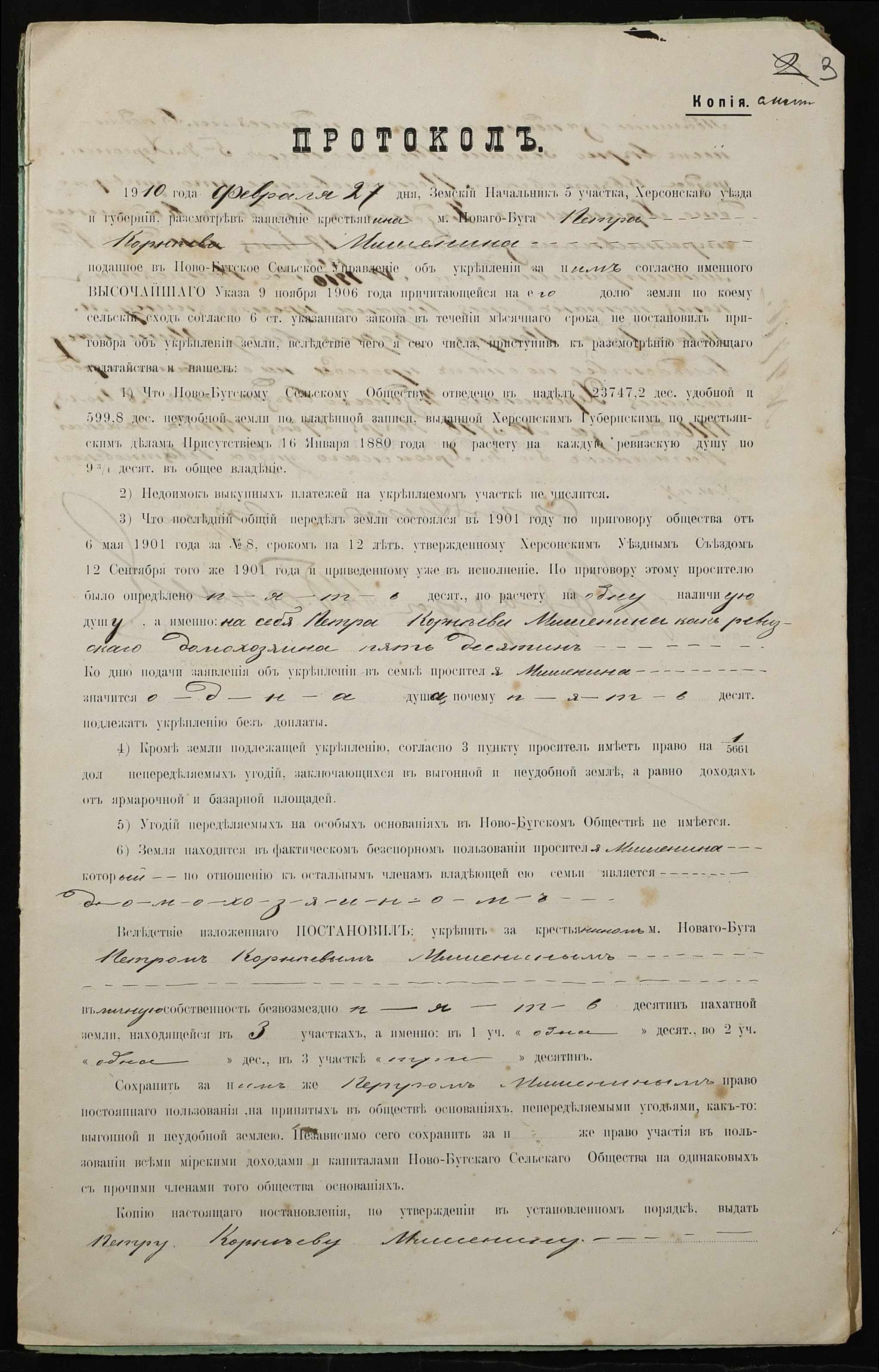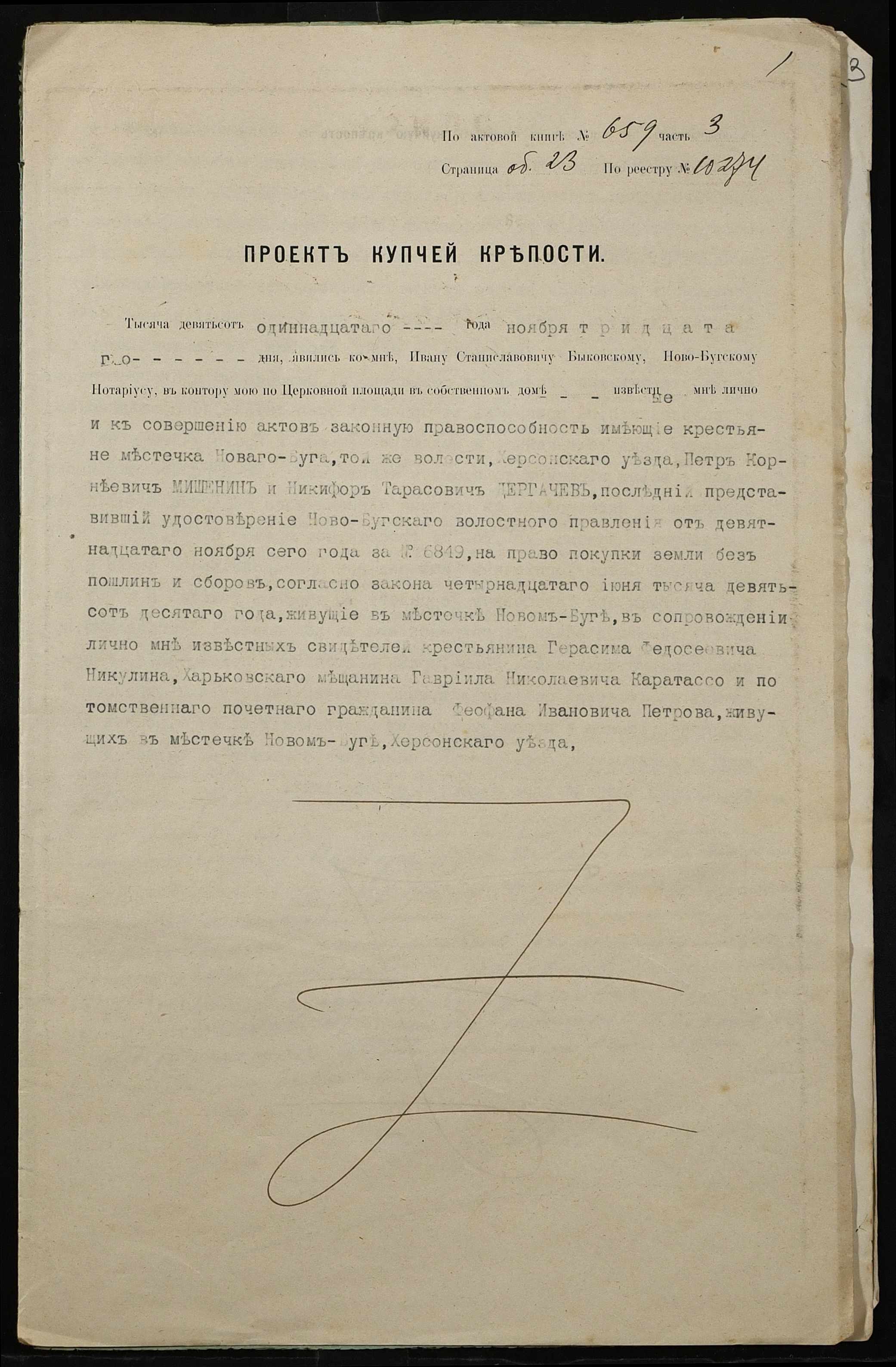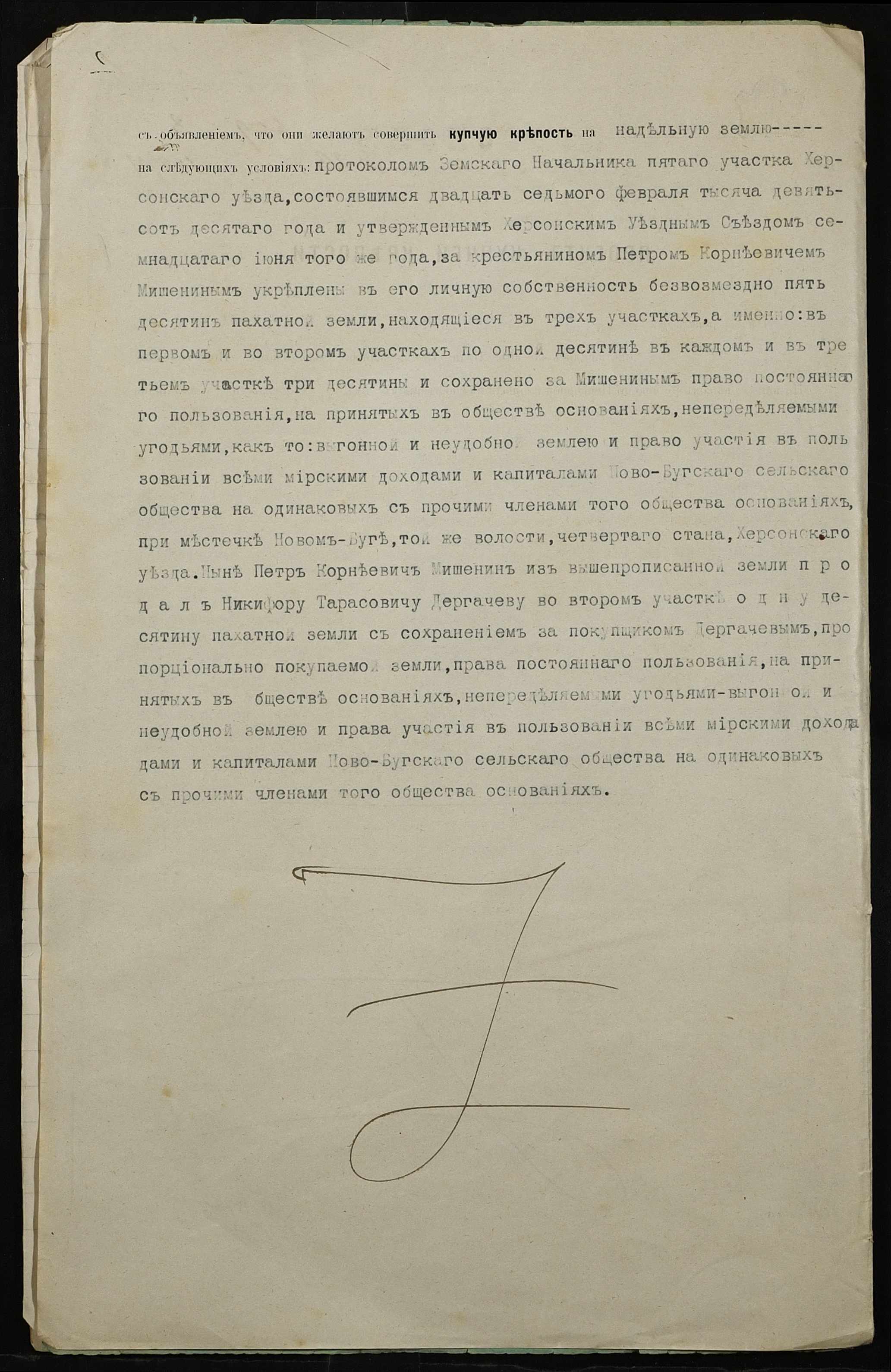 • • • • Справа № 291 “Справа про вчинення купчої про продаж землі селянином Мішеніним (Мишениным) Петром Корнійовичем (Корнеевичем) на користь селянина Дергачова (Дергачева) Никифора Тарасовича”
