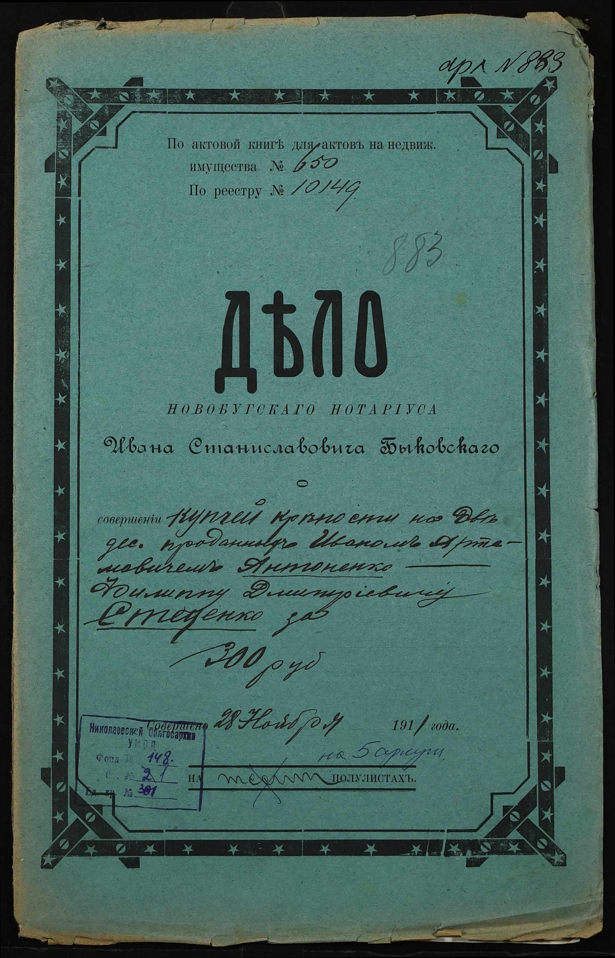 ◦ ◦ Фонд № 148 “Контора новобузького нотаріуса Биковського Івана Станіславовича”