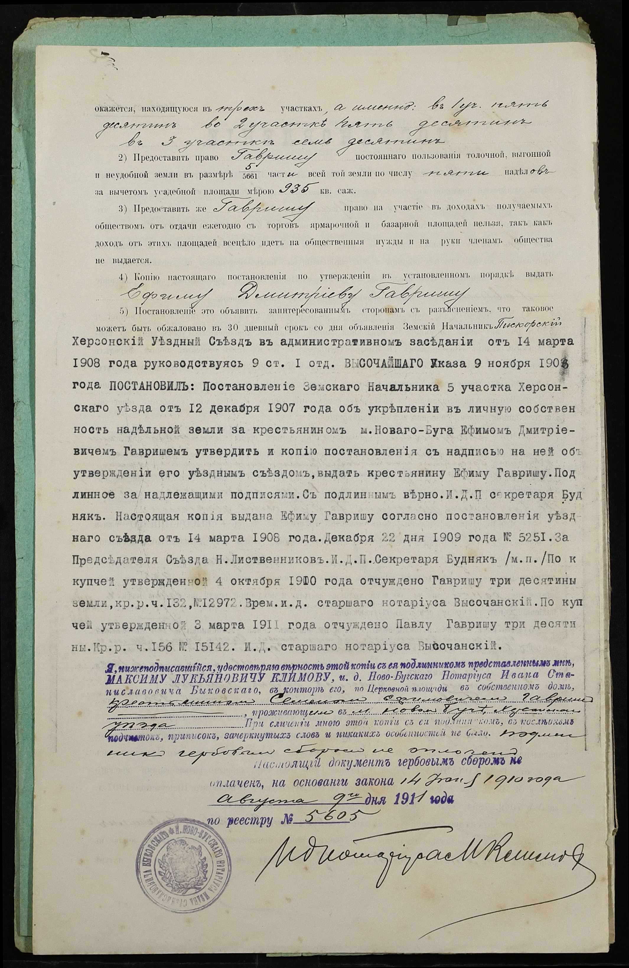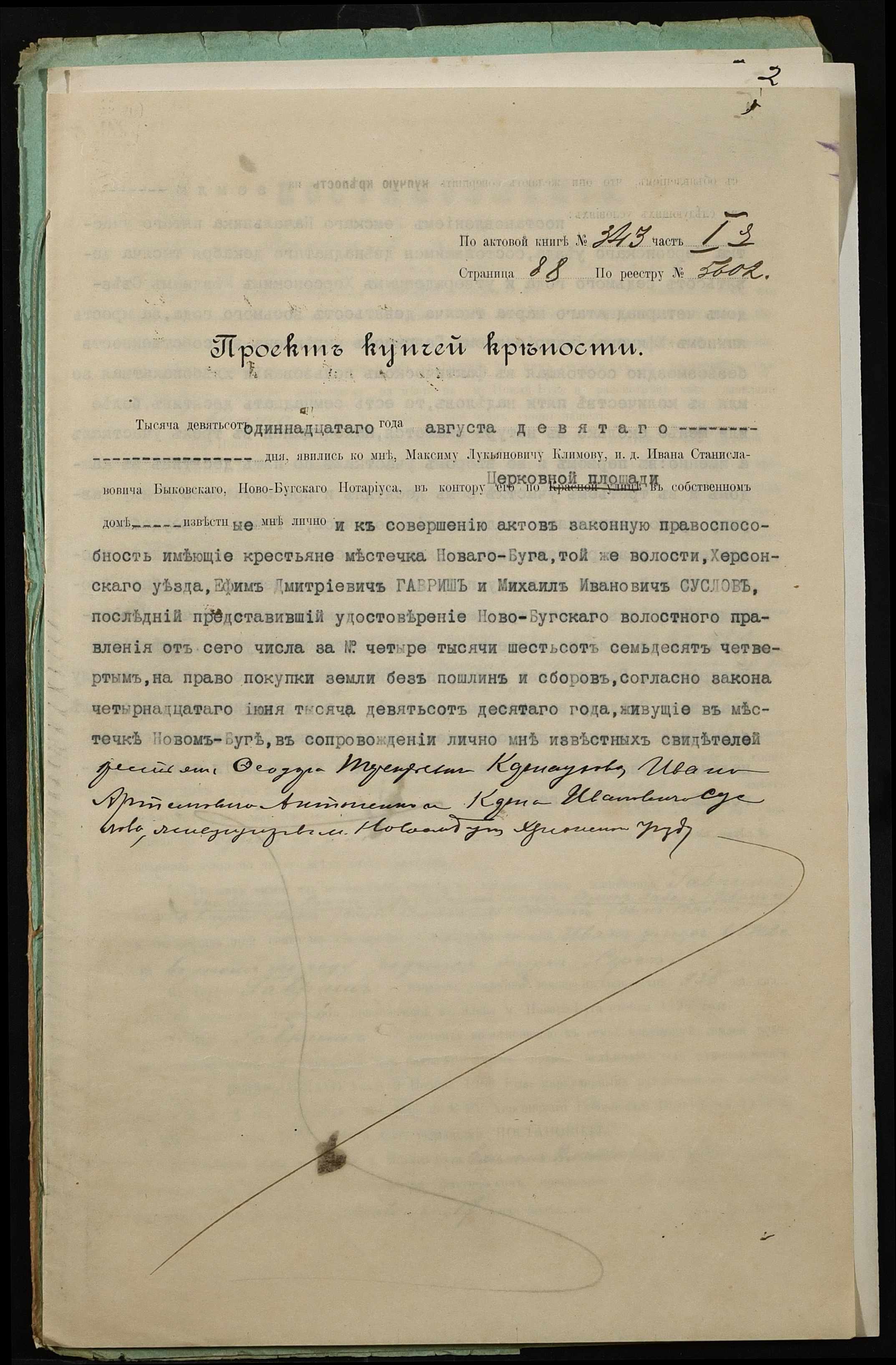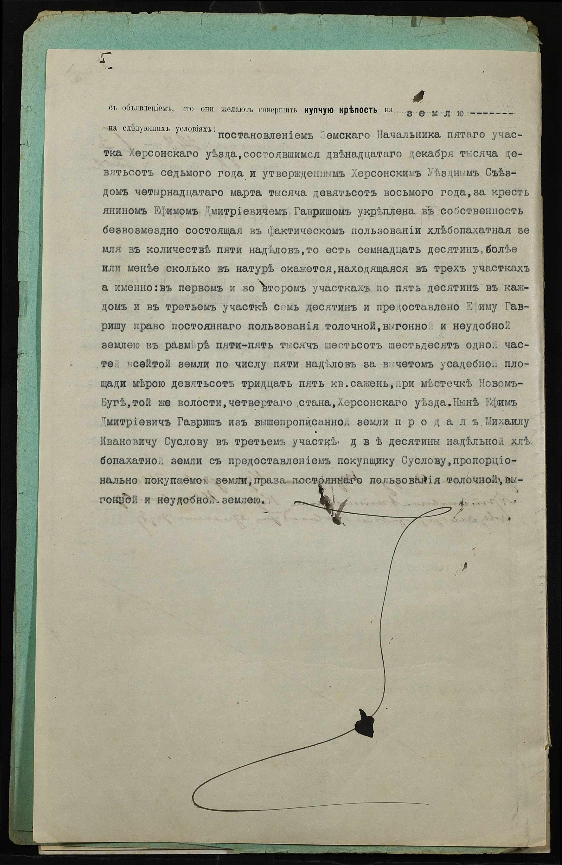 • • • • Справа № 308 “Справа про вчинення купчої про продаж землі селянином Гавришем Юхимом Дмитровичем (Ефимом Дмитриевичем) на користь селянина Суслова Михайла Івановича (Михаила Ивановича)”