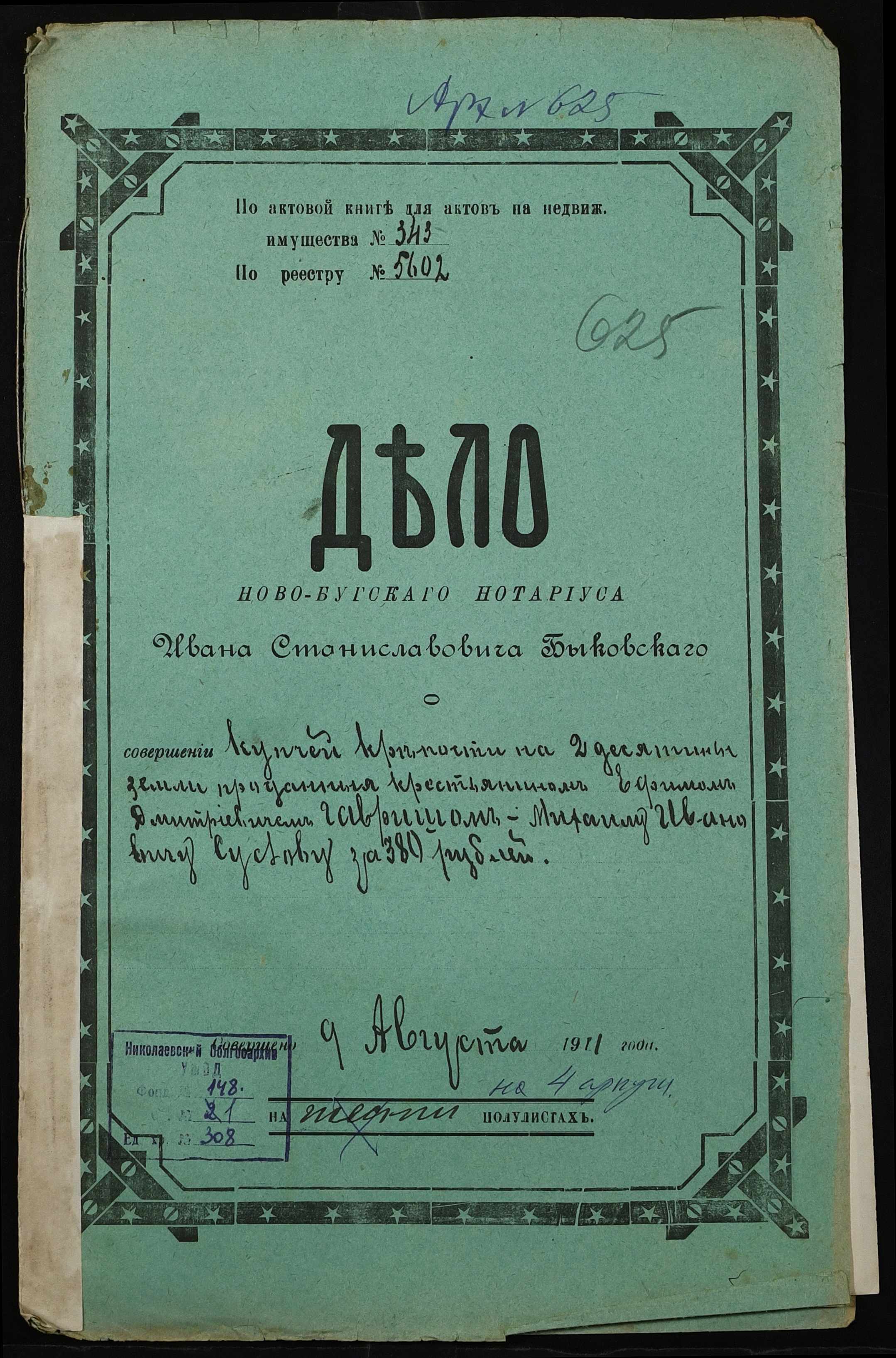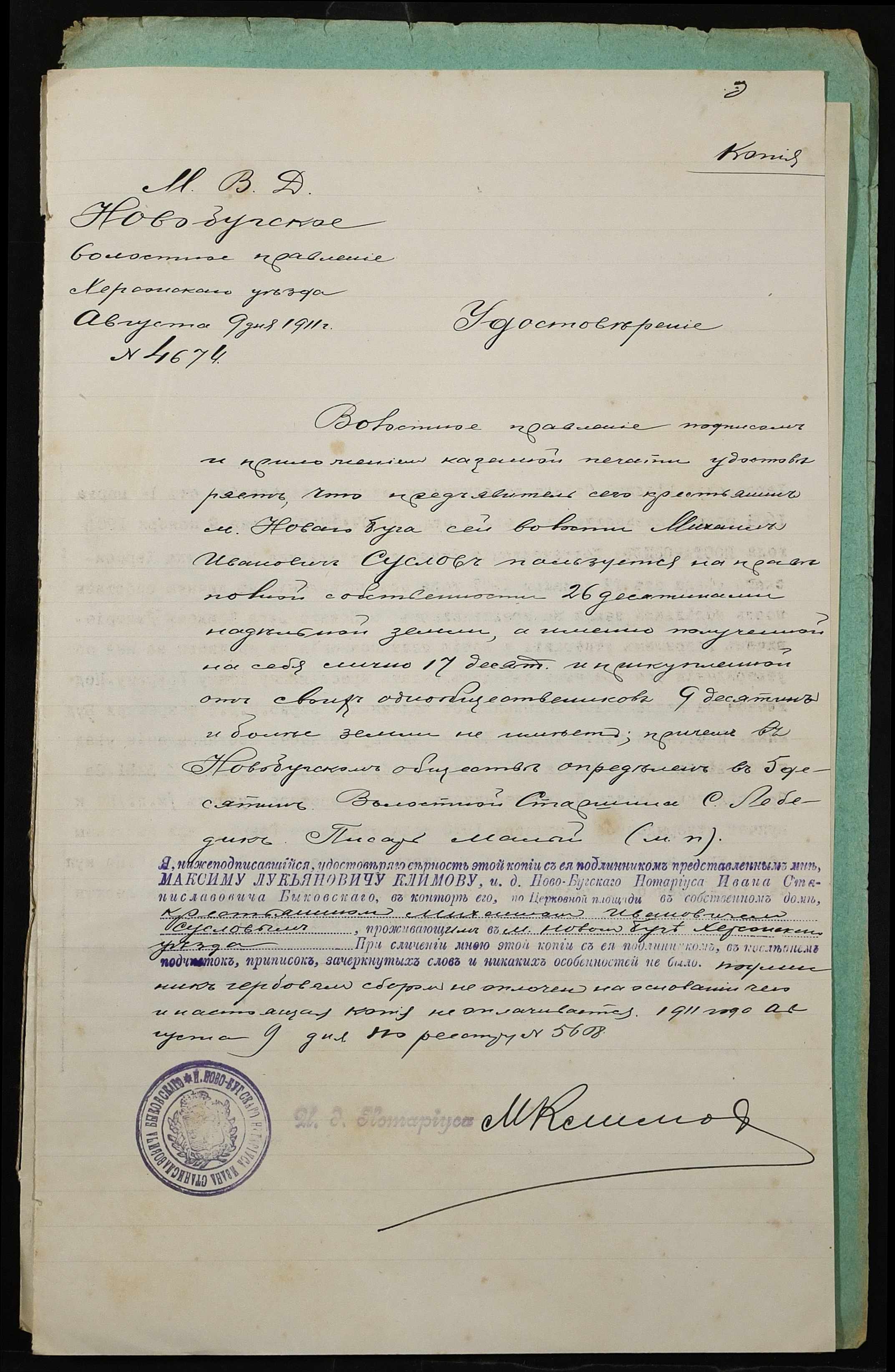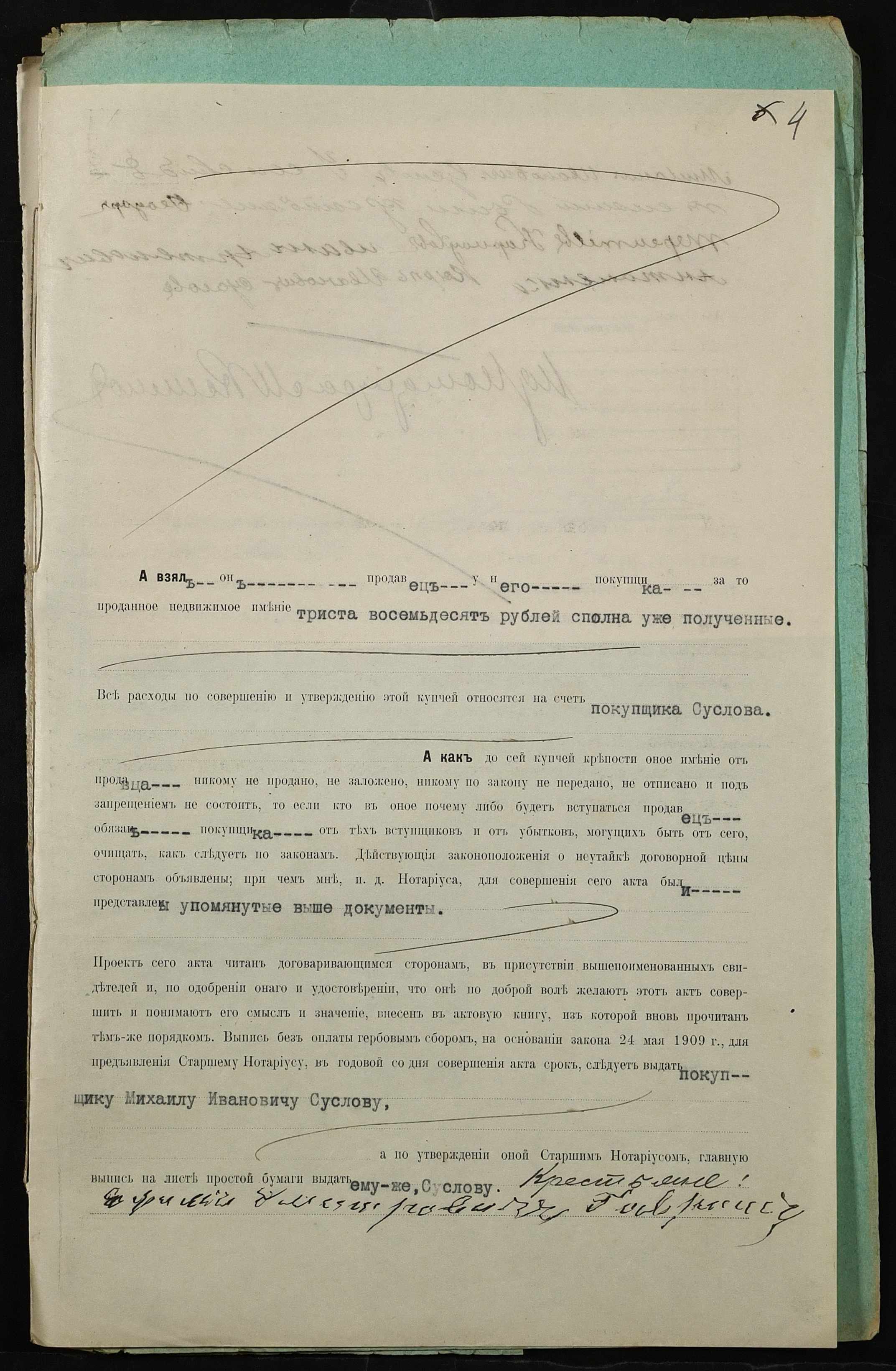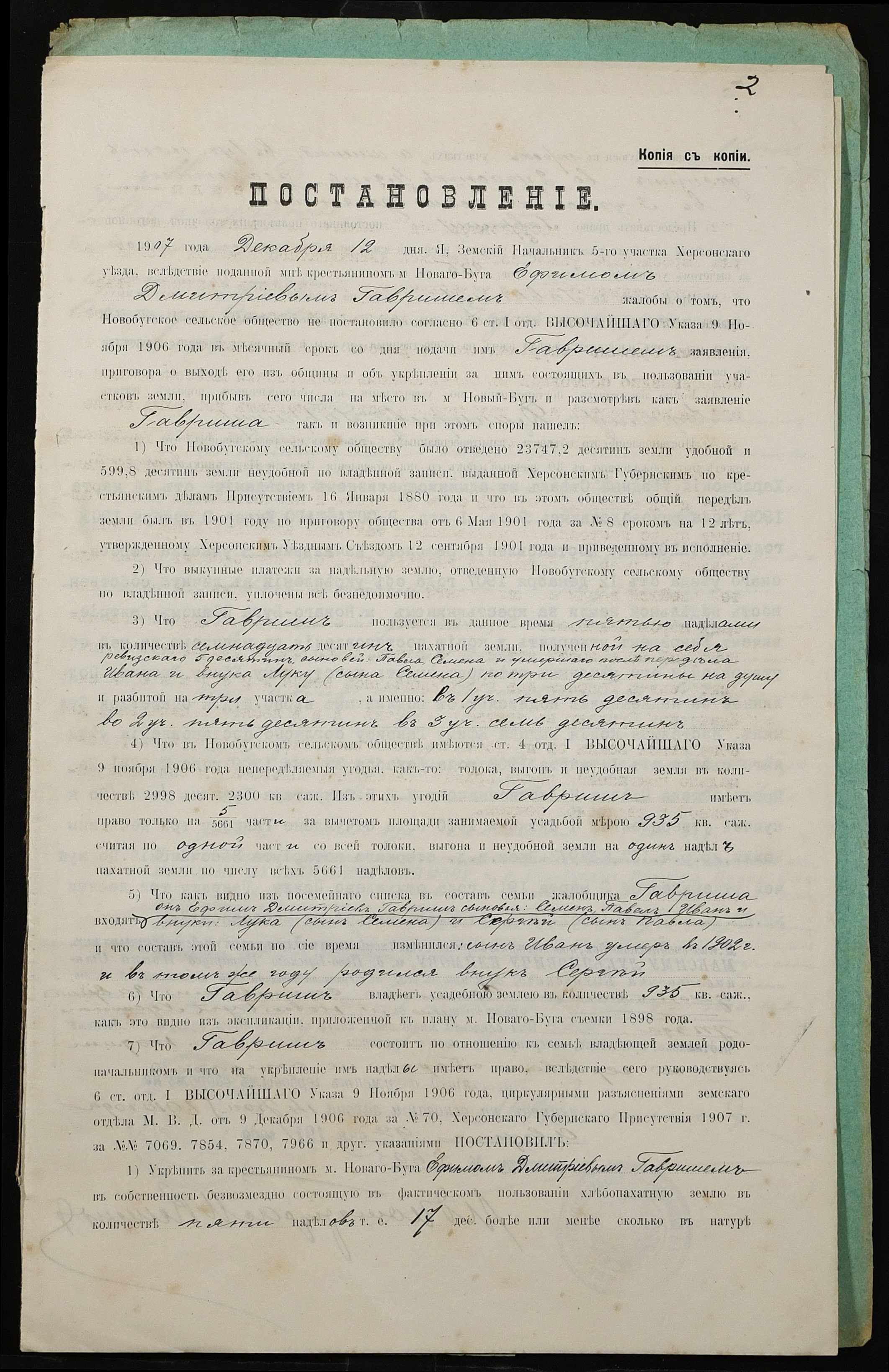 • • • • Справа № 308 “Справа про вчинення купчої про продаж землі селянином Гавришем Юхимом Дмитровичем (Ефимом Дмитриевичем) на користь селянина Суслова Михайла Івановича (Михаила Ивановича)”