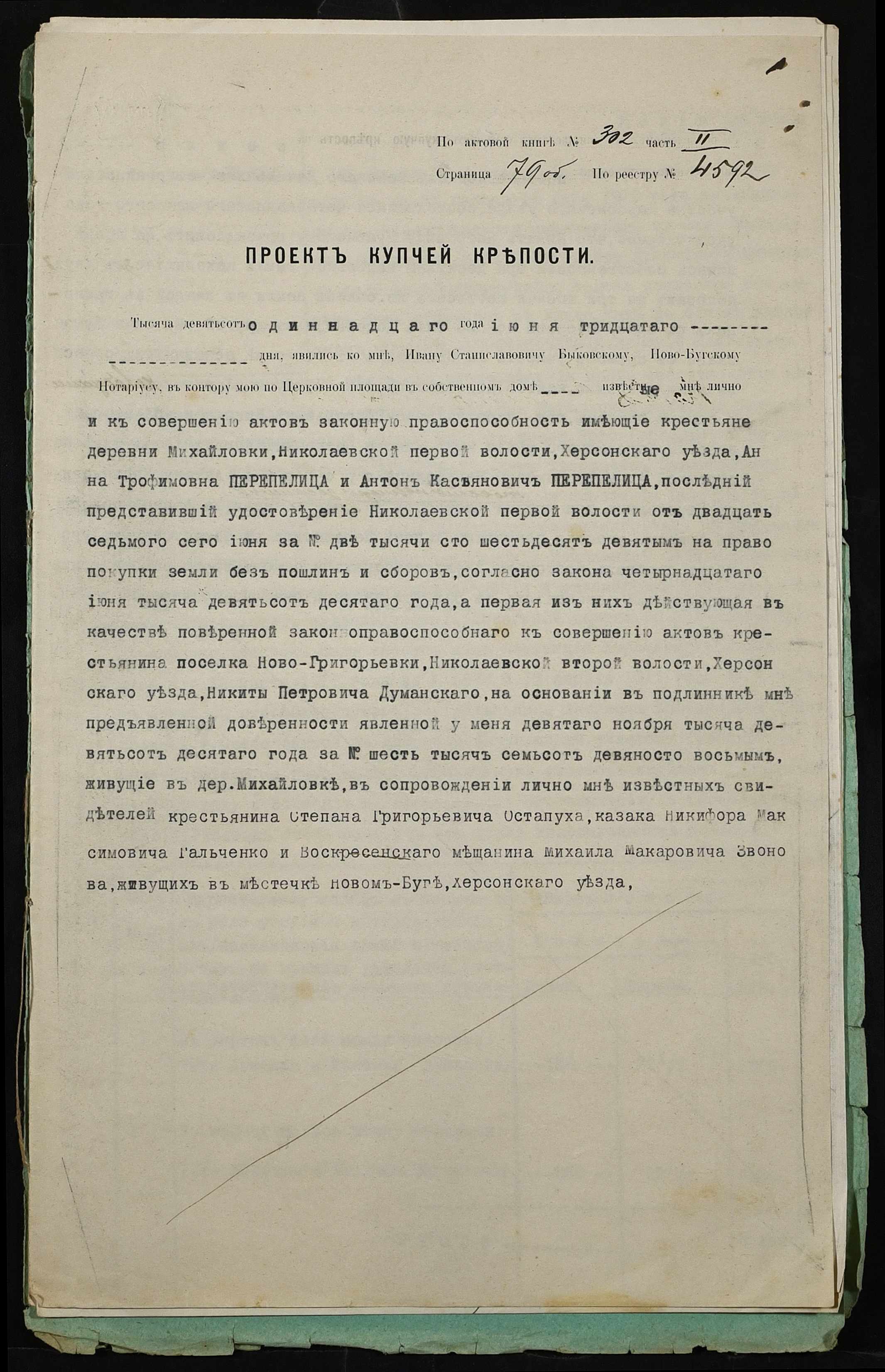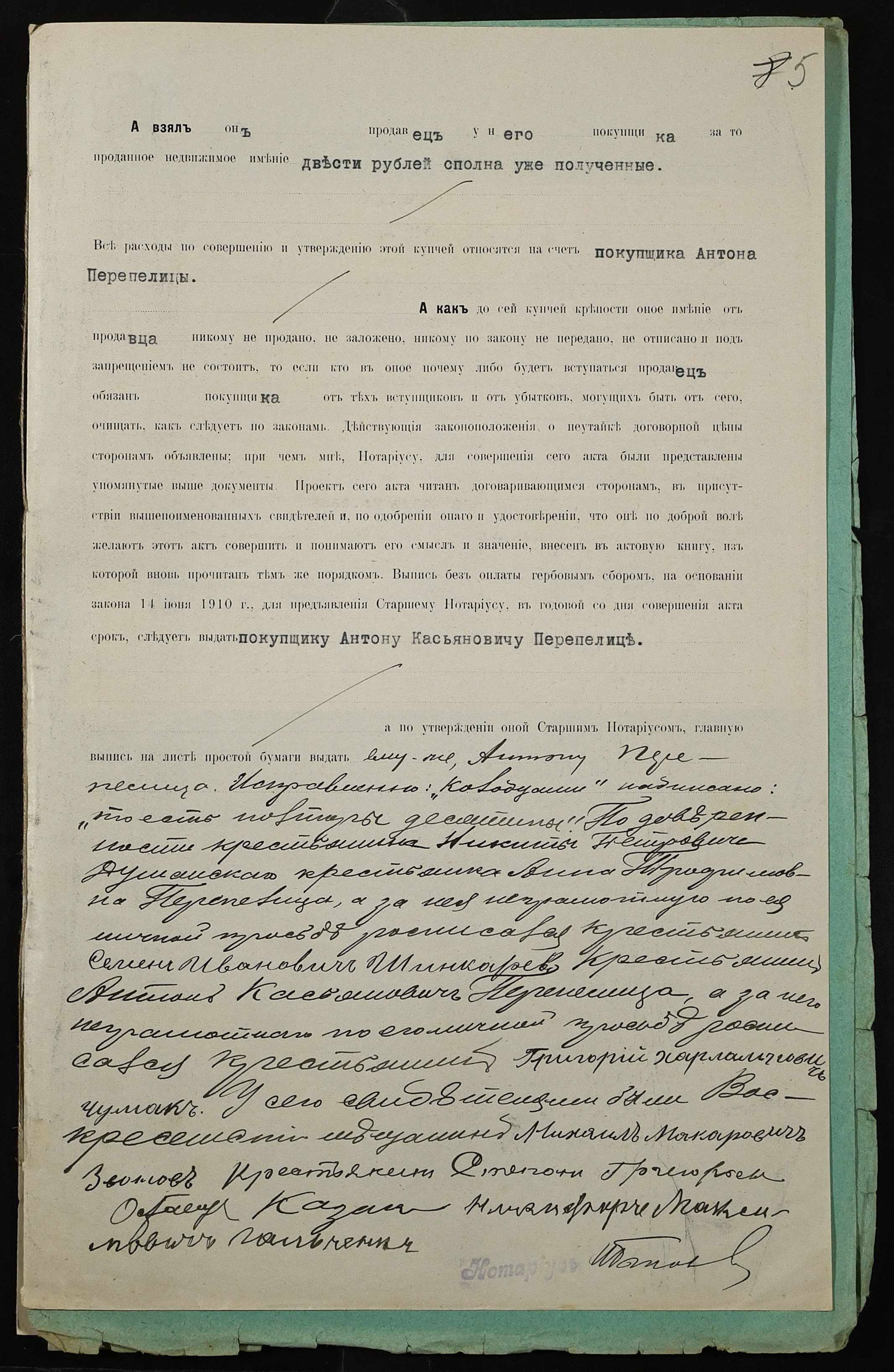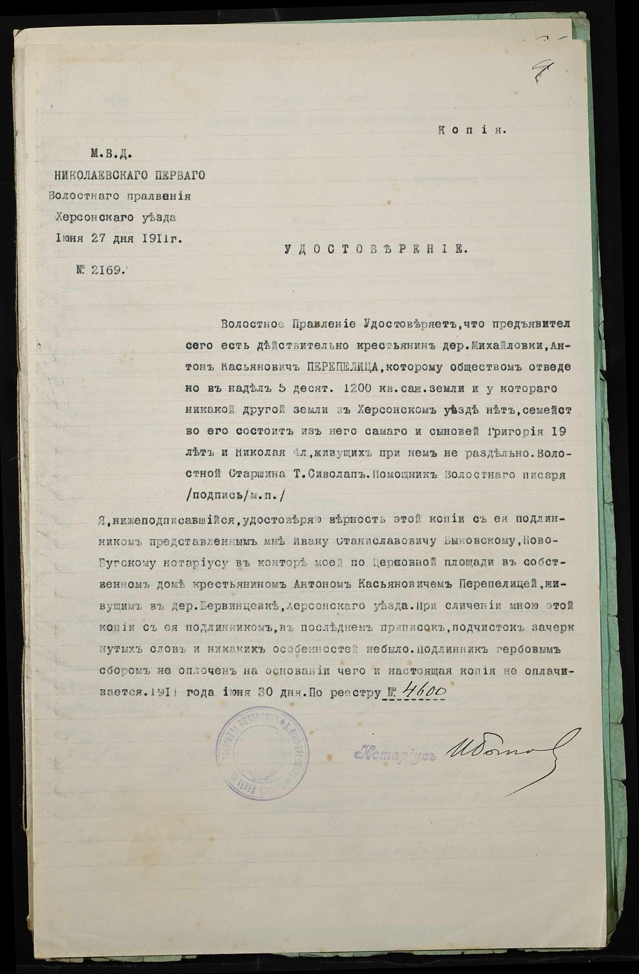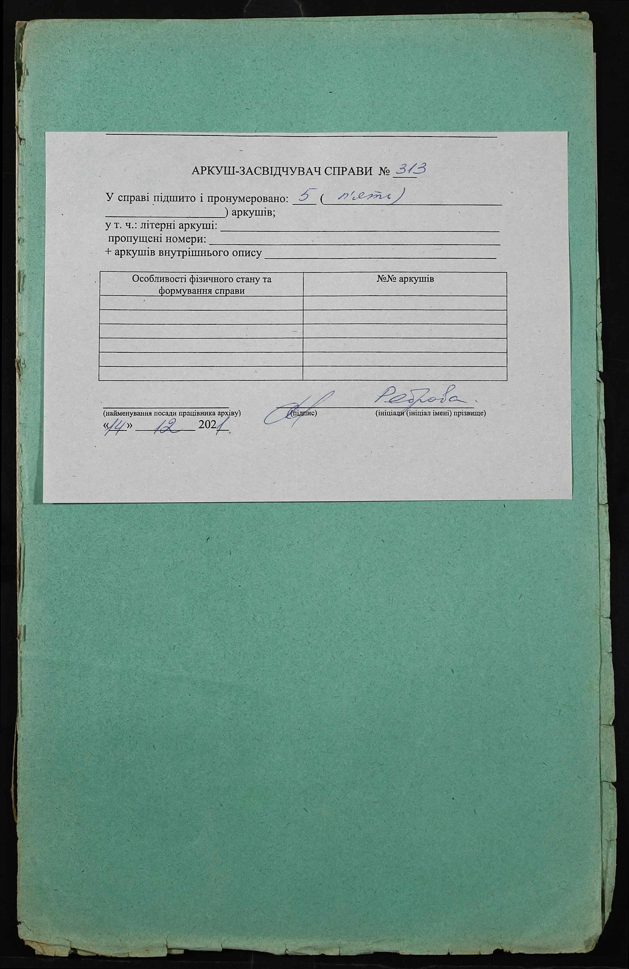 • • • • Справа № 313 “Справа про вчинення купчої про продаж землі селянином Думанським Микитою (Думанским Никитой) Петровичем на користь селянина Перепелиці (Перепелицы) Антона Касьяновича”
