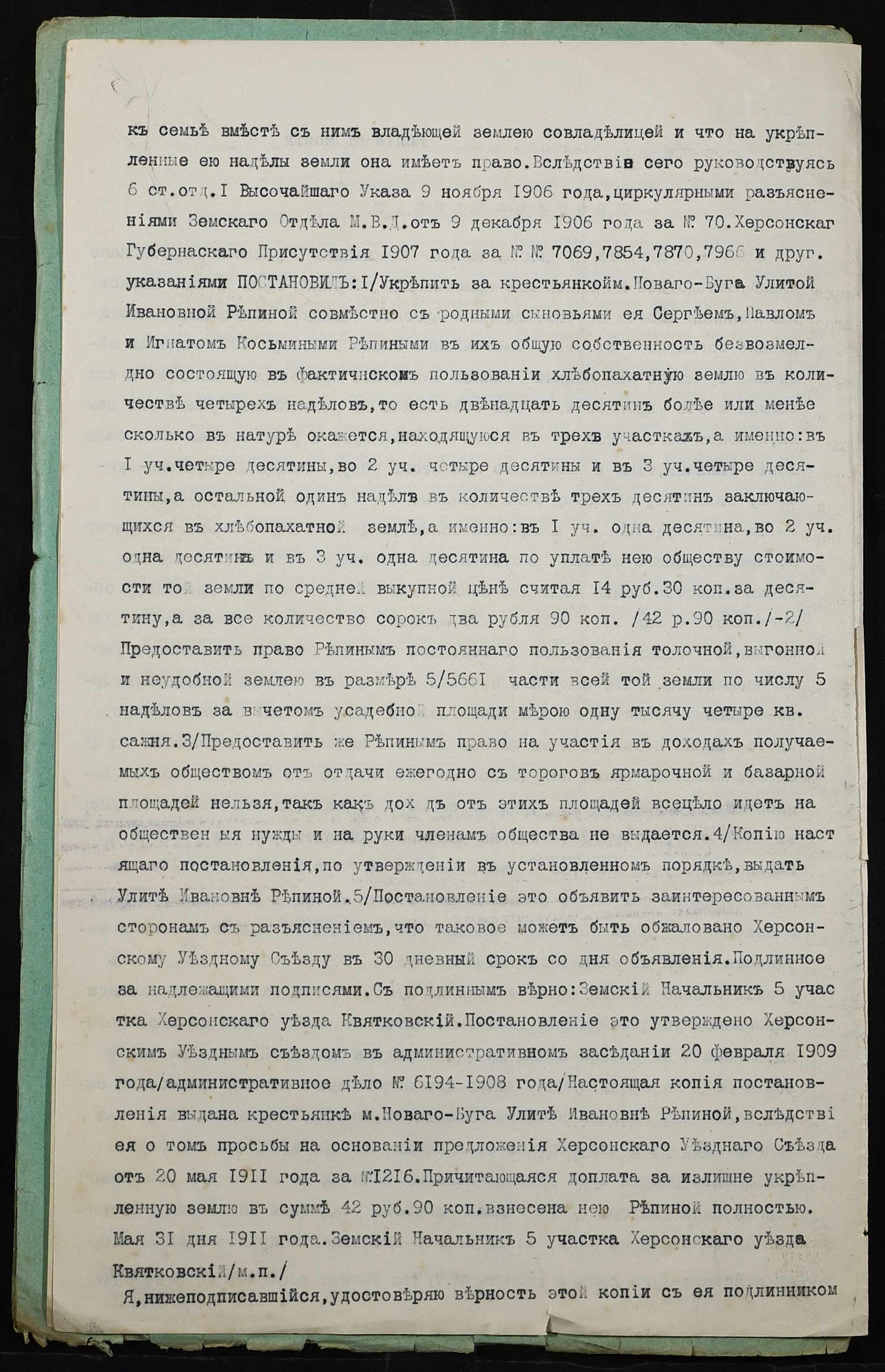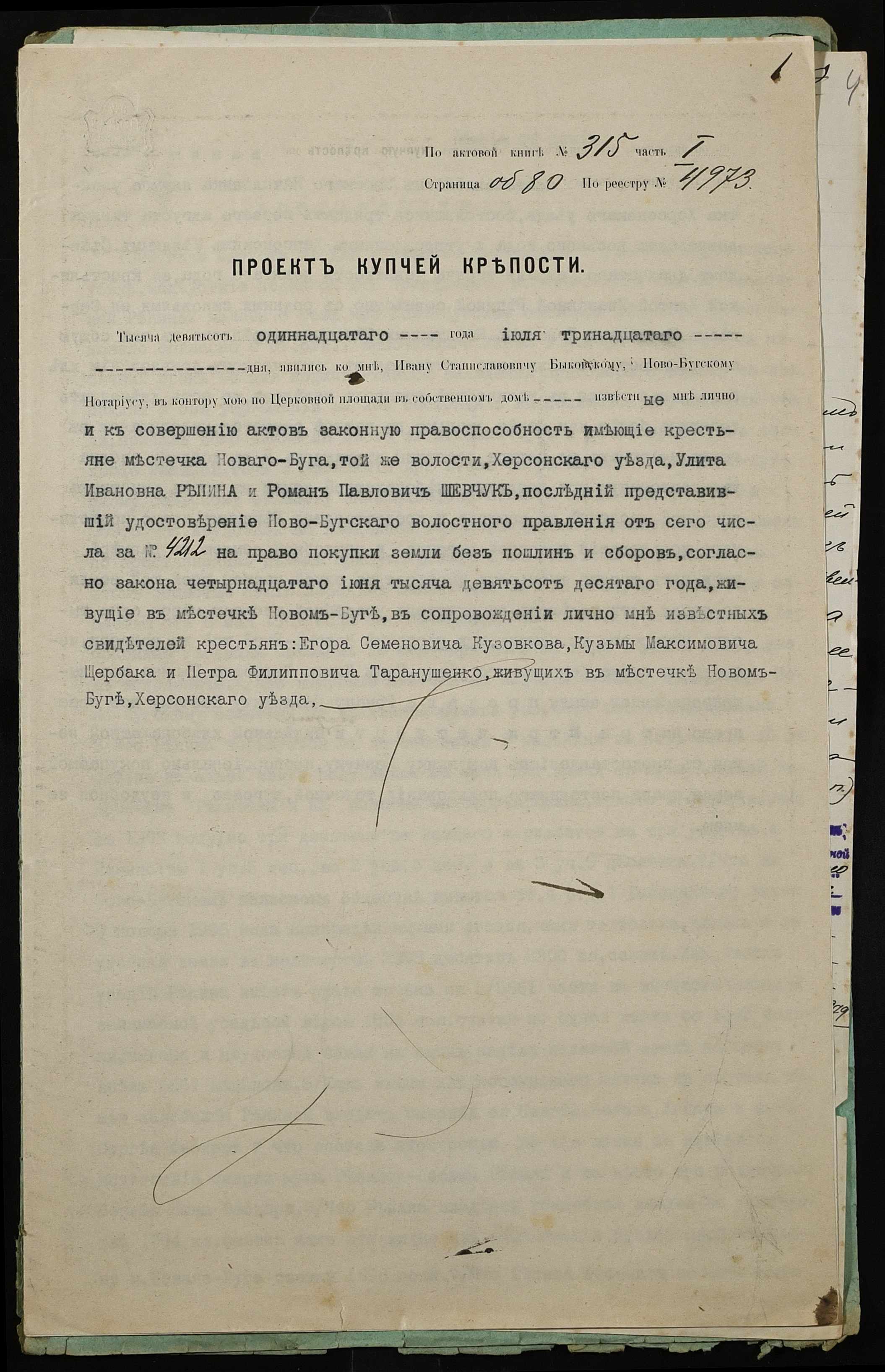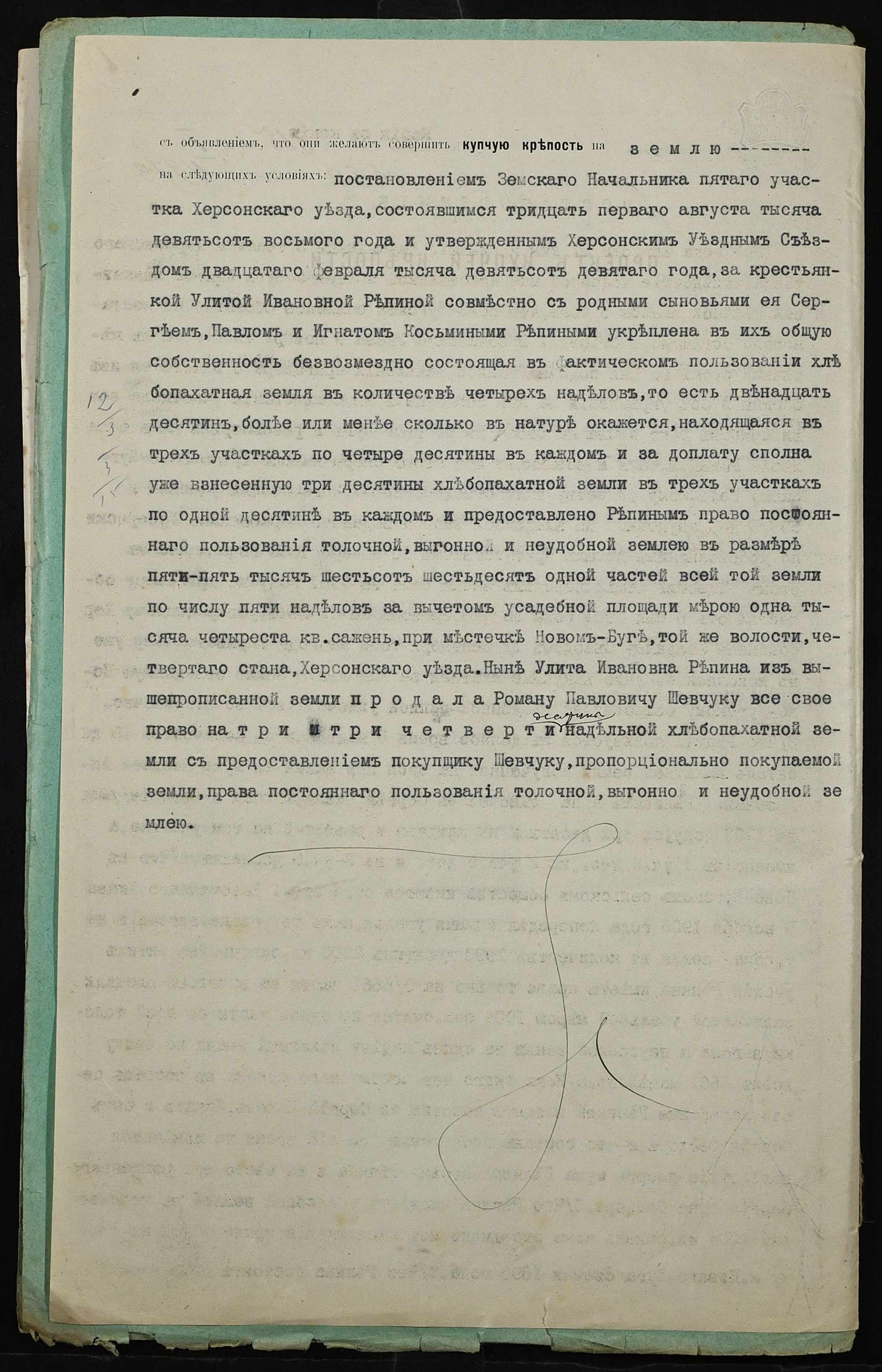 • • • • Справа № 320 “Справа про вчинення купчої про продаж землі селянкою Рекіною (Рекиной) Улитою Іванівною (Ивановной) на користь селянина Шевчука Романа Павловича”