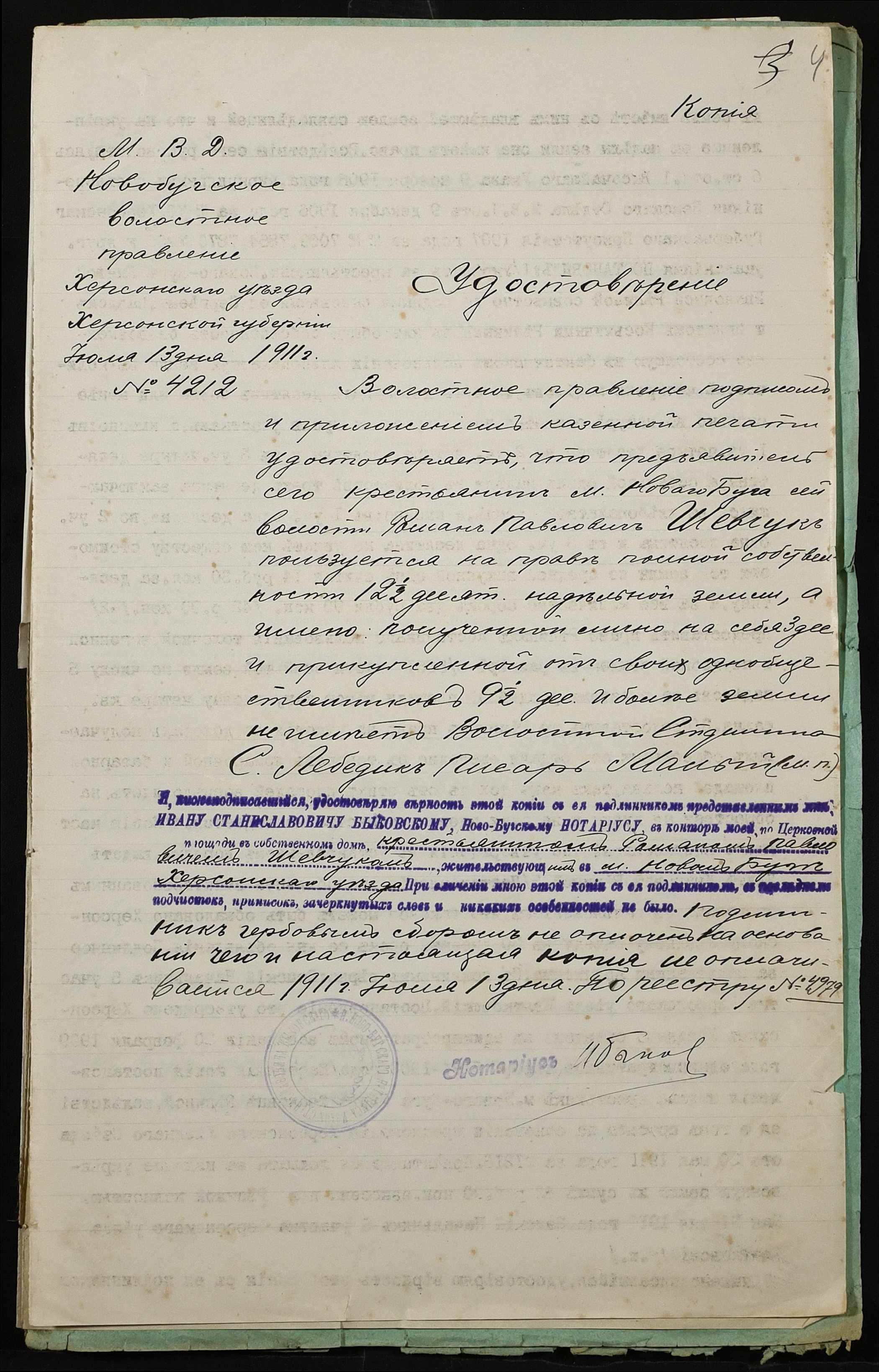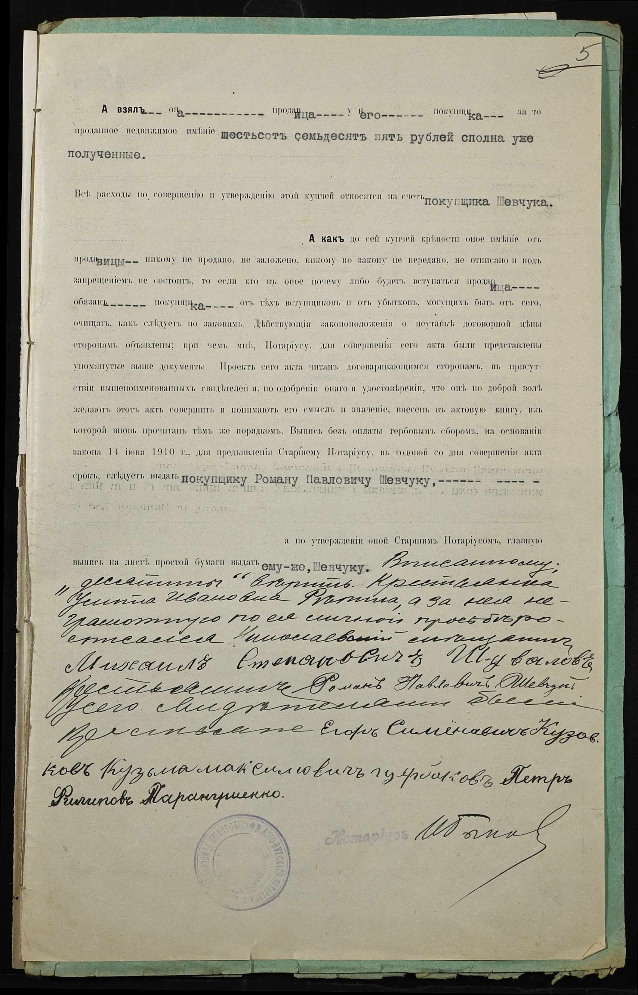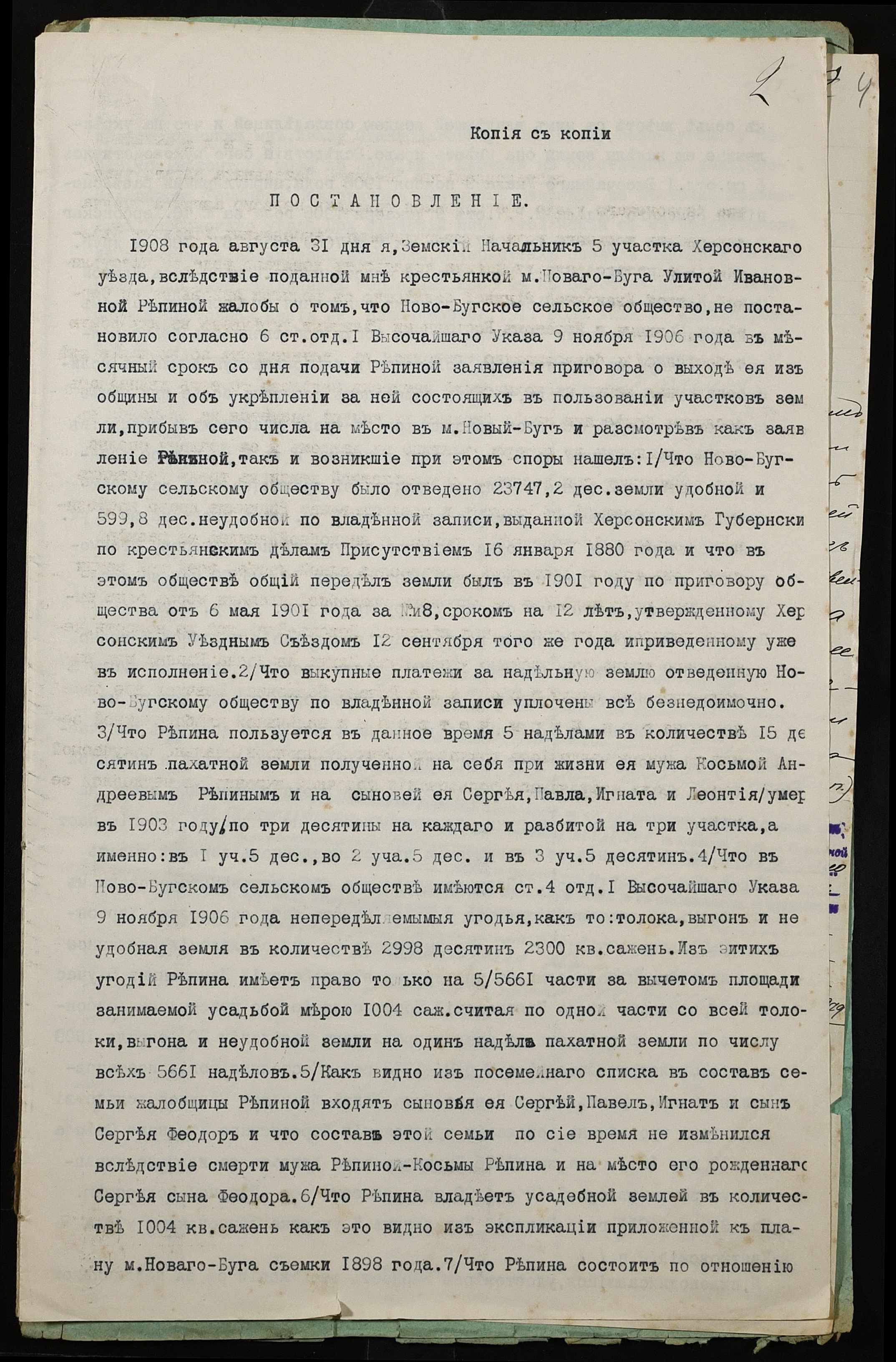 • • • • Справа № 320 “Справа про вчинення купчої про продаж землі селянкою Рекіною (Рекиной) Улитою Іванівною (Ивановной) на користь селянина Шевчука Романа Павловича”