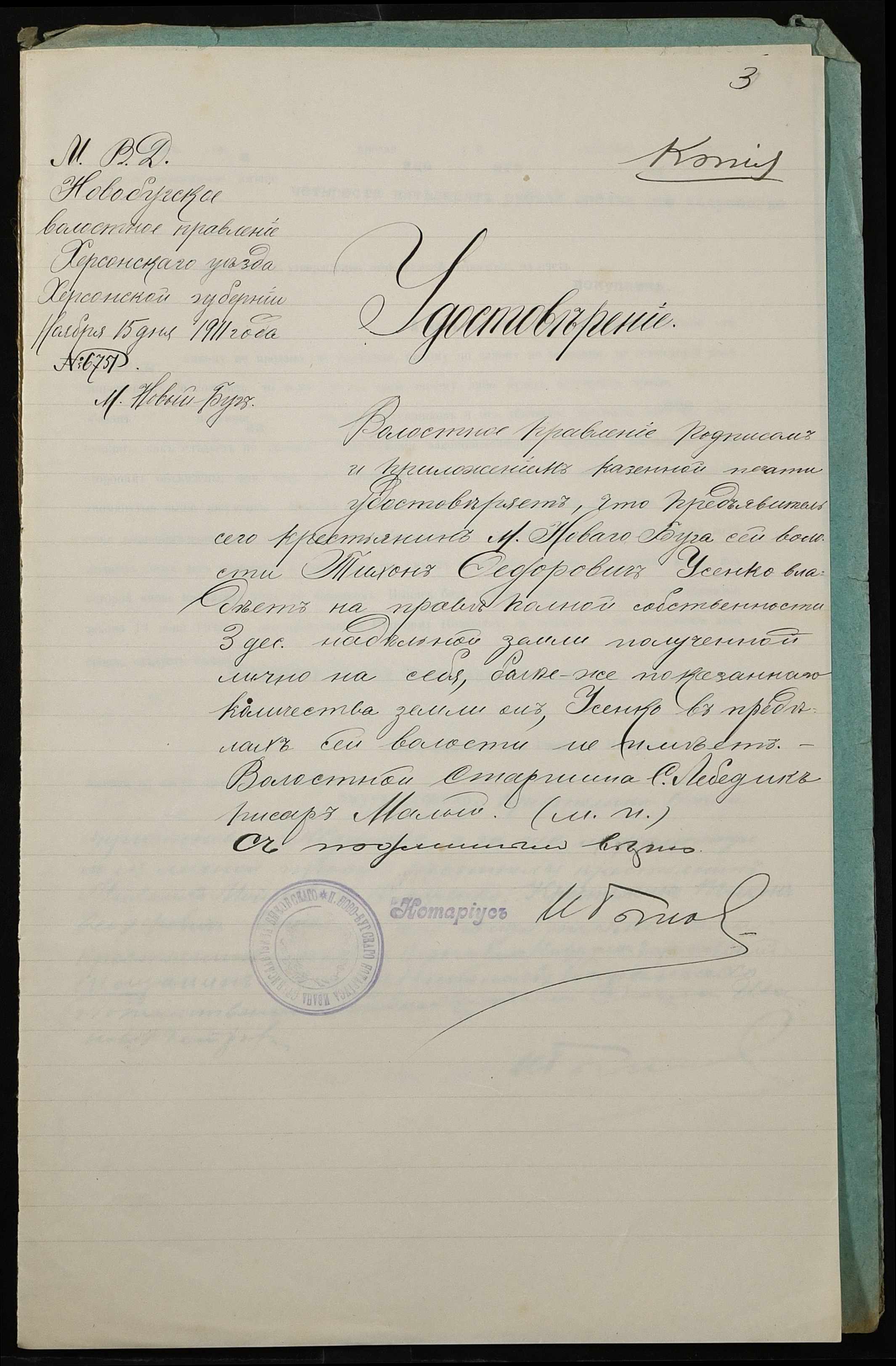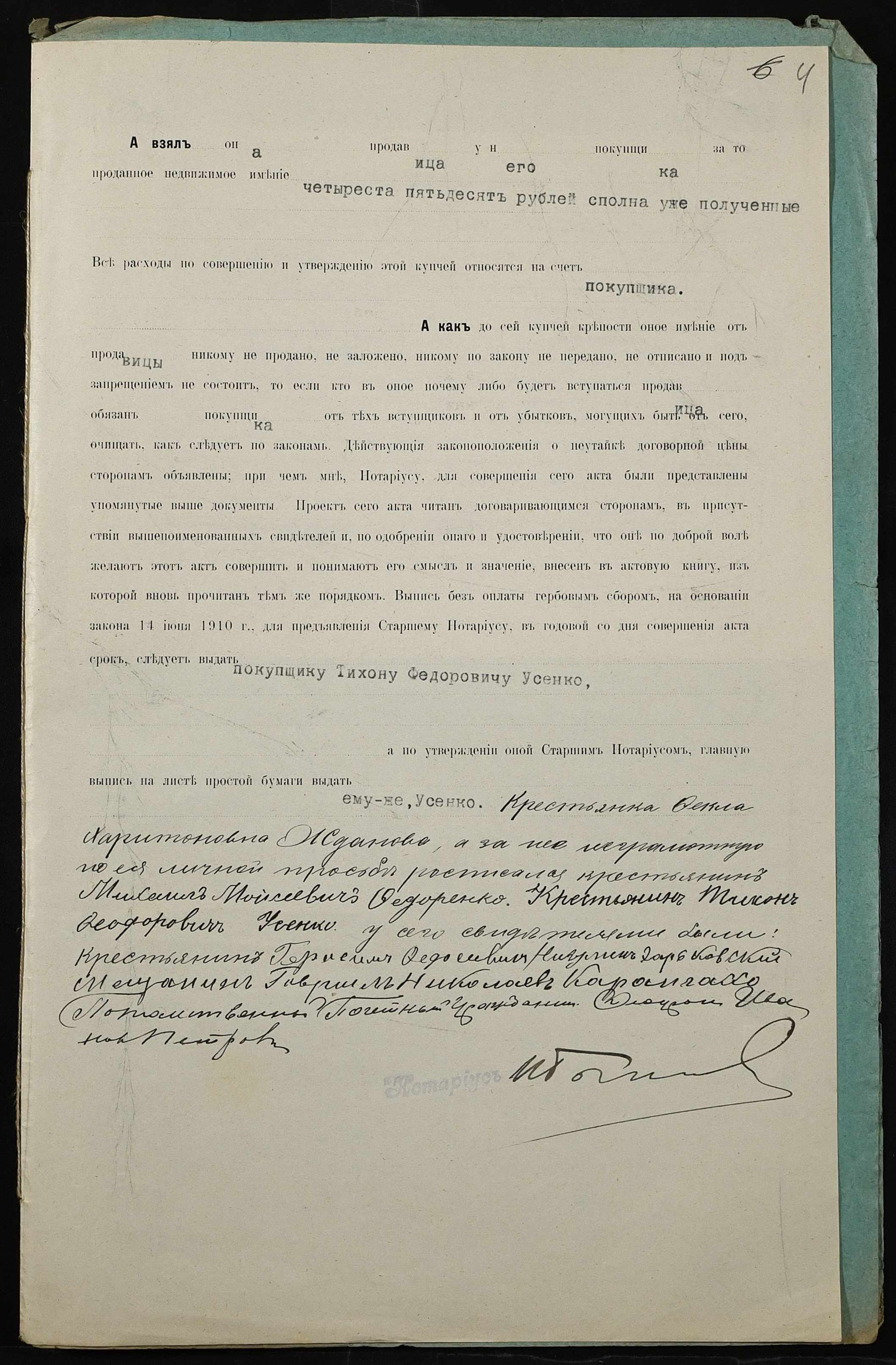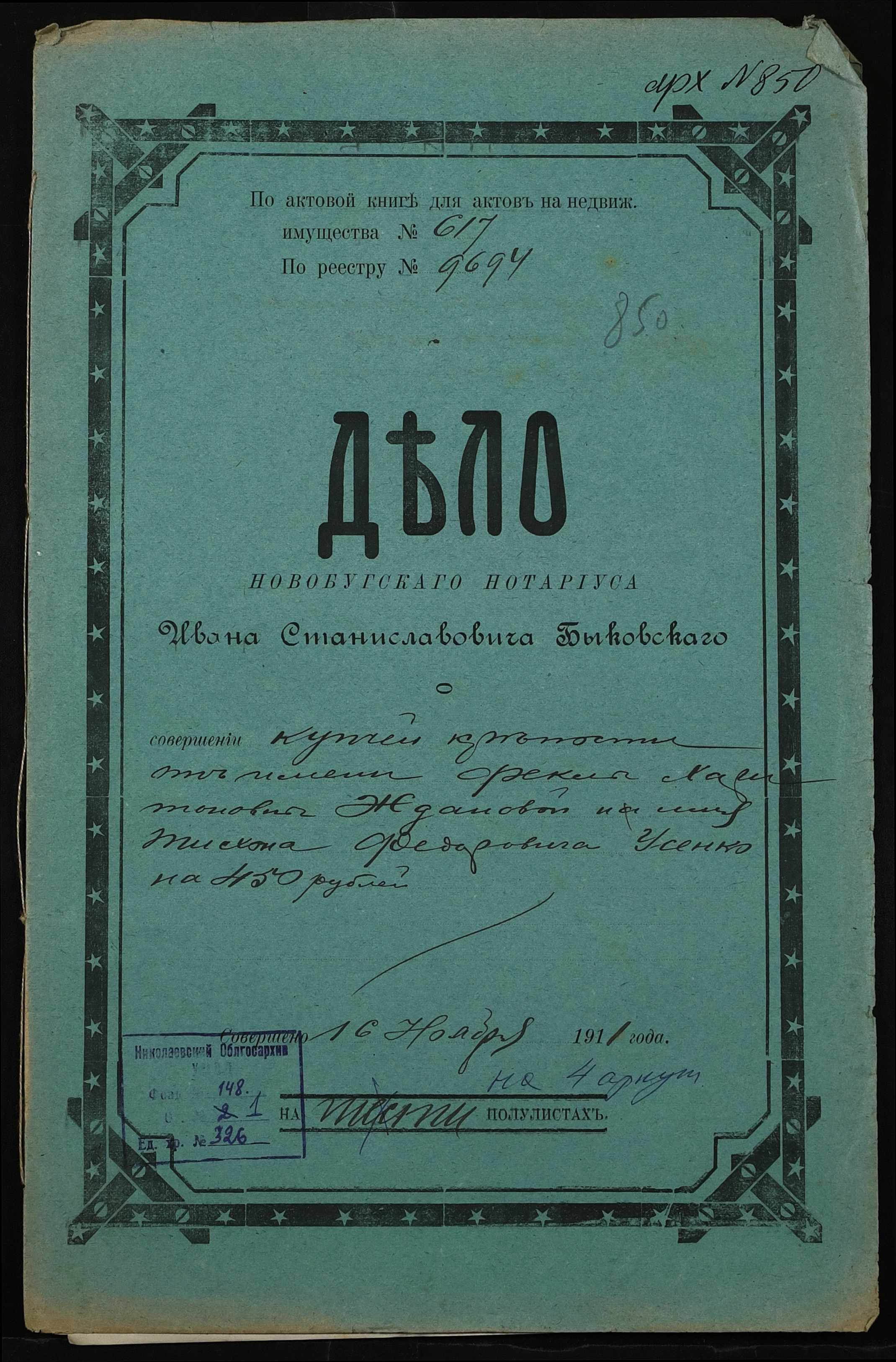 • • • • Справа № 326 “Справа про вчинення купчої про продаж землі селянкою Ждановою Теклею Харитонівною (Ждановой Феклой Харитоновной) на користь селянина Усенка (Усенко) Тихона Федоровича”