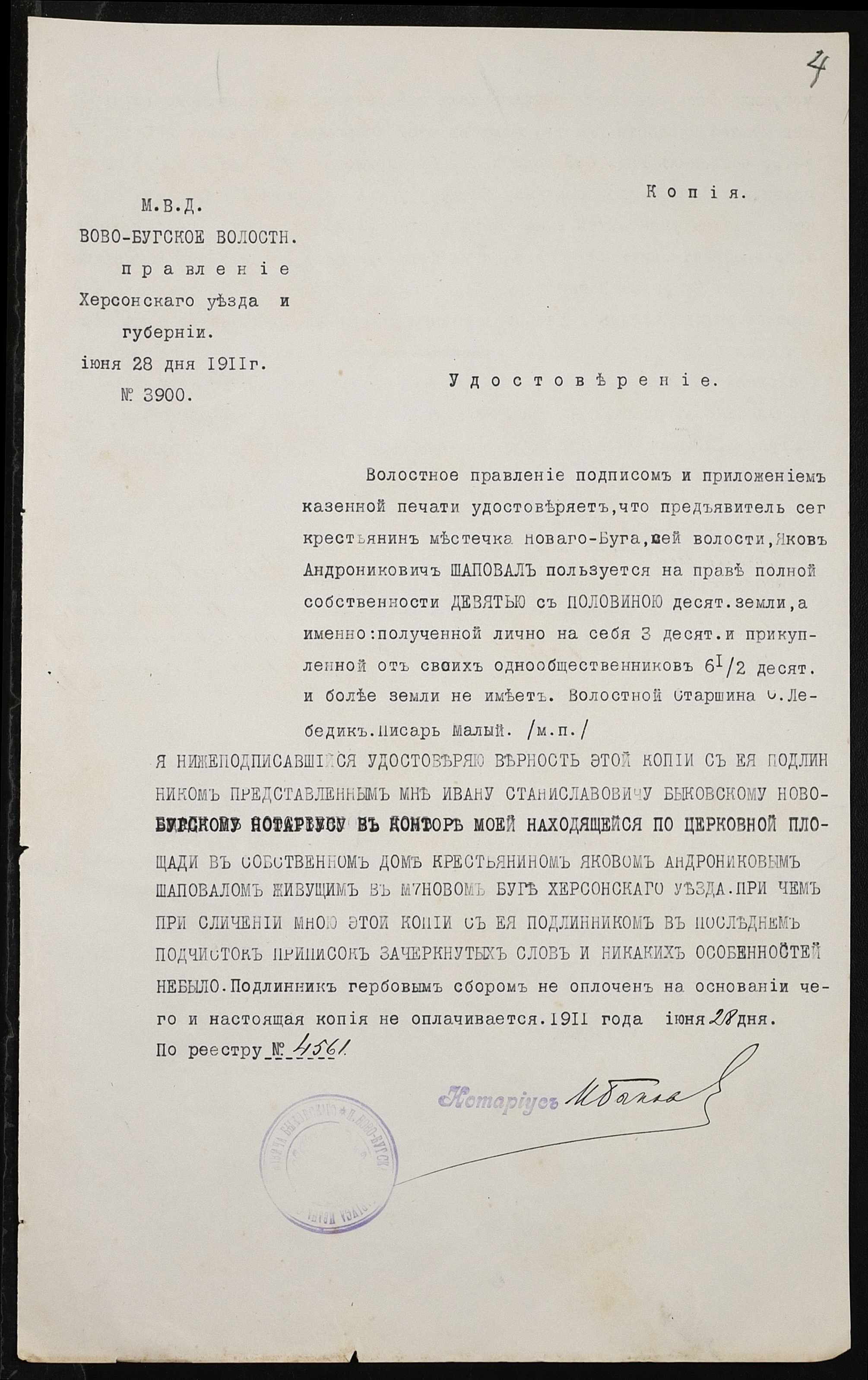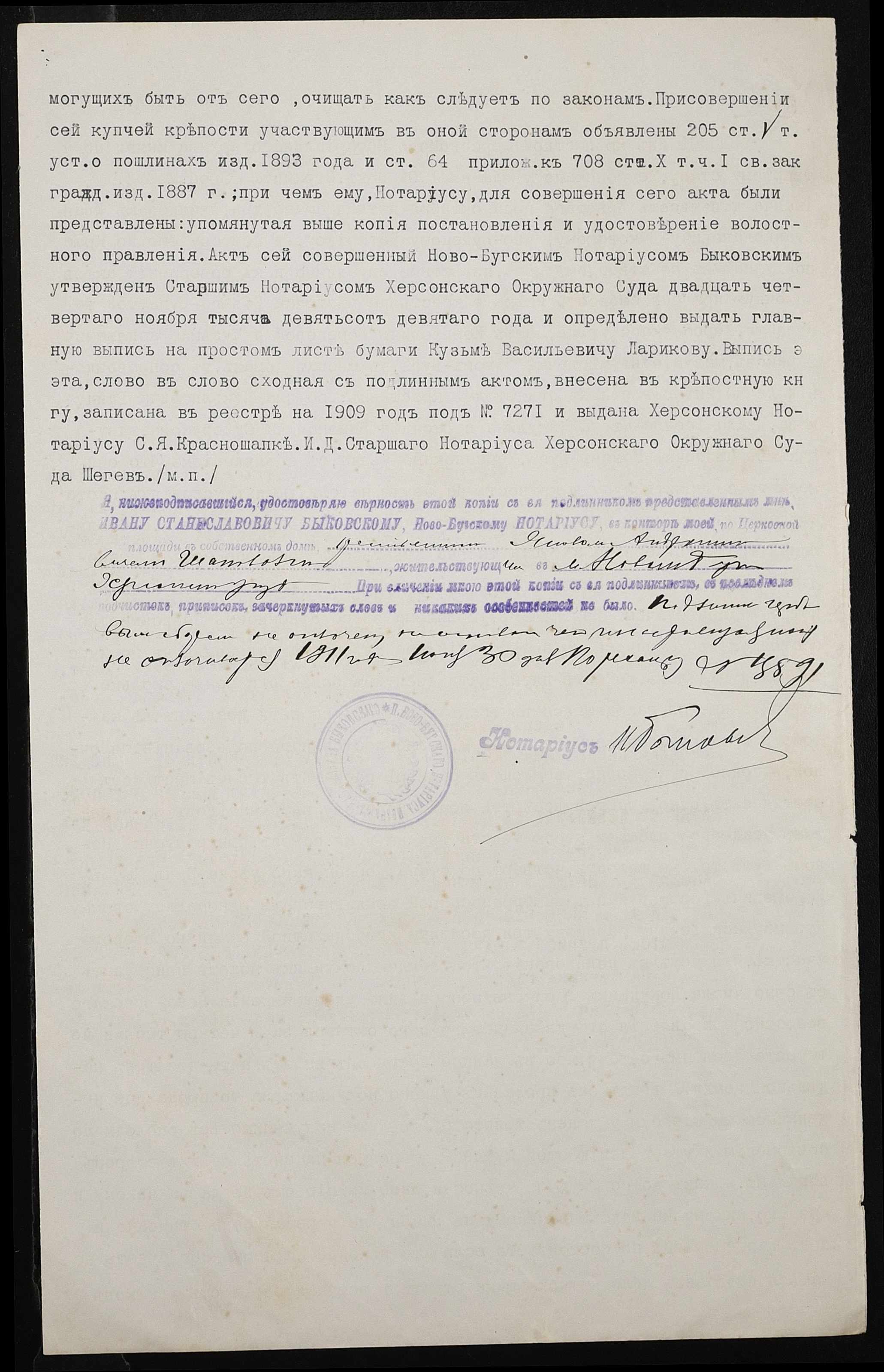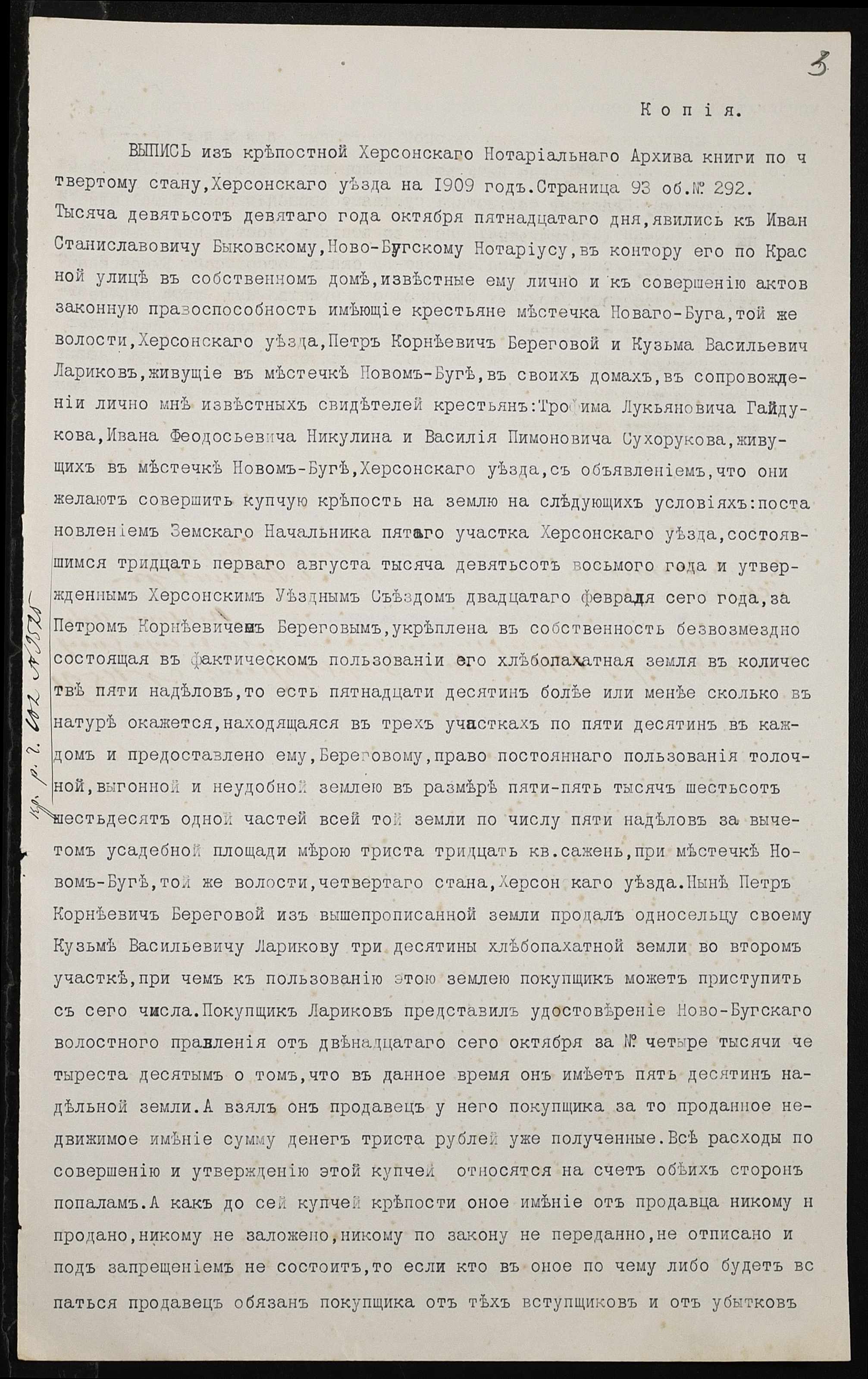 • • • • Справа № 332 “Справа про вчинення купчої про продаж землі селянином Лариковим Кузьмою Васильовичем (Кузьмой Васильевичем) на користь селянина Шаповала Якова Андрониковича”