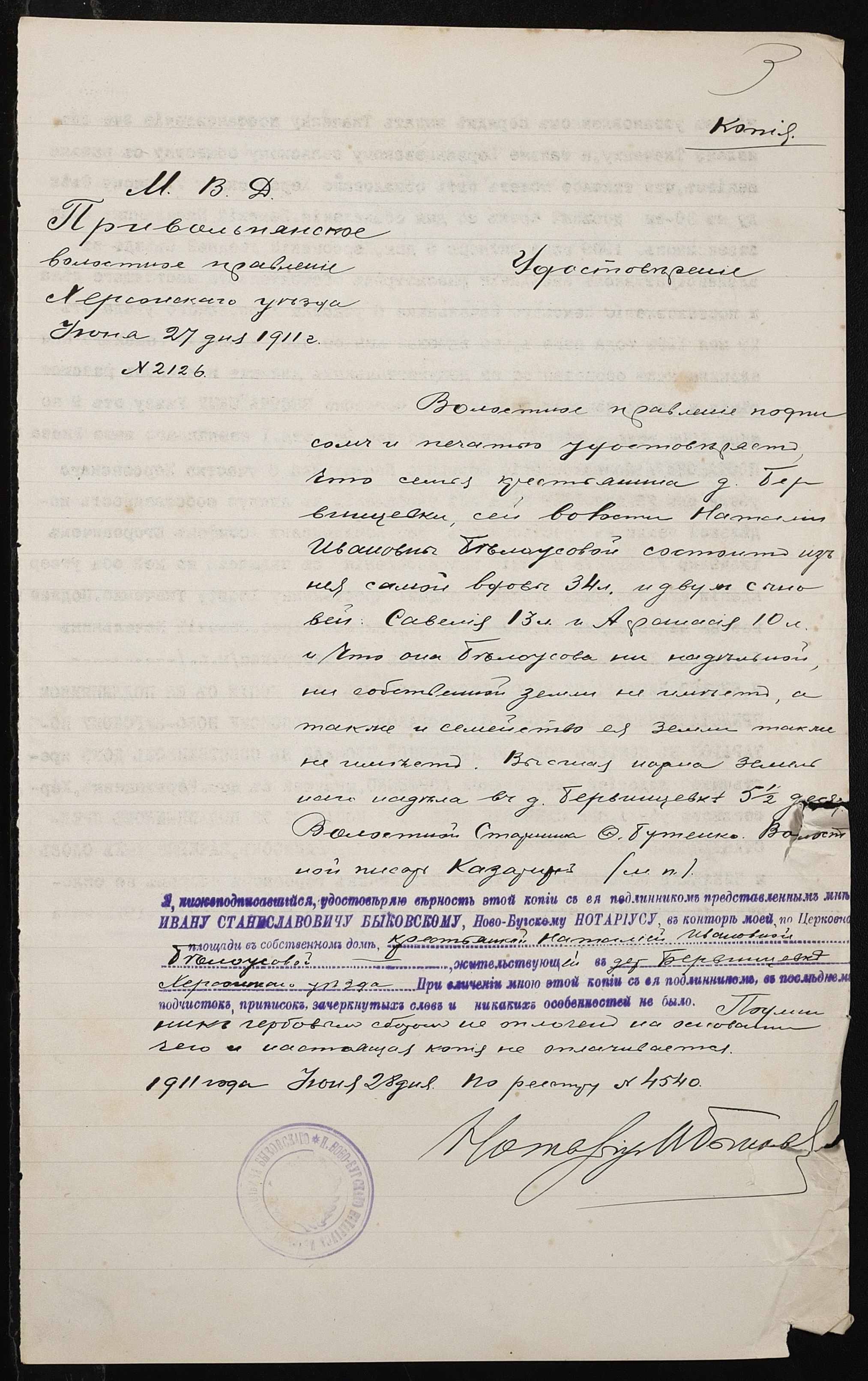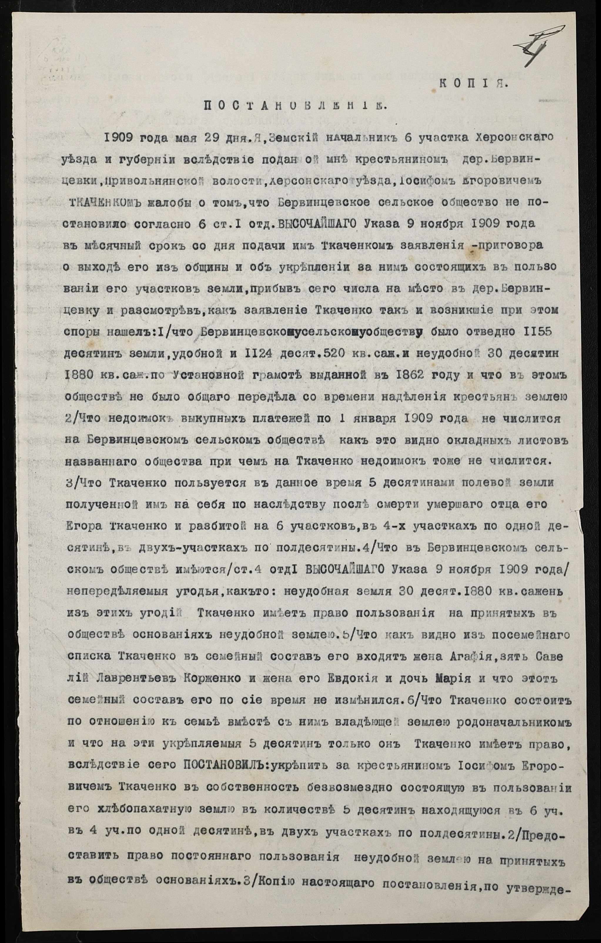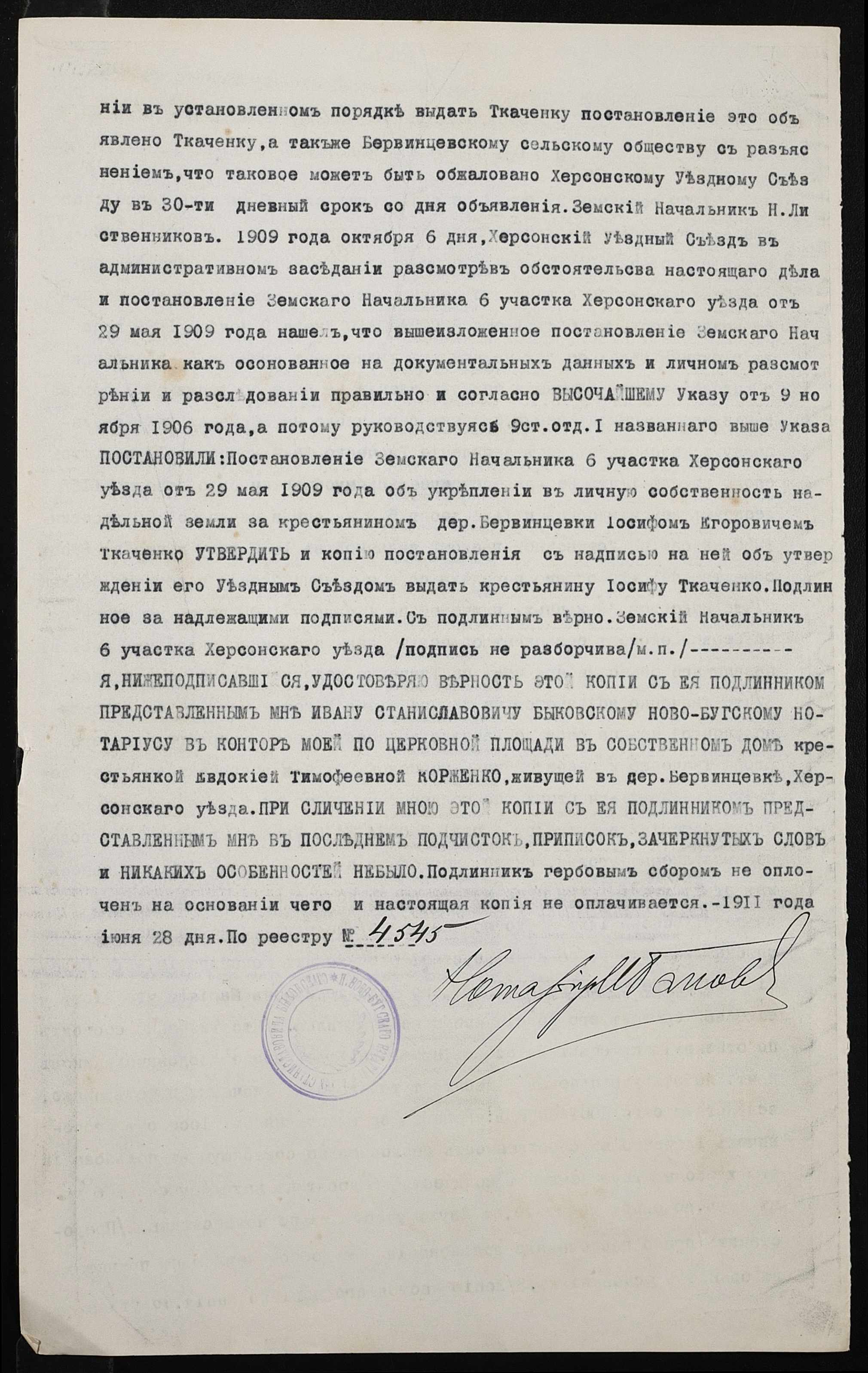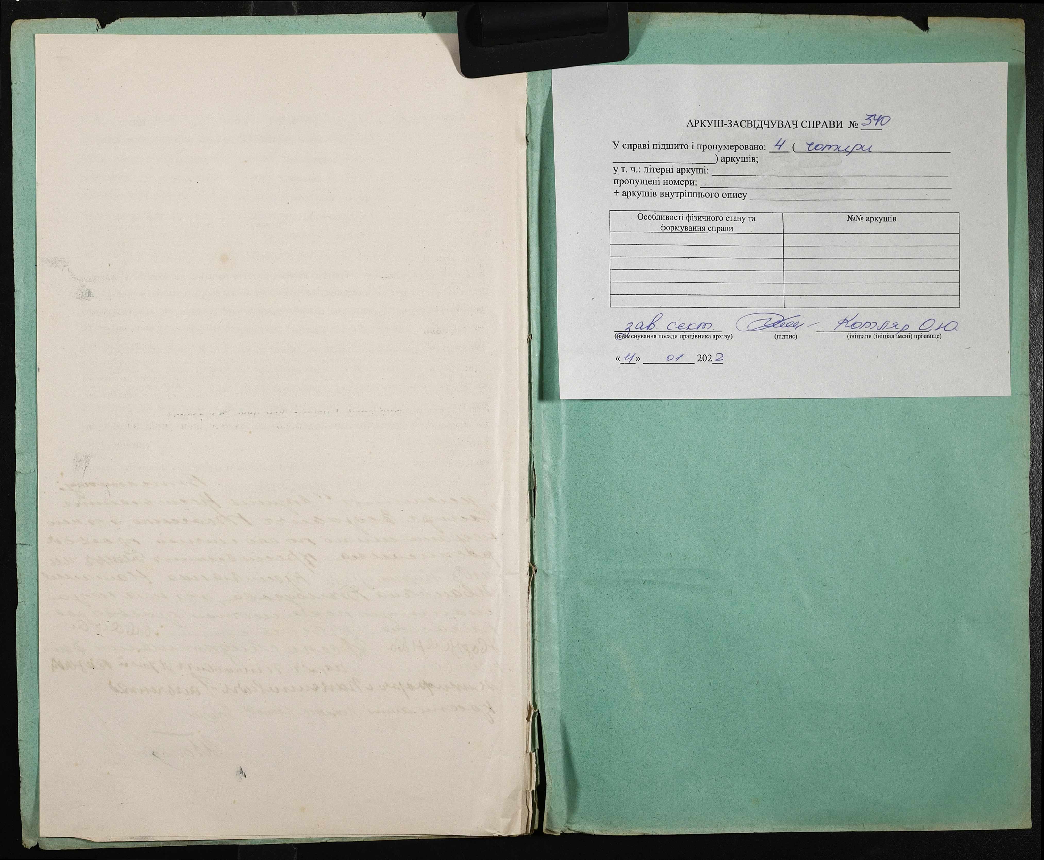 • • • • Справа № 340 “Справа про вчинення купчої про продаж землі селянином Ткаченком Йосипом Єгоровичем (Ткаченко Иосифом Егоровичем) на користь селянки Бєлоусової Наталії Іванівни (Белоусовой Наталии Ивановны)”
