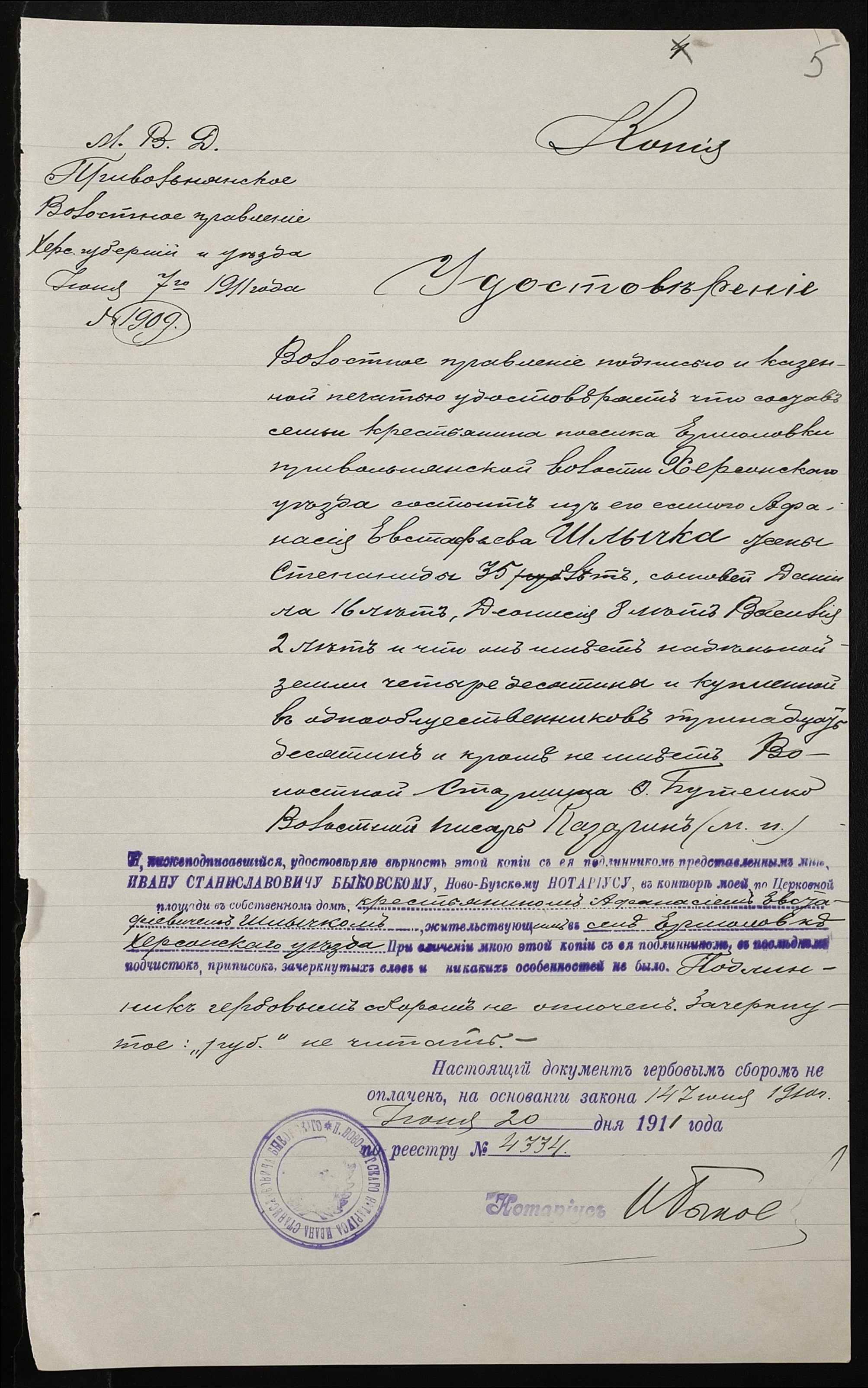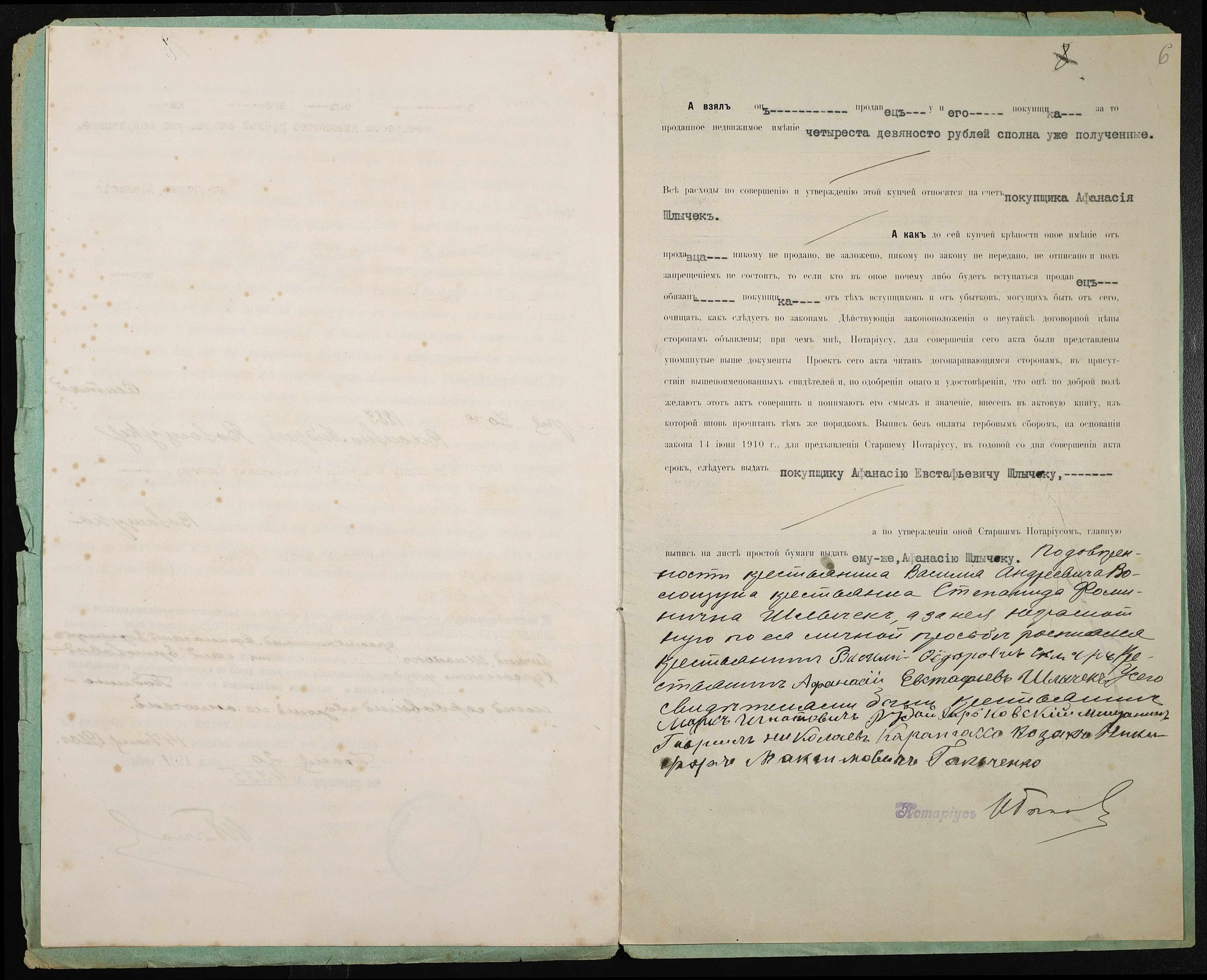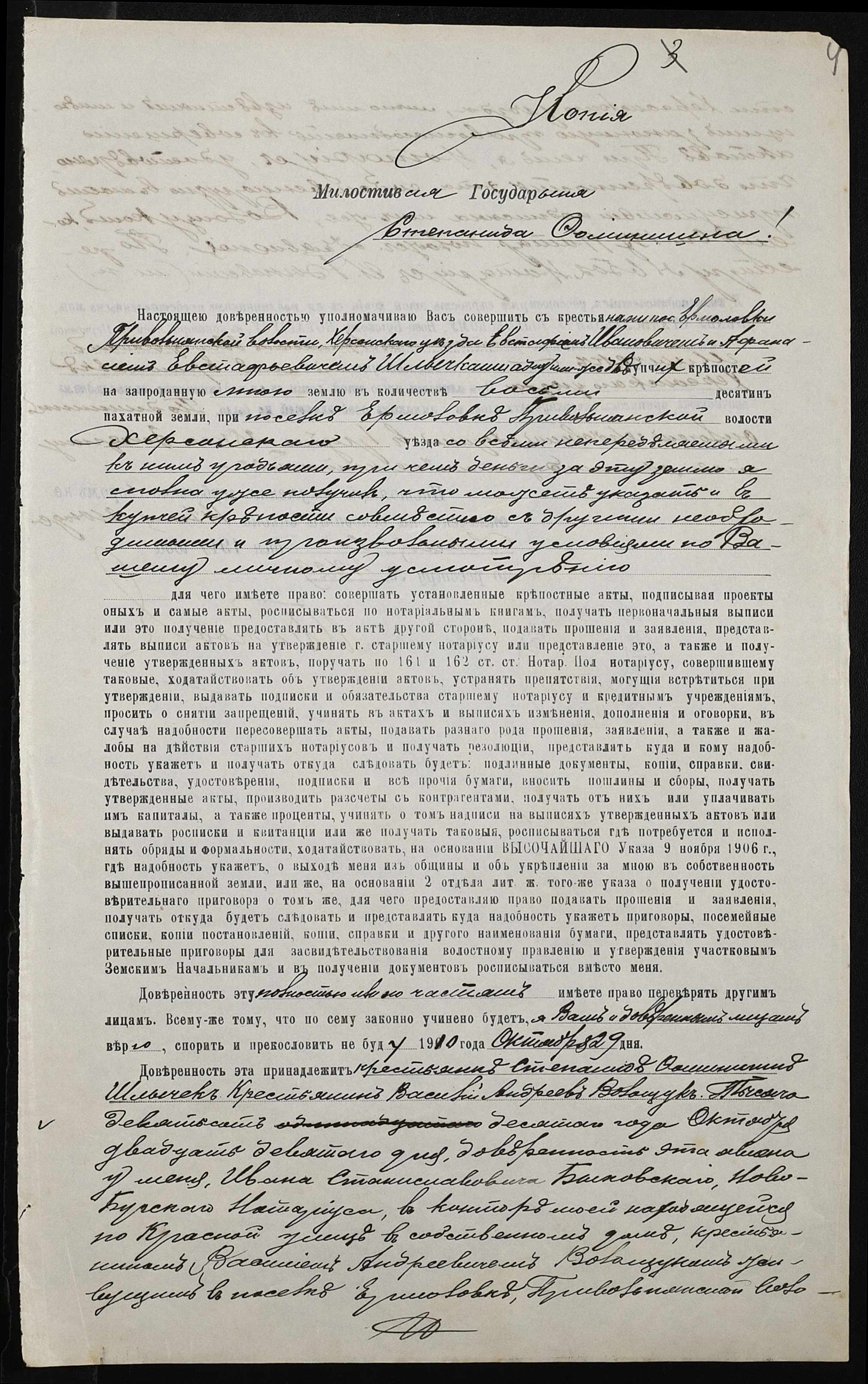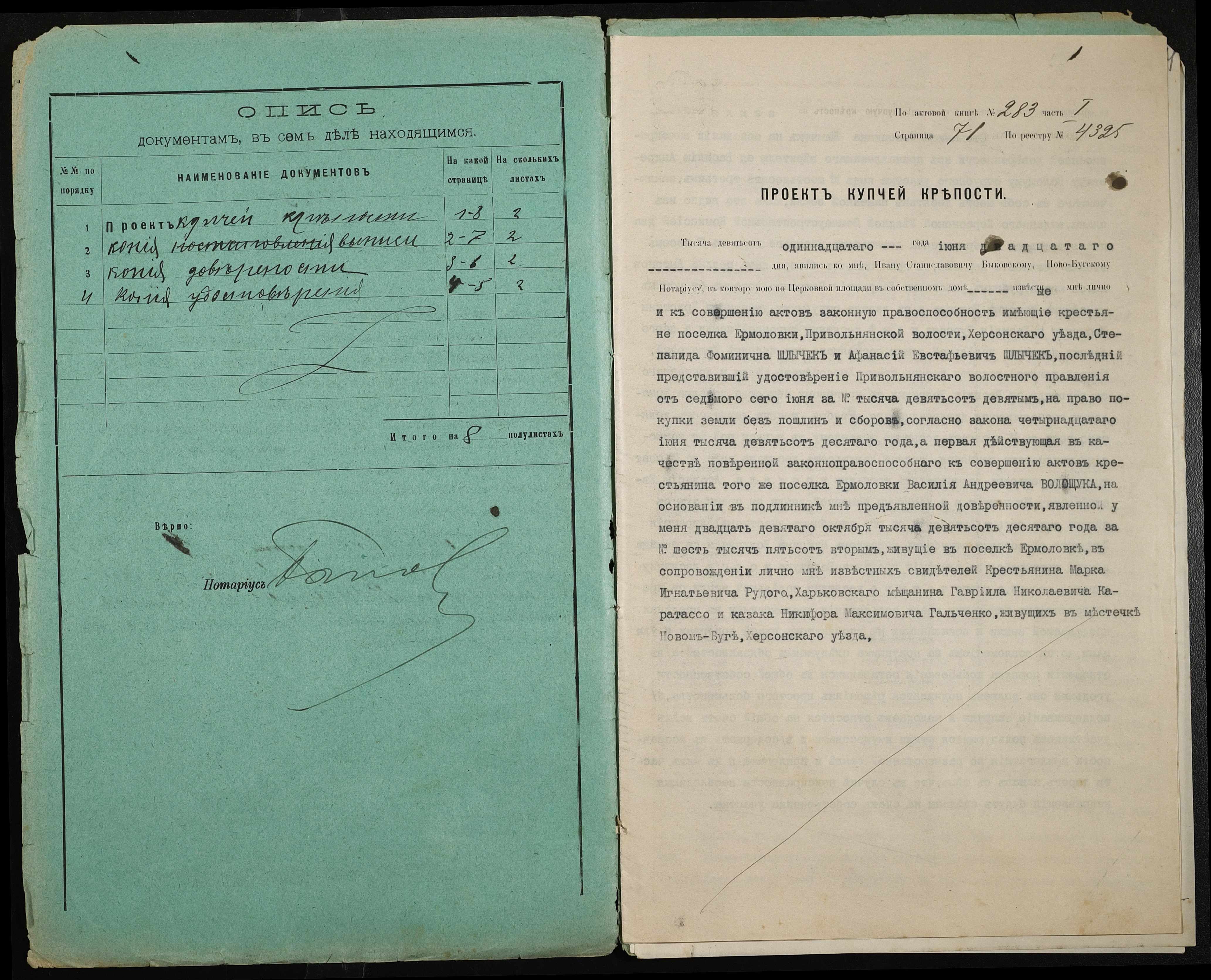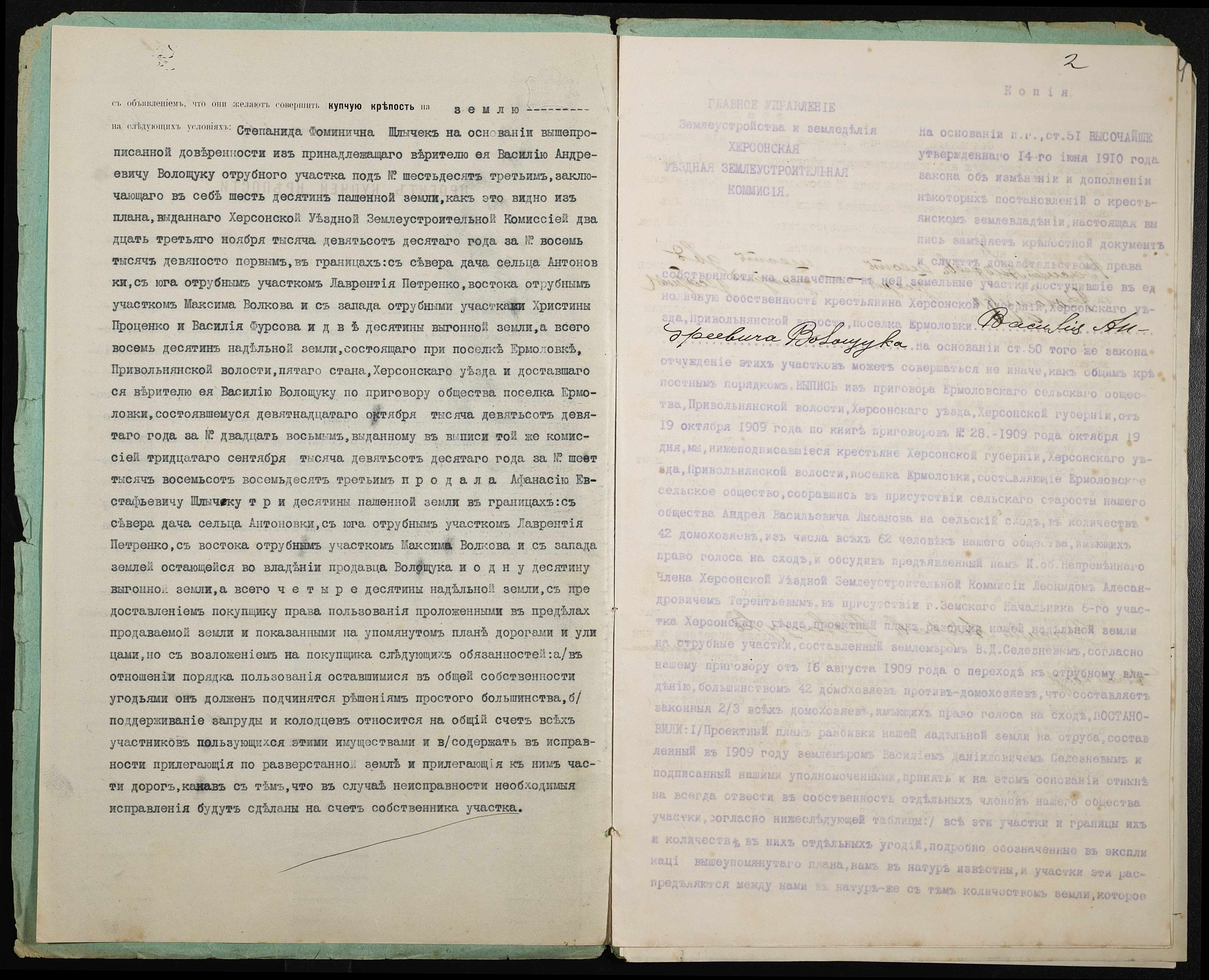 • • • • Справа № 349 “Справа про вчинення купчої про продаж землі селянином Волощуком Василем Андрійовичем (Василием Андреевичем) на користь селянина Шличека Опанаса Євстафійовича (Шлычека Афанасия Евстафьевича)”