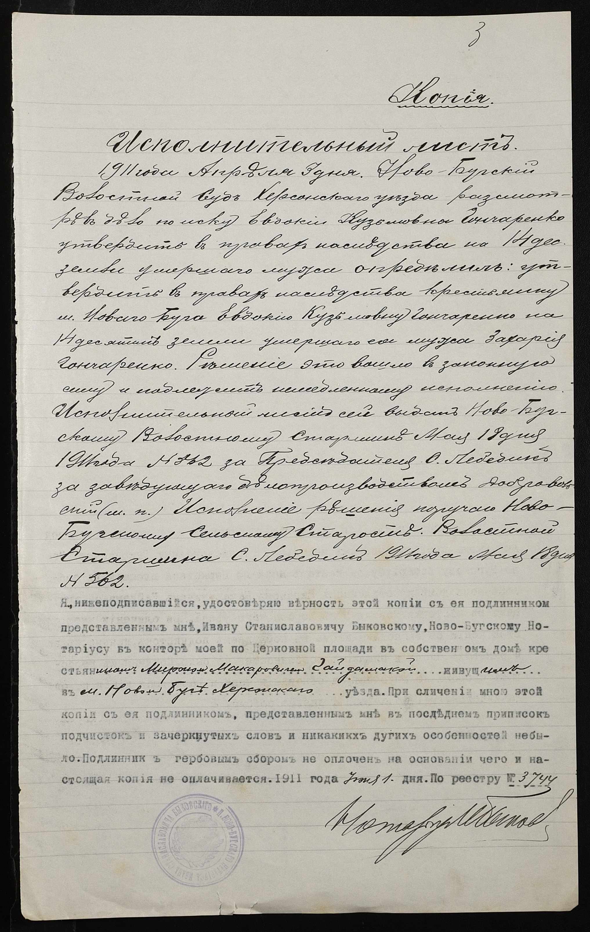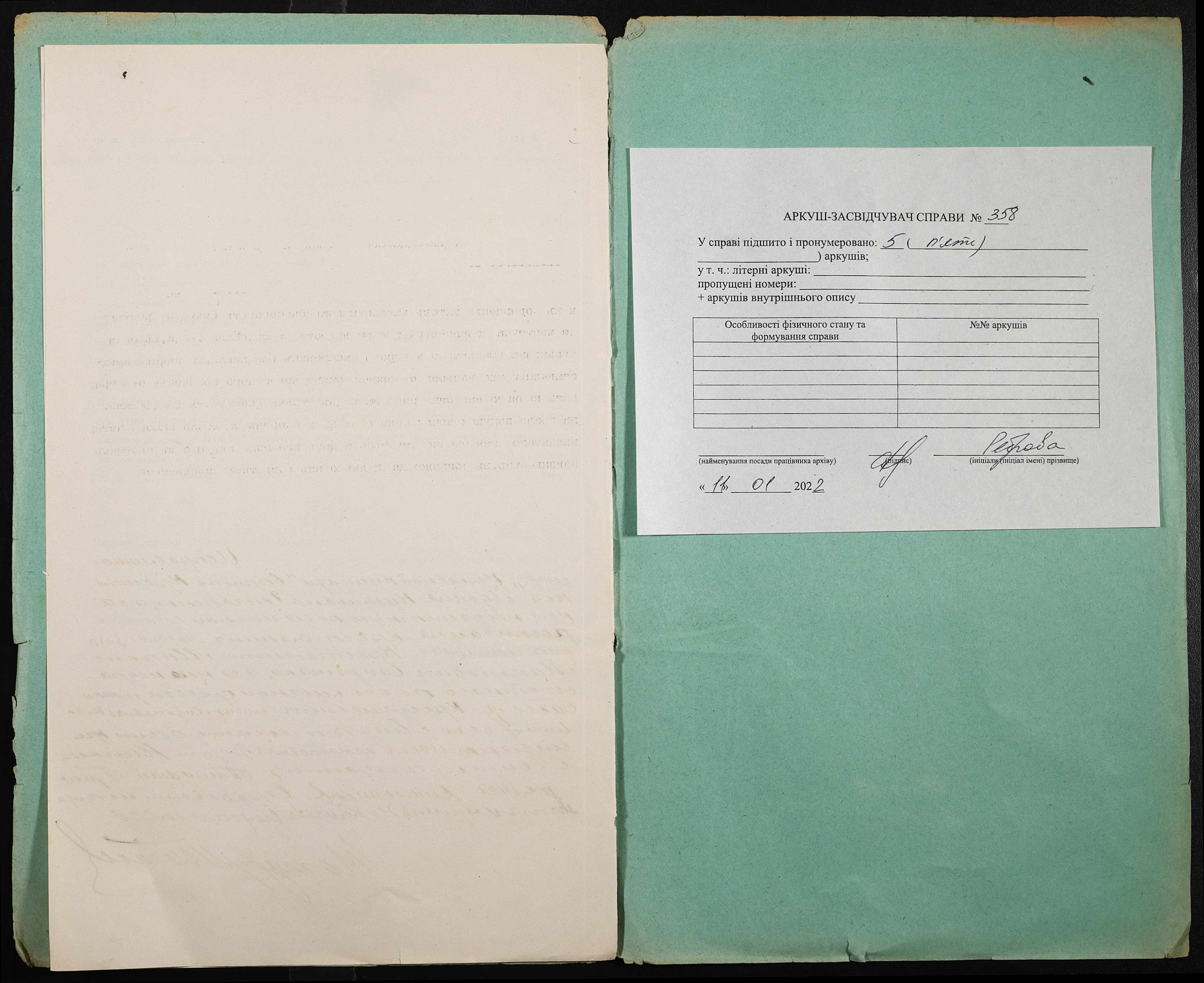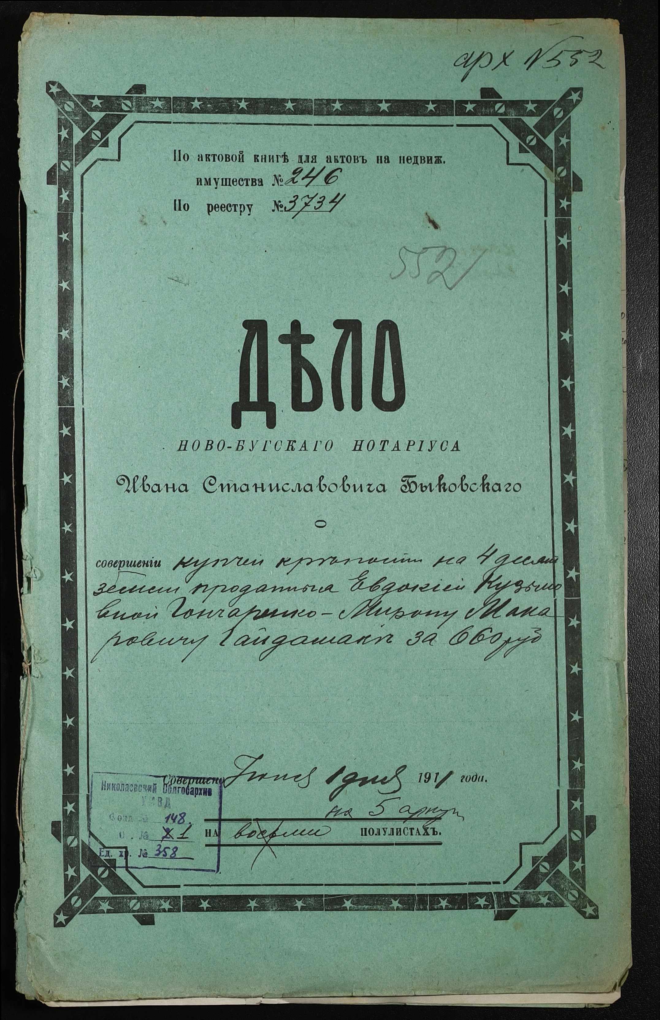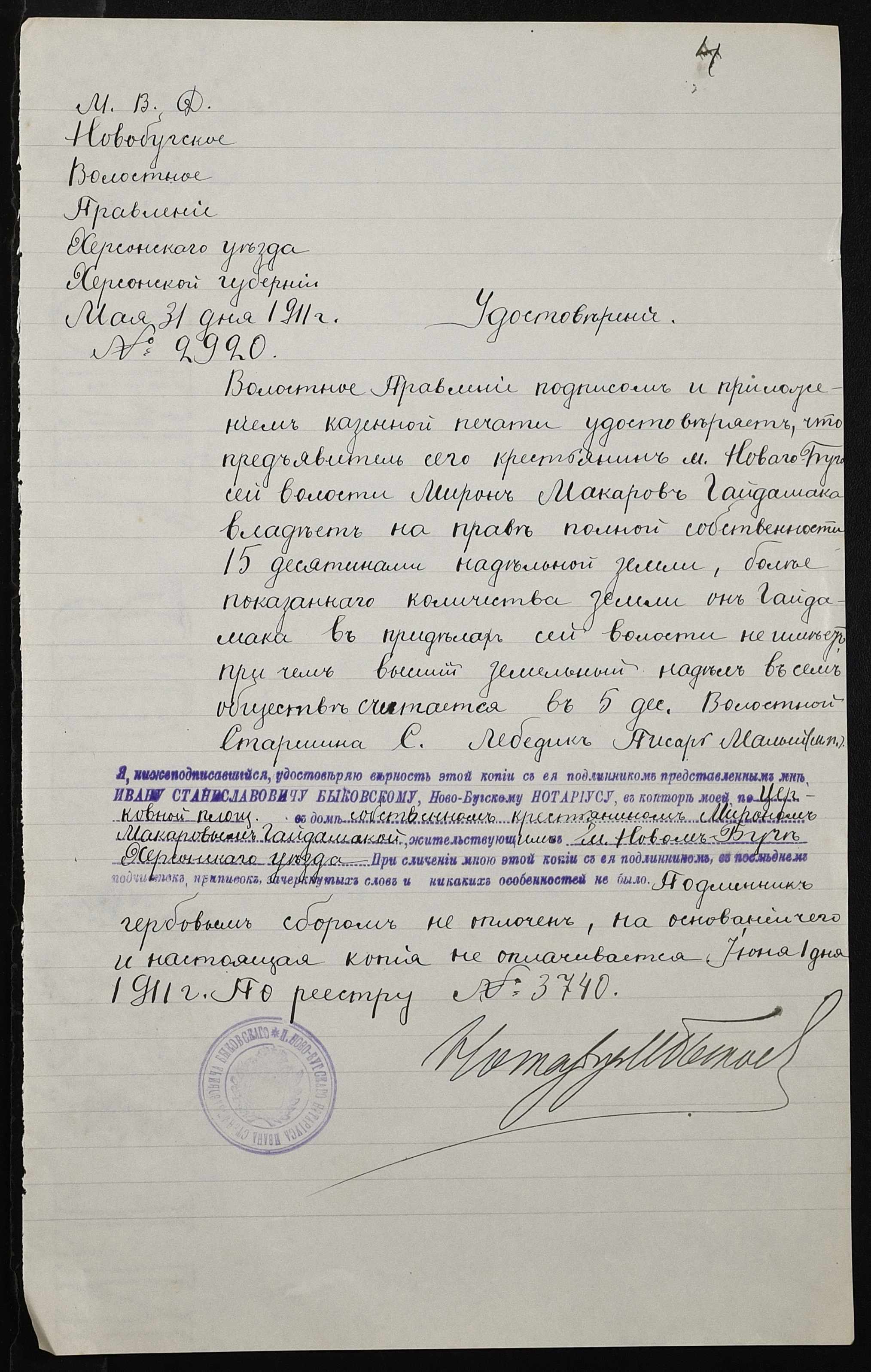 • • • • Справа № 358 “Справа про вчинення купчої про продаж землі селянкою Гончаренко Євдокією Кузьмівною (Евдокией Кузьминичной) на користь селянина Гайдамаки Мирона Макаровича”