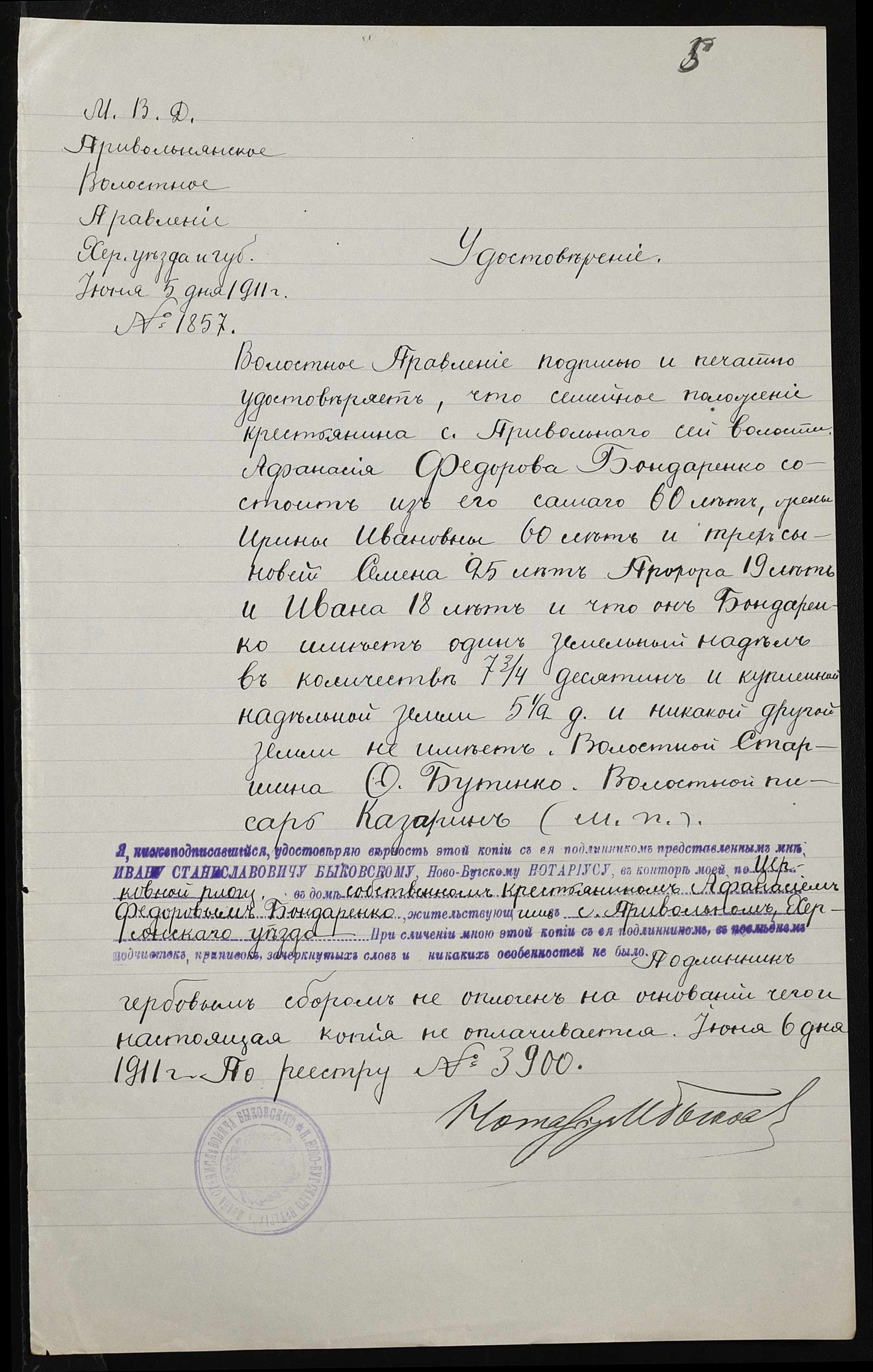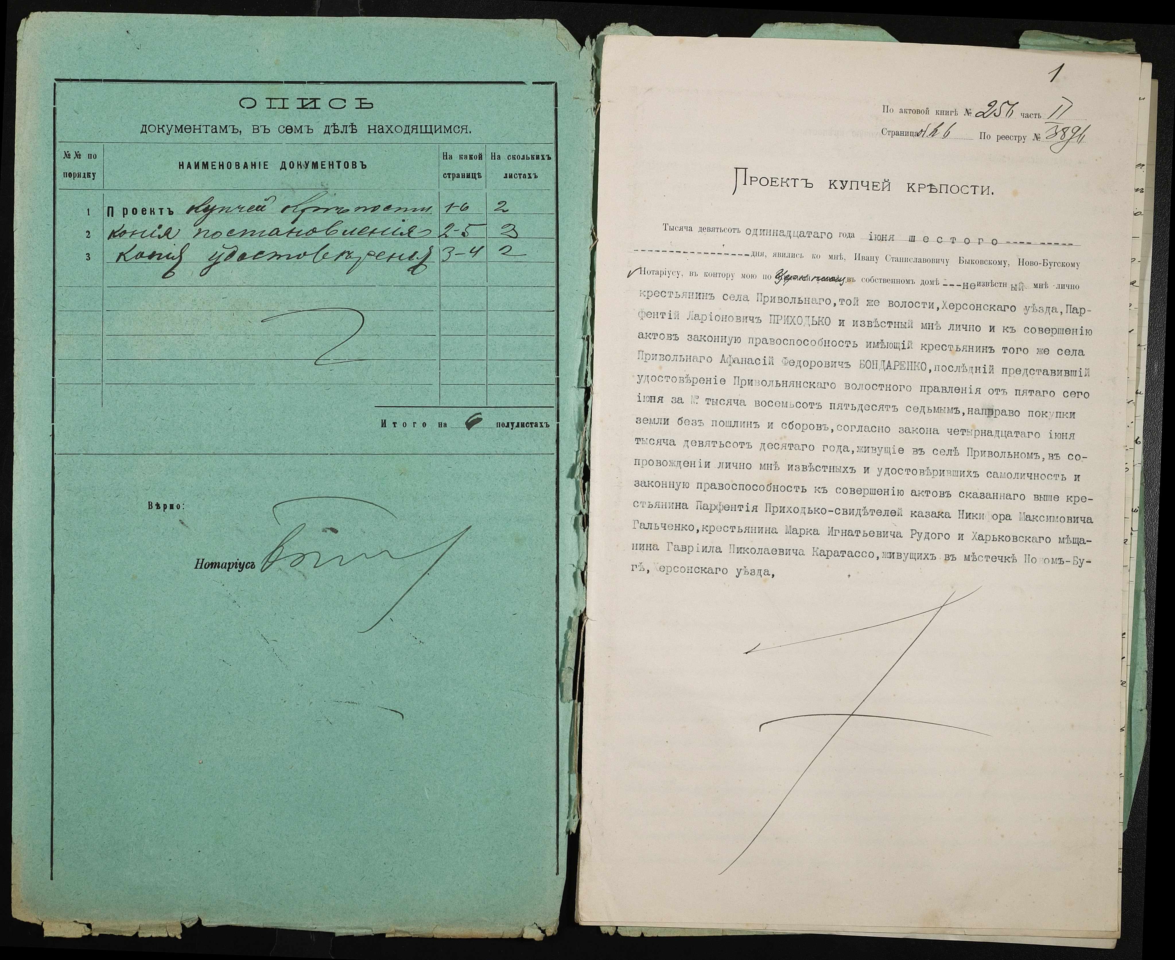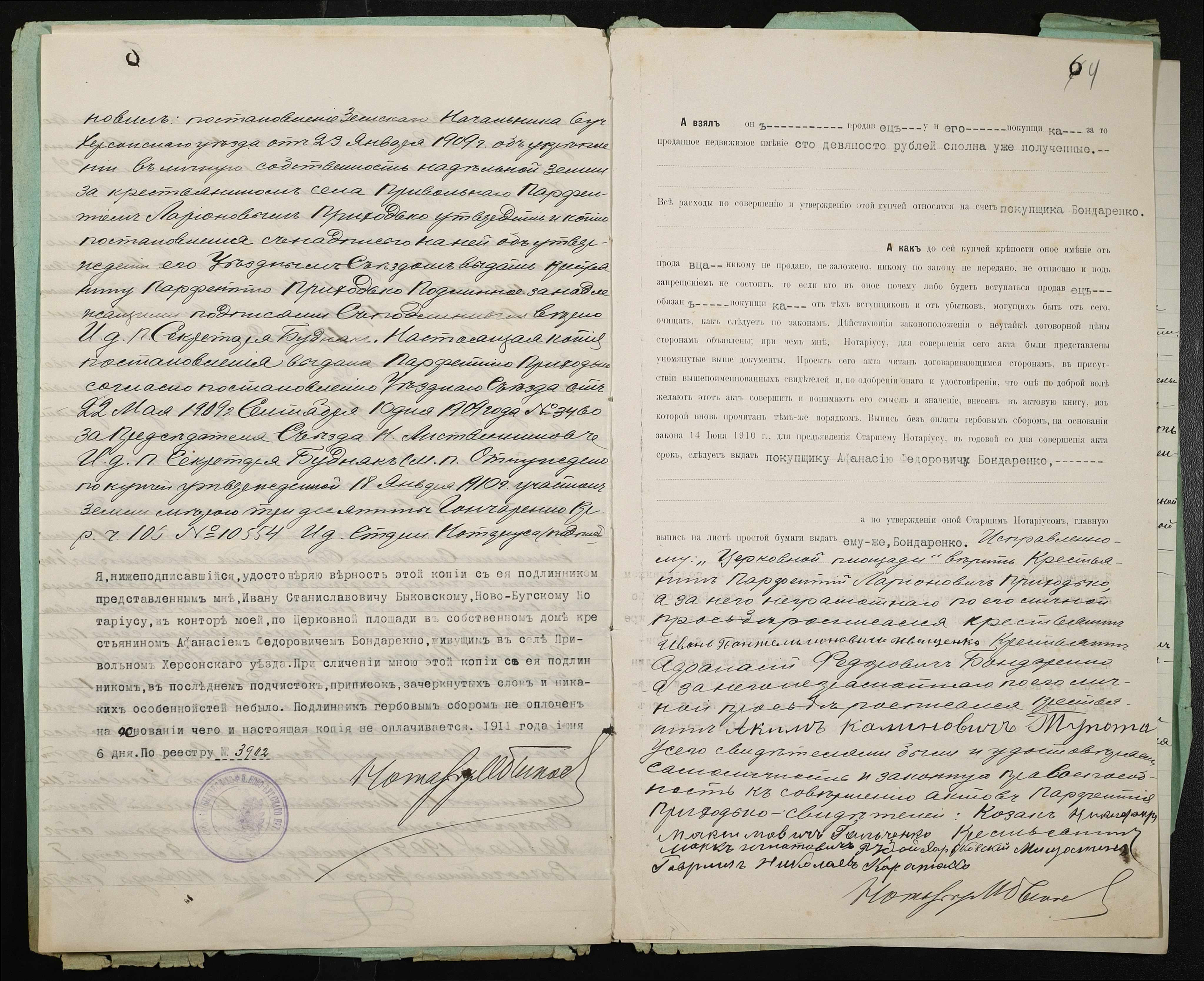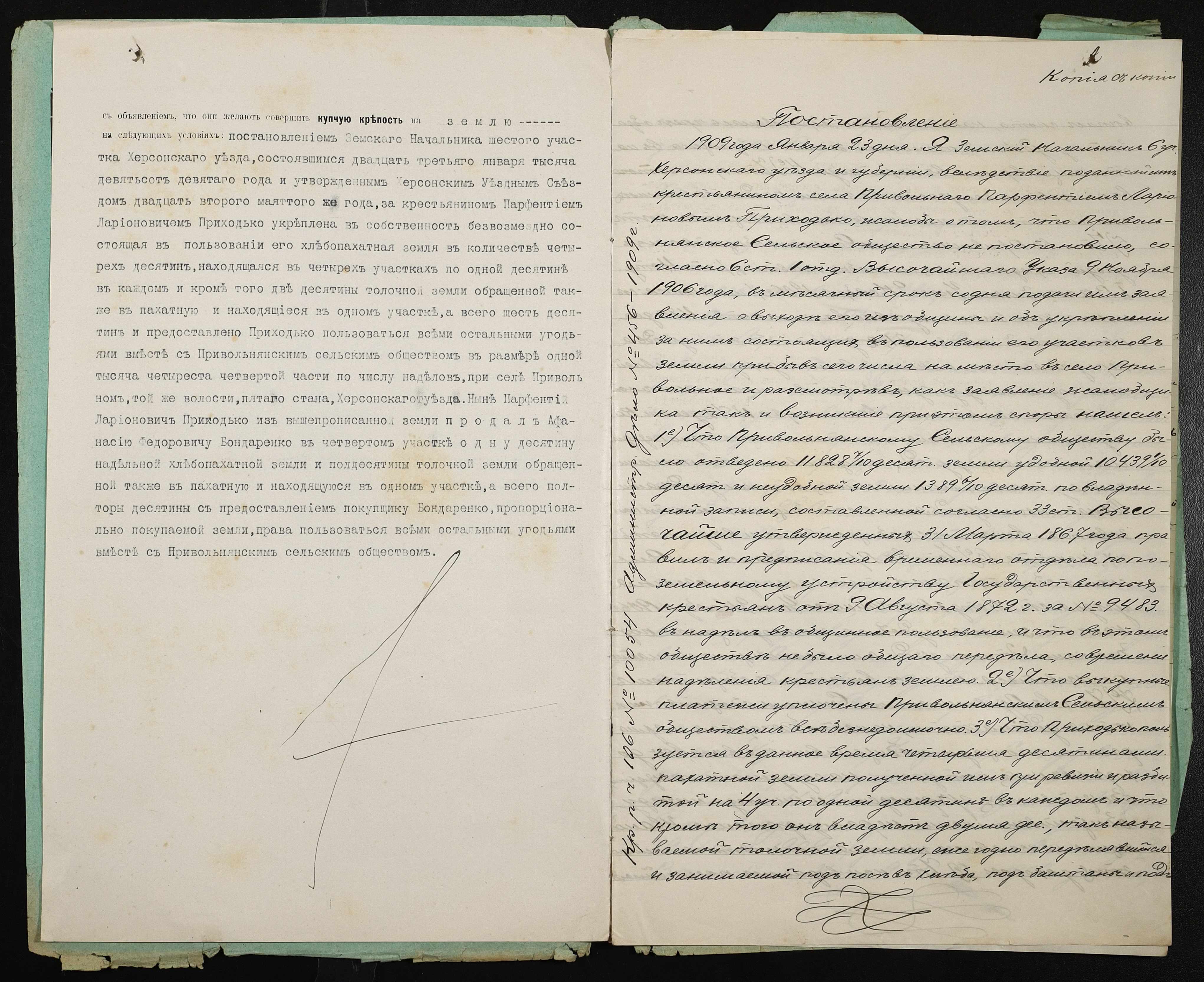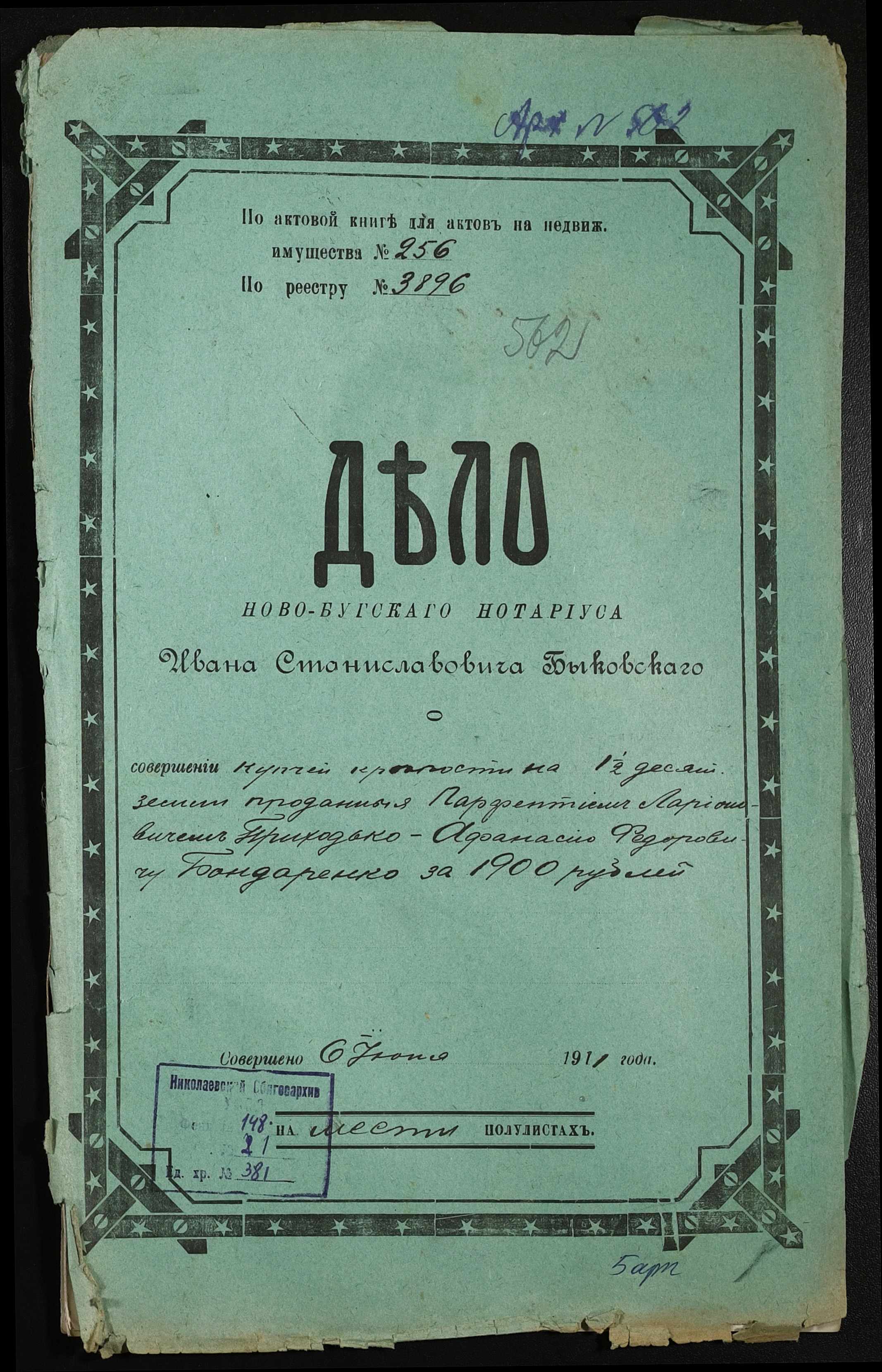 • • • • Справа № 381 “Справа про вчинення купчої про продаж землі селянином Приходьком Парфентієм Ларіоновичем (Приходько Парфентием Ларионовичем) на користь селянина Бондаренка Опанаса (Бондаренко Афанасия) Федоровича”
