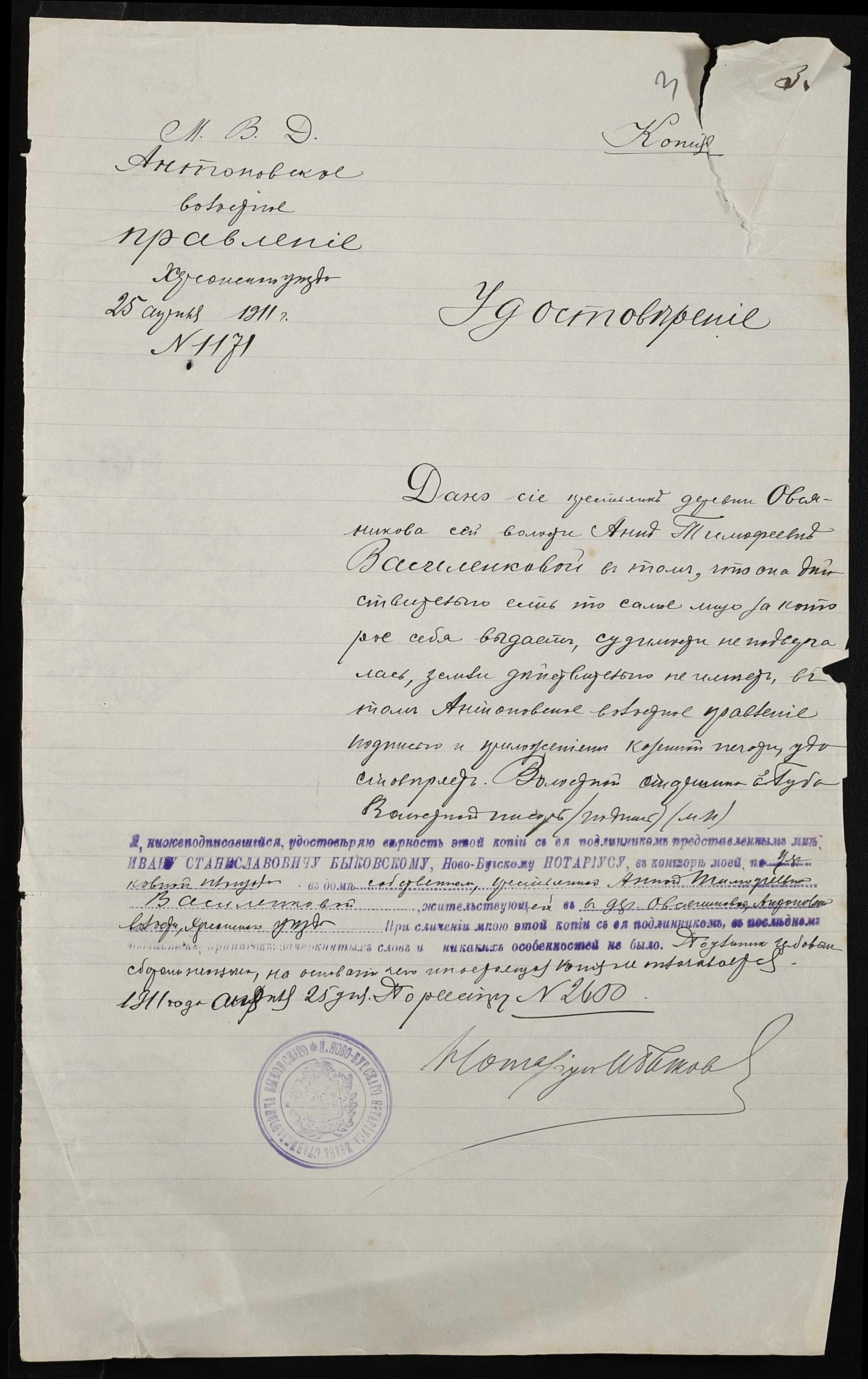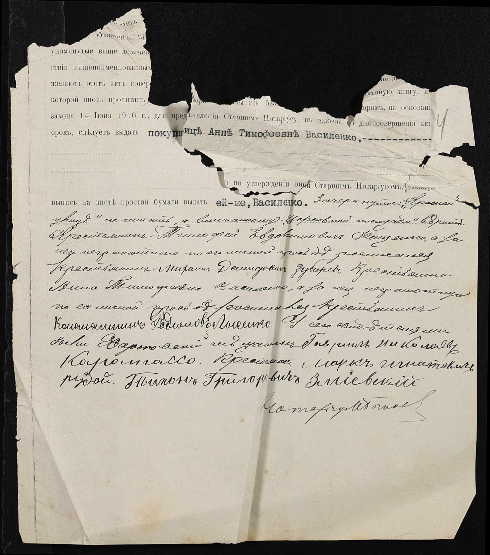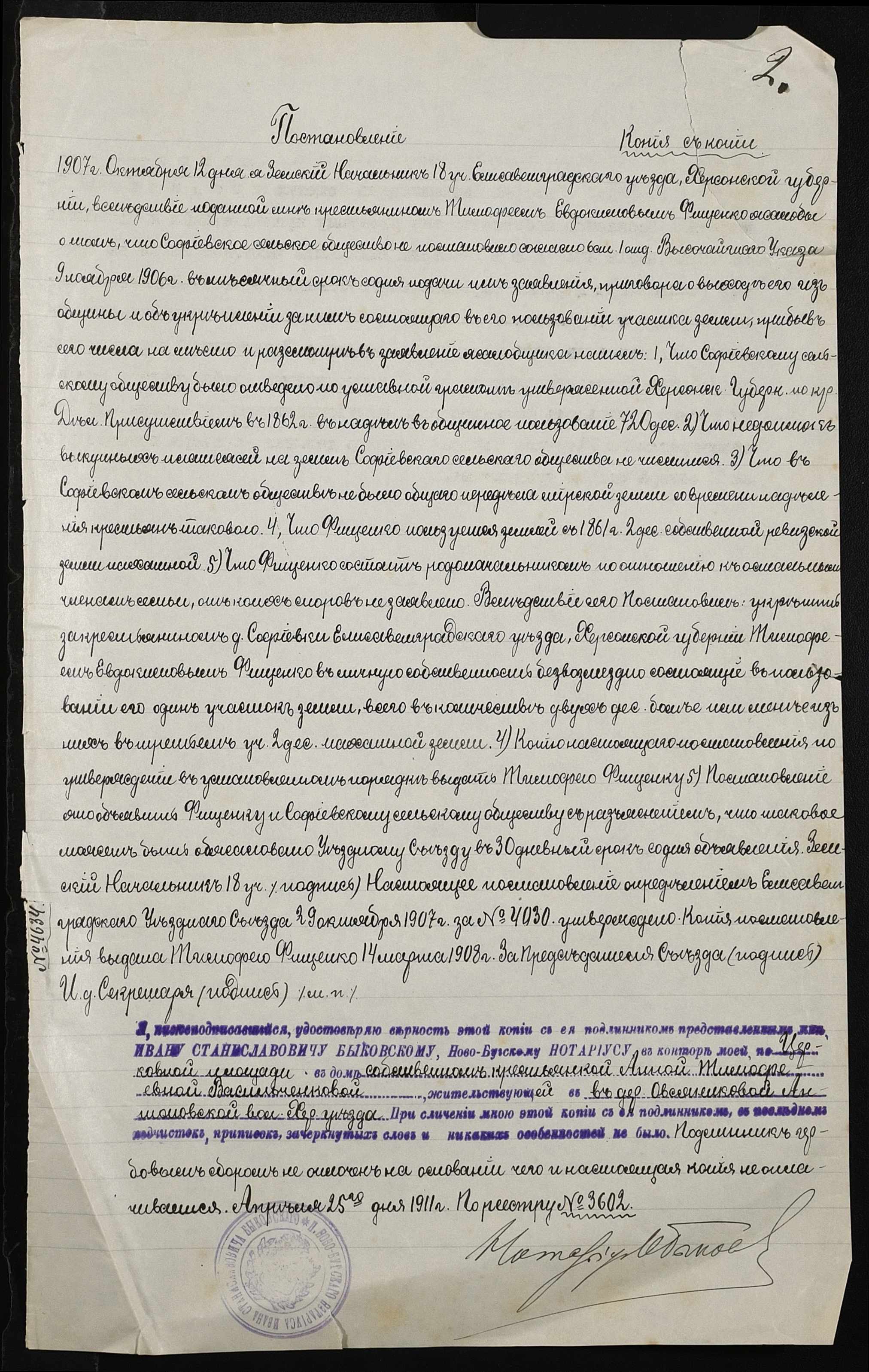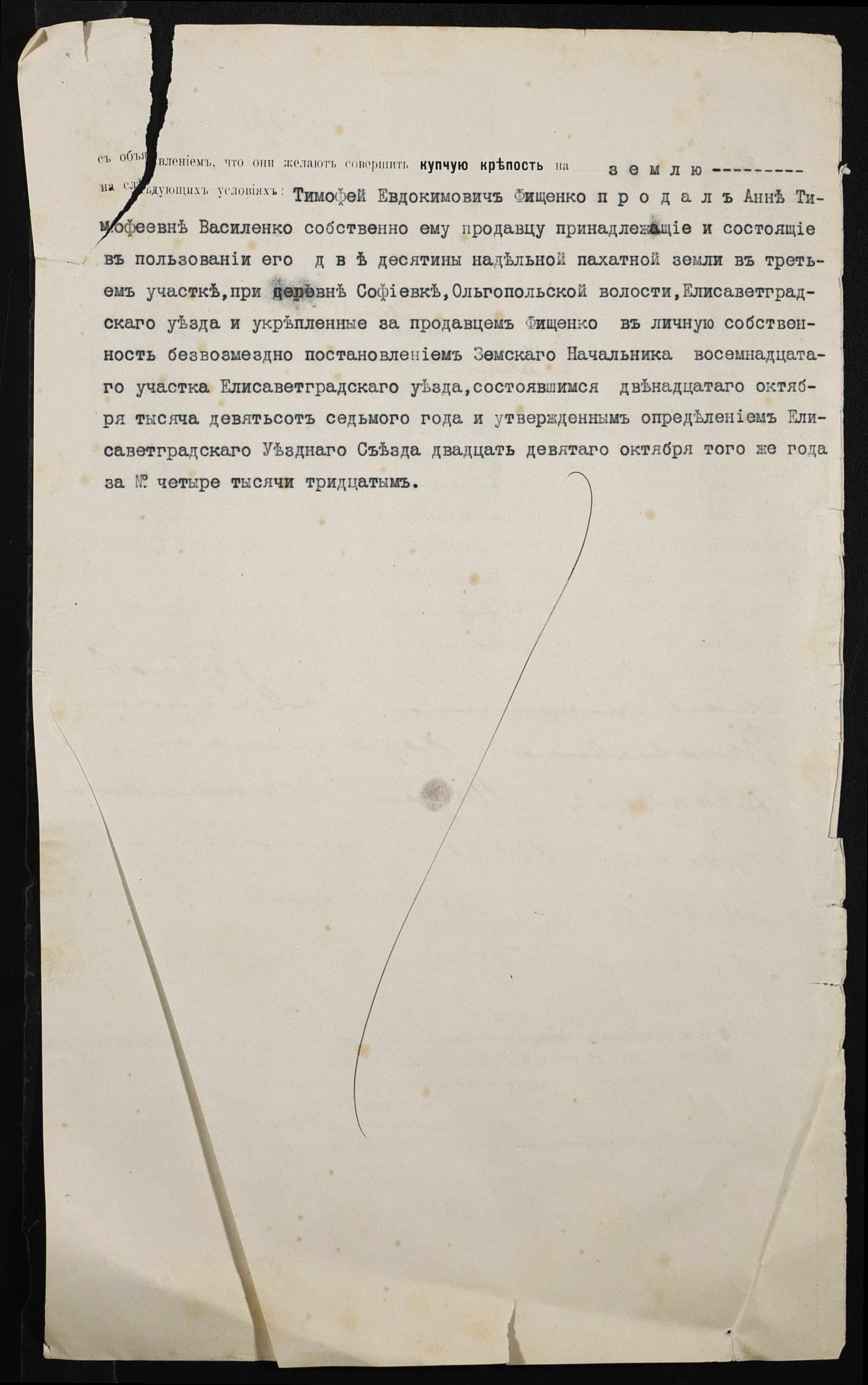 • • • • Справа № 388 “Справа про вчинення купчої про продаж землі селянином Фіщенком Тимофієм Євдокимовичем (Фищенко Тимофеем Евдокимовичем) на користь селянки Василенко Ганни Тимофіївни (Анны Тимофеевны)”