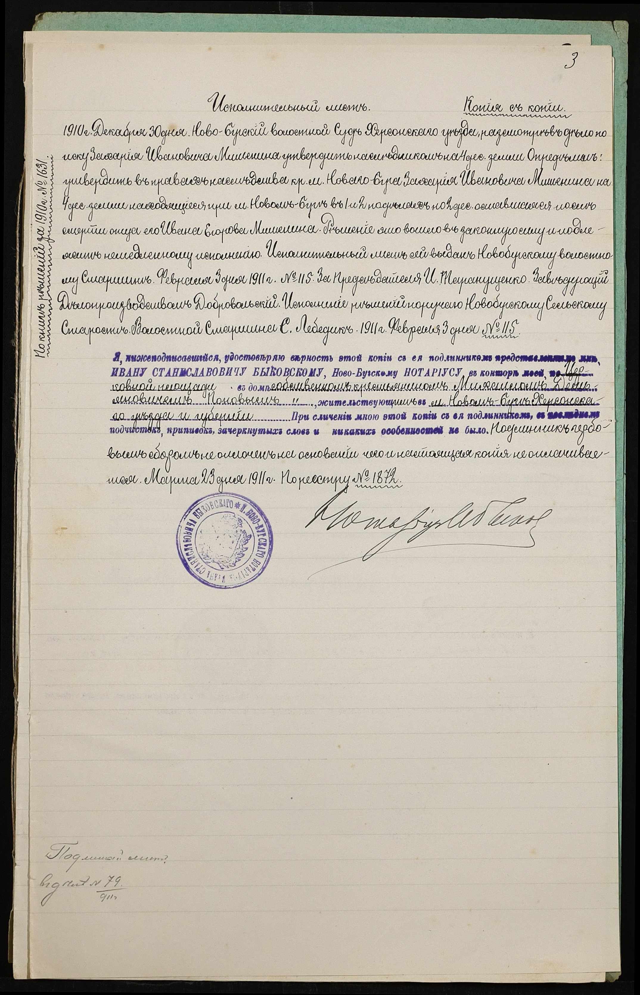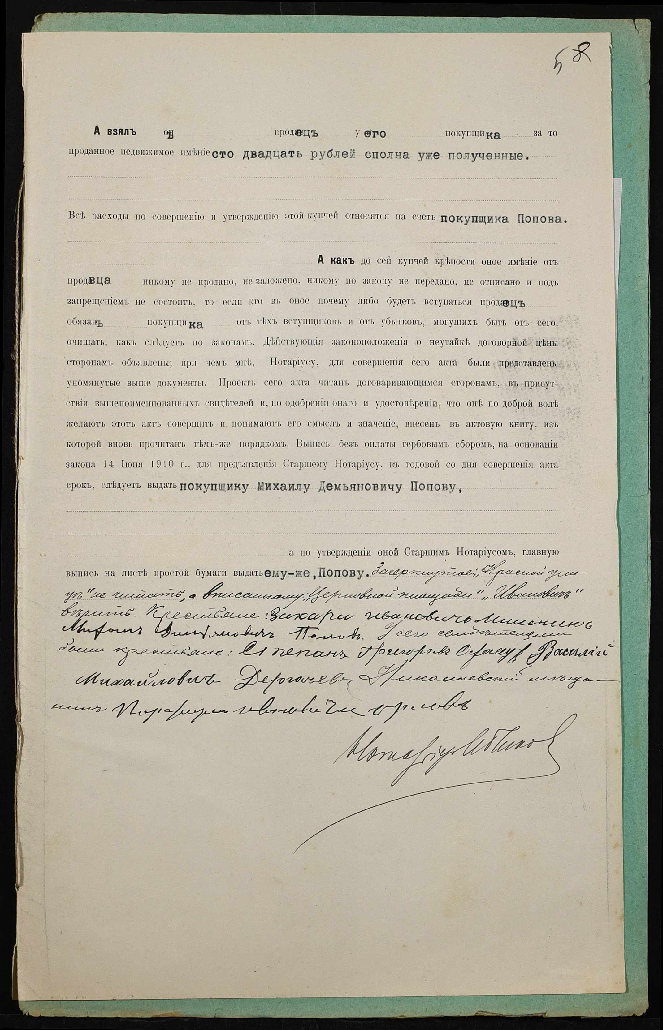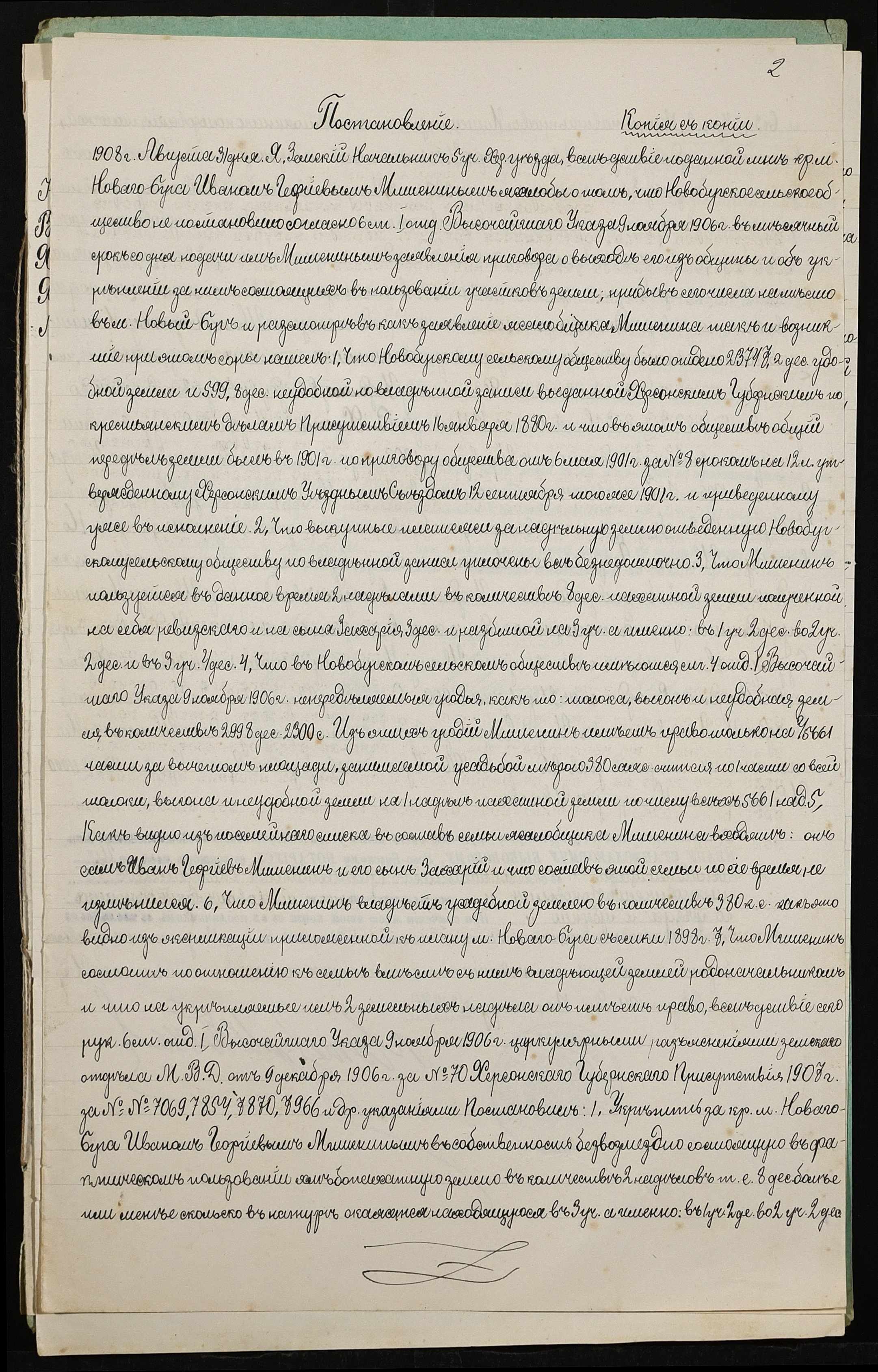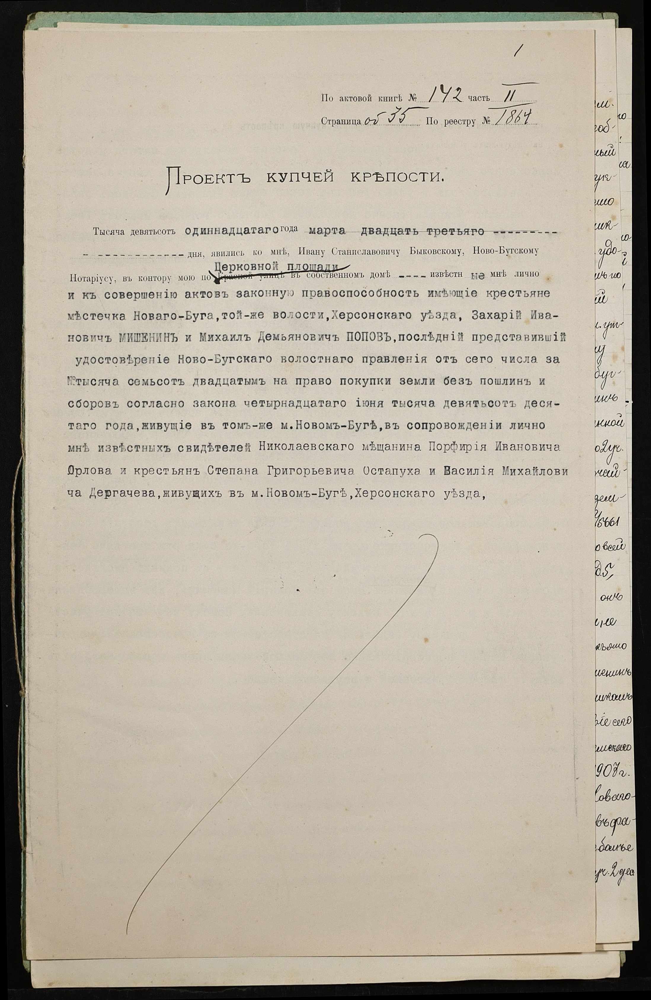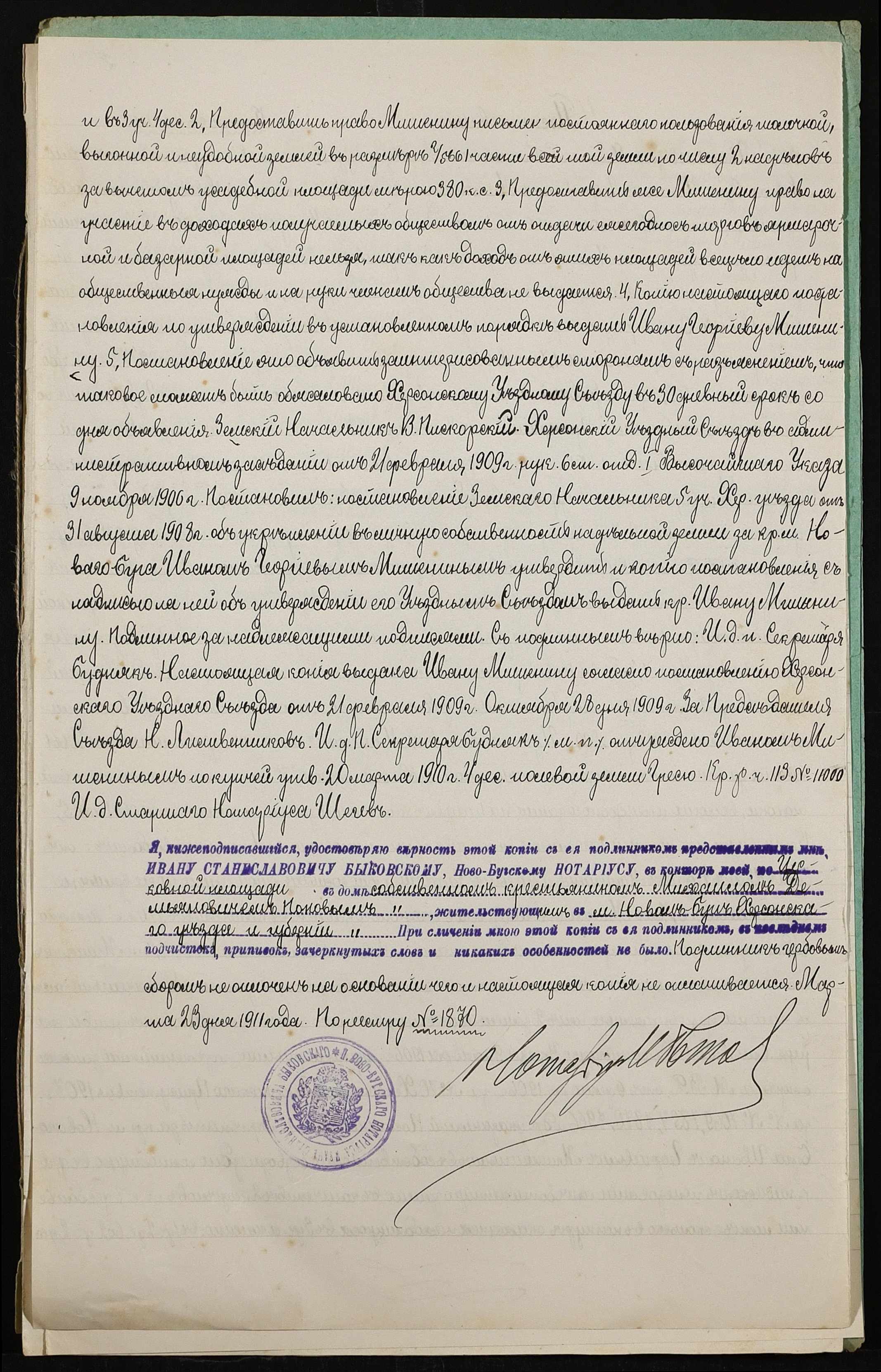 • • • • Справа № 394 “Справа про вчинення купчої про продаж землі селянином Мішеніним Захарієм Івановичем (Мишениным Захарием Ивановичем) на користь селянина Попова Михайла Дем’яновича (Михаила Демьяновича)”