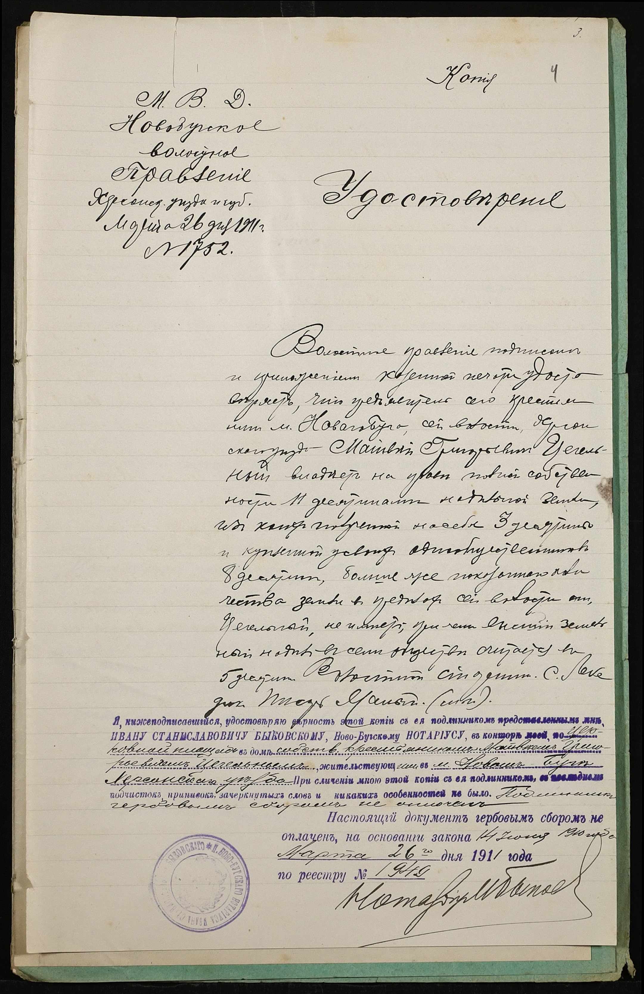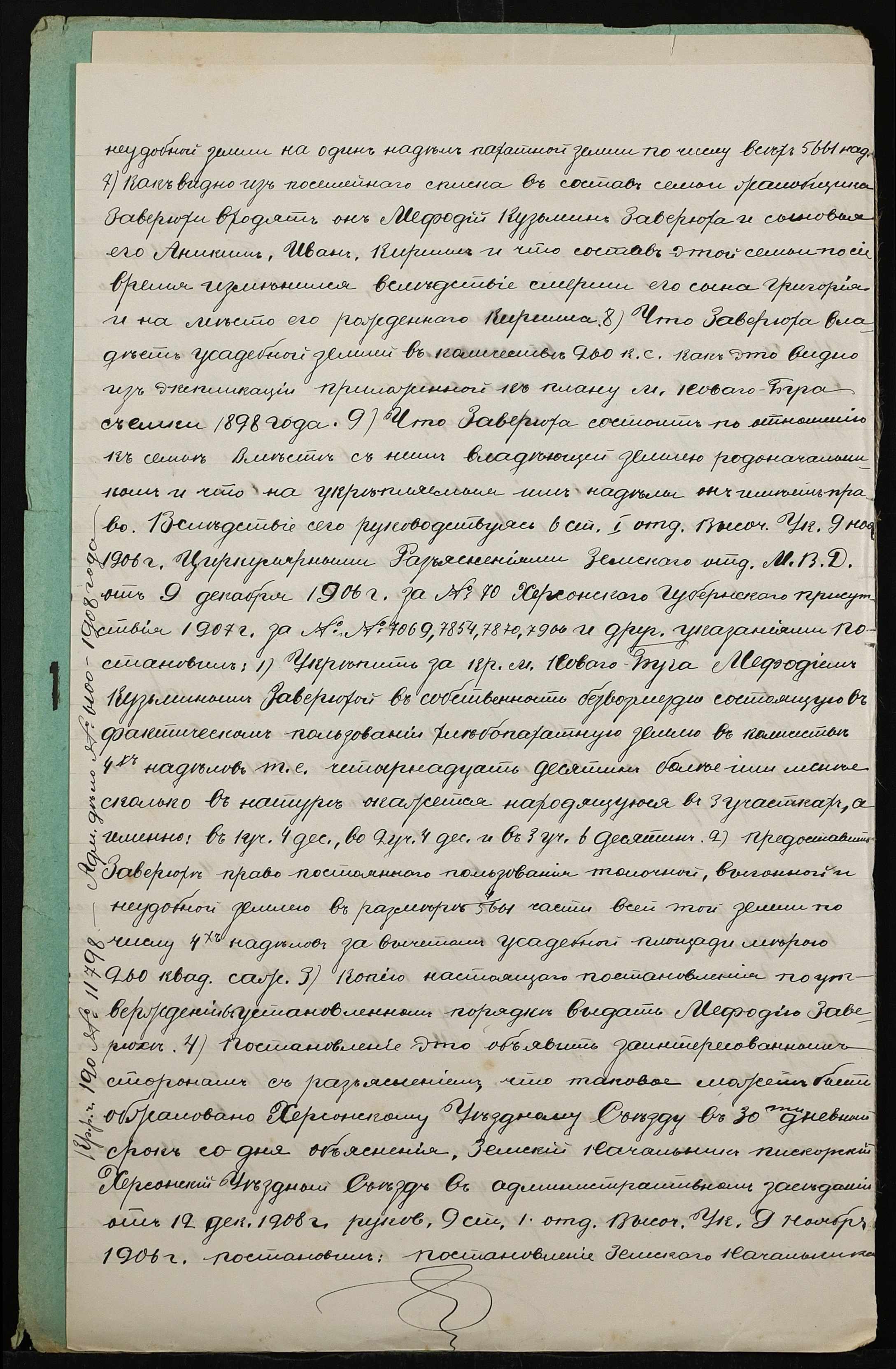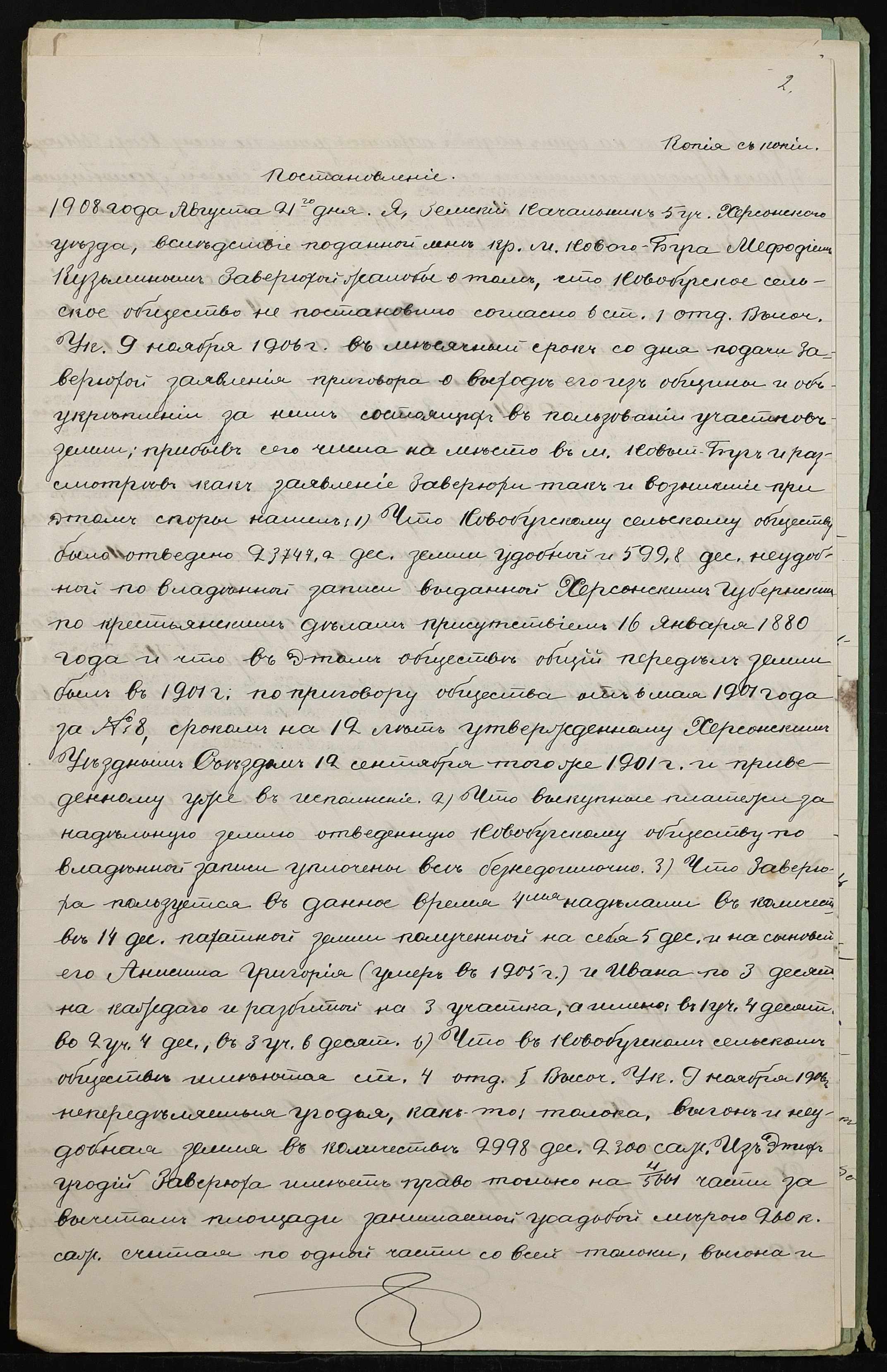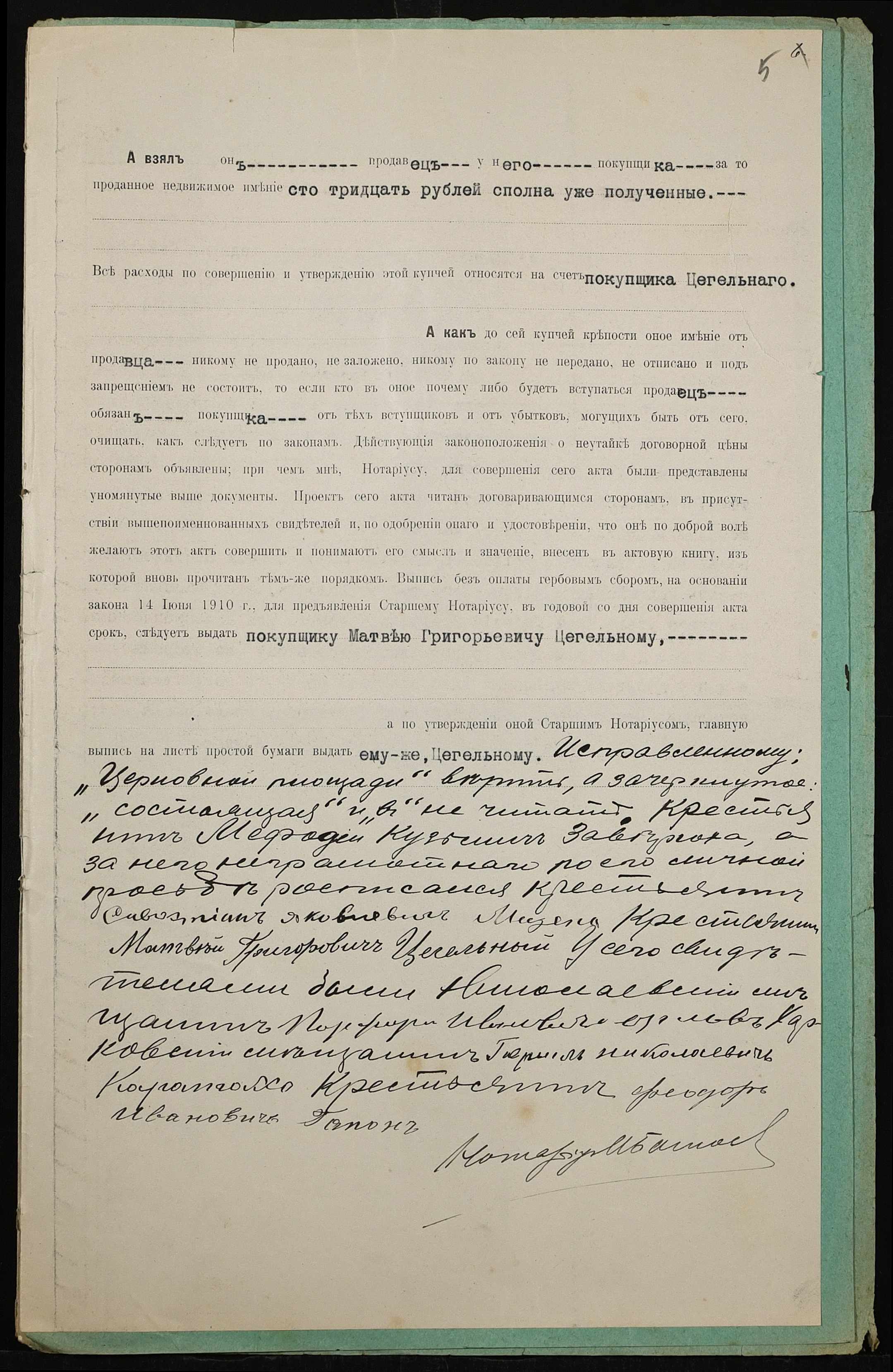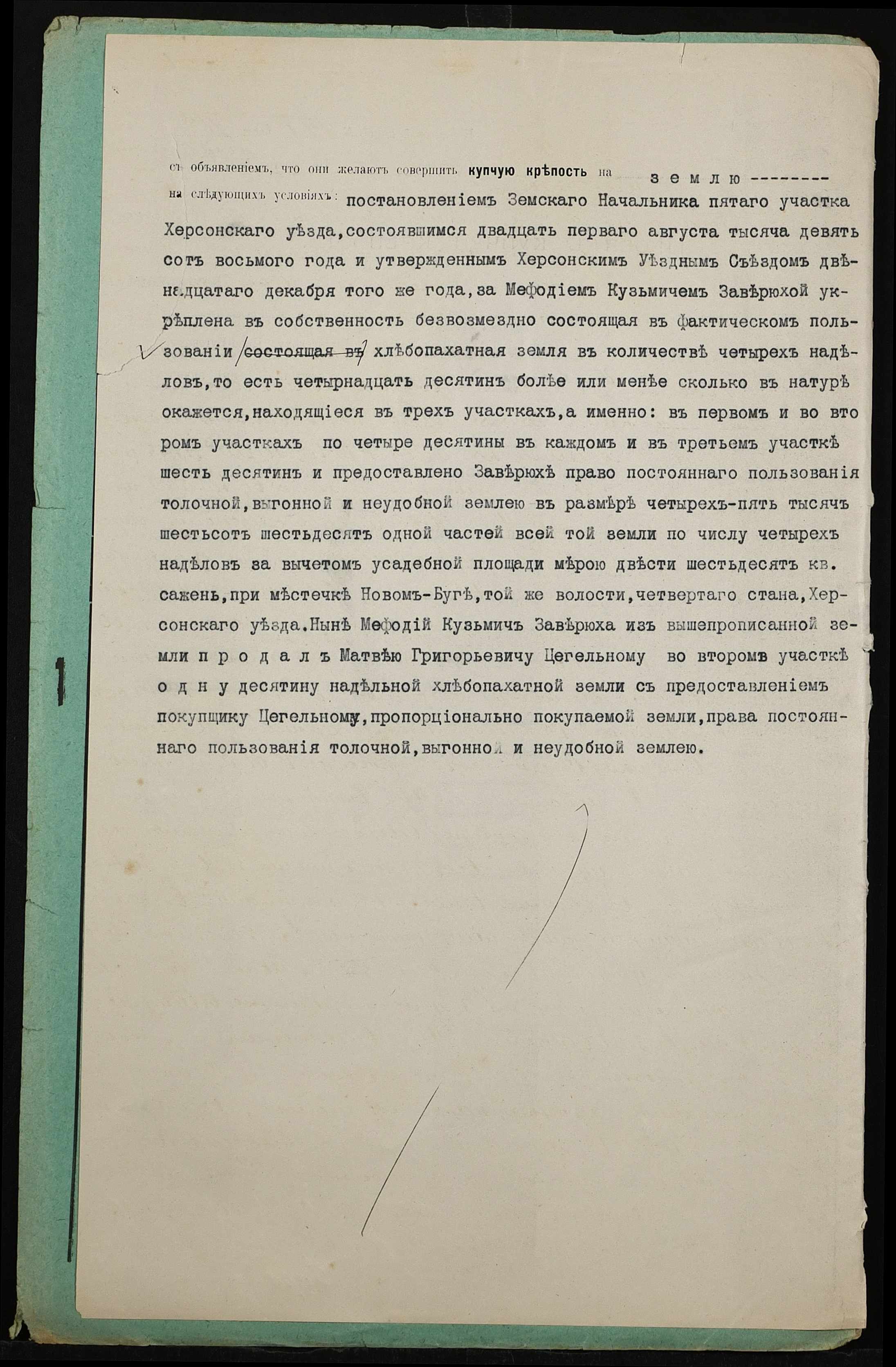 • • • • Справа № 399 “Справа про вчинення купчої про продаж землі селянином Заверюхою Мефодієм (Заверюхой Мефодием) Кузьмичем на користь селянина Цегельного Матвія Григоровича (Матвея Григорьевича)”