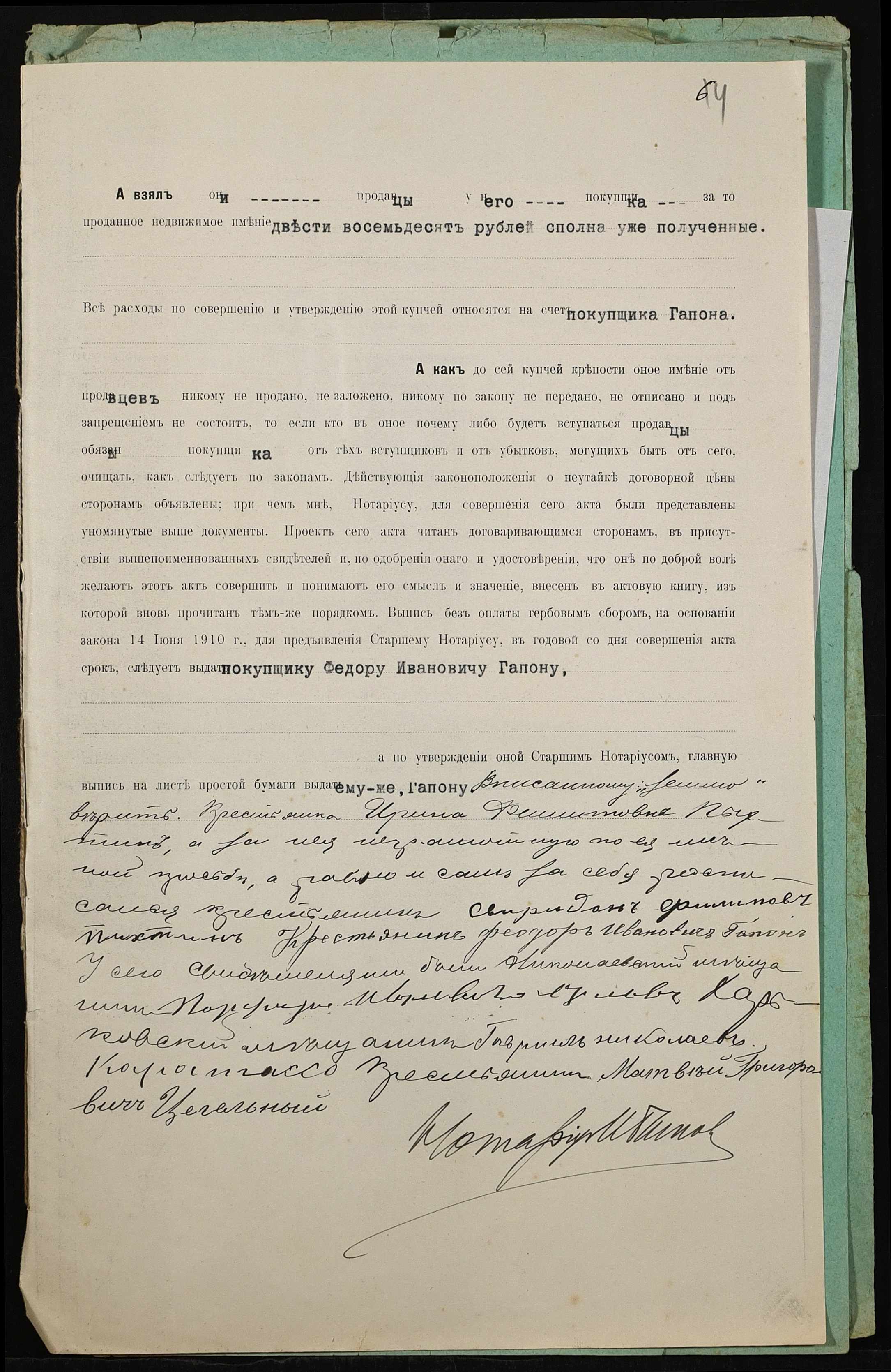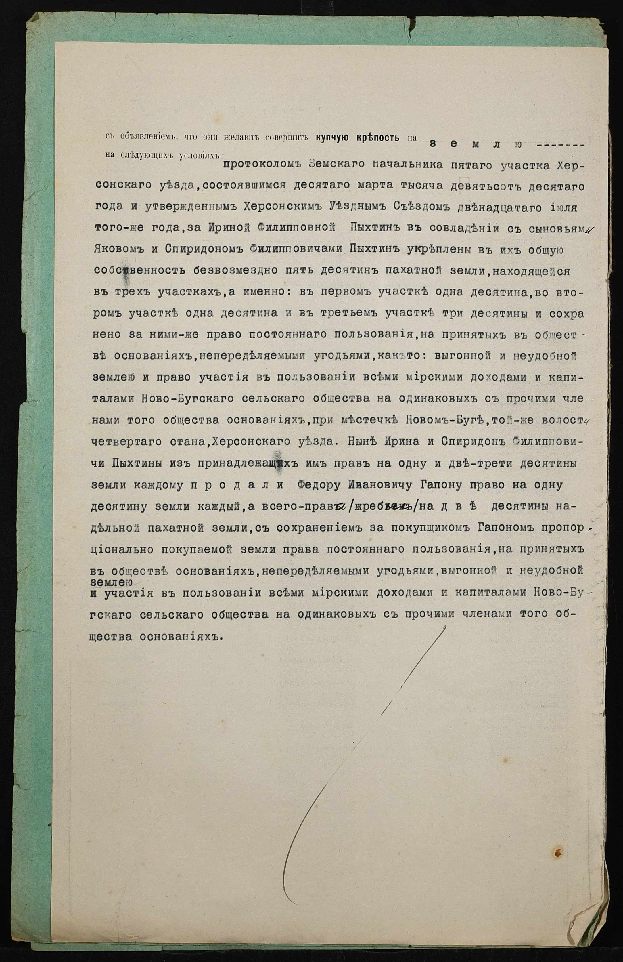• • • • Справа № 400 “Справа про вчинення купчої про продаж землі селянами Пихтіною Іриною Пилипівною (Пыхтиной Ириной Филипповной) і Пихтіним (Пыхтиным) Спиридоном Пилиповичем (Филипповичем) на користь селянина Гапона Федора Івановича (Ивановича)”