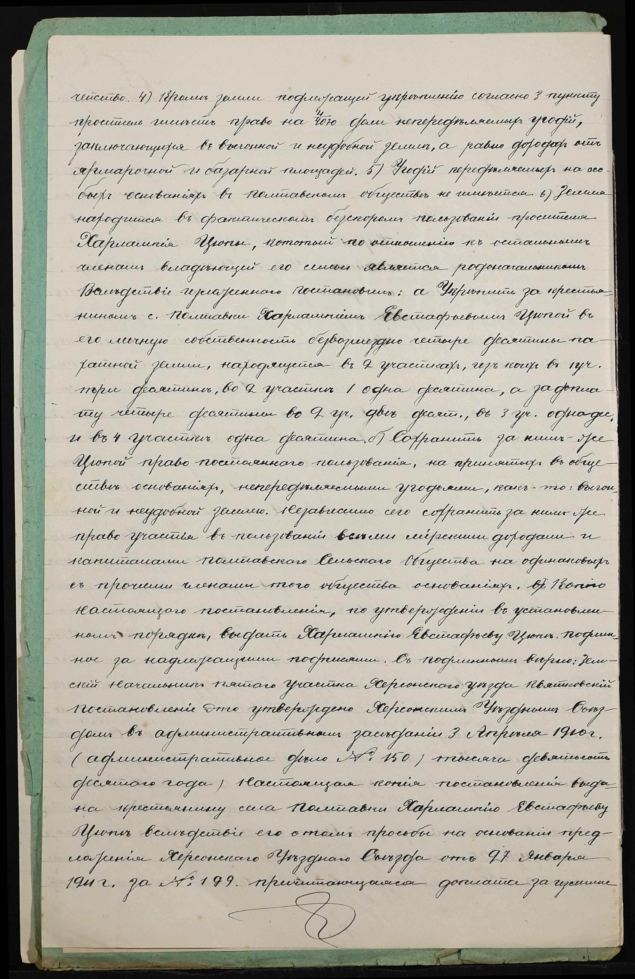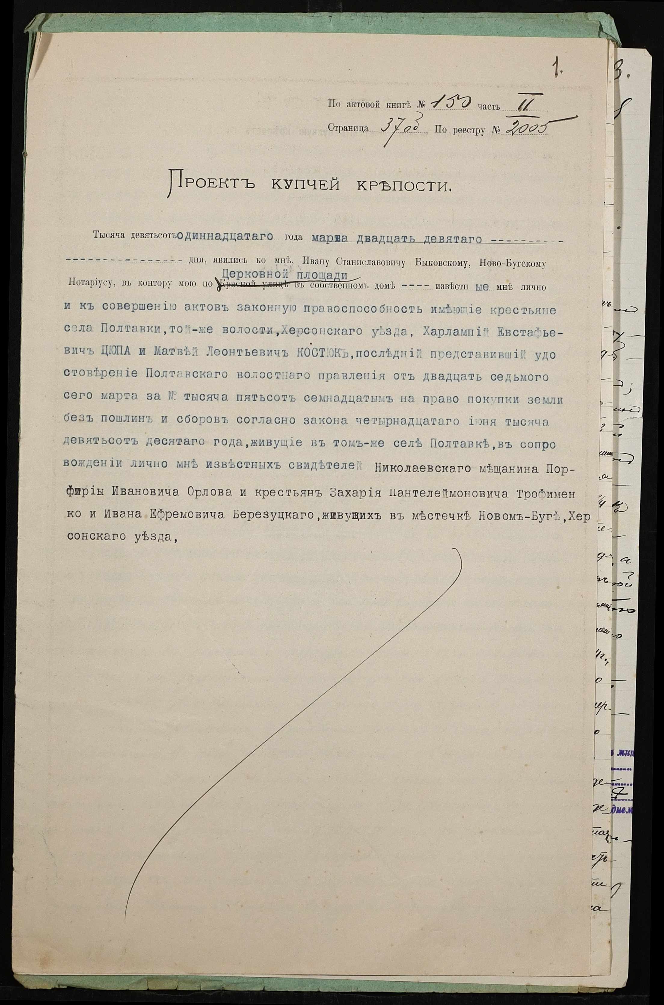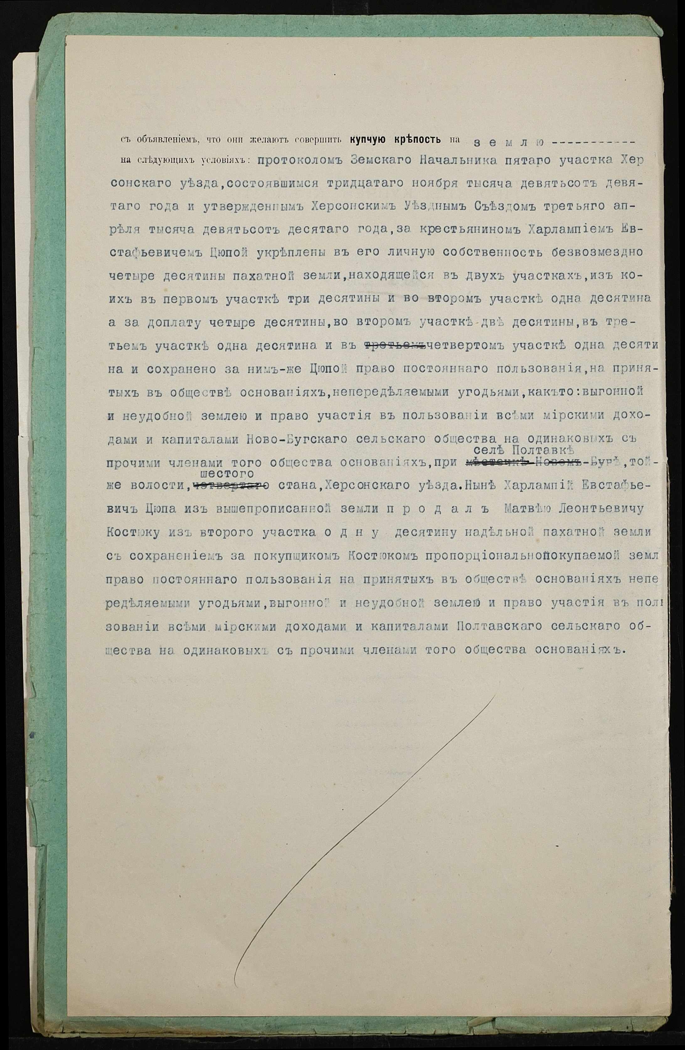 • • • • Справа № 401 “Справа про вчинення купчої про продаж землі селянином Цюпою Харлампієм Євстафійовичем (Цюпой Харлампием Евстафьевичем) на користь селянина Костюка Матвія Леонідовича (Матвея Леонидовича)”