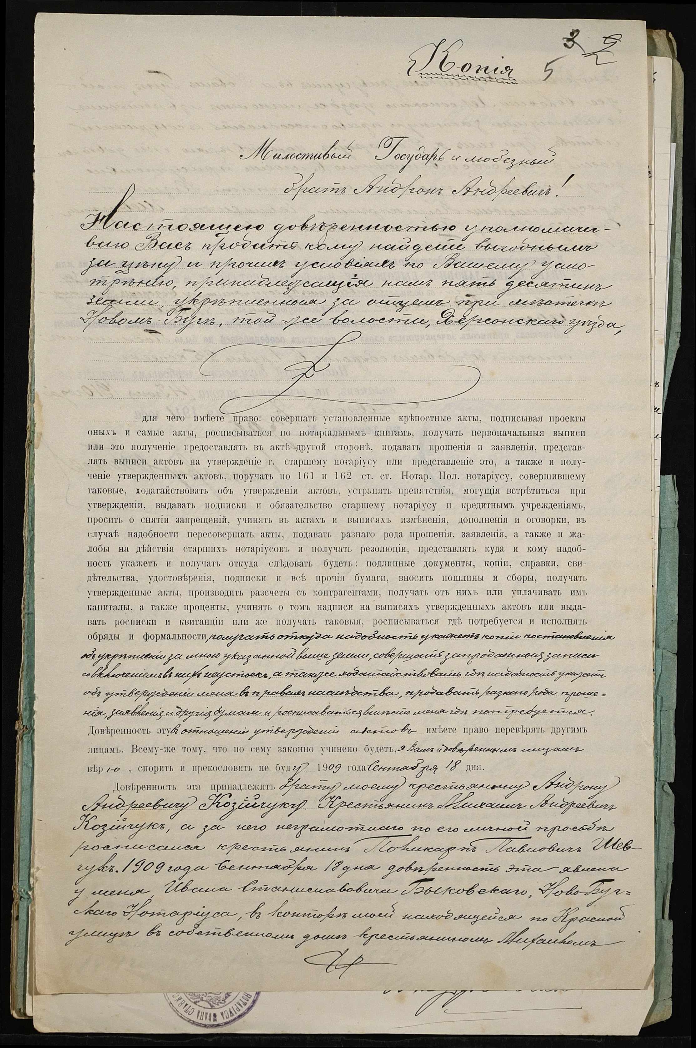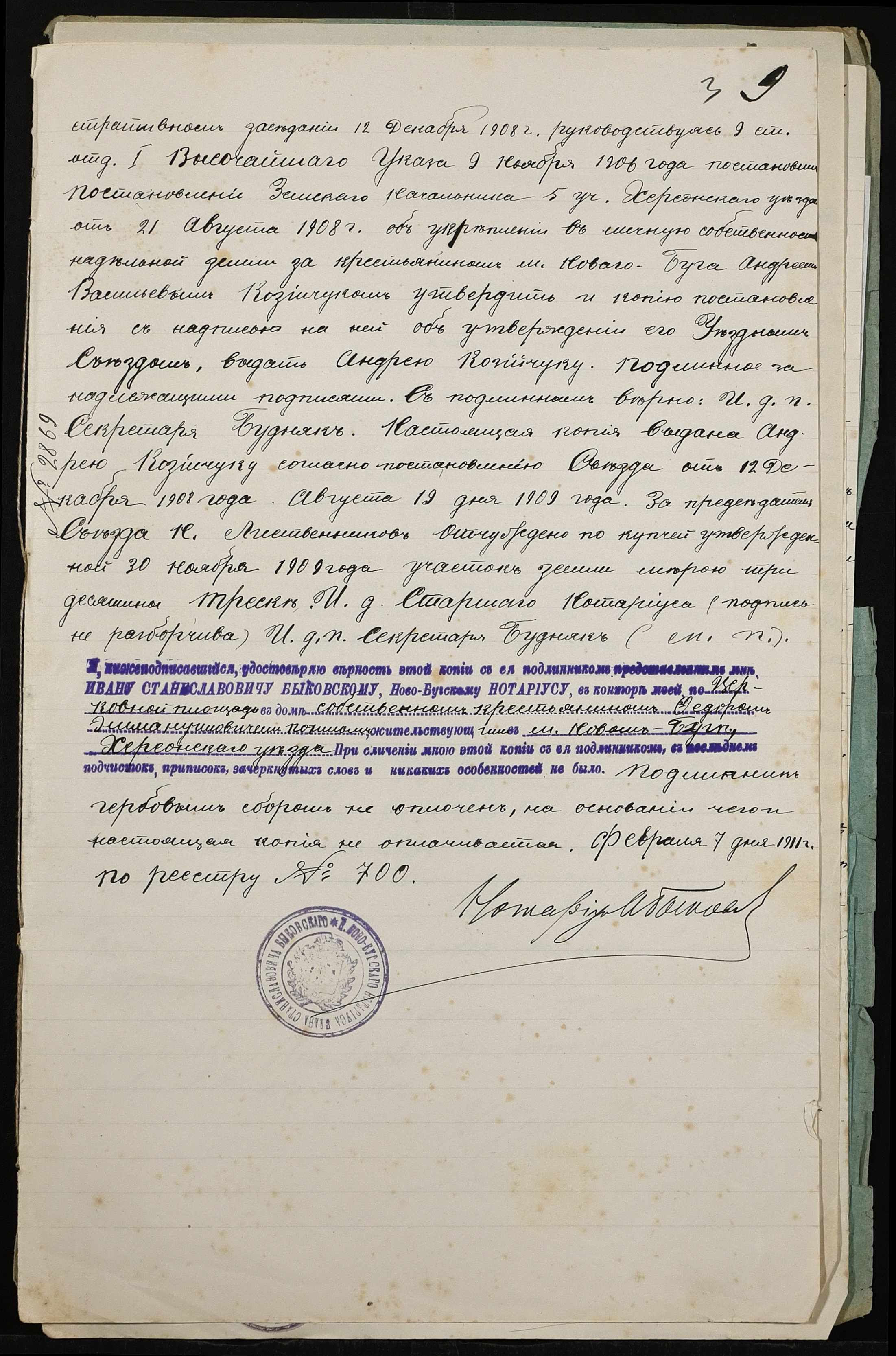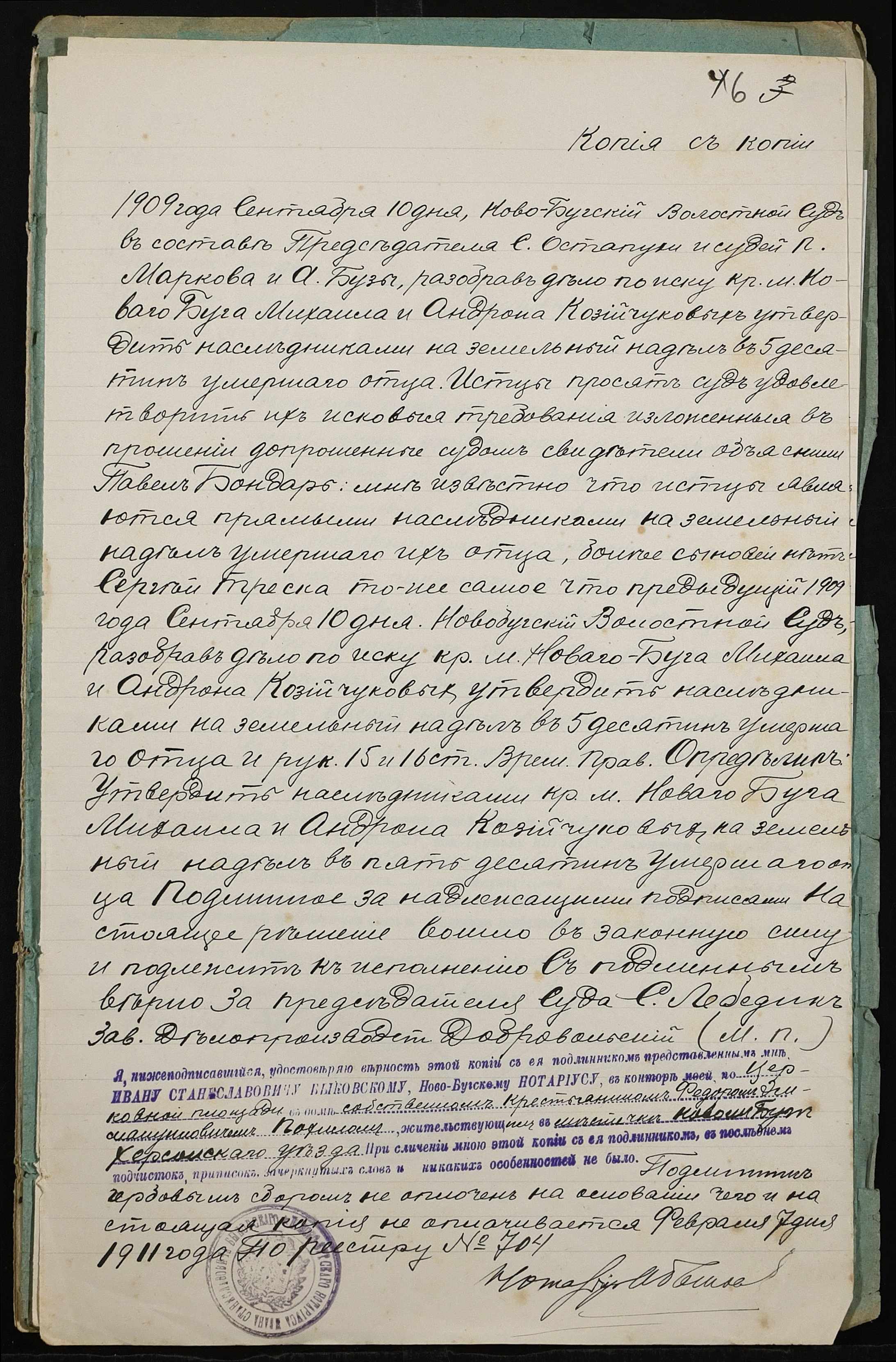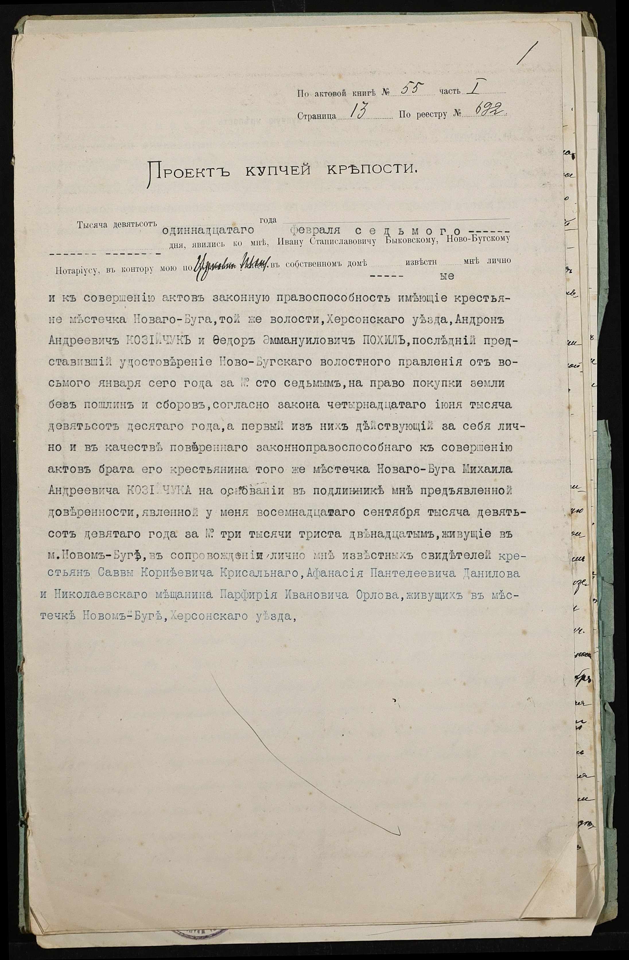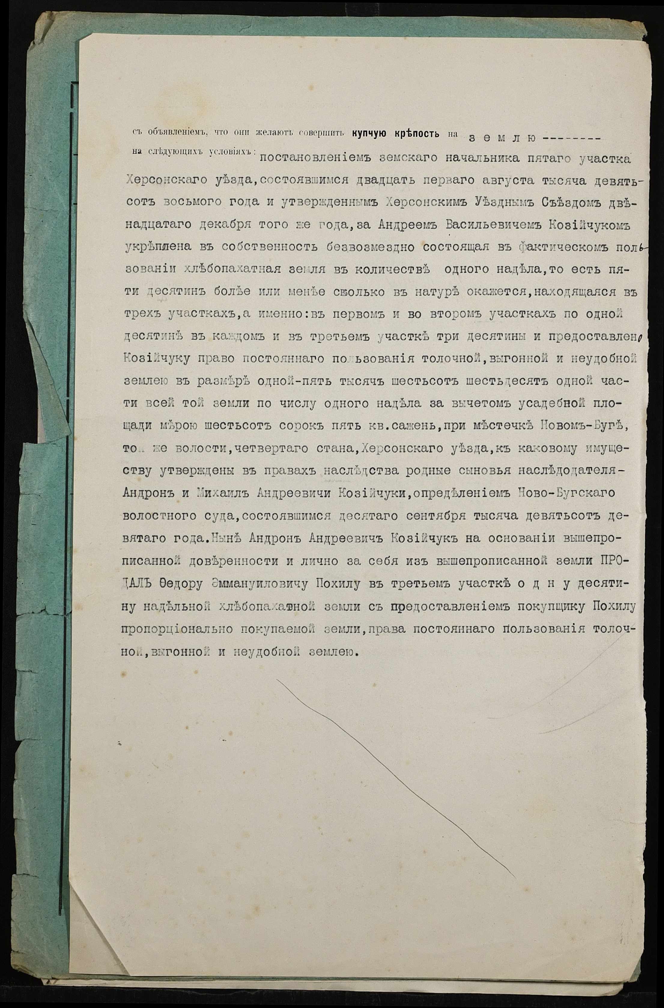 • • • • Справа № 403 “Справа про вчинення купчої про продаж землі селянином Козійчуком (Козийчуком) Андроном Андрійовичем (Андреевичем) на користь селянина Похила Федора Еммануїловича (Эммануиловича)”