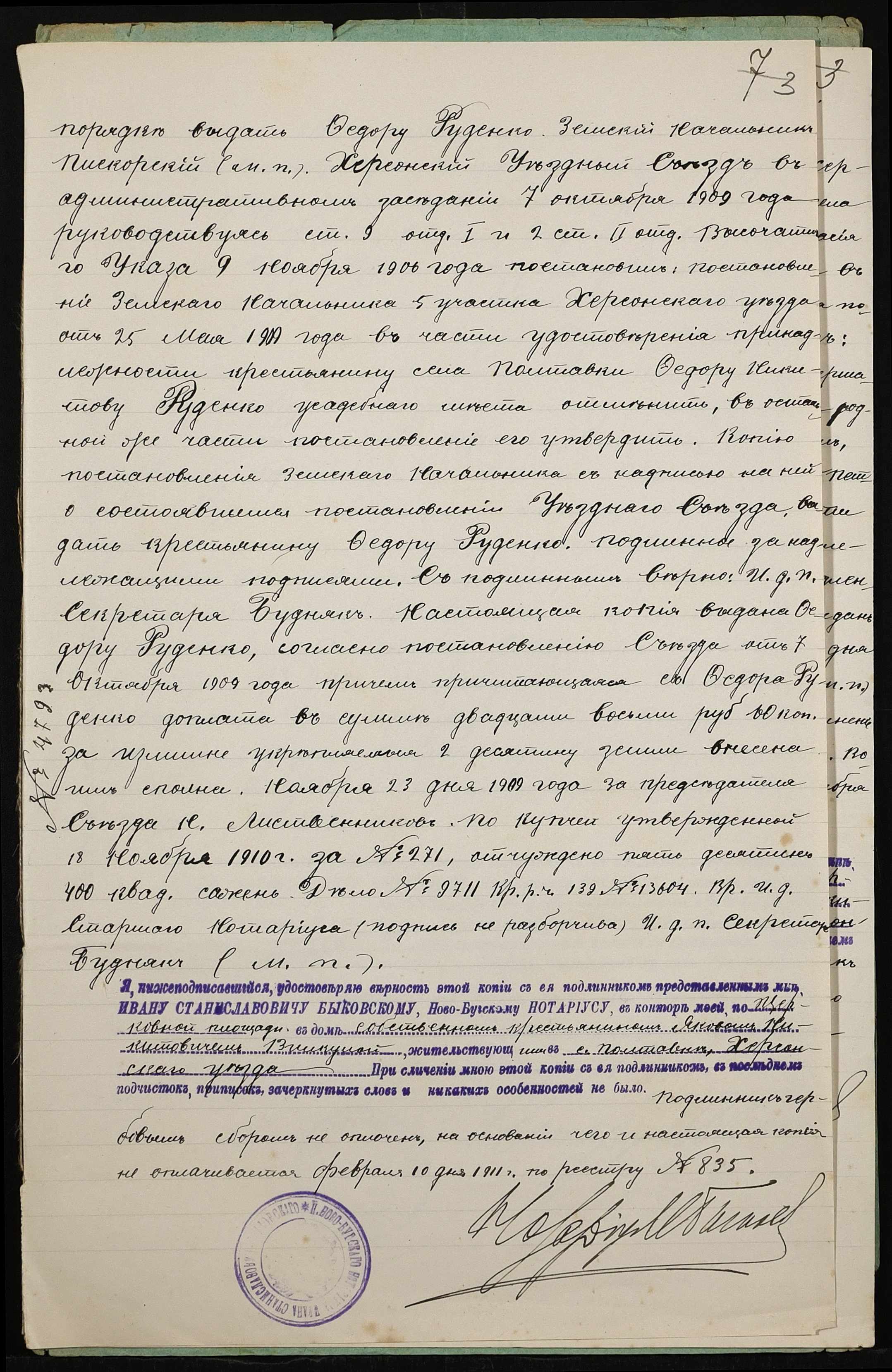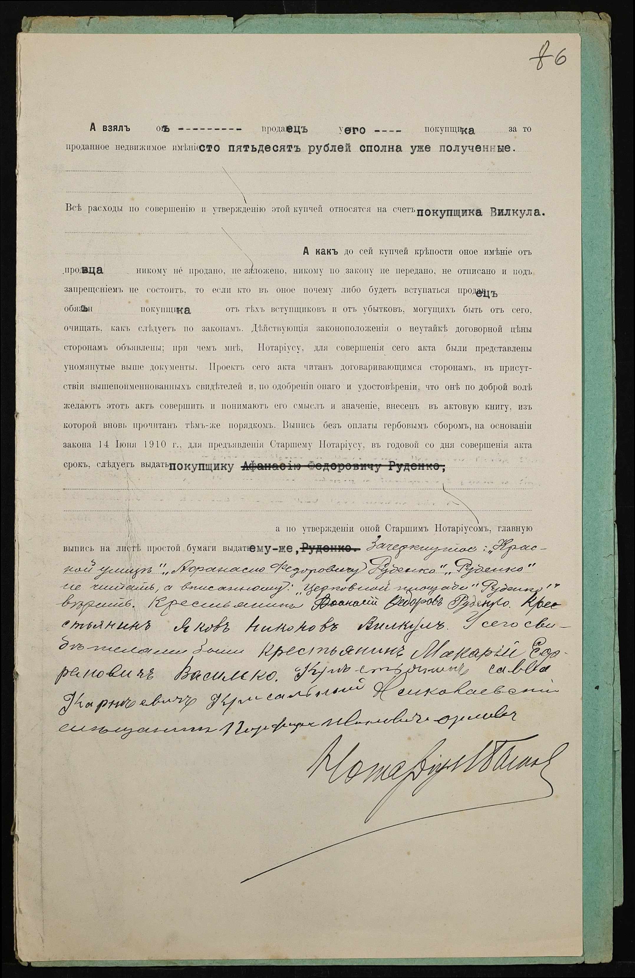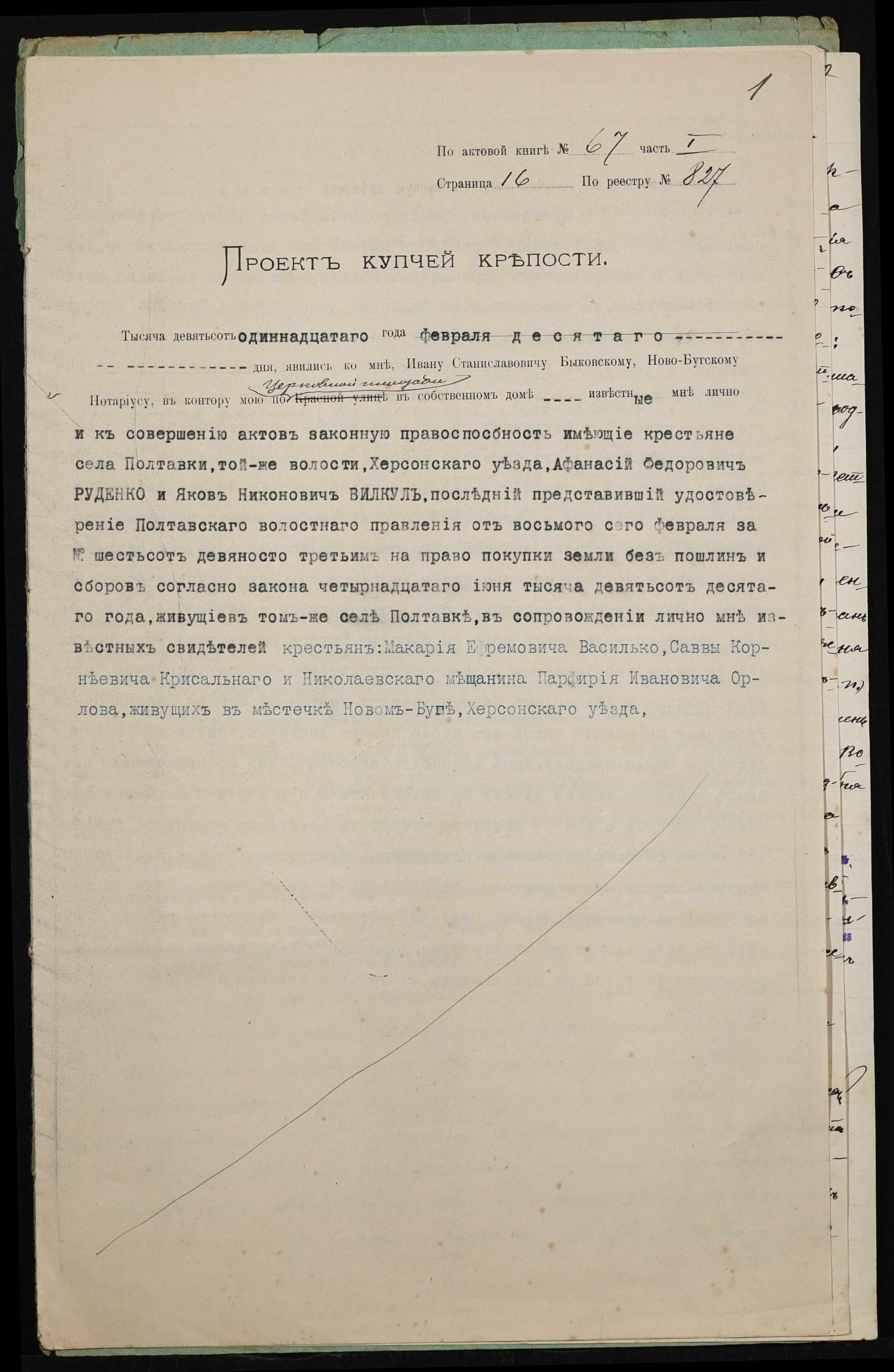 • • • • Справа № 416 “Справа про вчинення купчої про продаж землі селянином Руденком Опанасом (Руденко Афанасием) Федоровичем на користь селянина Вілкула (Вилкула) Якова Никоновича”