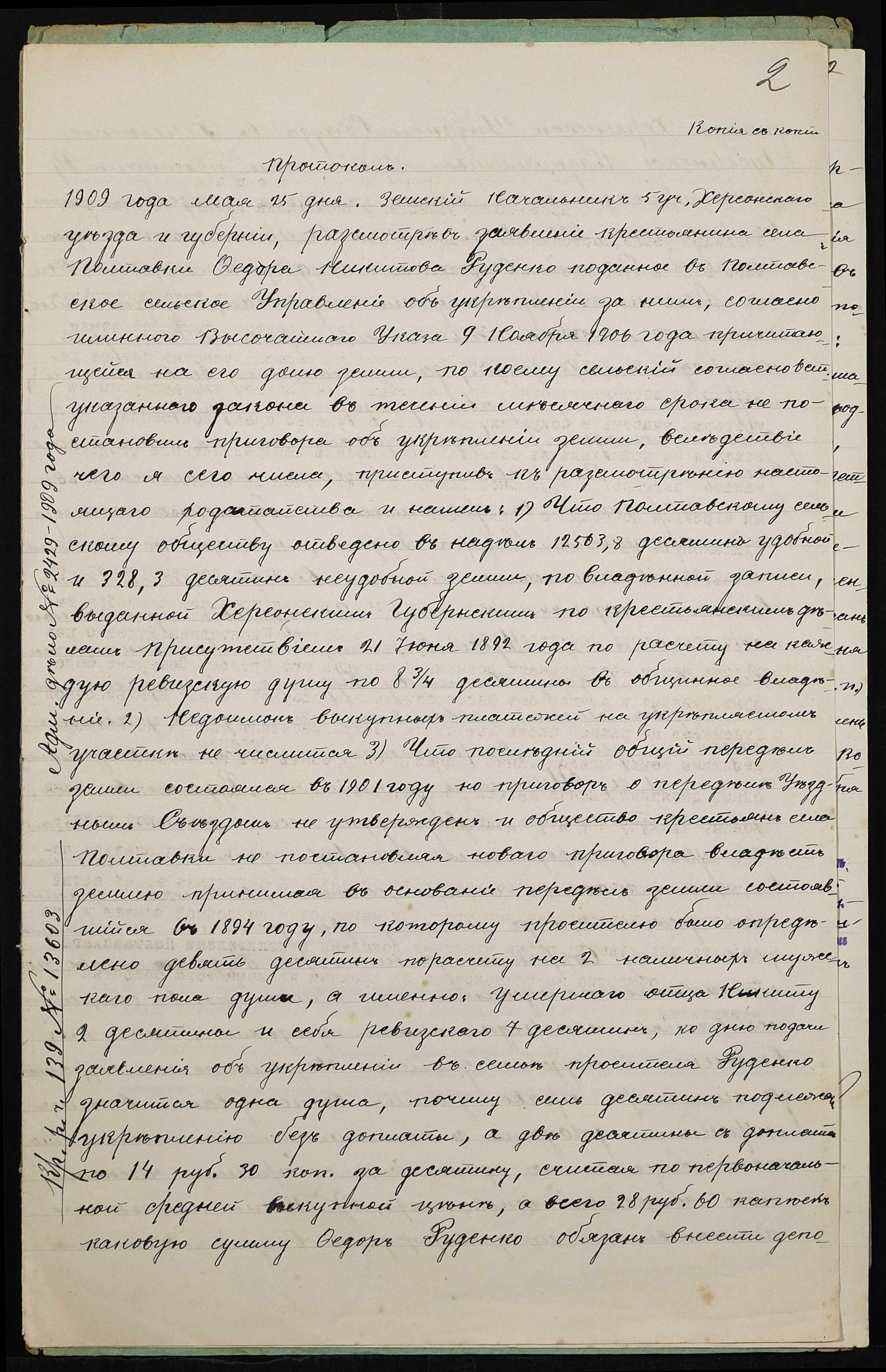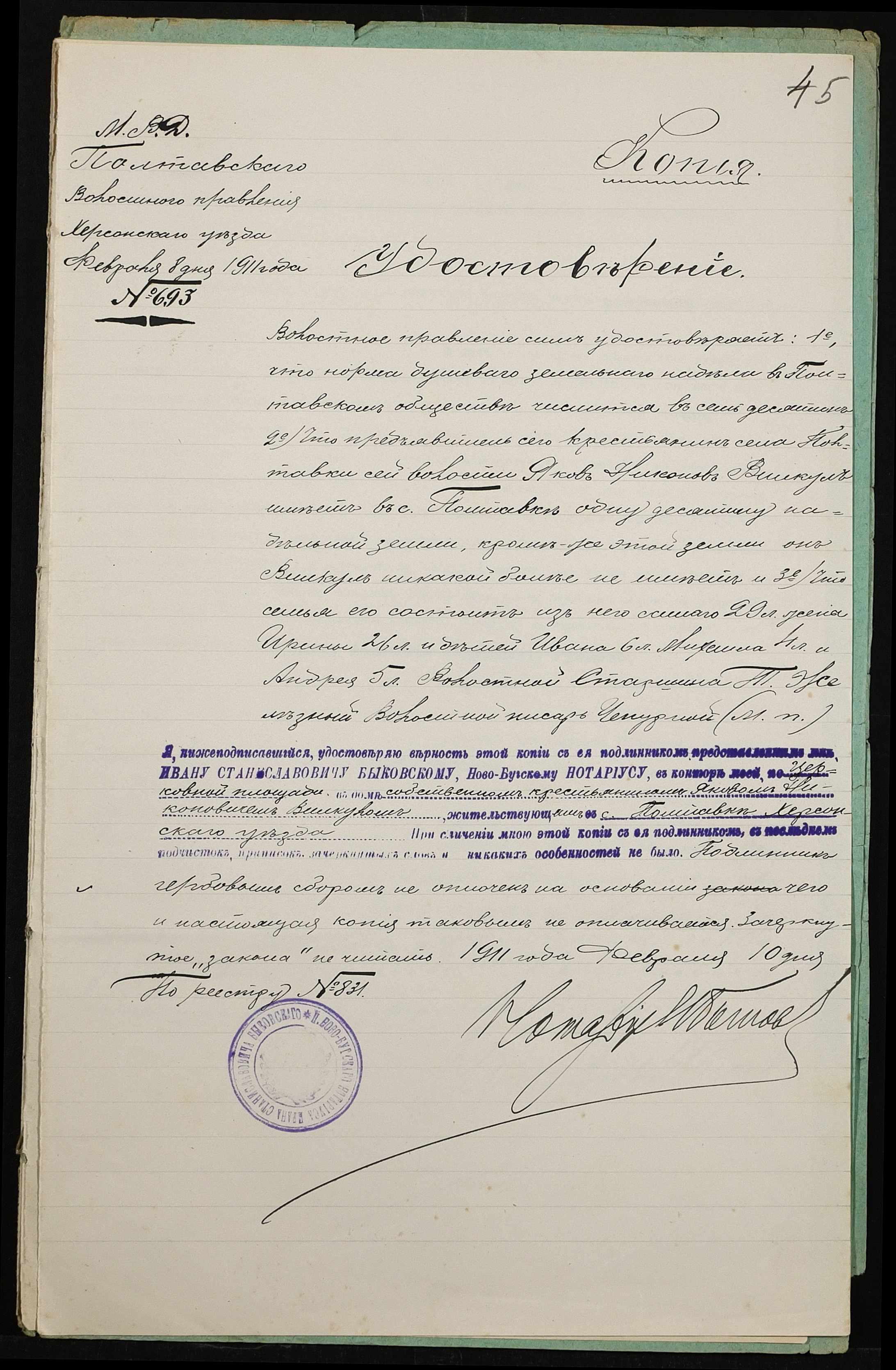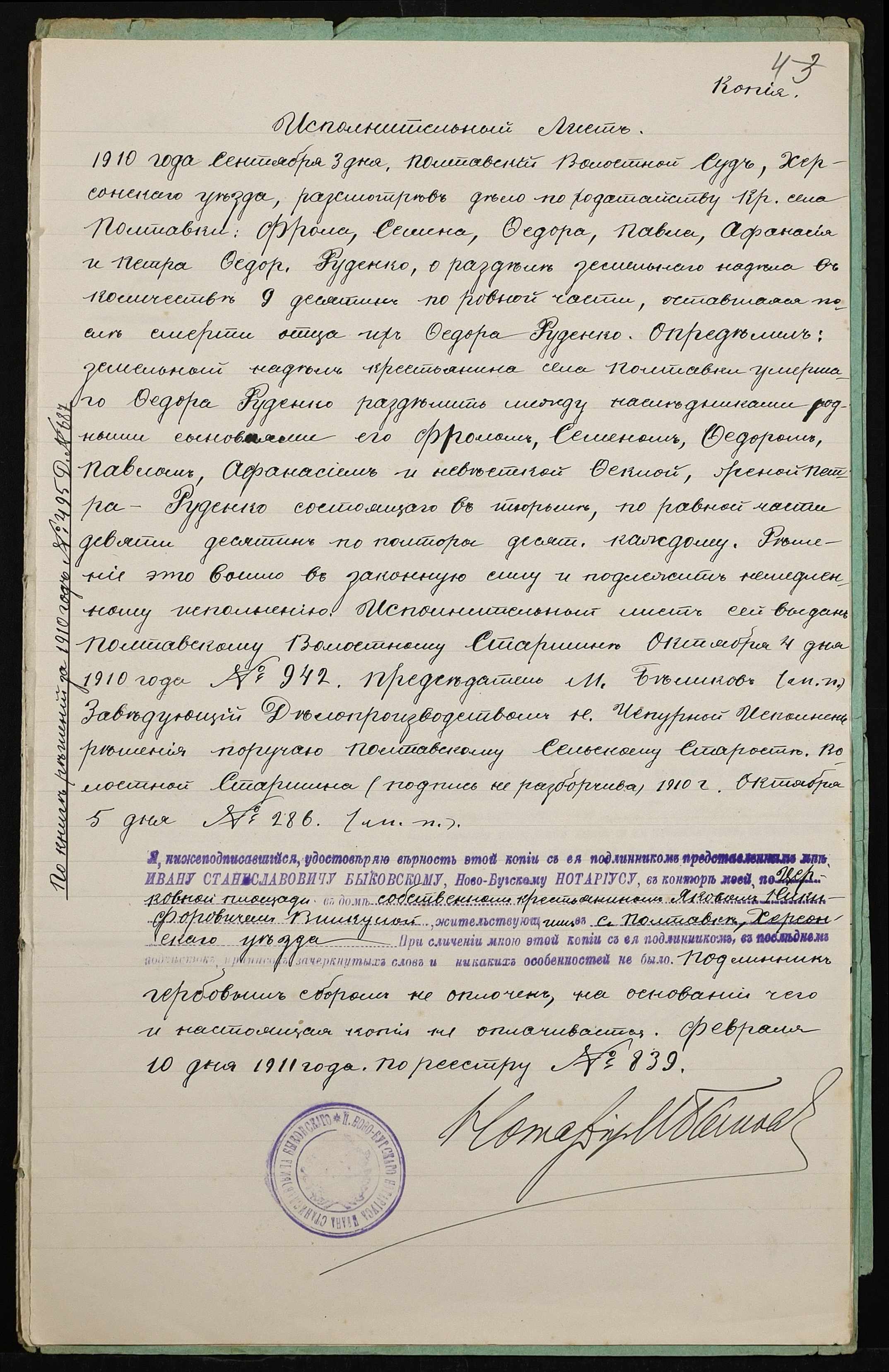 • • • • Справа № 416 “Справа про вчинення купчої про продаж землі селянином Руденком Опанасом (Руденко Афанасием) Федоровичем на користь селянина Вілкула (Вилкула) Якова Никоновича”
