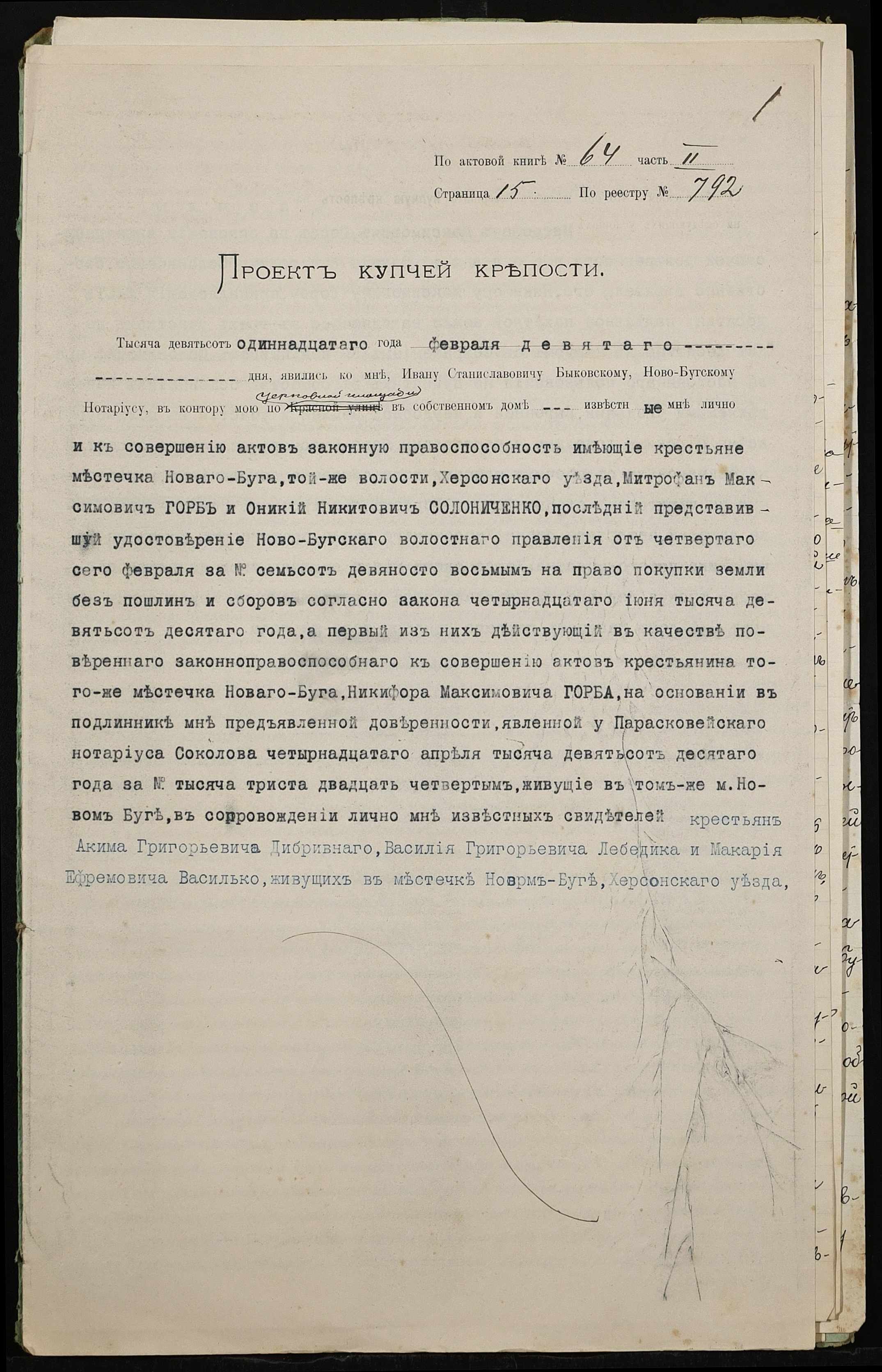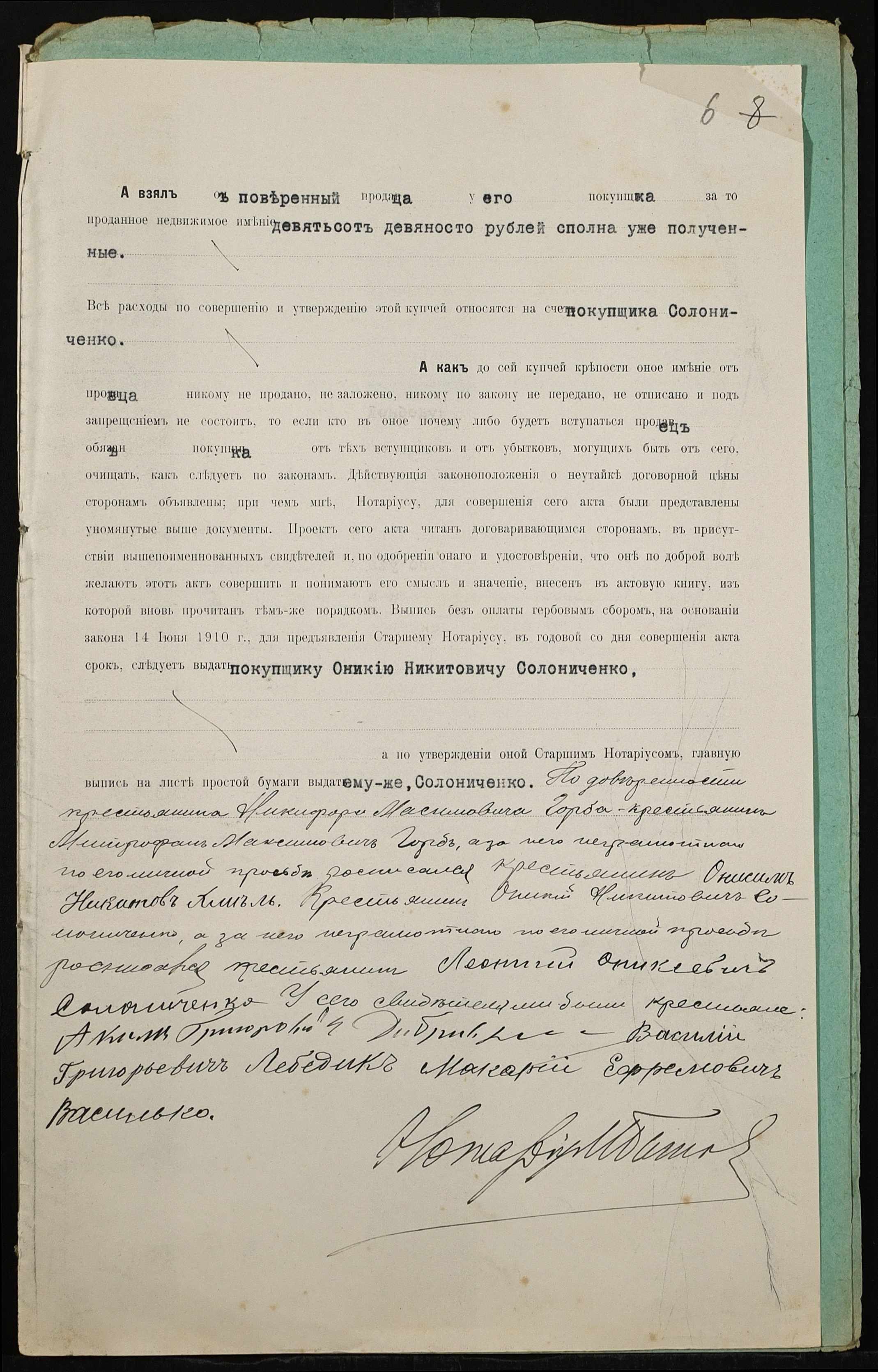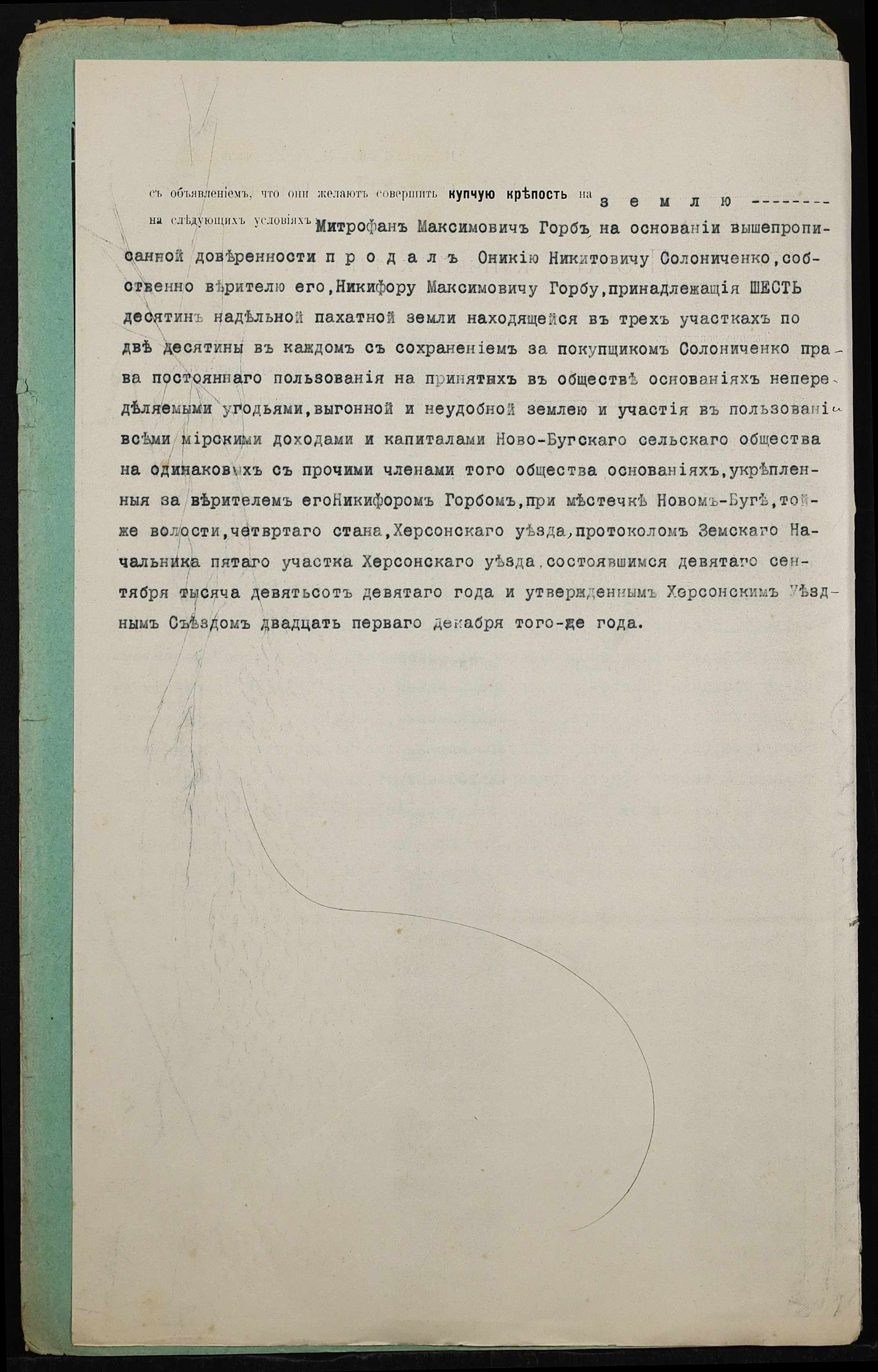 • • • • Справа № 419 “Справа про вчинення купчої про продаж землі селянином Горбом Никифором Максимовичем на користь селянина Солониченка Оникія Микитовича (Солониченко Аникия Никитовича)”