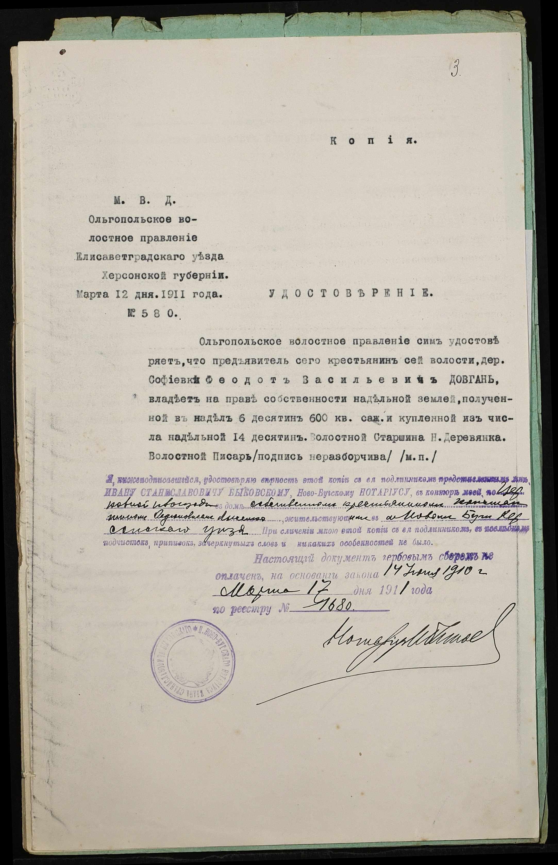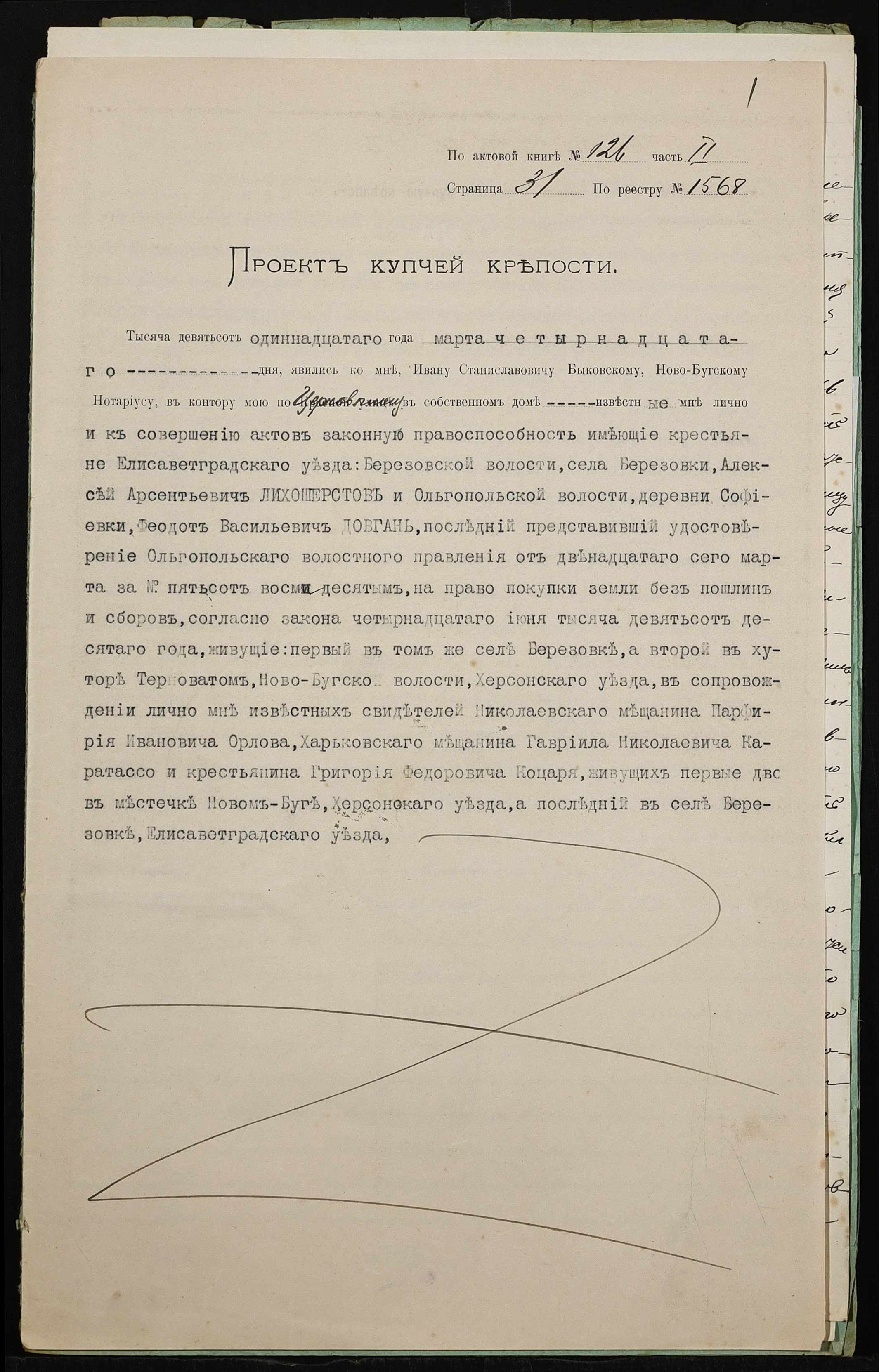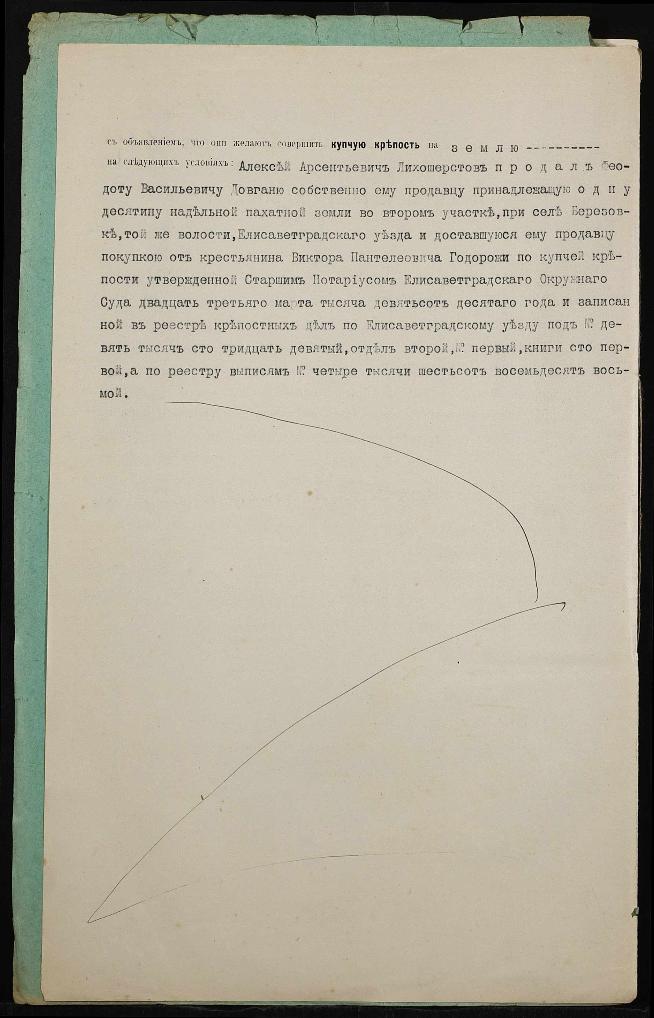 • • • • Справа № 430 “Справа про вчинення купчої про продаж землі селянином Лихошерстовим Олексієм Арсентійовичем (Лихошерстовым Алексеем Арсентьевичем) на користь селянина Довганя Федота Васильовича (Васильевича)”