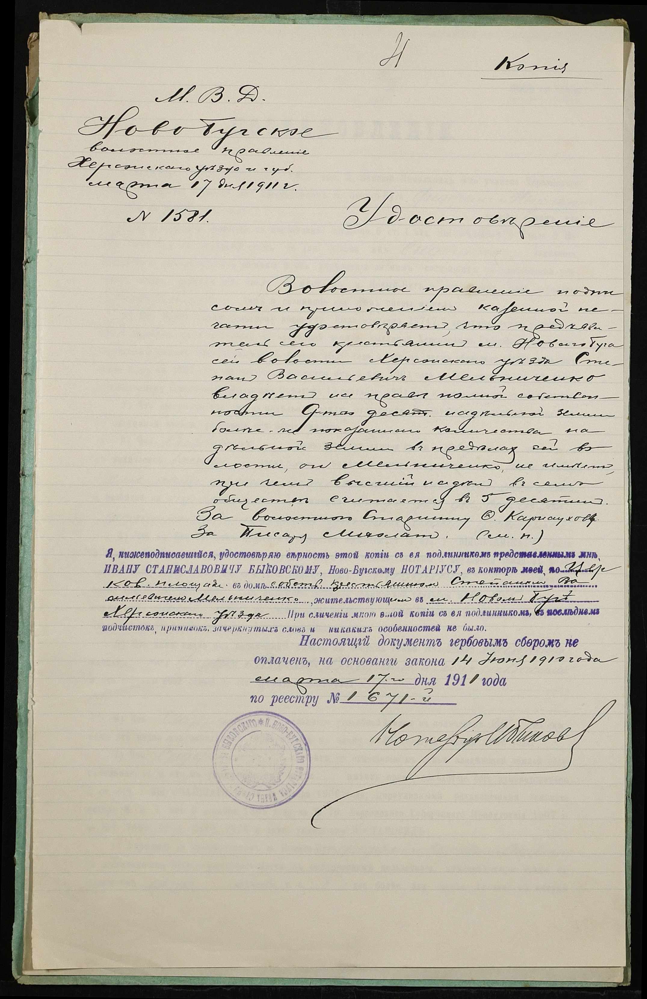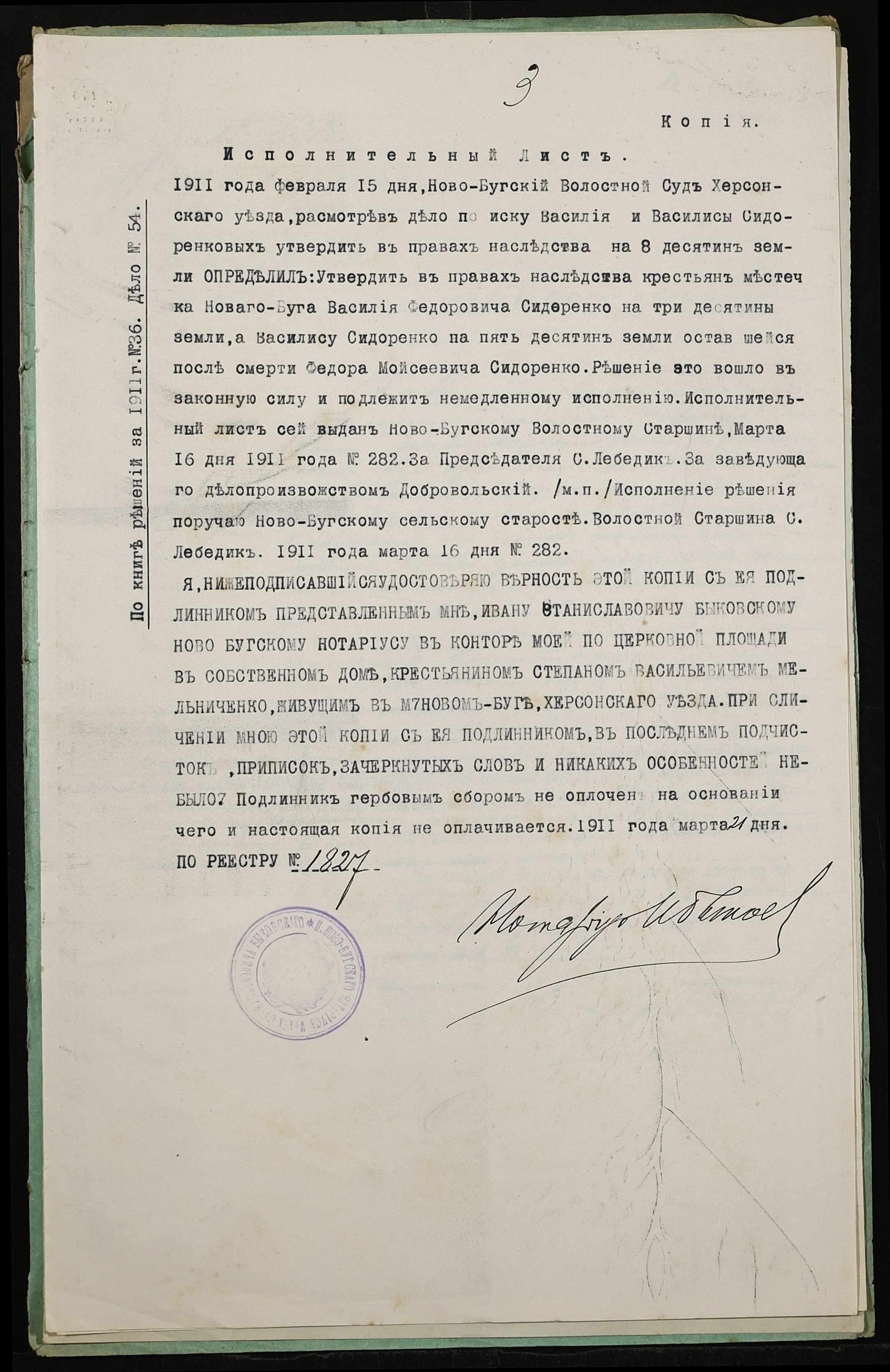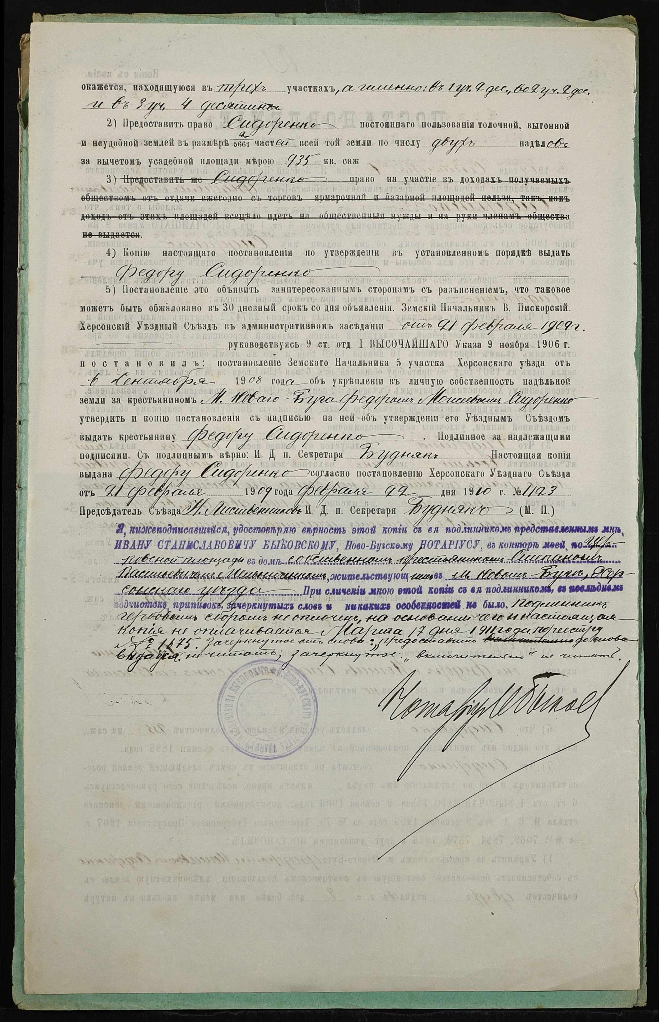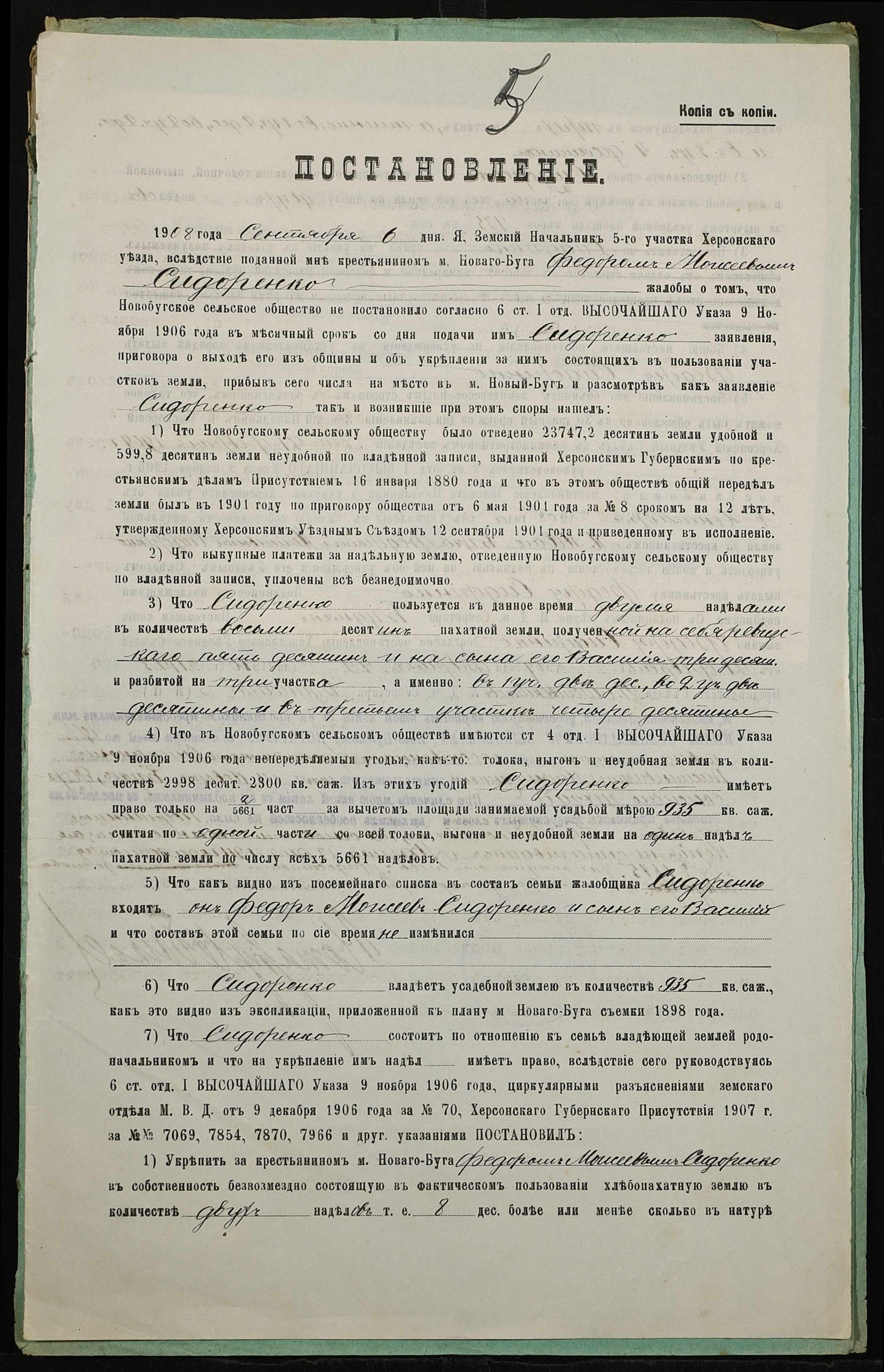 • • • • Справа № 433 “Справа про вчинення купчої про продаж землі селянином Сидоренком Василем (Сидоренко Василием) Федоровичем на користь селянина Мельниченка (Мельниченко) Степана Васильовича (Васильевича)”