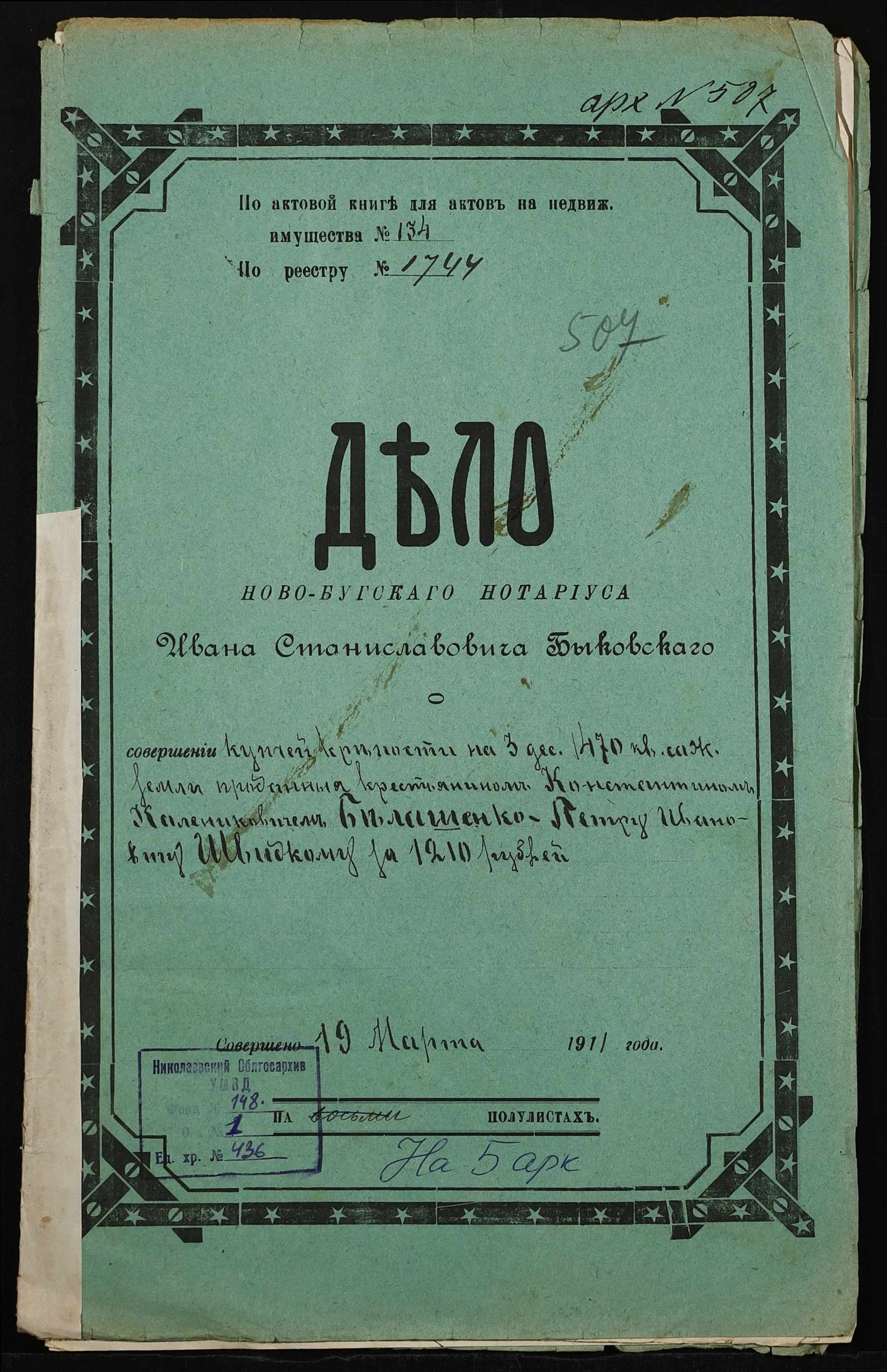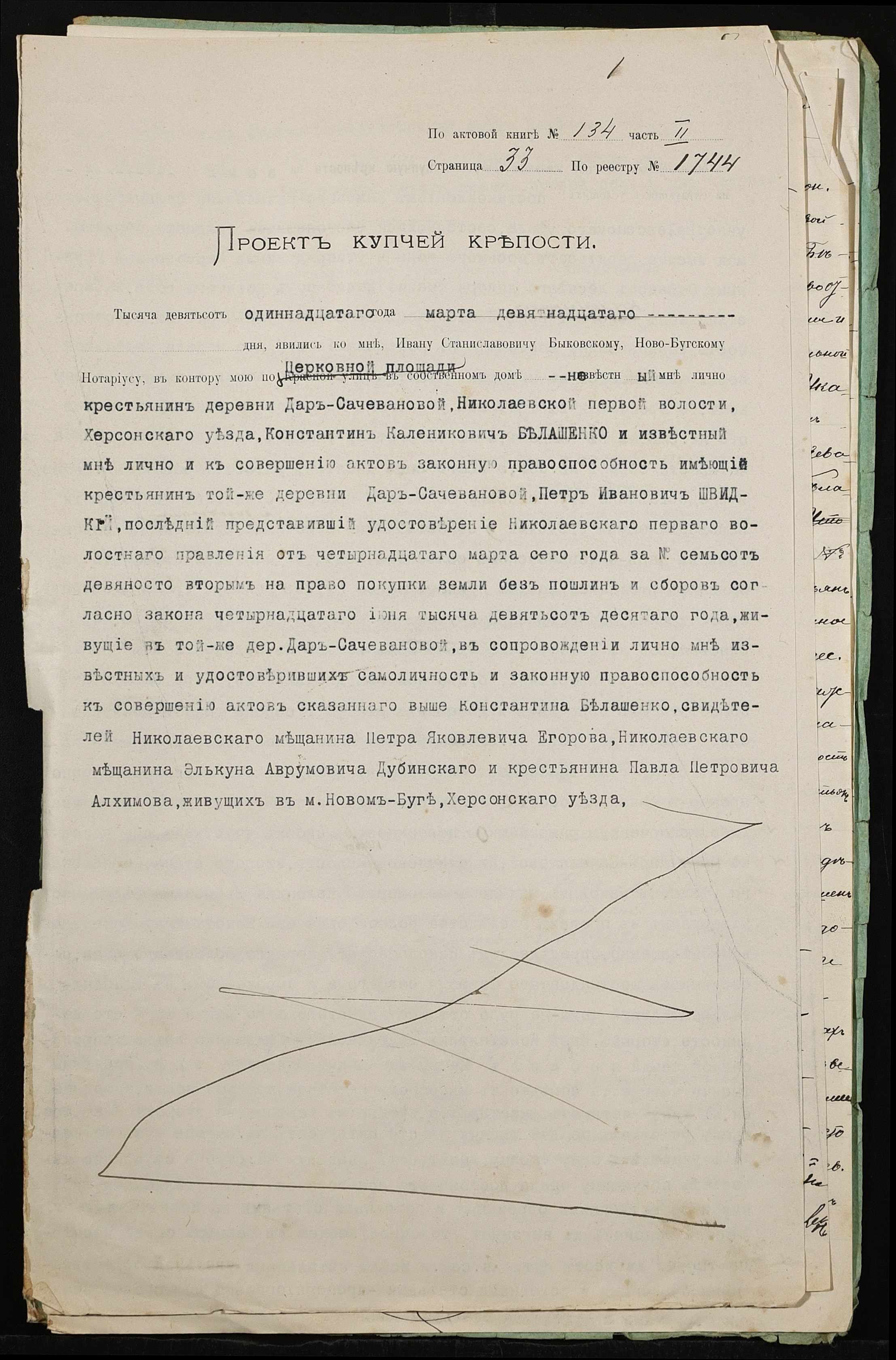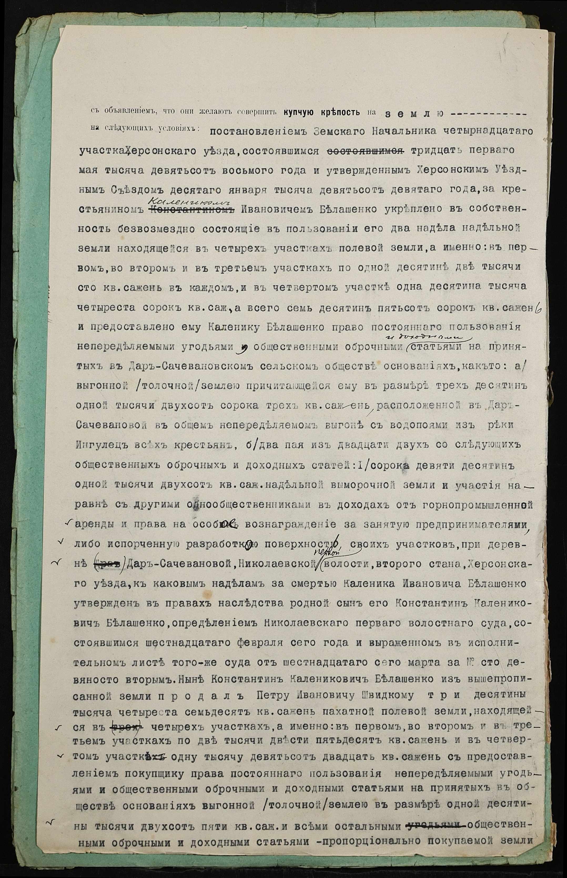• • • • Справа № 436 “Справа про вчинення купчої про продаж землі селянином Бєлошенком Костянтином (Белошенко Константином) Калиновичем на користь селянина Швидкого Петра Івановича (Швыдкого Петра Ивановича)”