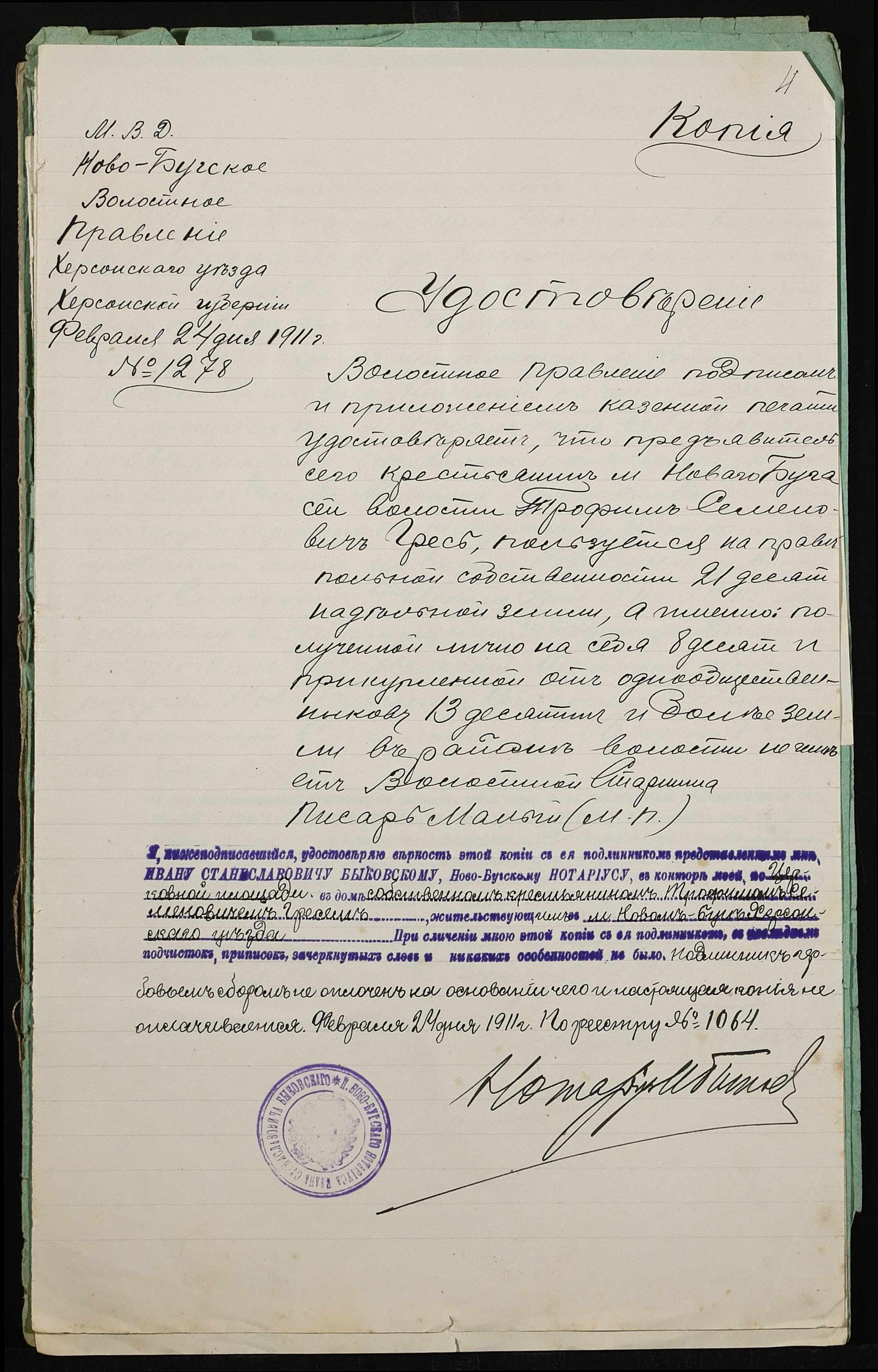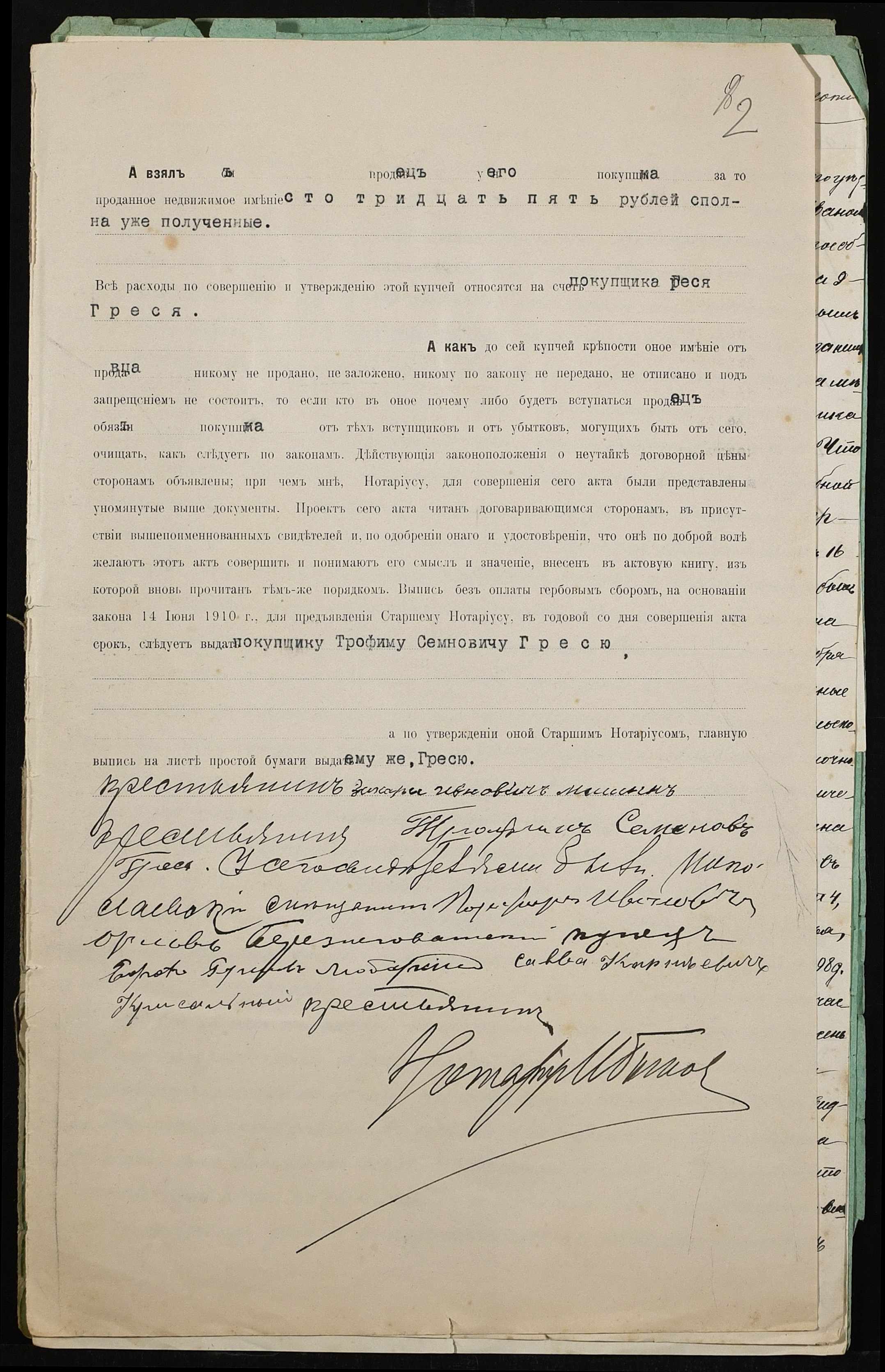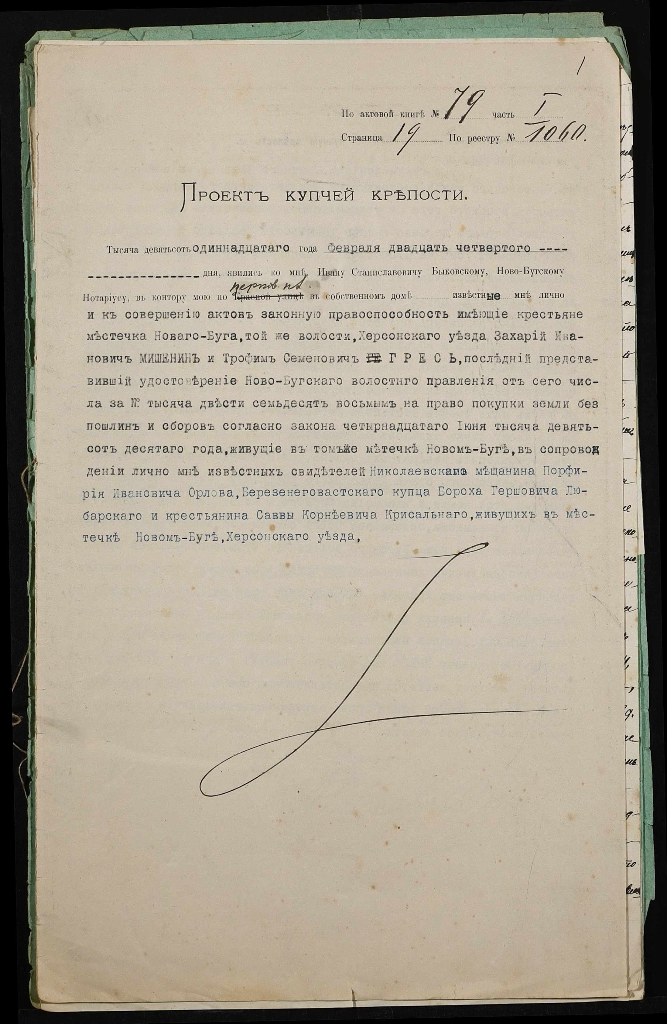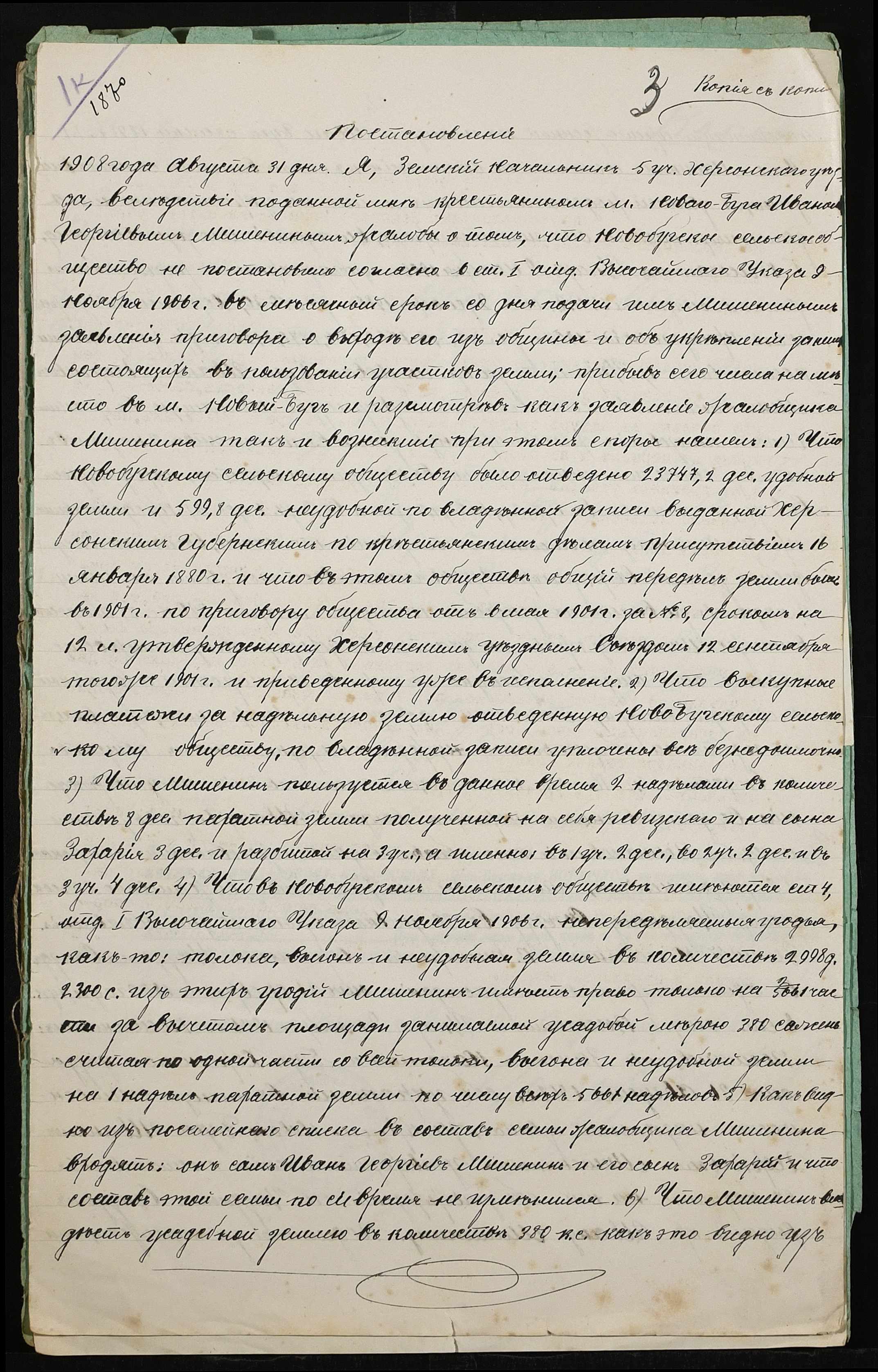 • • • • Справа № 438 “Справа про вчинення купчої про продаж землі селянином Мішеніним Захарієм Івановичем (Мишениным Захарием Ивановичем) на користь селянина Греся Трохима (Трофима) Семеновича”