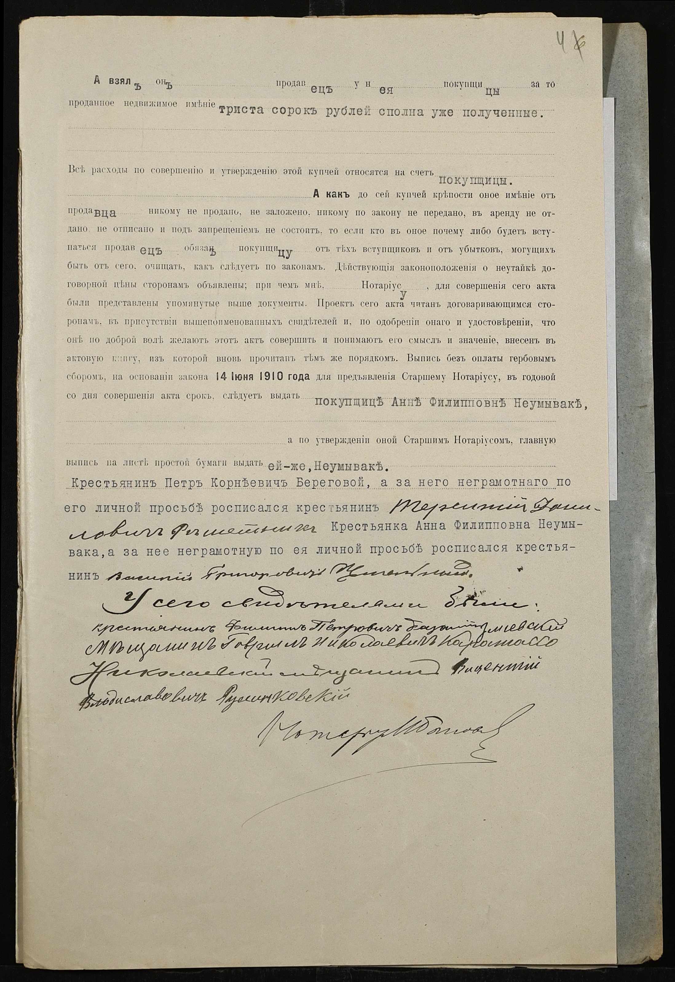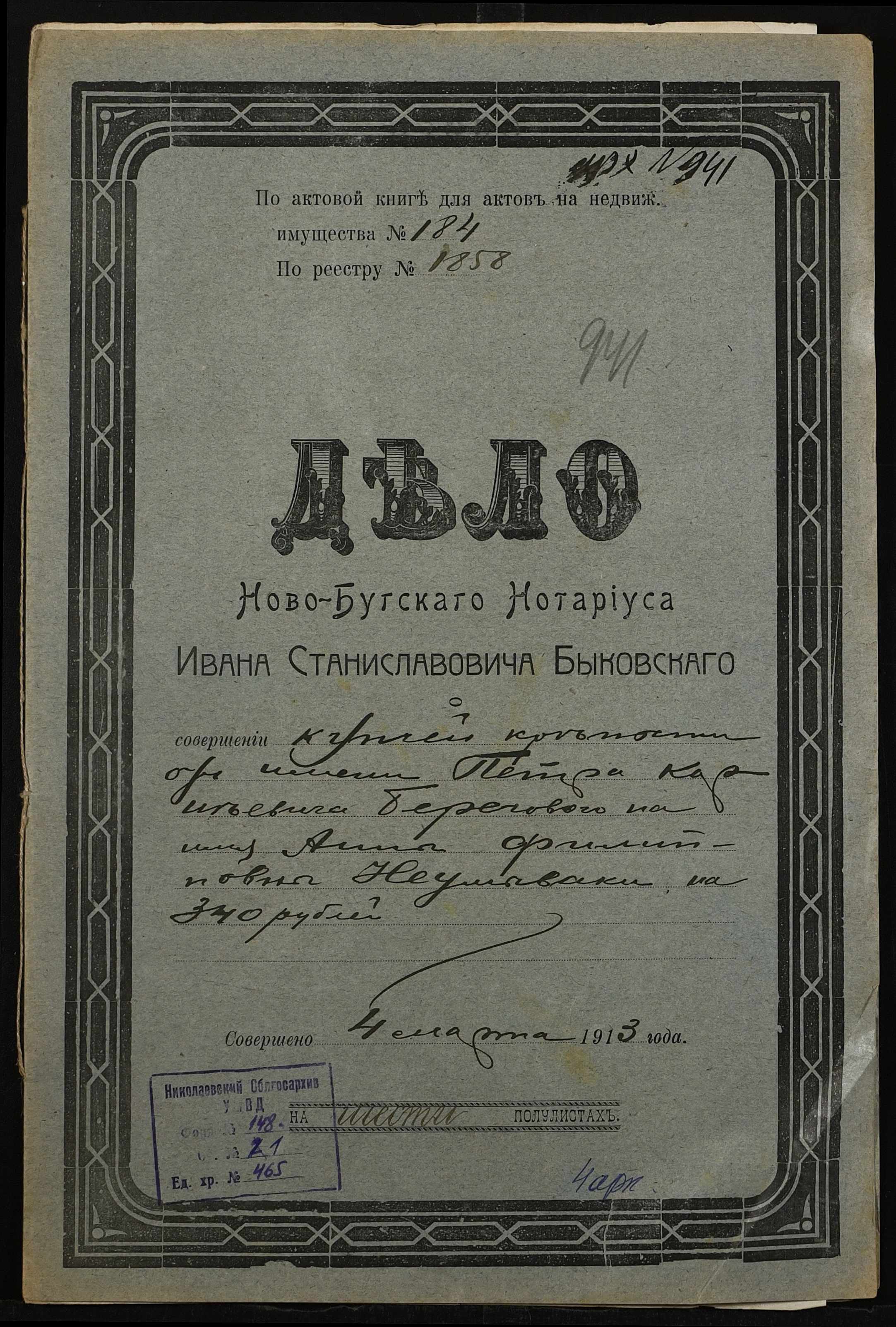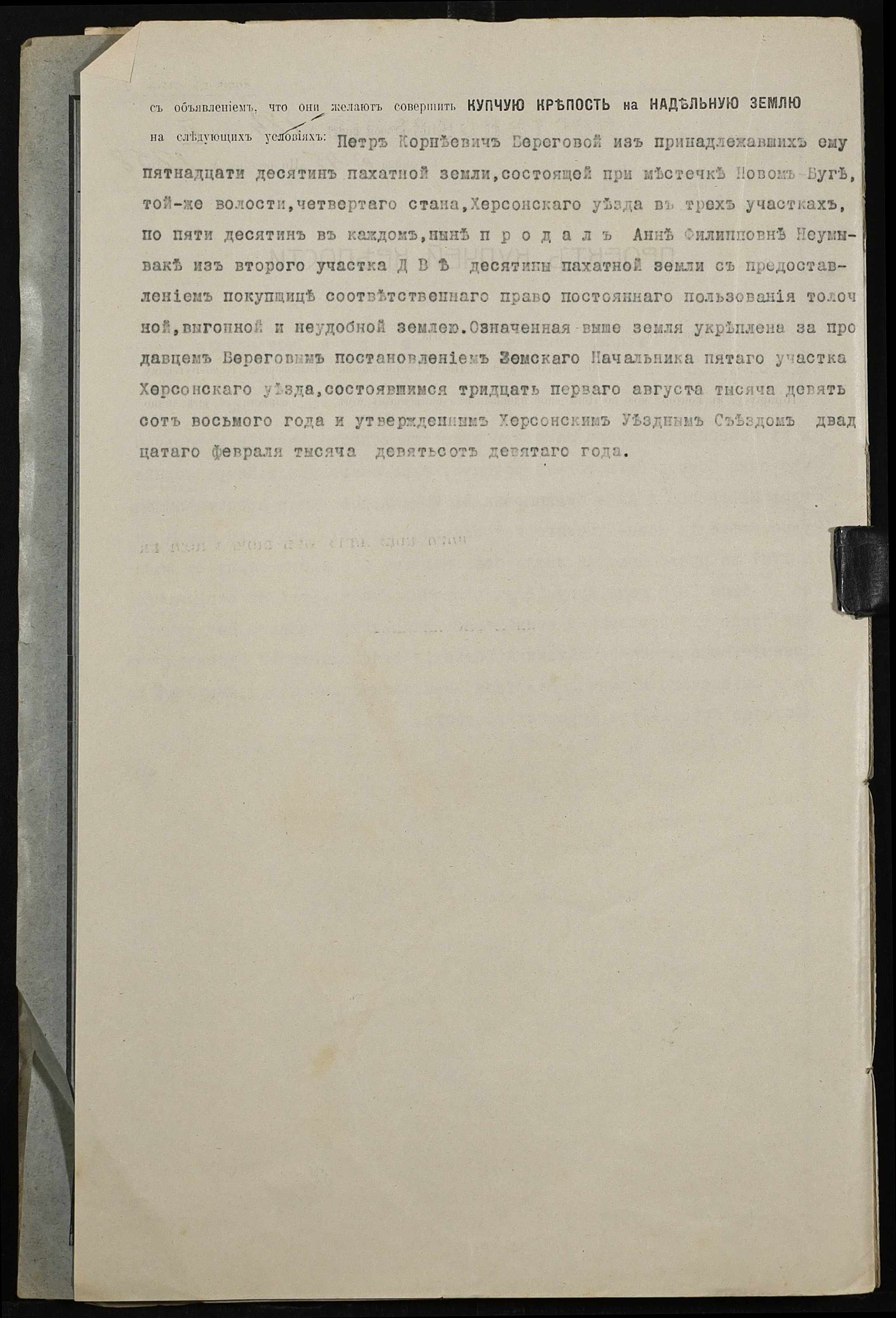 • • • • Справа № 465 “Справа про вчинення купчої про продаж землі селянином Береговим (Береговым) Петром Корнійовичем (Корнеевичем) на користь селянки Неумиваки Ганни Пилипівни (Неумываки Анны Филипповны)”