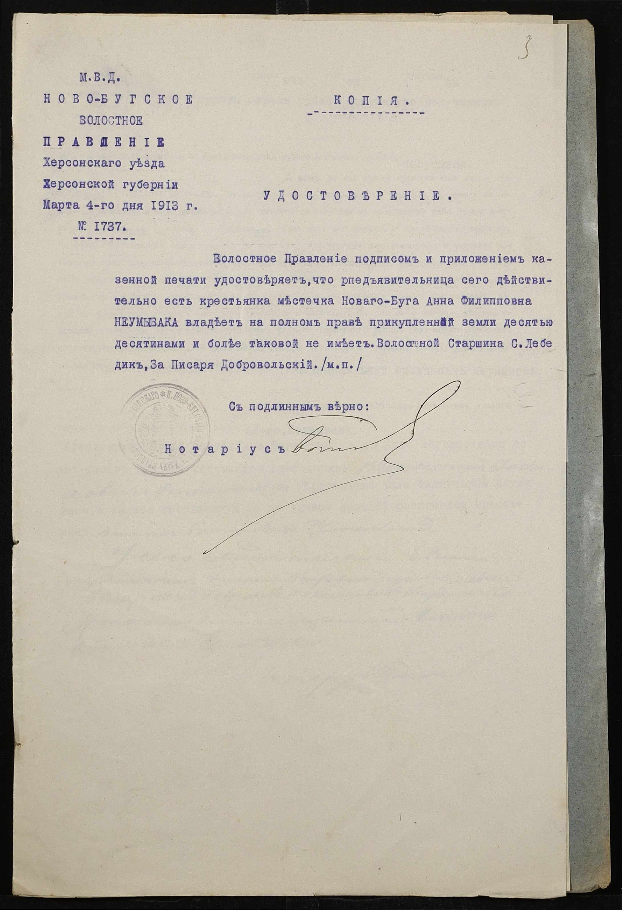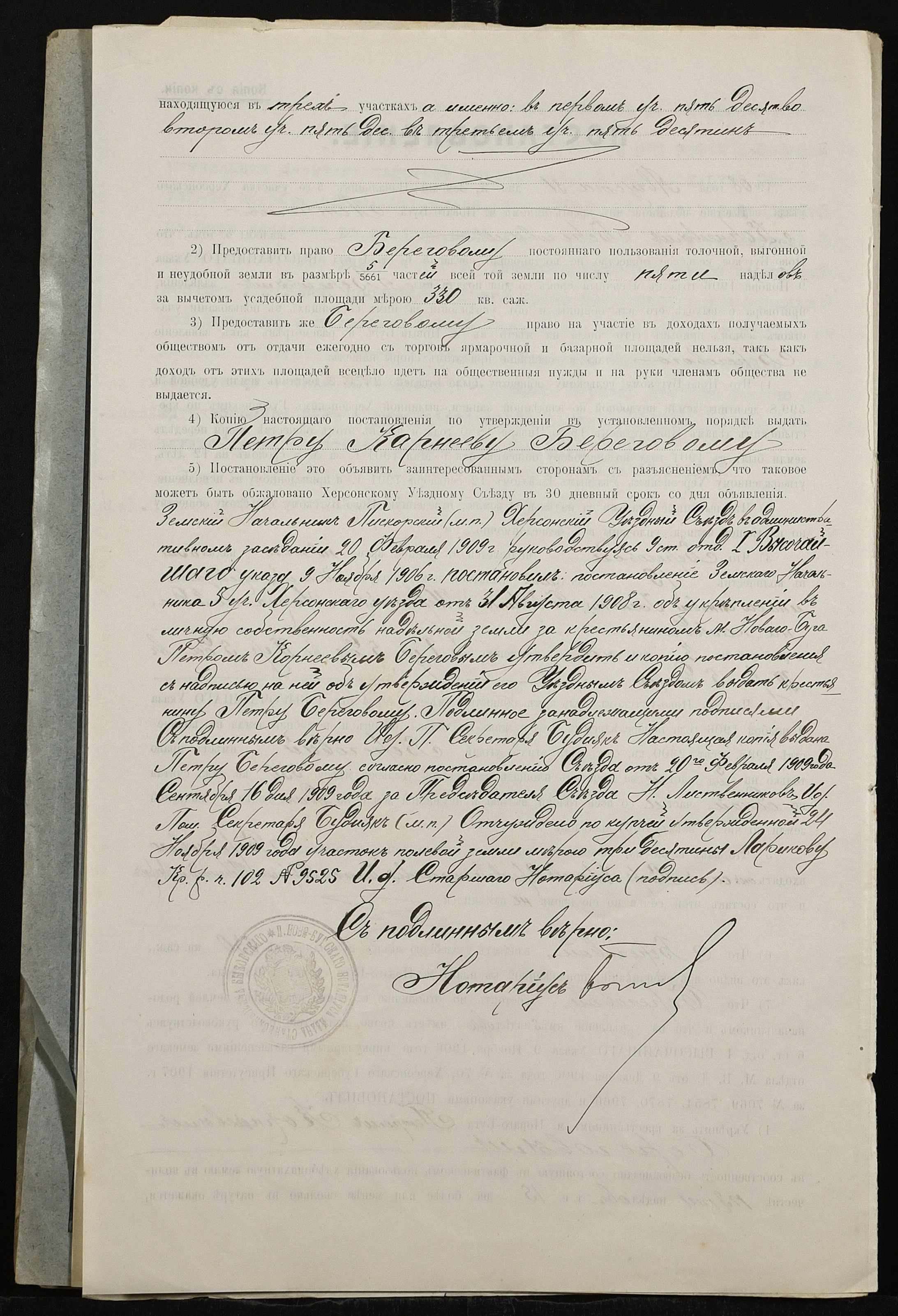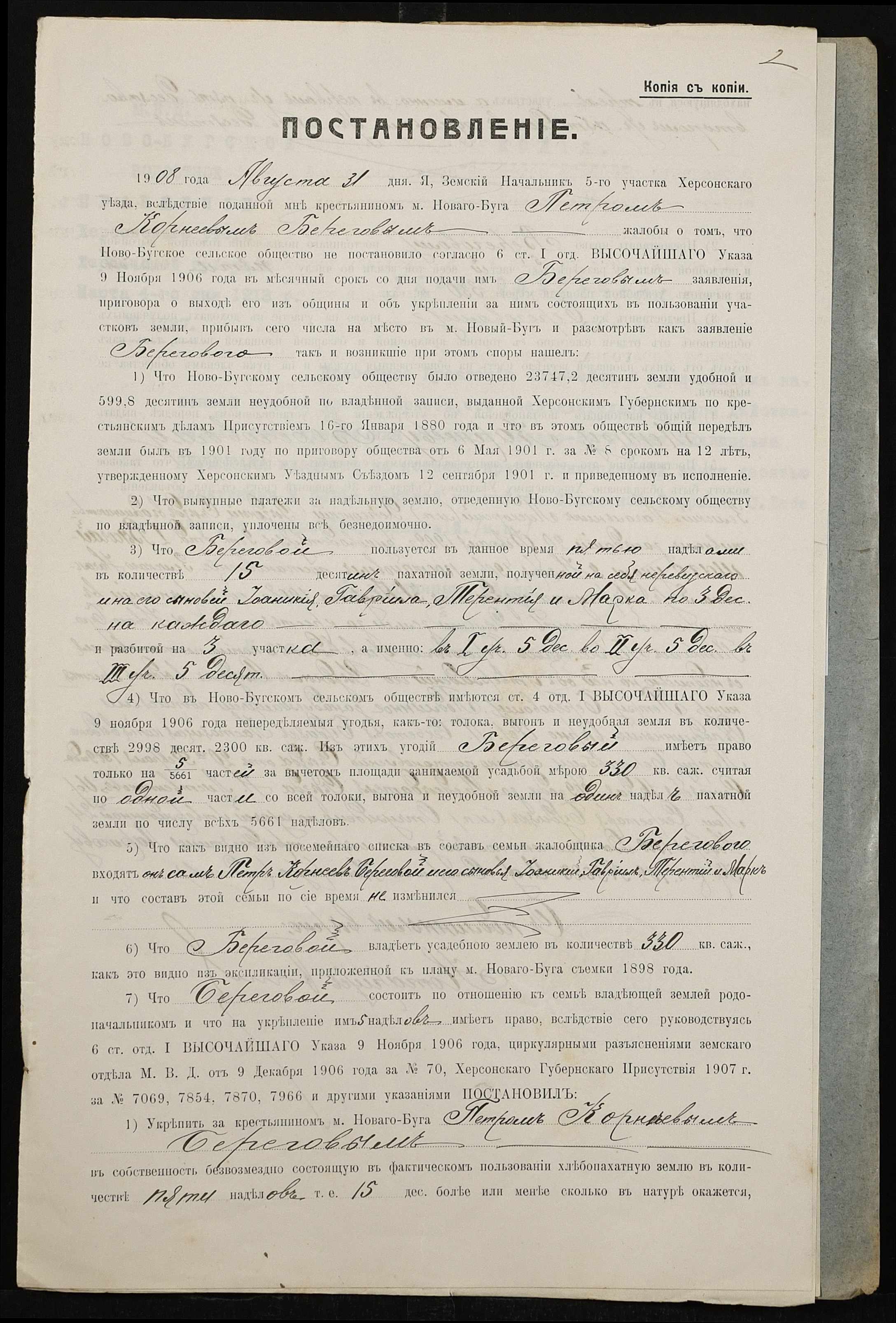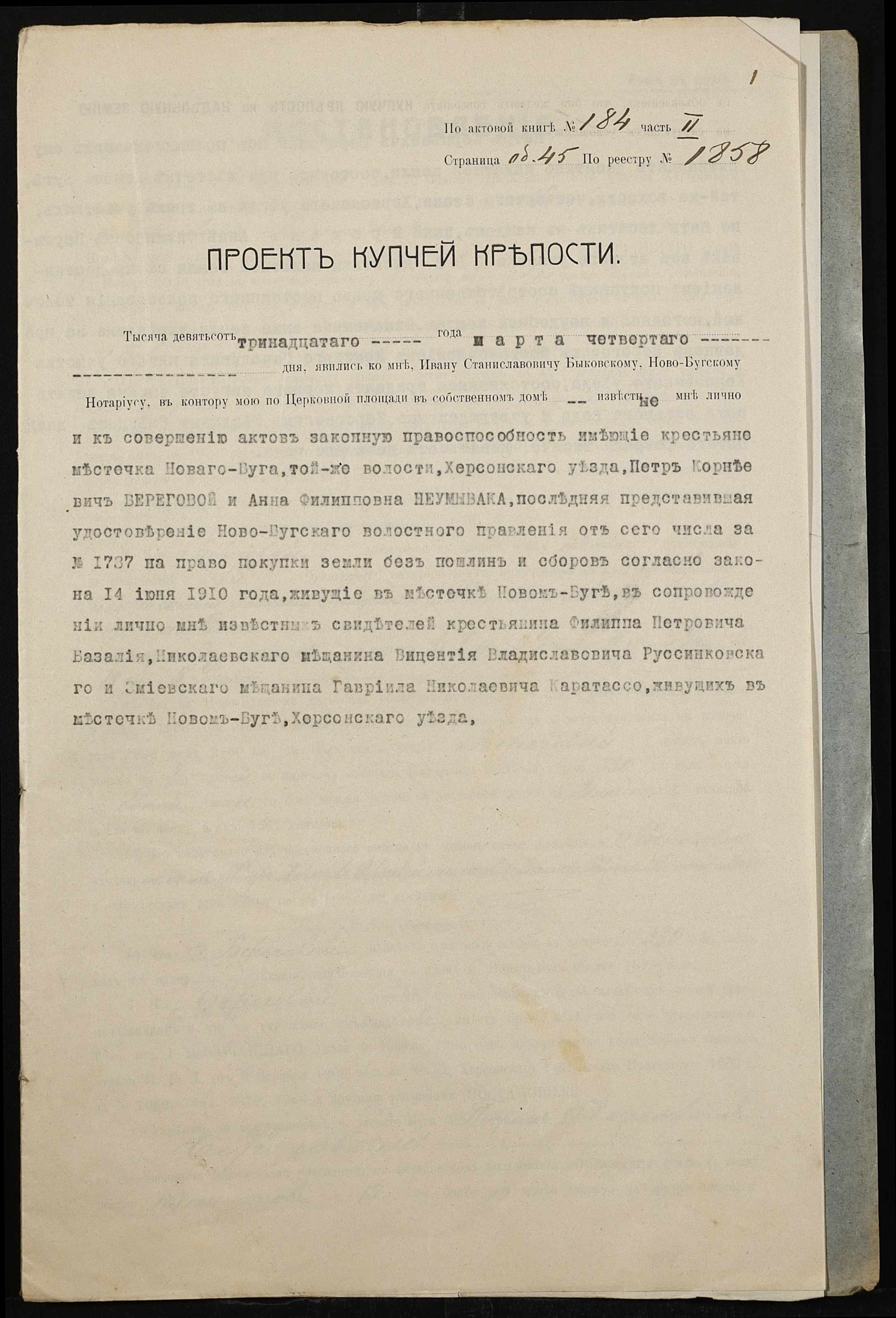 • • • • Справа № 465 “Справа про вчинення купчої про продаж землі селянином Береговим (Береговым) Петром Корнійовичем (Корнеевичем) на користь селянки Неумиваки Ганни Пилипівни (Неумываки Анны Филипповны)”