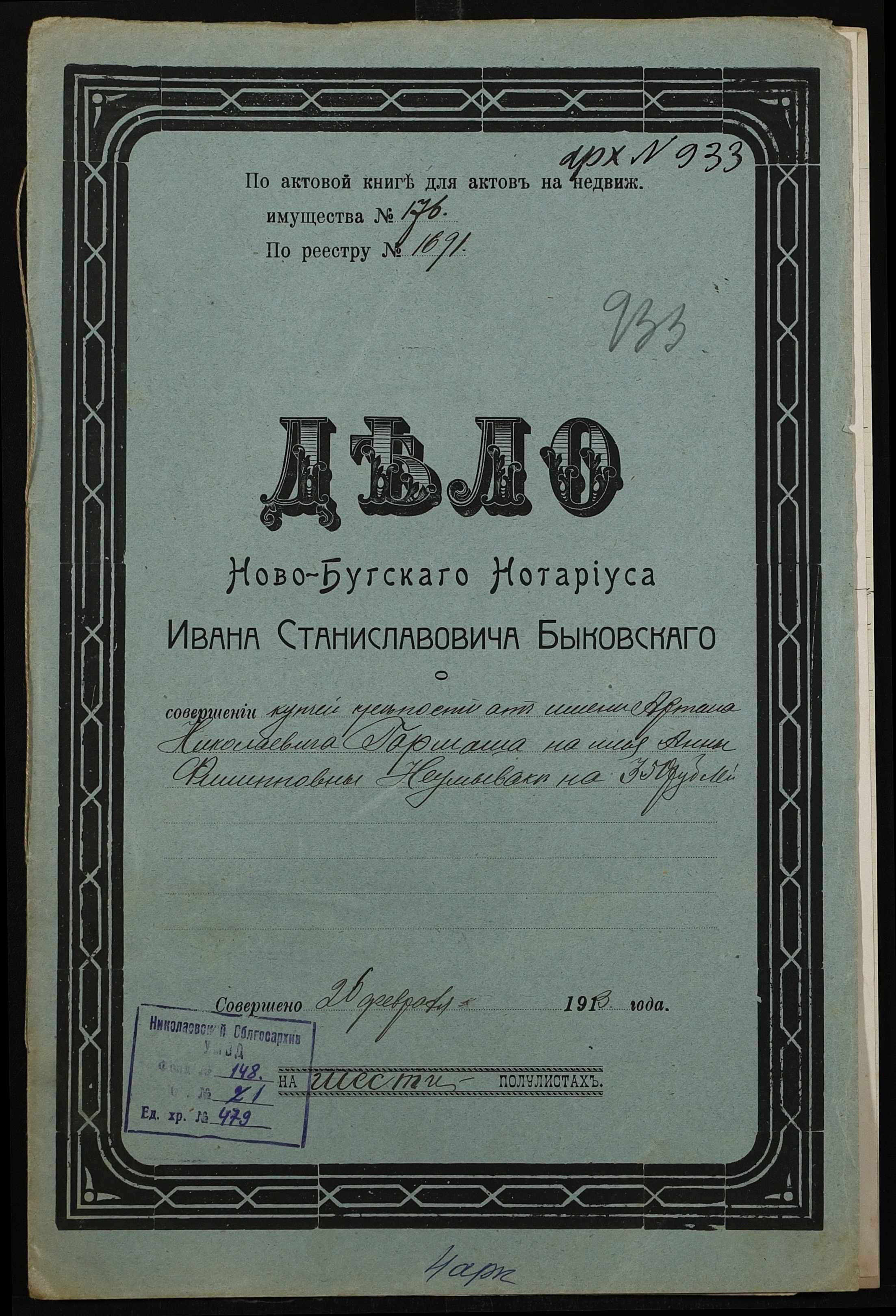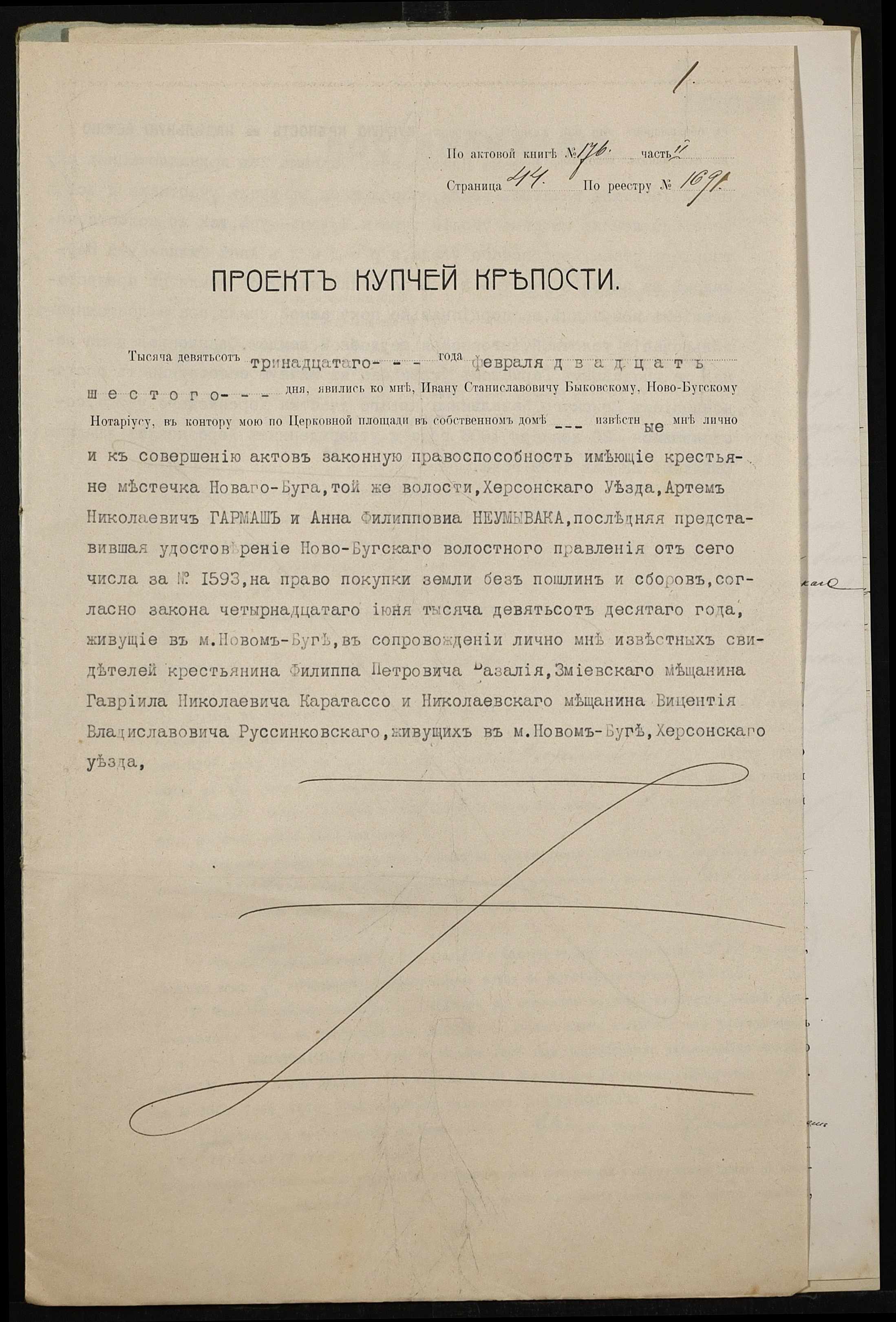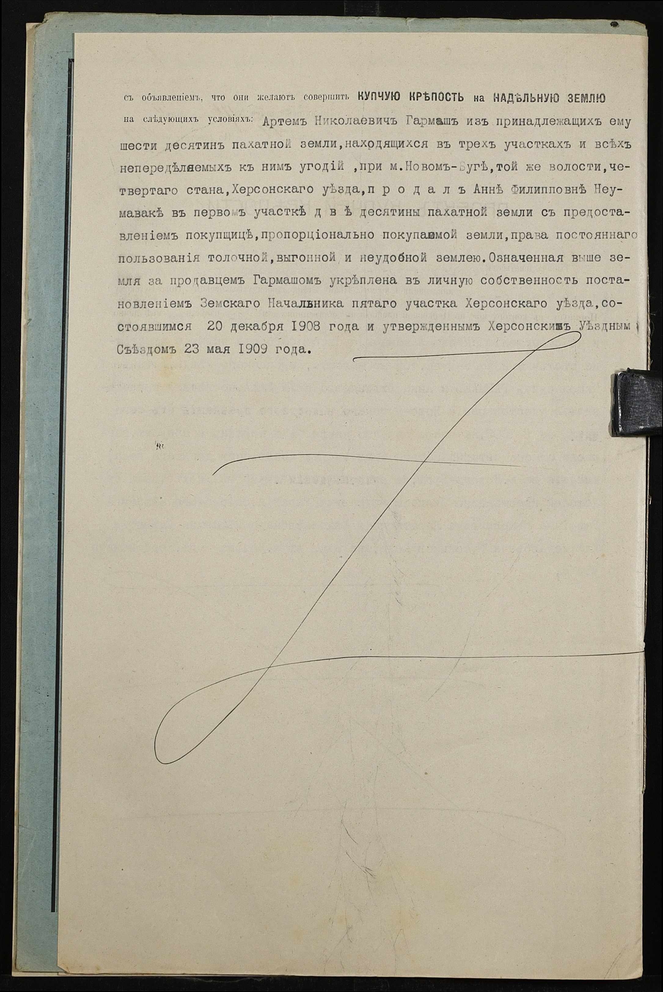 • • • • Справа № 479 “Справа про вчинення купчої про продаж землі селянином Гармашем Артемом Миколайовичем (Николаевичем) на користь селянки Неумиваки Ганни Пилипівни (Неумываки Анны Филипповны)”