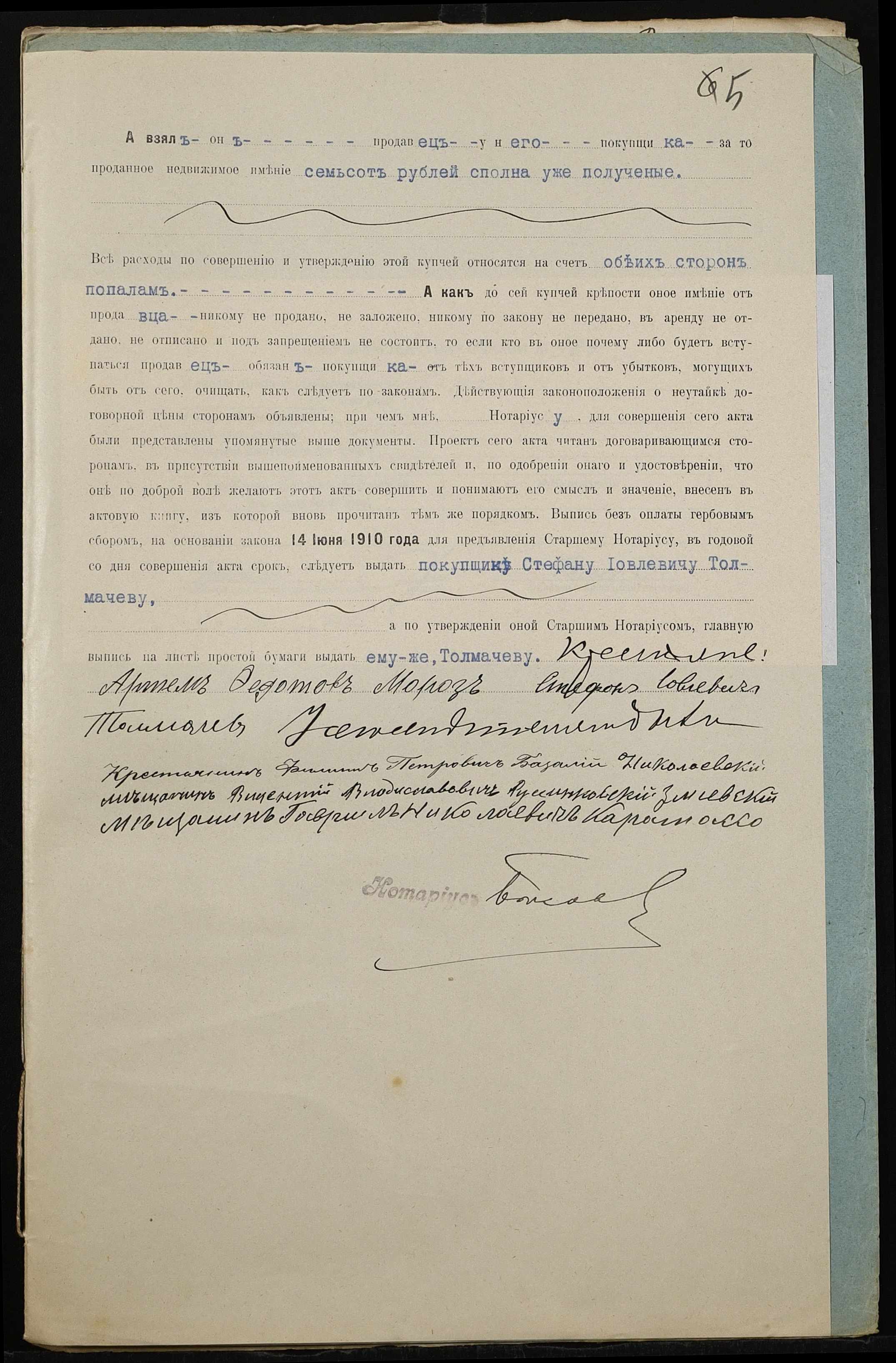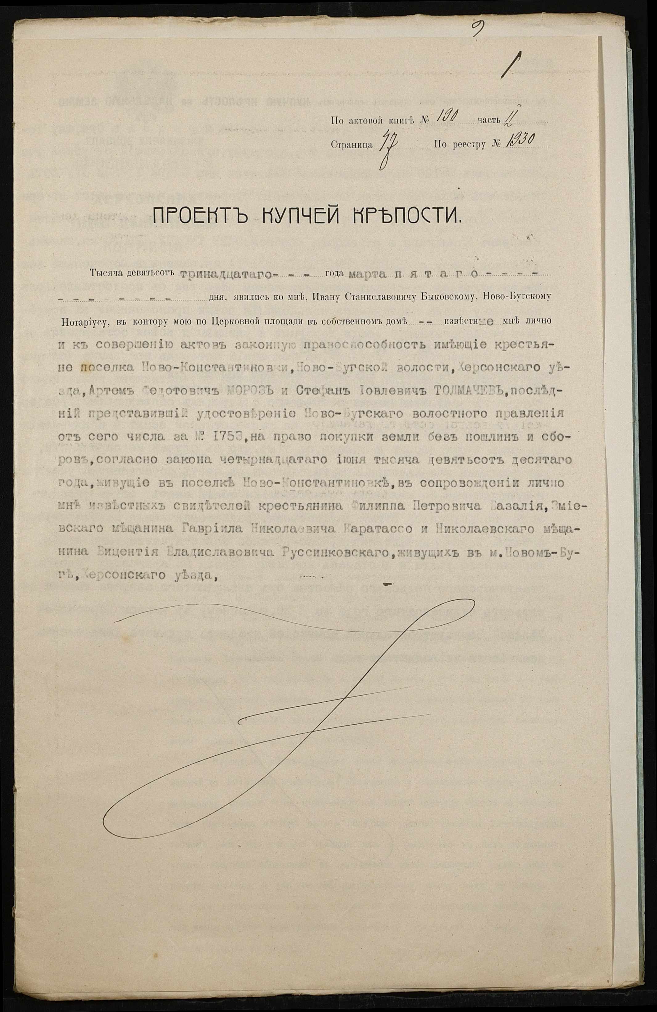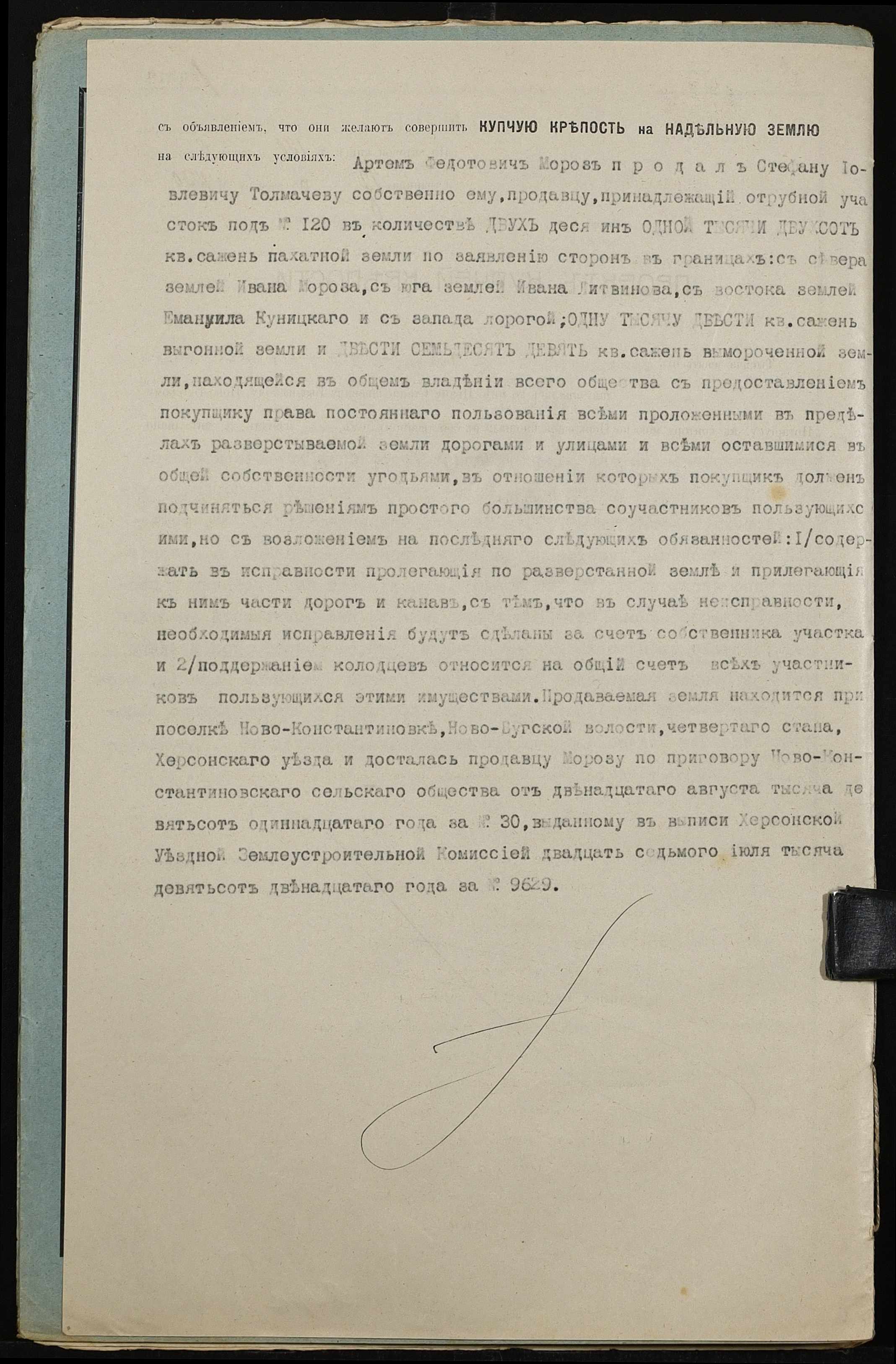• • • • Справа № 484 “Справа про вчинення купчої про продаж землі селянином Морозом Артемом Федотовичем на користь селянина Толмачова (Толмачева) Стефана Іовлевича (Иовлевича)”