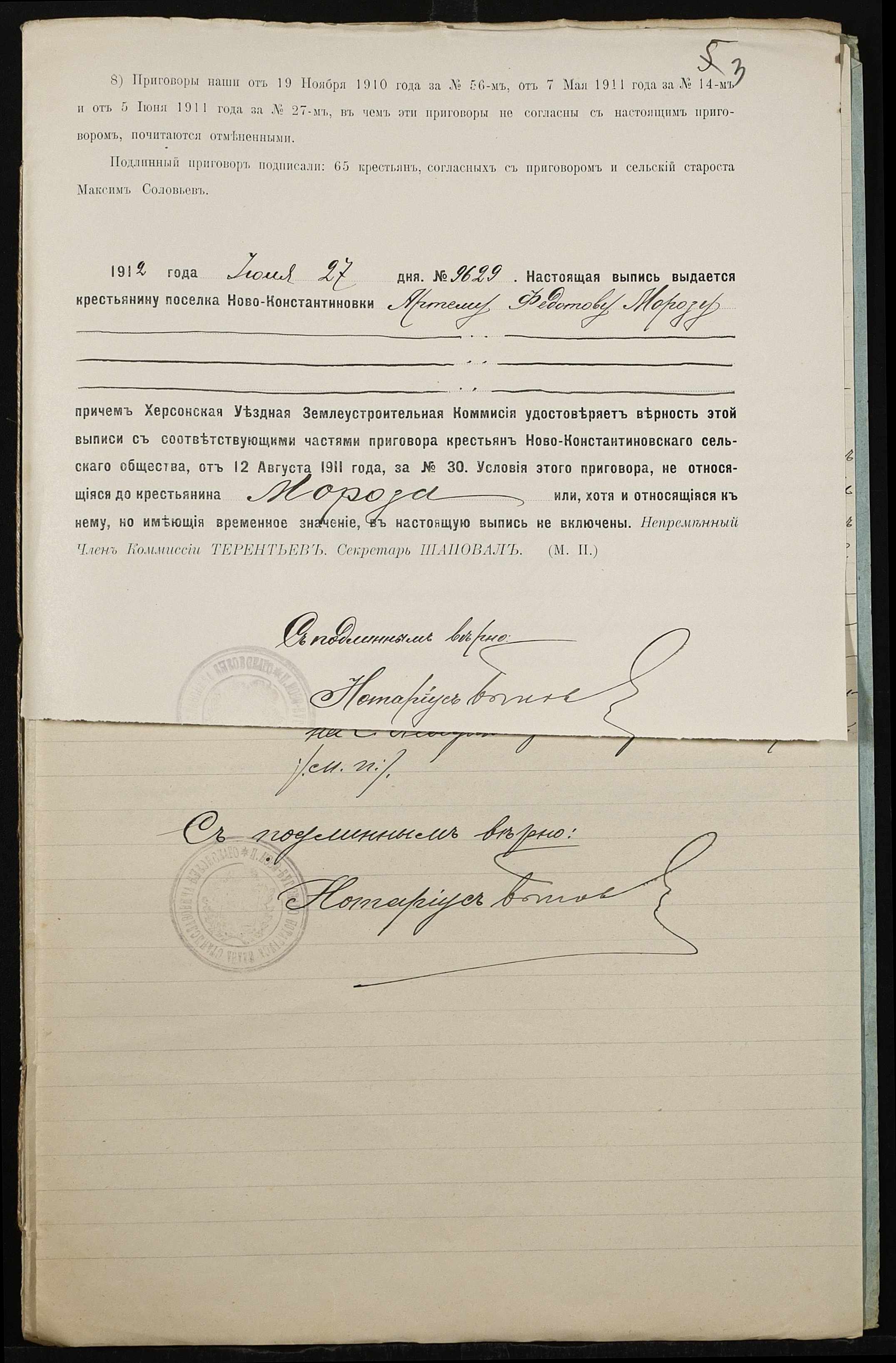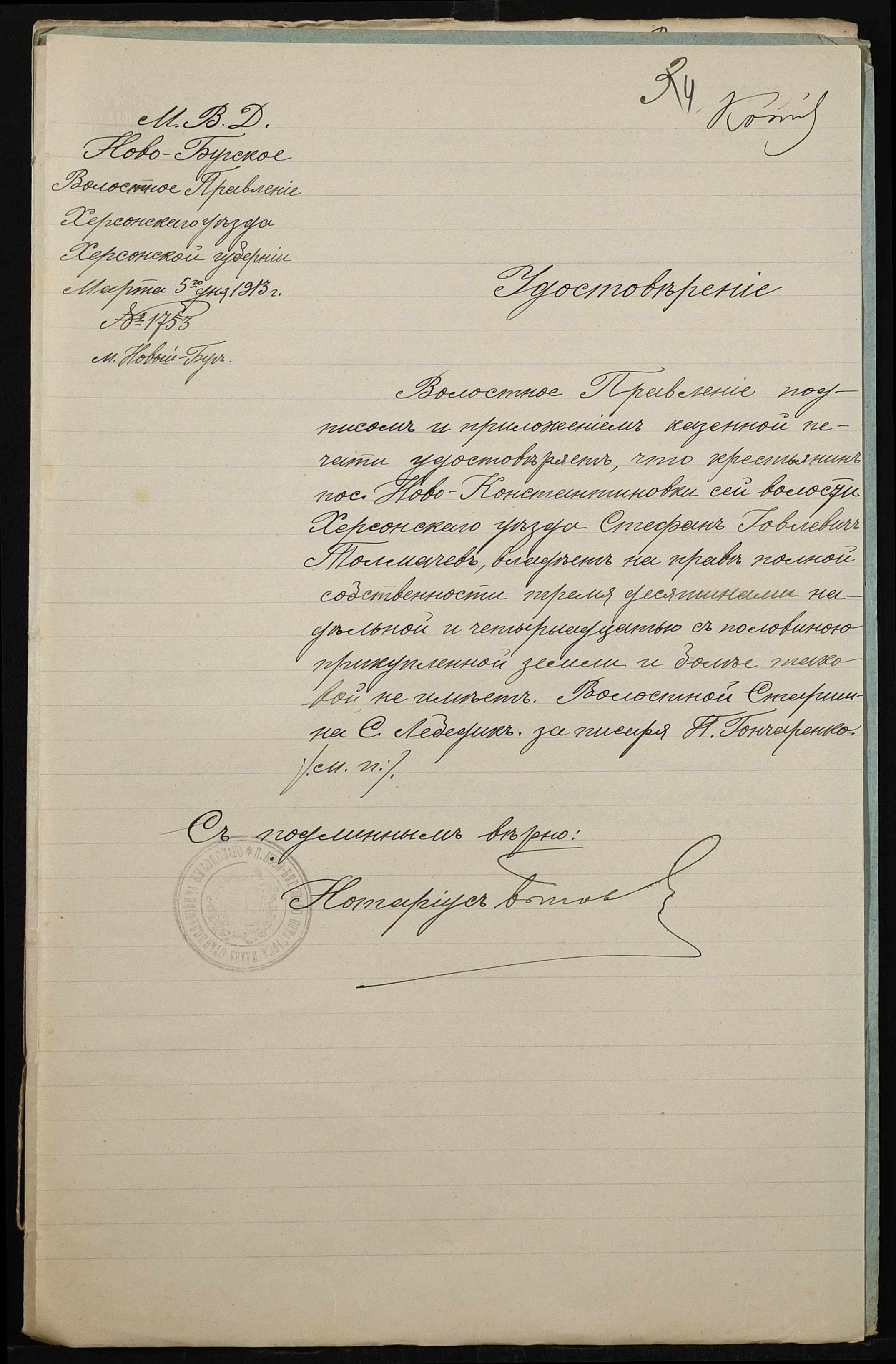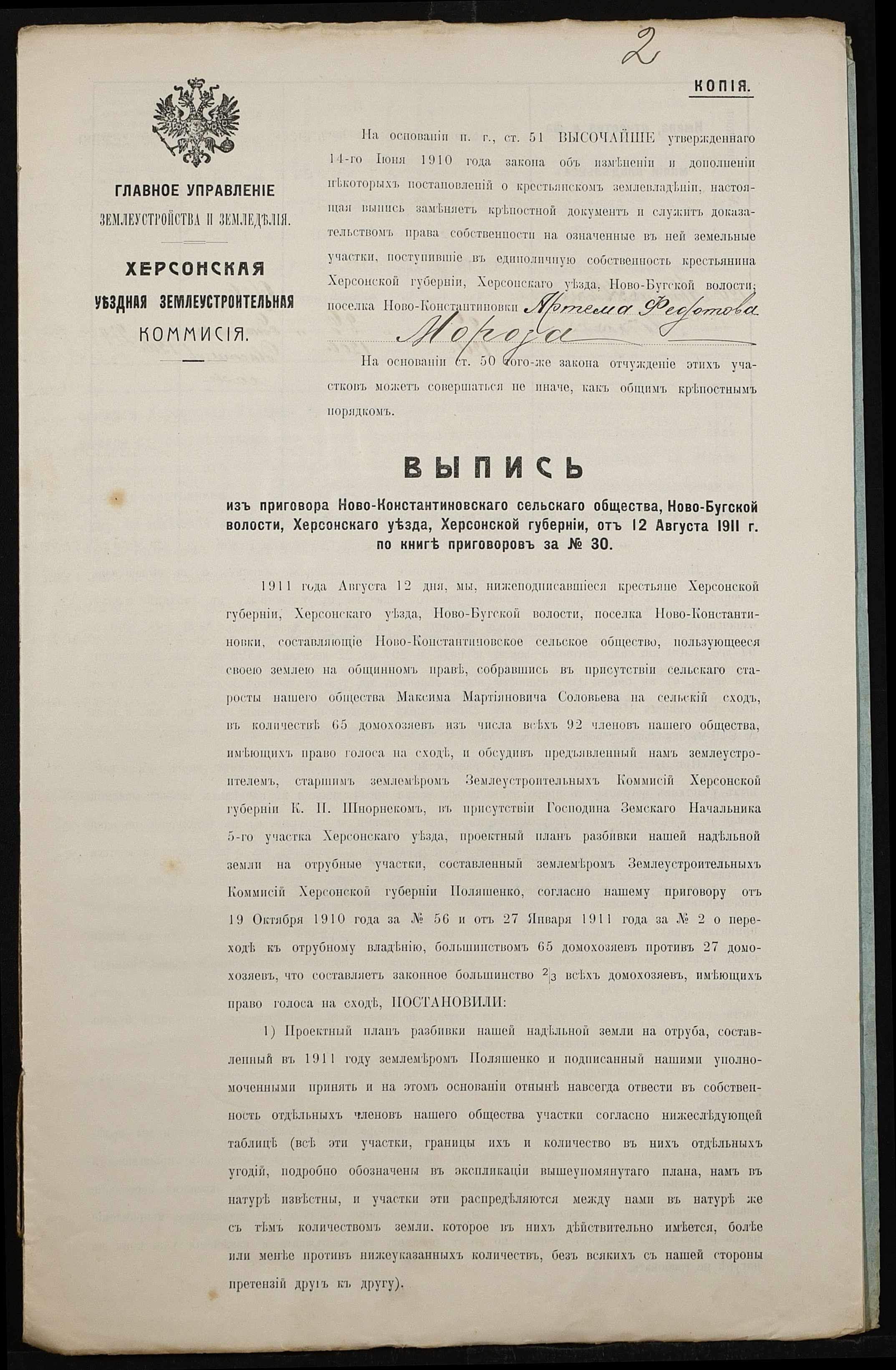 • • • • Справа № 484 “Справа про вчинення купчої про продаж землі селянином Морозом Артемом Федотовичем на користь селянина Толмачова (Толмачева) Стефана Іовлевича (Иовлевича)”